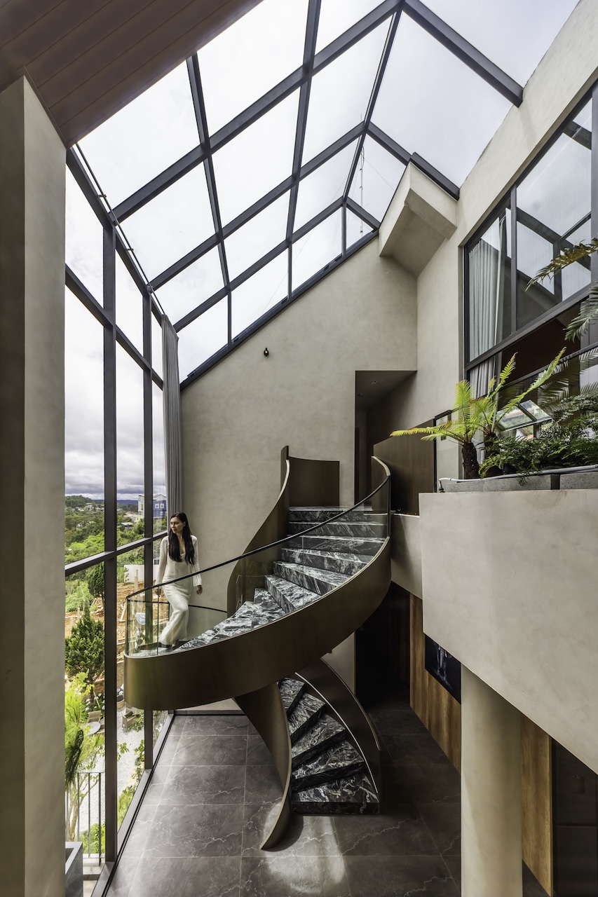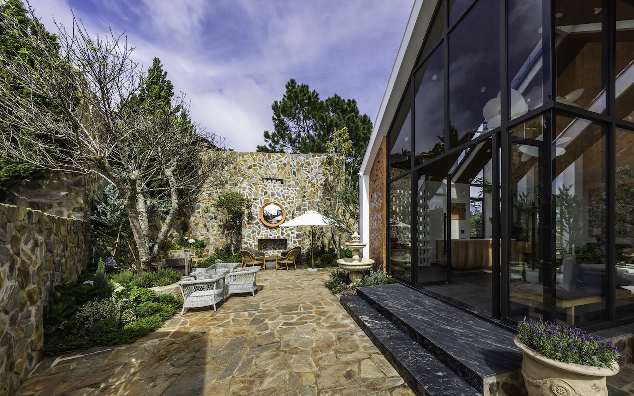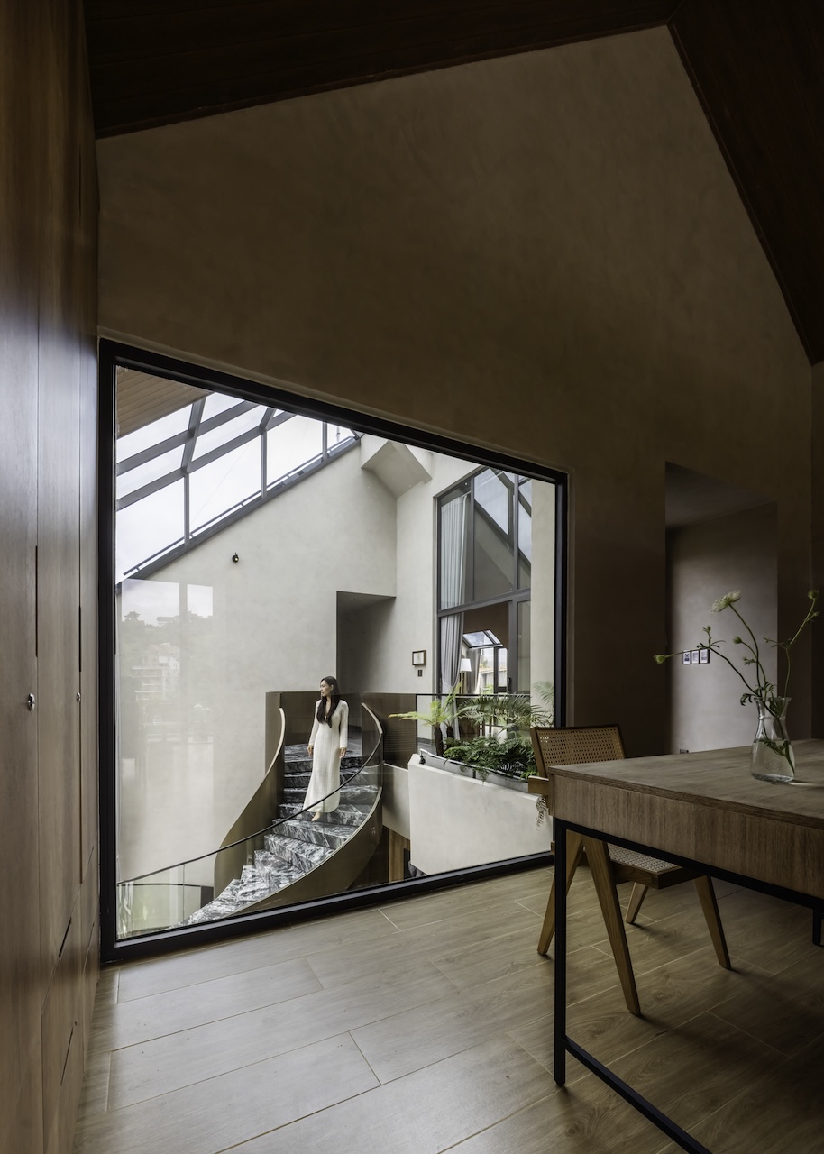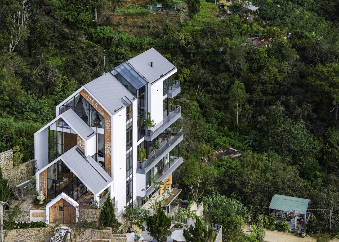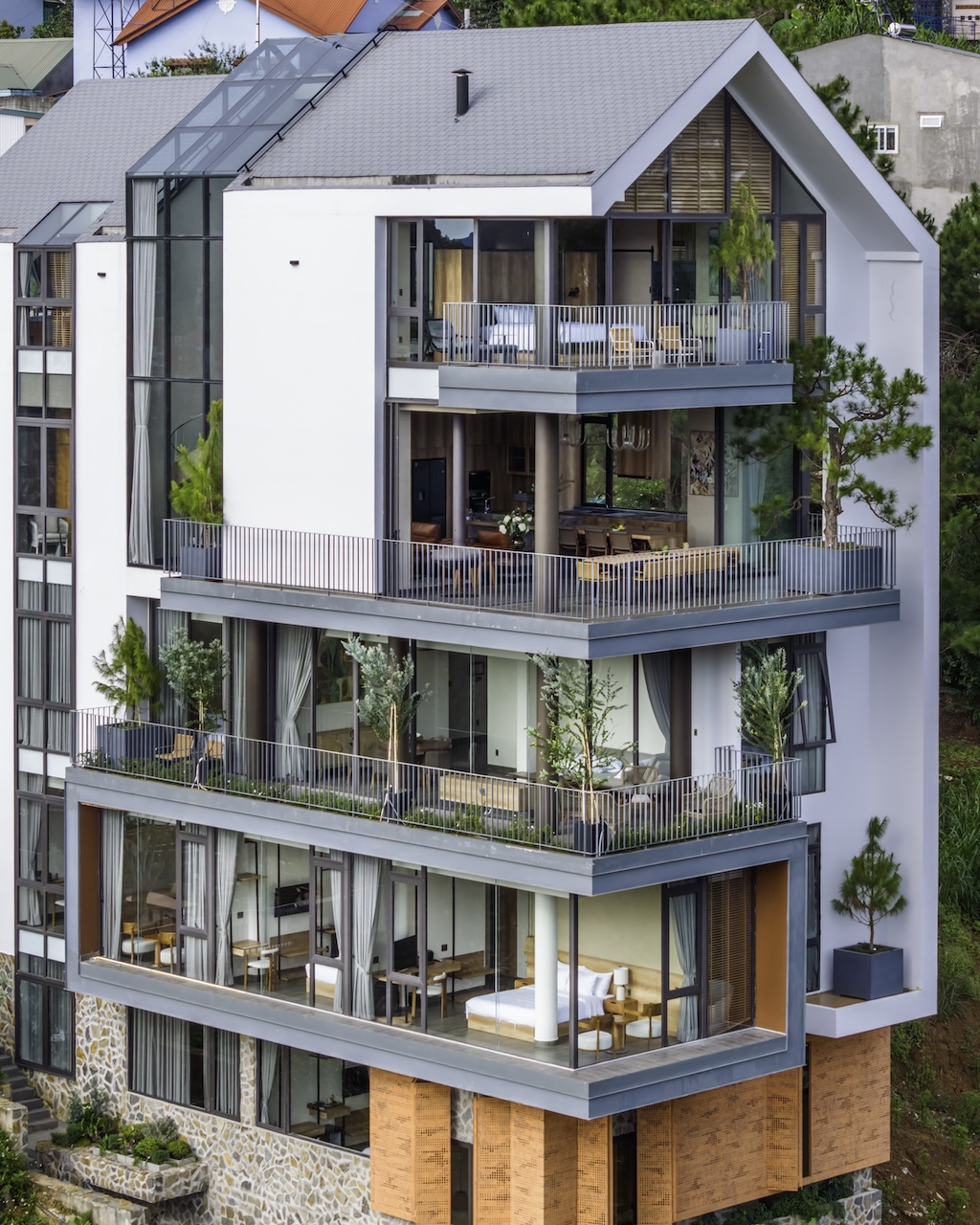 Hình khối công trình được chia tách rõ ràng, tạo thành chuỗi không gian độc lập nhưng vẫn liên kết mạch lạc qua hệ thống hành lang, sân hiên và bậc thang. Mái dốc giúp che chắn phù hợp với khí hậu lạnh và ẩm của Đà Lạt. Sự xen kẽ giữa các lớp không gian giúp tạo nên nhịp điệu thị giác nhẹ nhàng khi nhìn từ bên ngoài. Các mảng kính lớn được bố trí có chủ đích nhằm mở rộng tầm nhìn, mời gọi thiên nhiên đi vào trong công trình, làm mờ đi ranh giới giữa nội thất và cảnh quan.