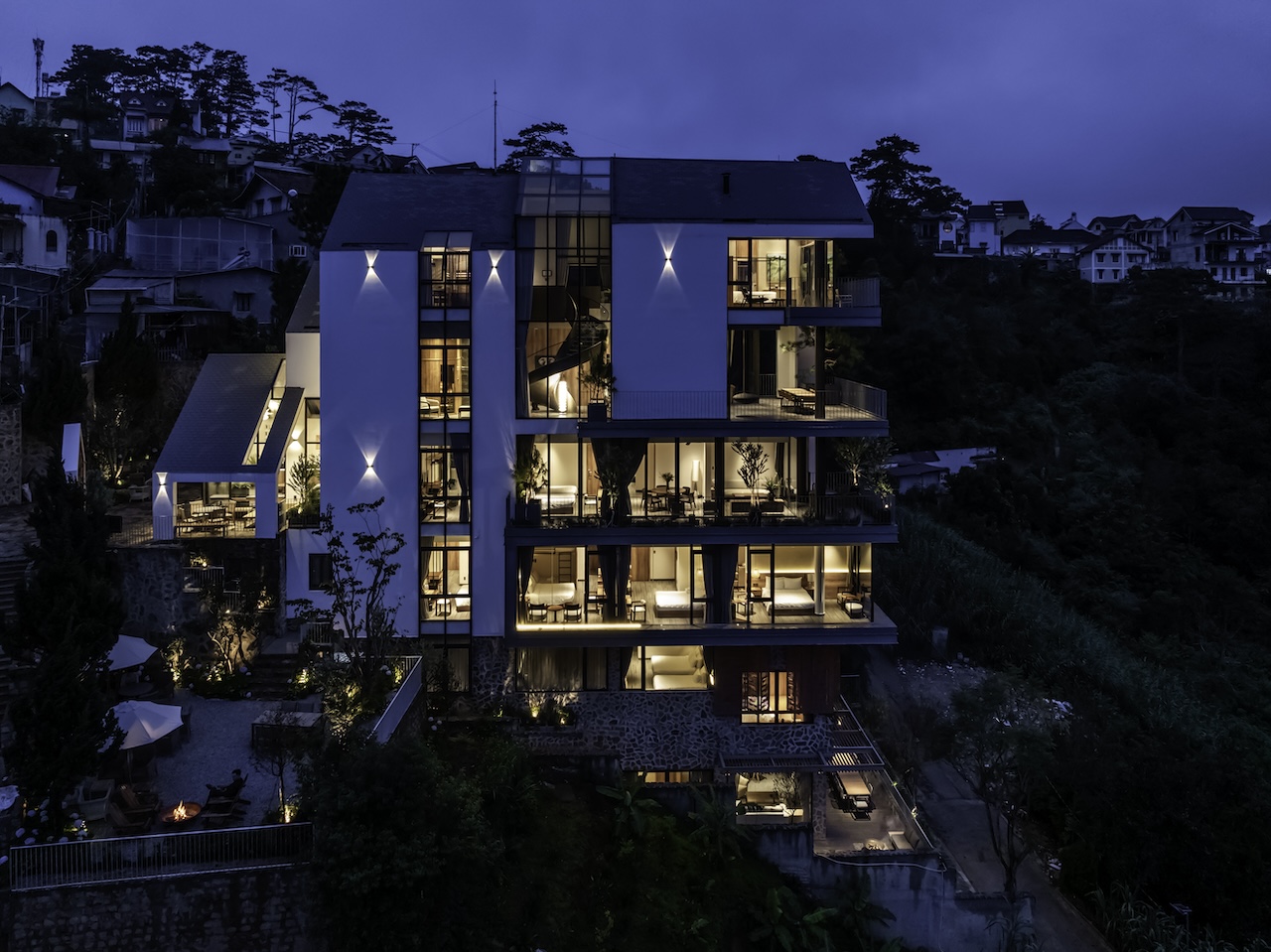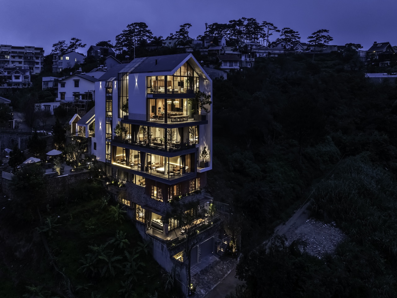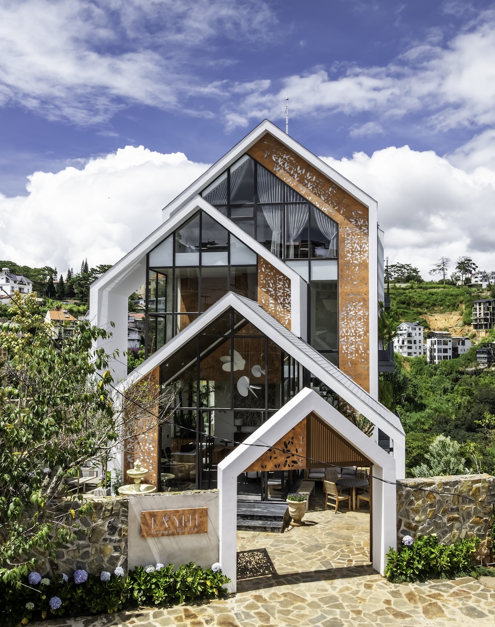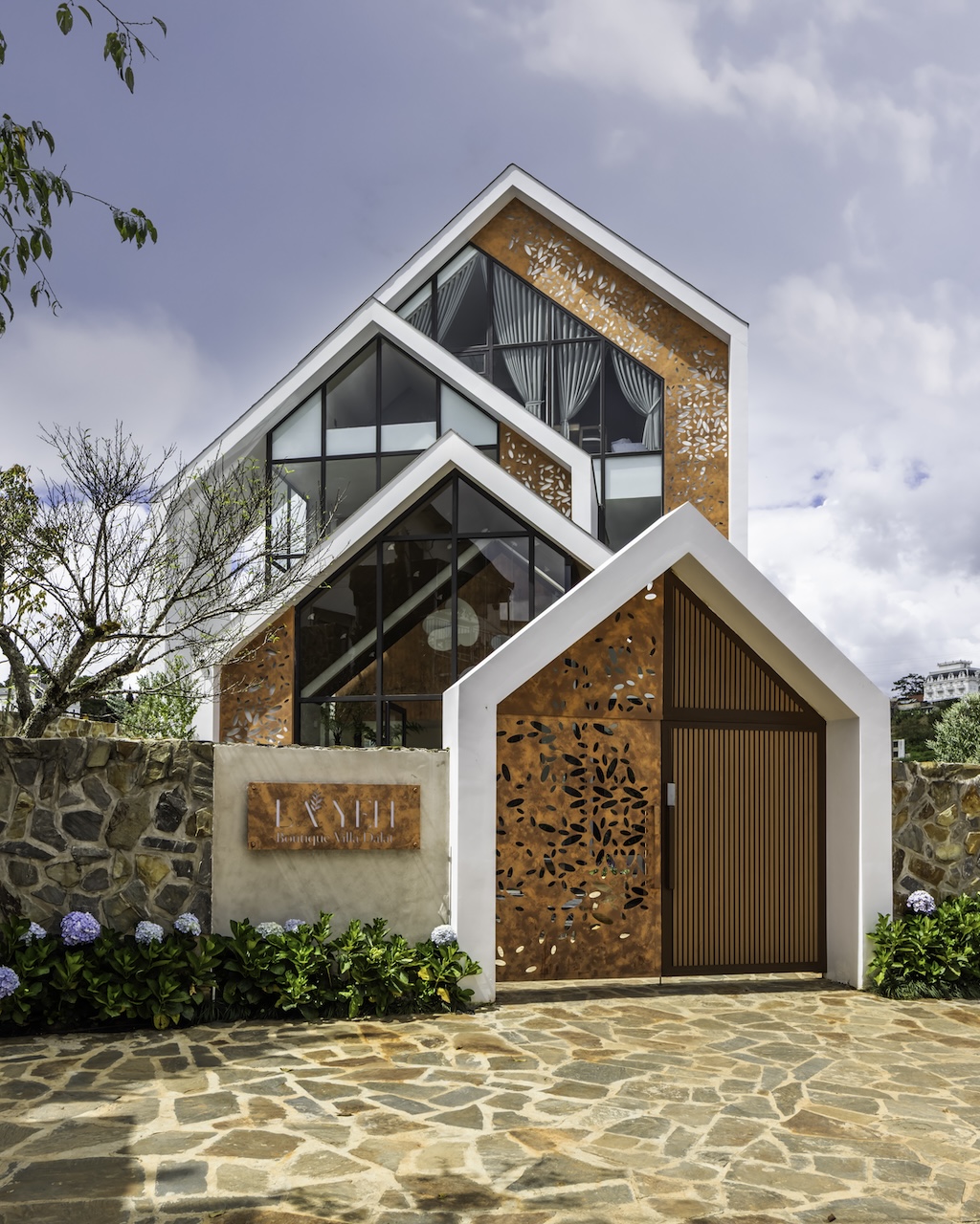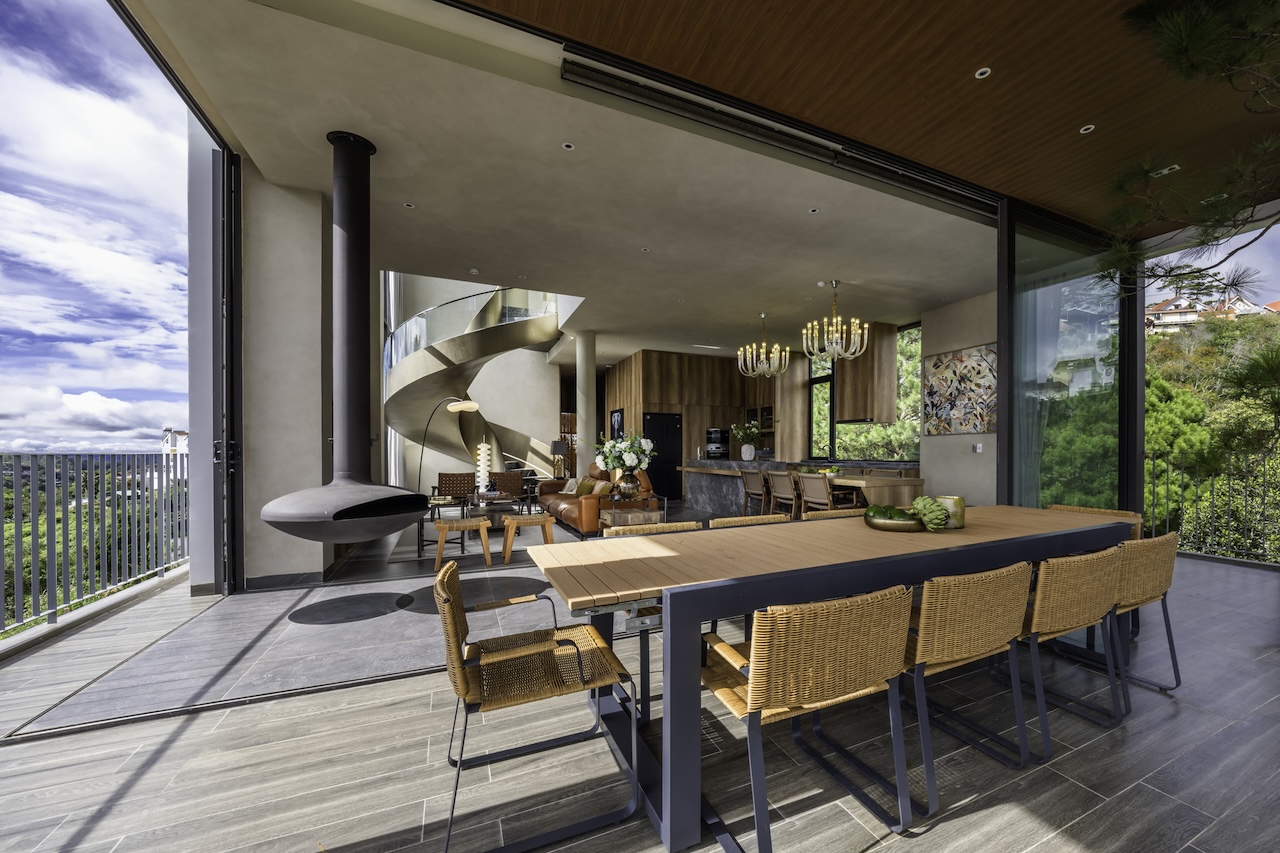 Hình khối công trình được chia tách rõ ràng, tạo thành chuỗi không gian độc lập nhưng vẫn liên kết mạch lạc qua hệ thống hành lang, sân hiên và bậc thang. Mái dốc giúp che chắn phù hợp với khí hậu lạnh và ẩm của Đà Lạt. Sự xen kẽ giữa các lớp không gian giúp tạo nên nhịp điệu thị giác nhẹ nhàng khi nhìn từ bên ngoài. Các mảng kính lớn được bố trí có chủ đích nhằm mở rộng tầm nhìn, mời gọi thiên nhiên đi vào trong công trình, làm mờ đi ranh giới giữa nội thất và cảnh quan.