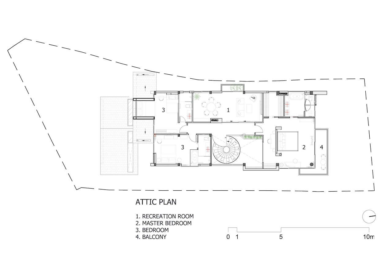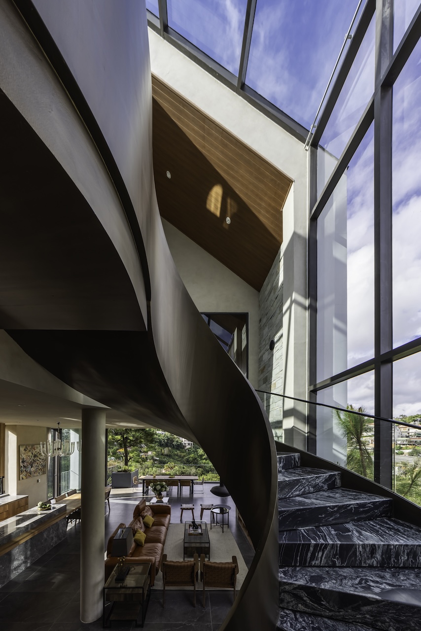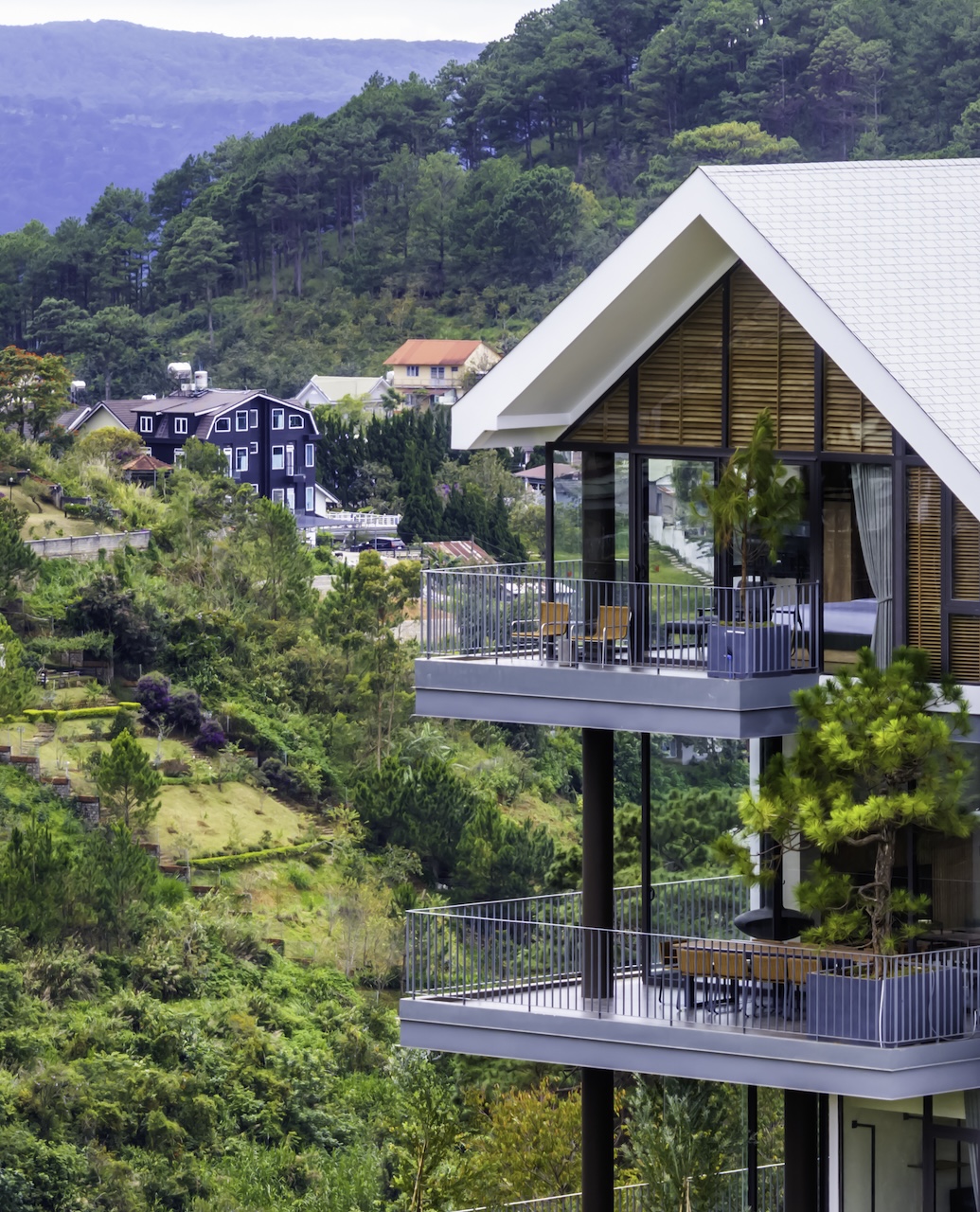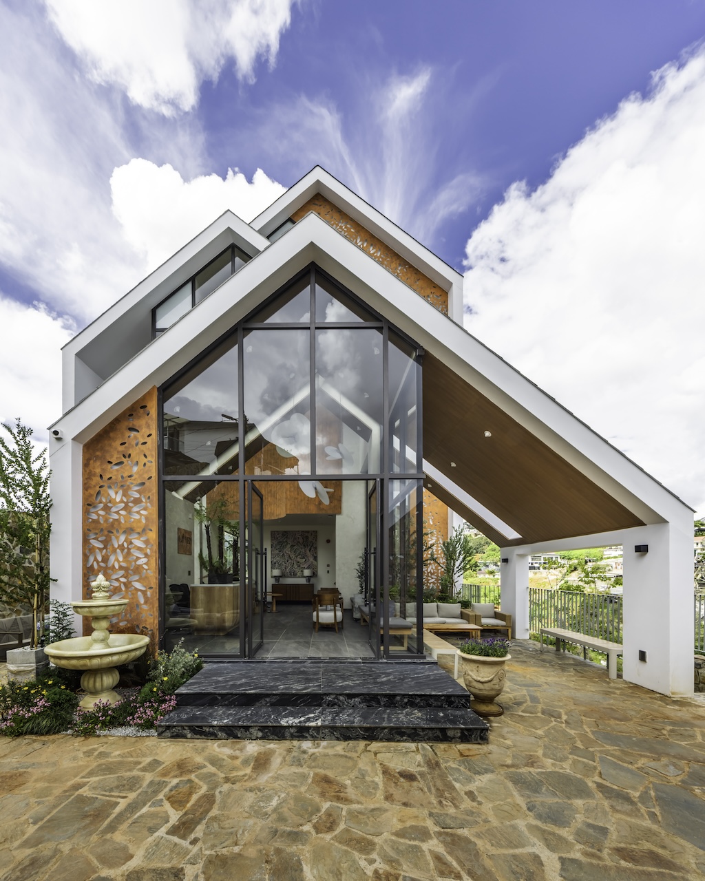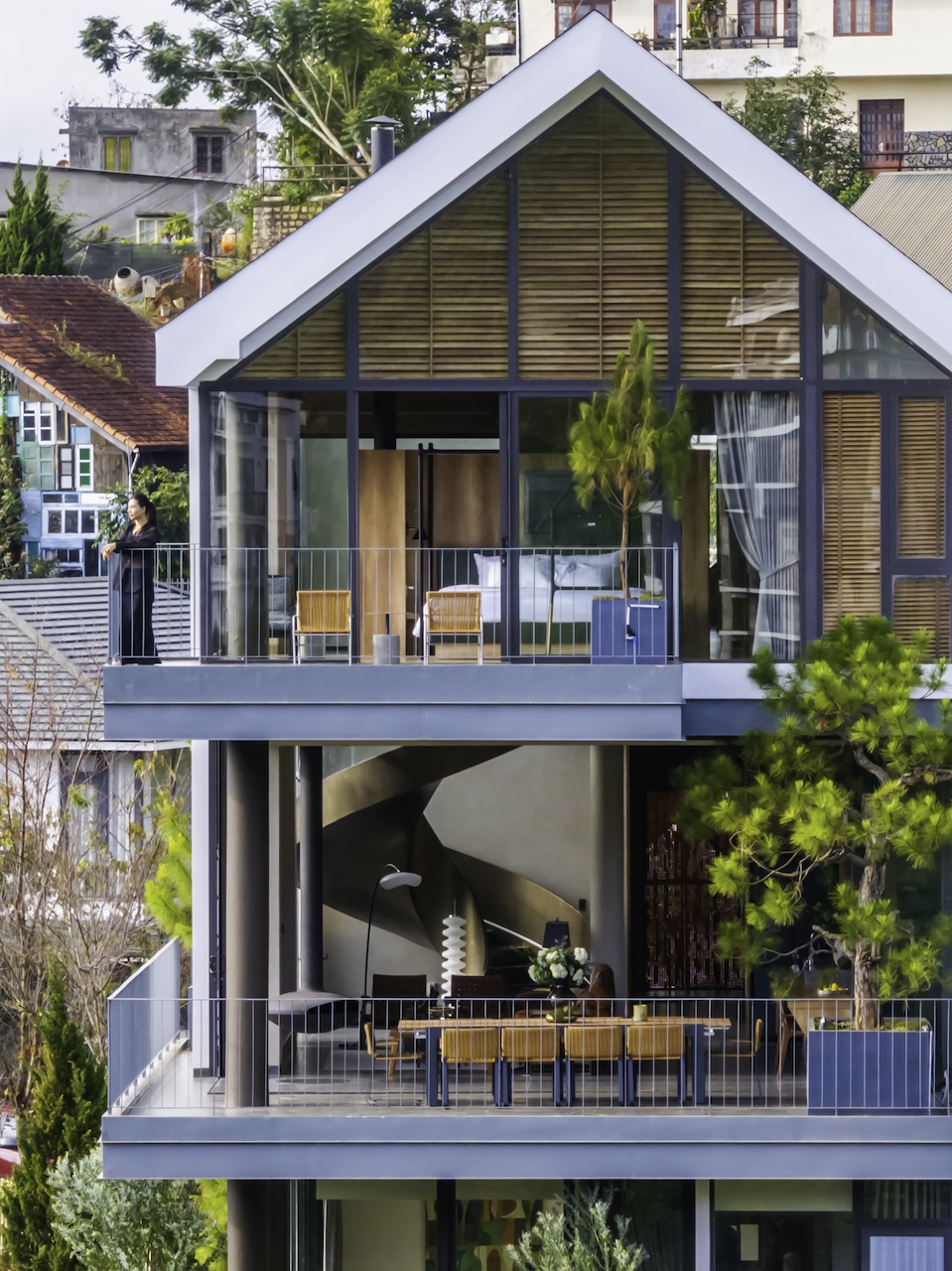 Hình khối công trình được chia tách rõ ràng, tạo thành chuỗi không gian độc lập nhưng vẫn liên kết mạch lạc qua hệ thống hành lang, sân hiên và bậc thang. Mái dốc giúp che chắn phù hợp với khí hậu lạnh và ẩm của Đà Lạt. Sự xen kẽ giữa các lớp không gian giúp tạo nên nhịp điệu thị giác nhẹ nhàng khi nhìn từ bên ngoài. Các mảng kính lớn được bố trí có chủ đích nhằm mở rộng tầm nhìn, mời gọi thiên nhiên đi vào trong công trình, làm mờ đi ranh giới giữa nội thất và cảnh quan.