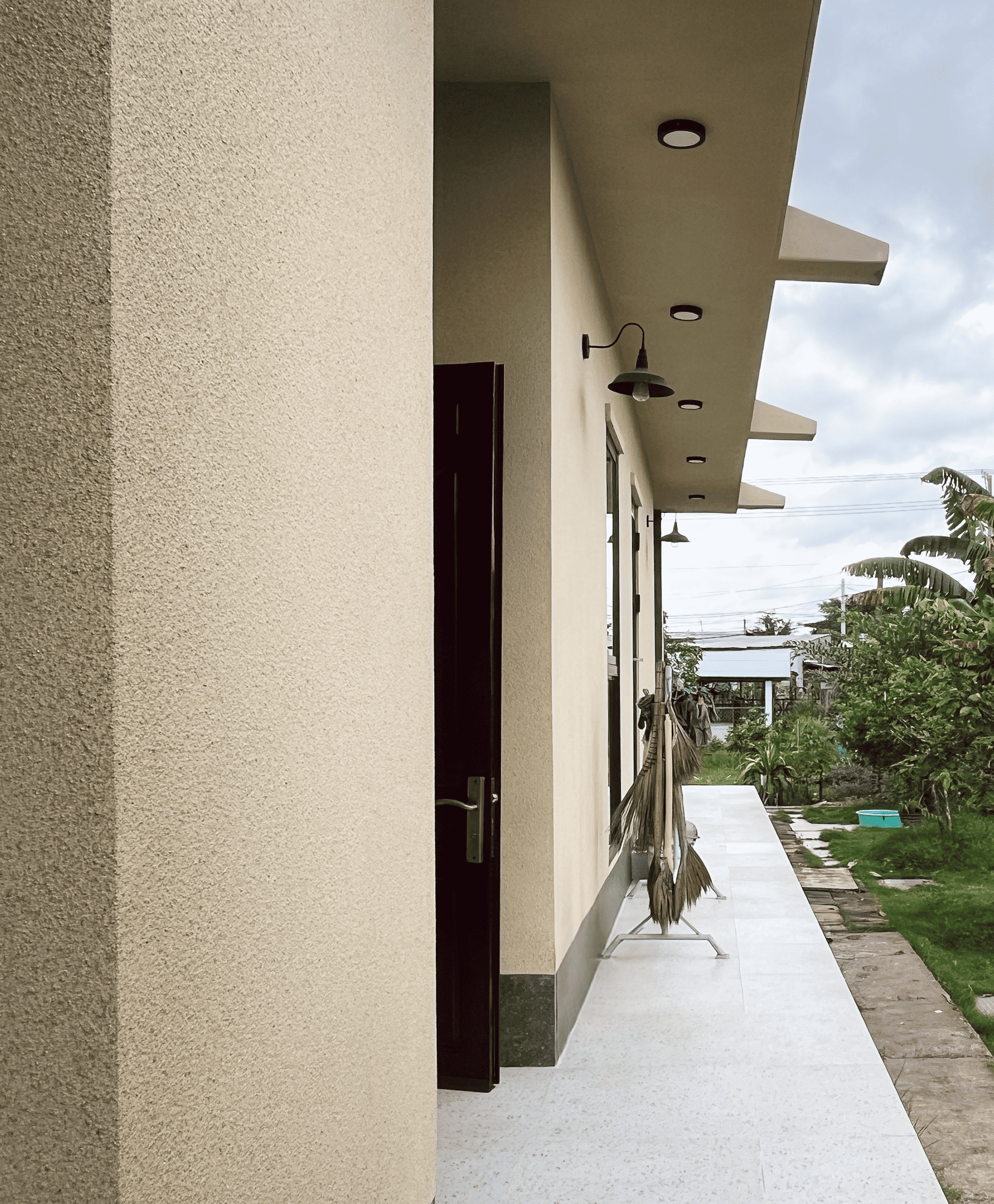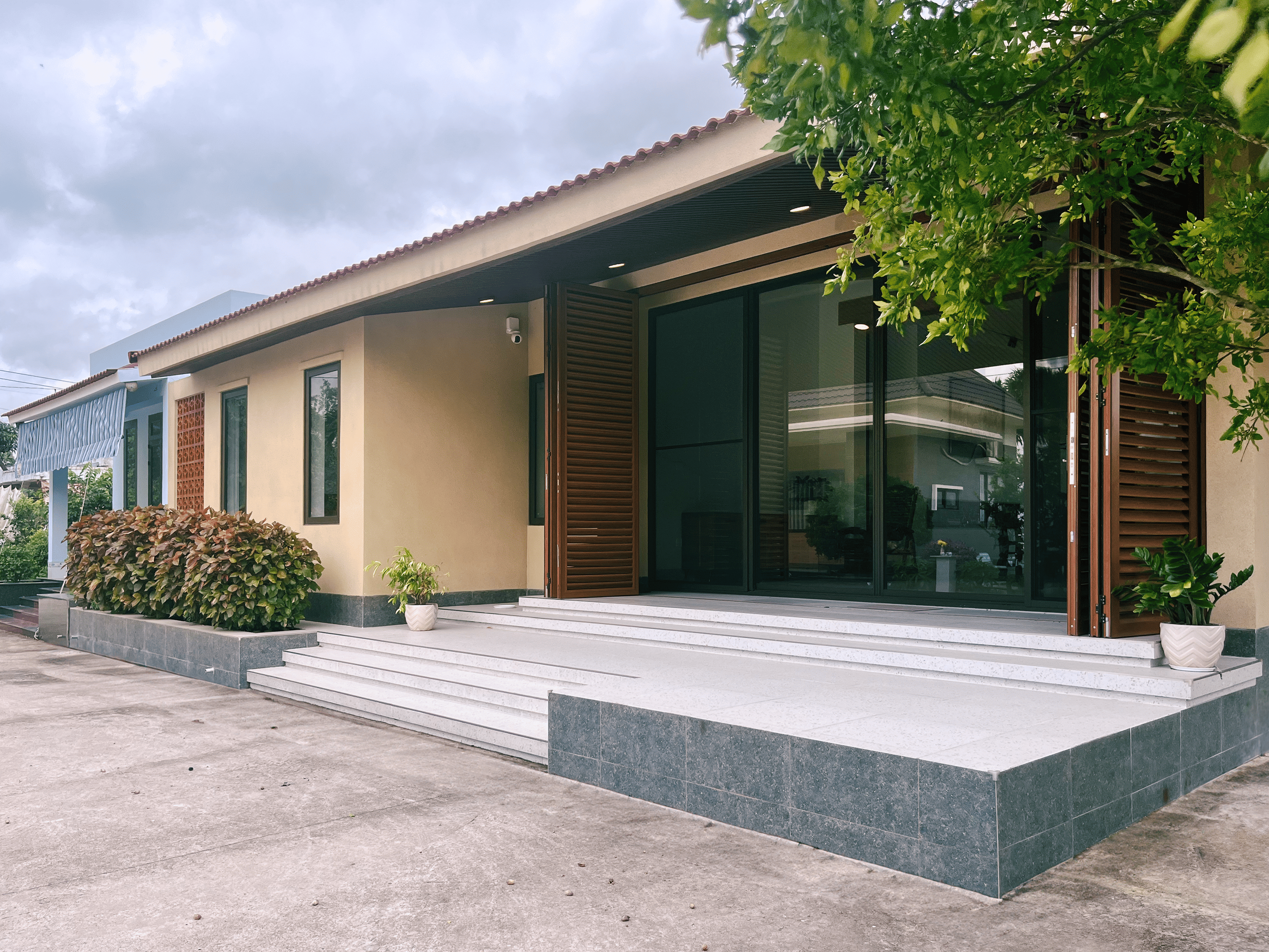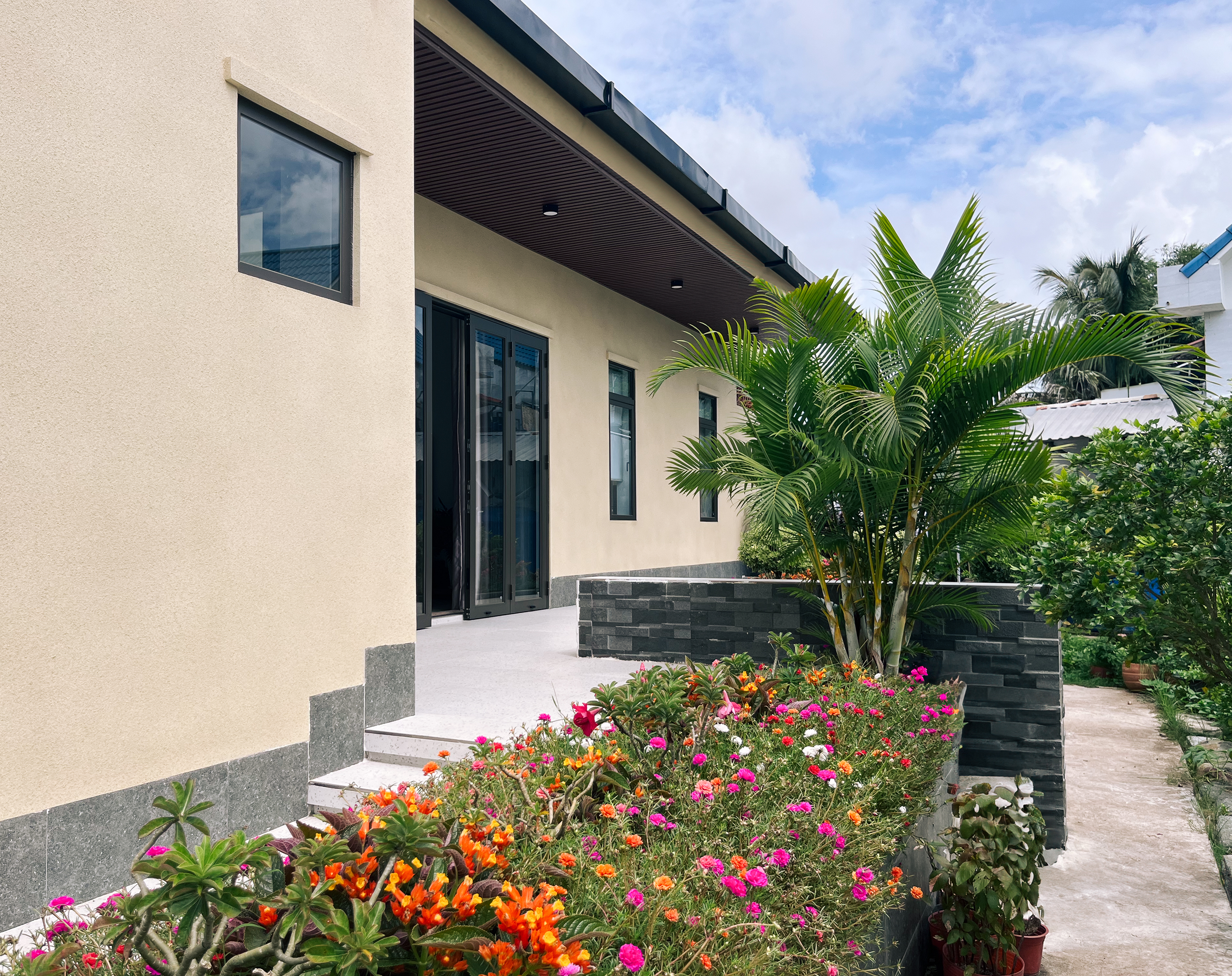 Cảnh quan xanh bao quanh đóng vai trò quan trọng trong việc cải thiện vi khí hậu, giảm bức xạ nhiệt và tạo cảm giác “ẩn mình” giữa vườn cây. Sân trước rộng không chỉ là khoảng lùi cảnh quan mà còn trở thành không gian sinh hoạt chung, nơi diễn ra các hoạt động truyền thống, góp phần gắn kết gia đình và cộng đồng.