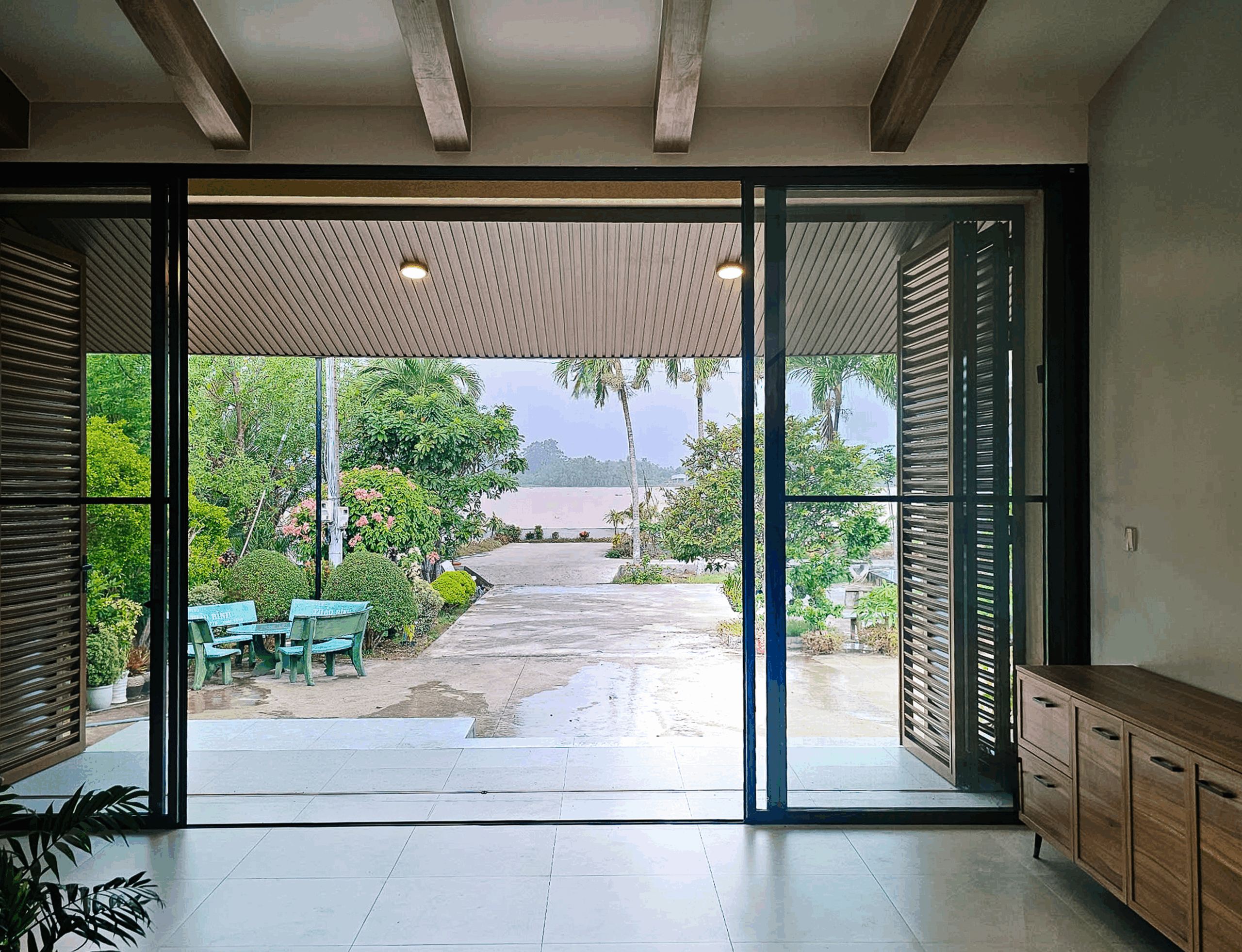 Ngôi nhà được định hướng đón gió chính từ sông, tăng cường thông gió tự nhiên cho toàn bộ không gian. Các giải pháp vi khí hậu gồm thông gió chéo, sân trong dọc khối phòng ngủ, mái hiên sâu và hệ cửa hai lớp (lá sách kết hợp cửa kính trượt), cho phép kiểm soát linh hoạt gió, ánh sáng và mưa theo mùa. Nhờ đó, công trình giảm hấp thụ nhiệt, hạn chế nhu cầu sử dụng năng lượng nhân tạo, đồng thời duy trì sự thoải mái vi khí hậu quanh năm.