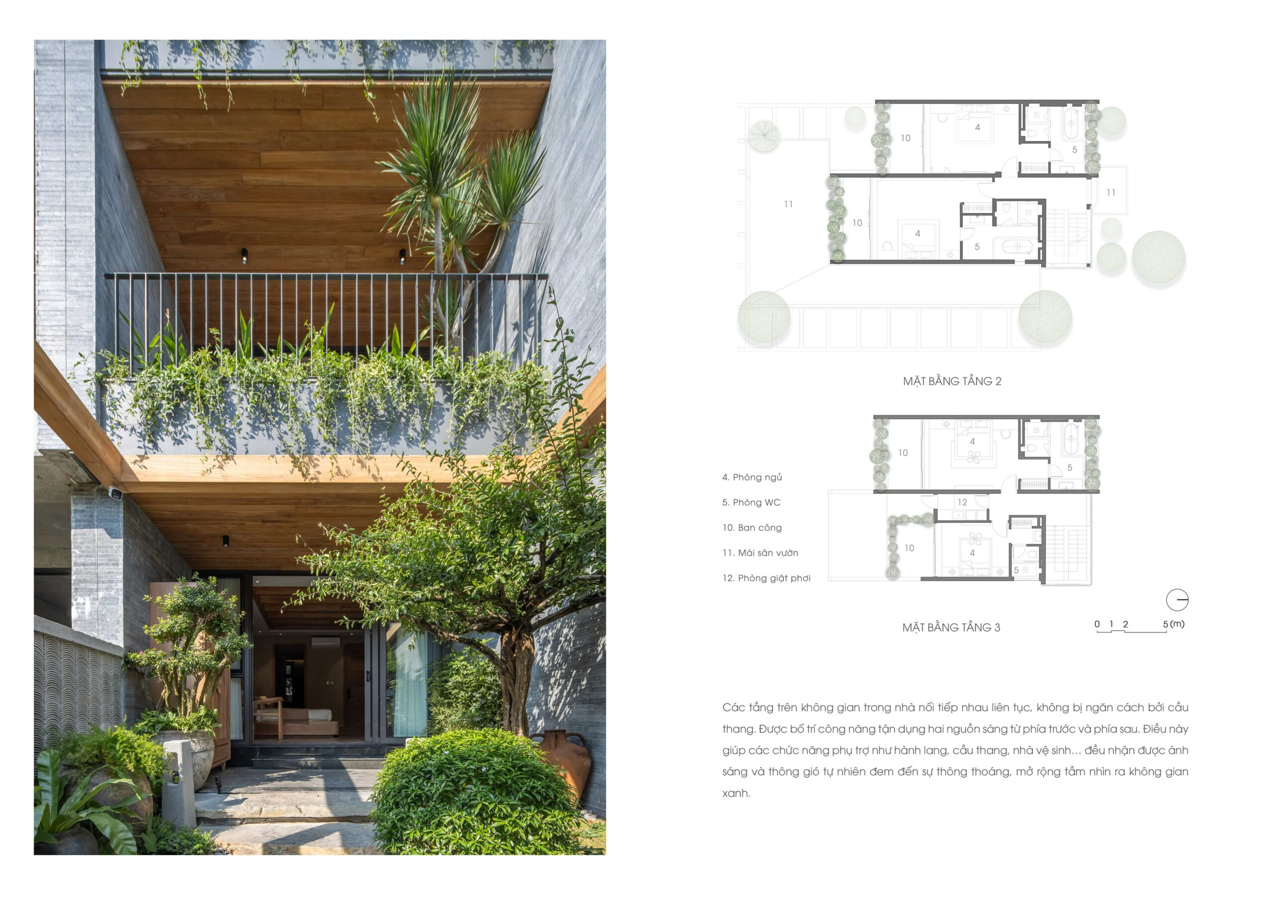 Khu vườn là nơi “thổi hồn quê hương” thông qua hệ cây bản địa như mận, đinh lăng, nguyệt quế,… Các lớp cây được sắp xếp có chủ ý về kích thước, hình khối và cao độ, tạo nên nhịp điệu sinh động, tự nhiên như một khu vườn truyền thống Việt. Gốm thủ công kết hợp cùng gạch ngói cổ được điểm xuyết tại các góc vườn, gợi nhắc ký ức làng quê và văn hóa bản địa một cách tinh tế.
