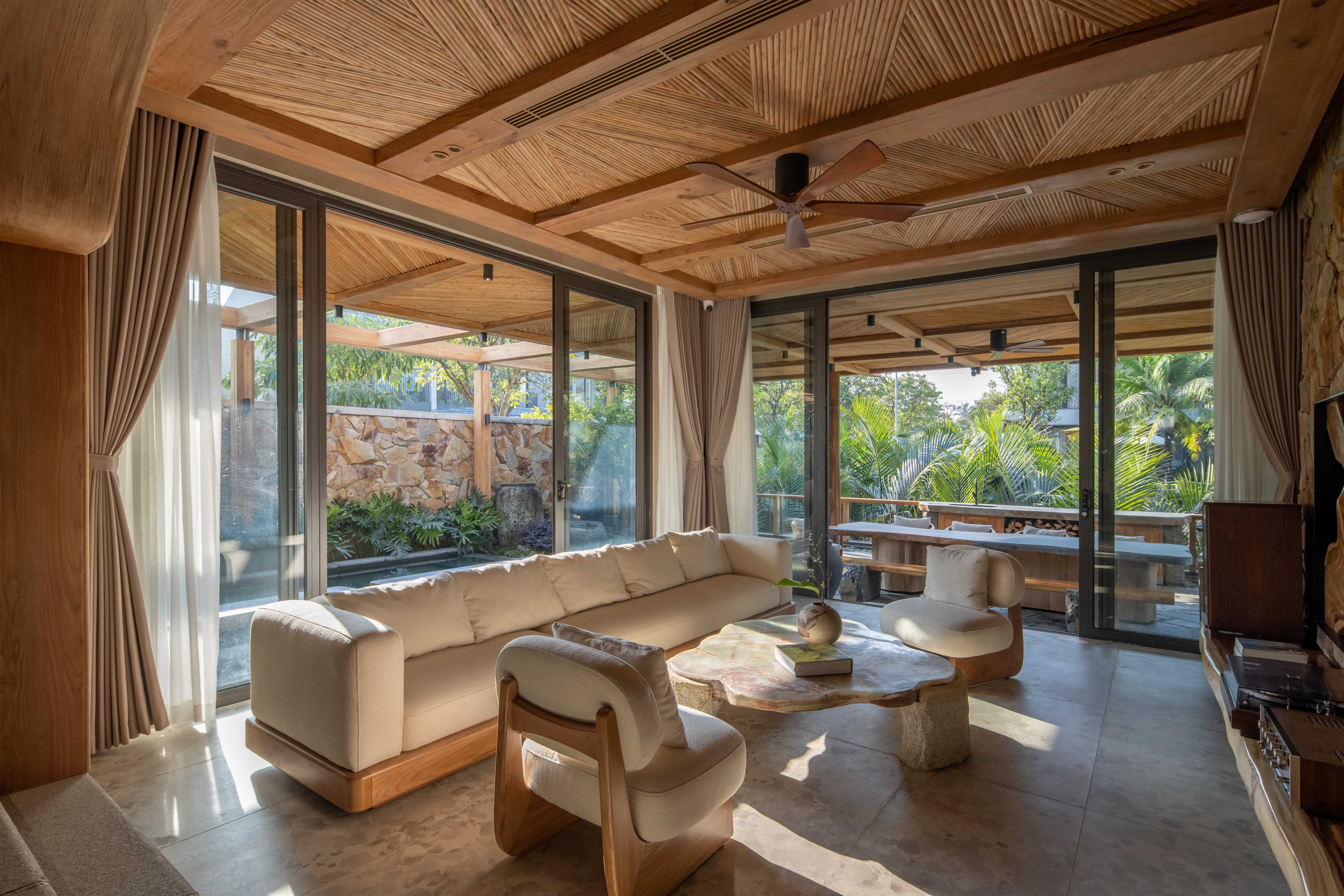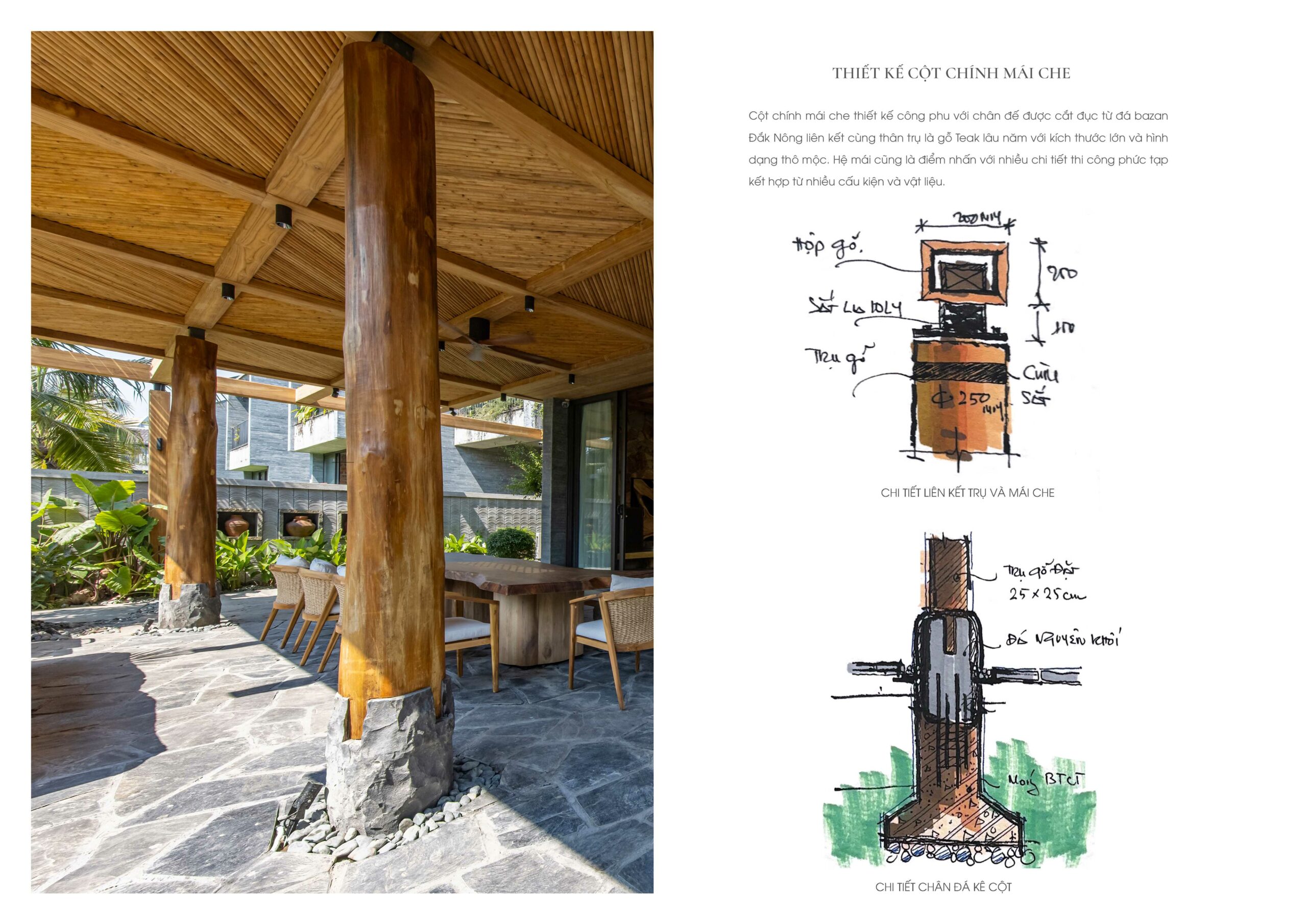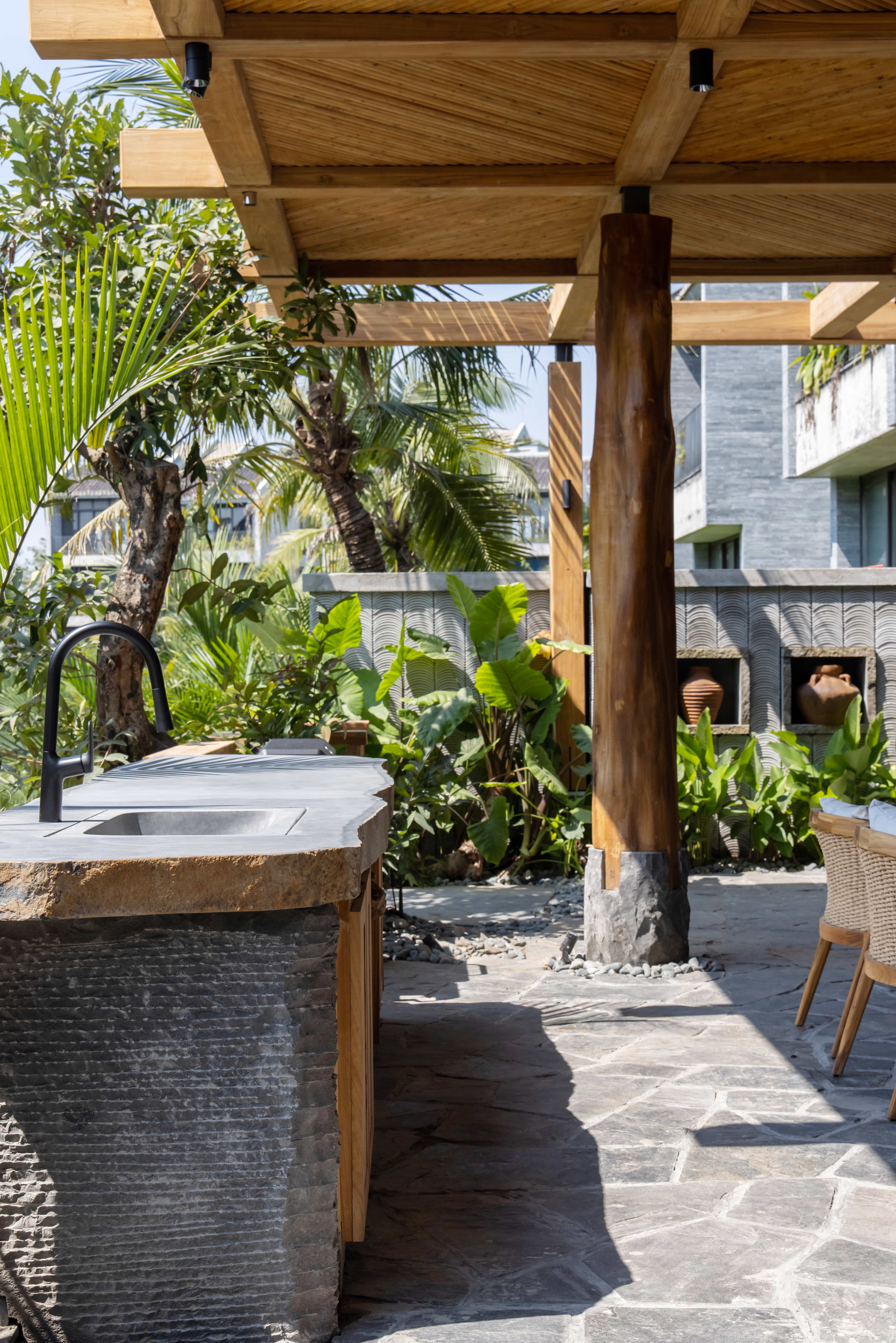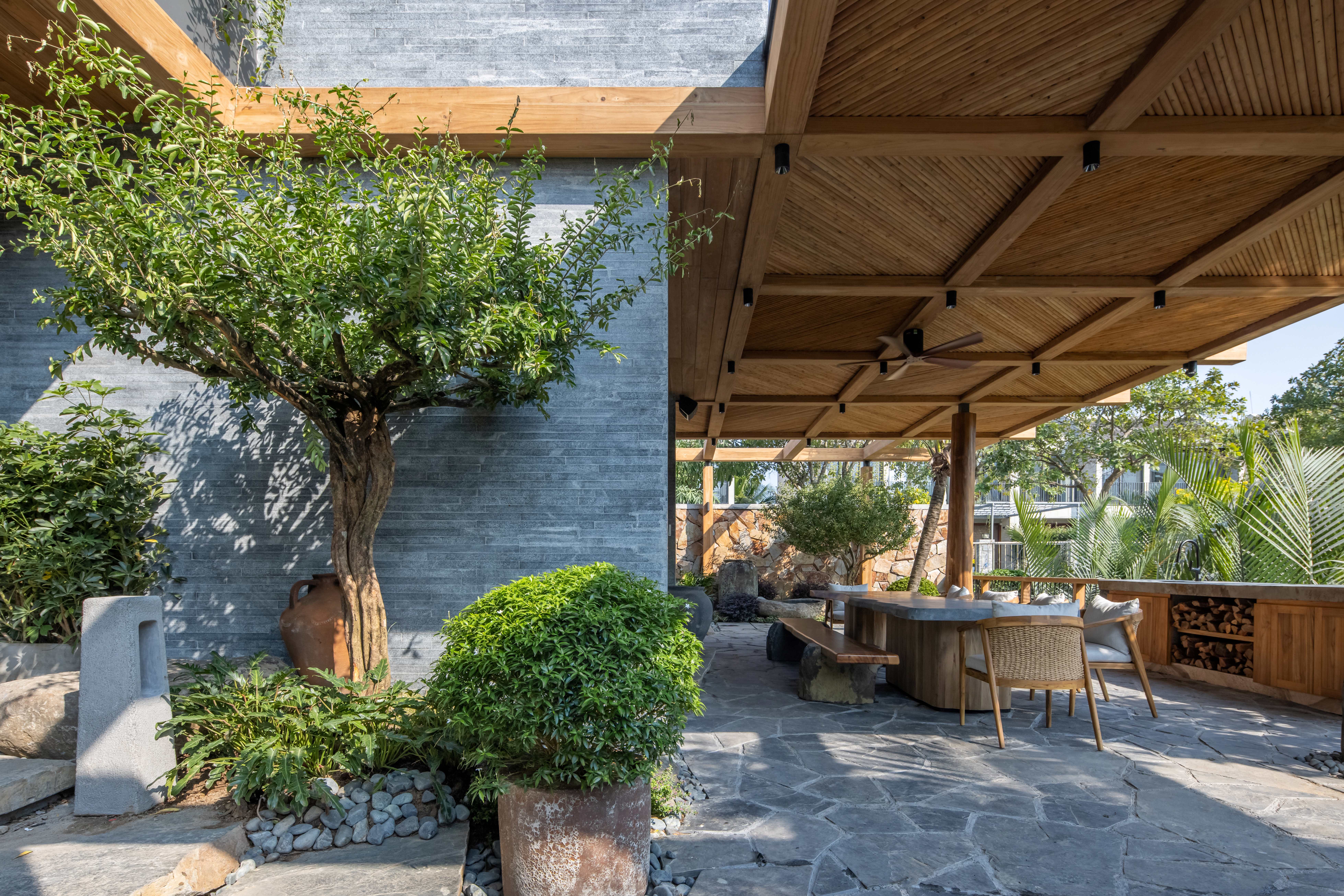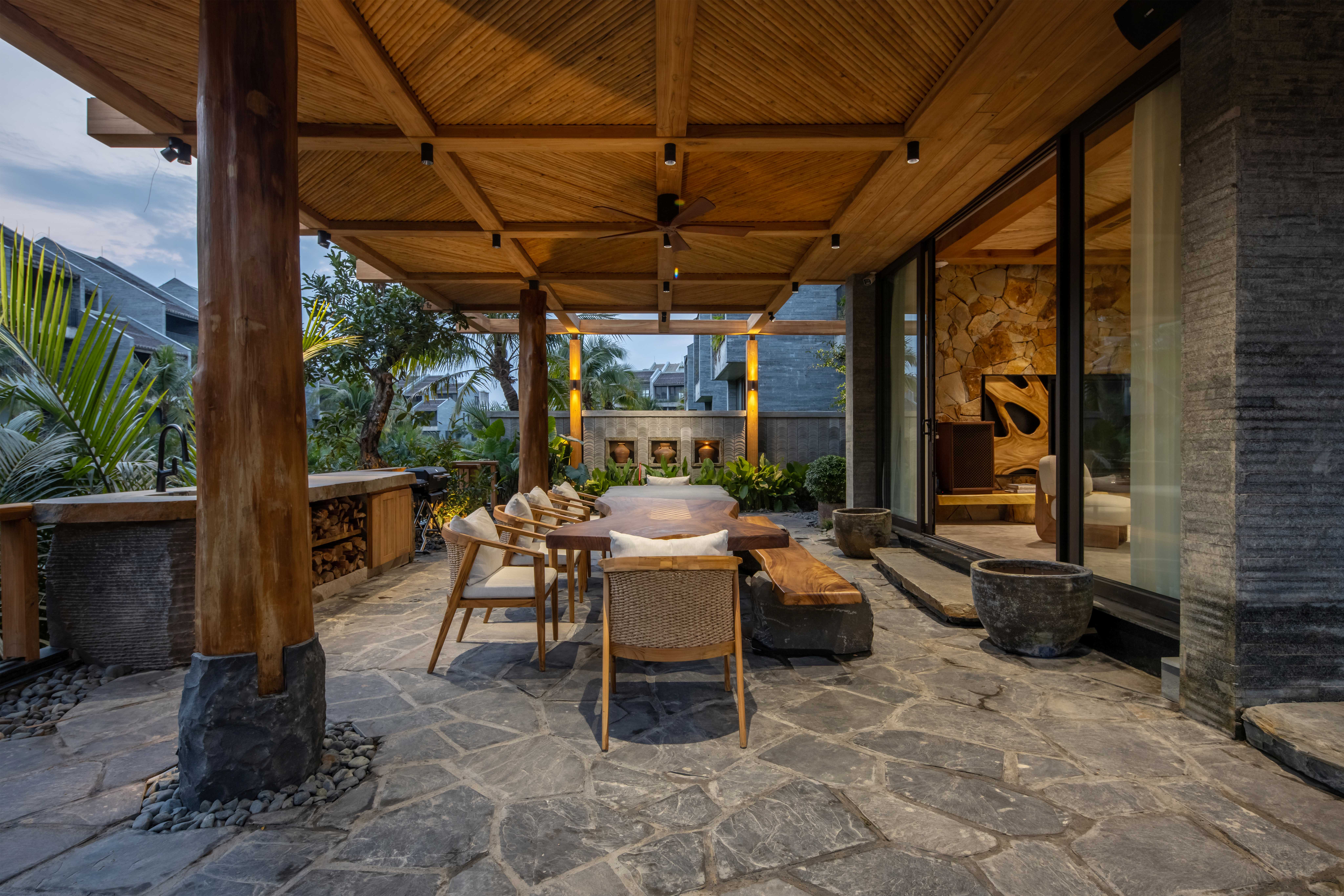 Hệ mái che ngoài trời sử dụng kết cấu gỗ teak, kết hợp mái ốp từ gỗ Tràm – loại gỗ gắn liền với kiến trúc dân gian – được xử lý thủ công theo quy cách họa tiết truyền thống.