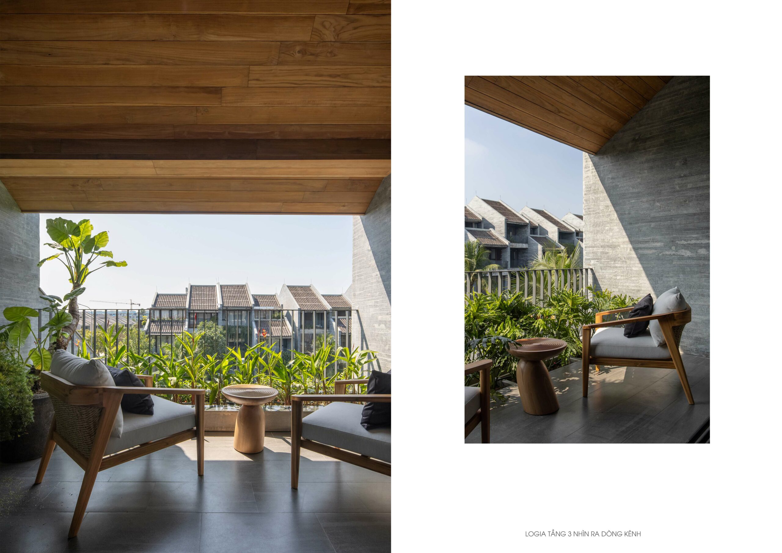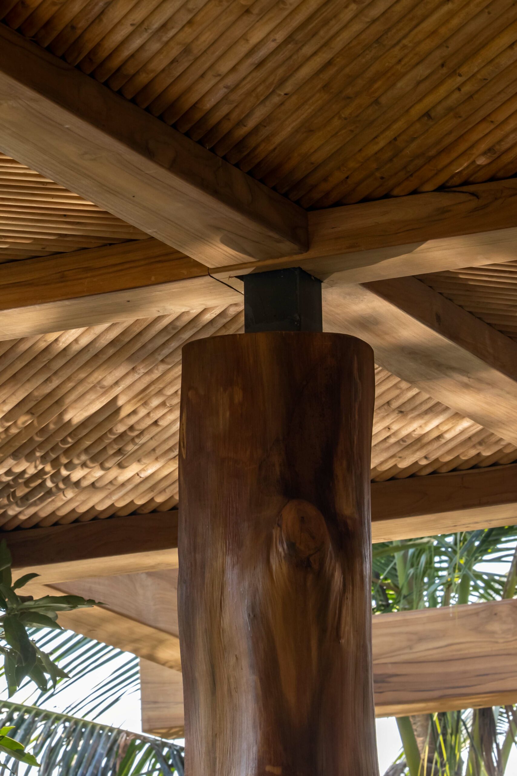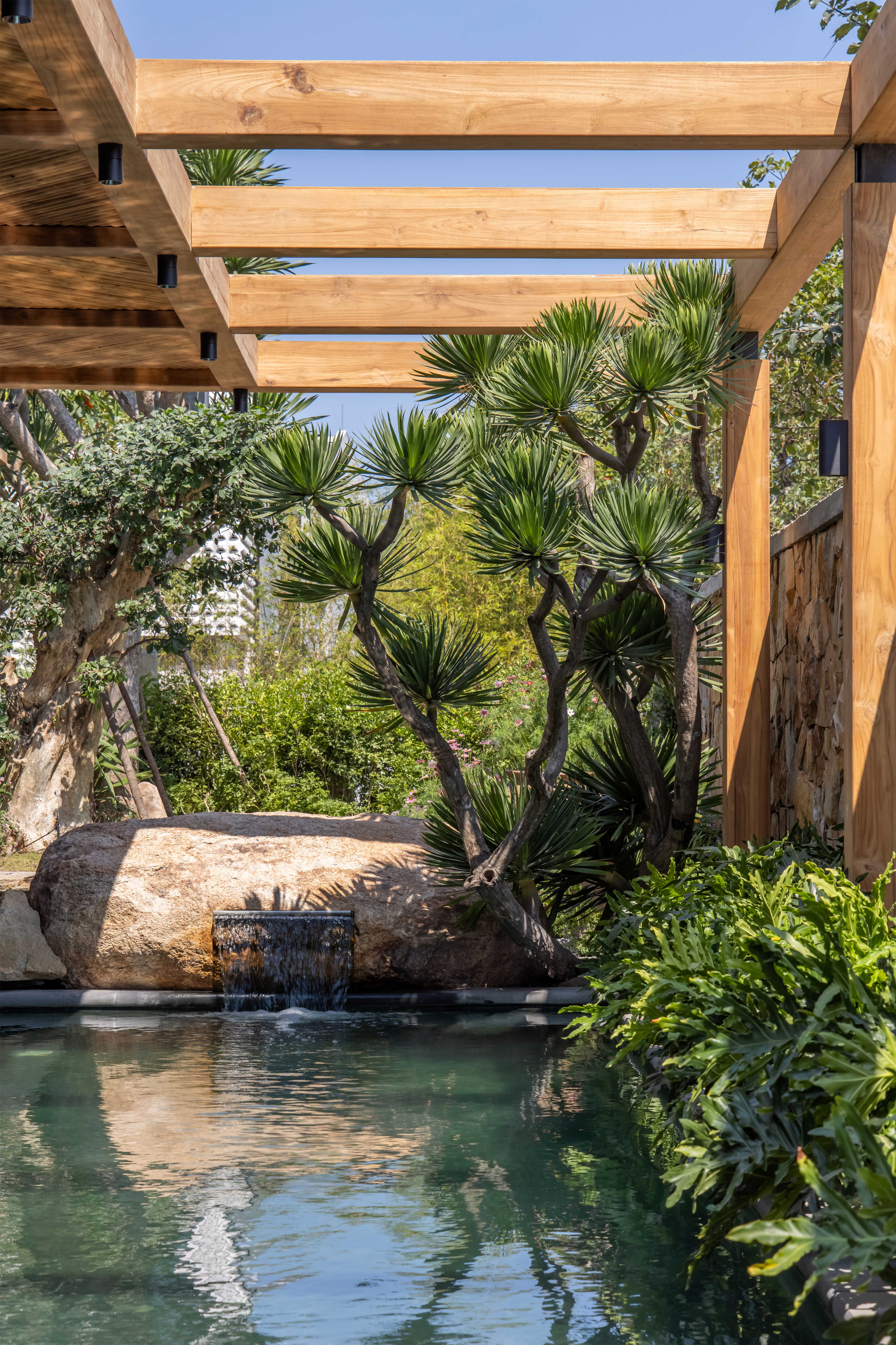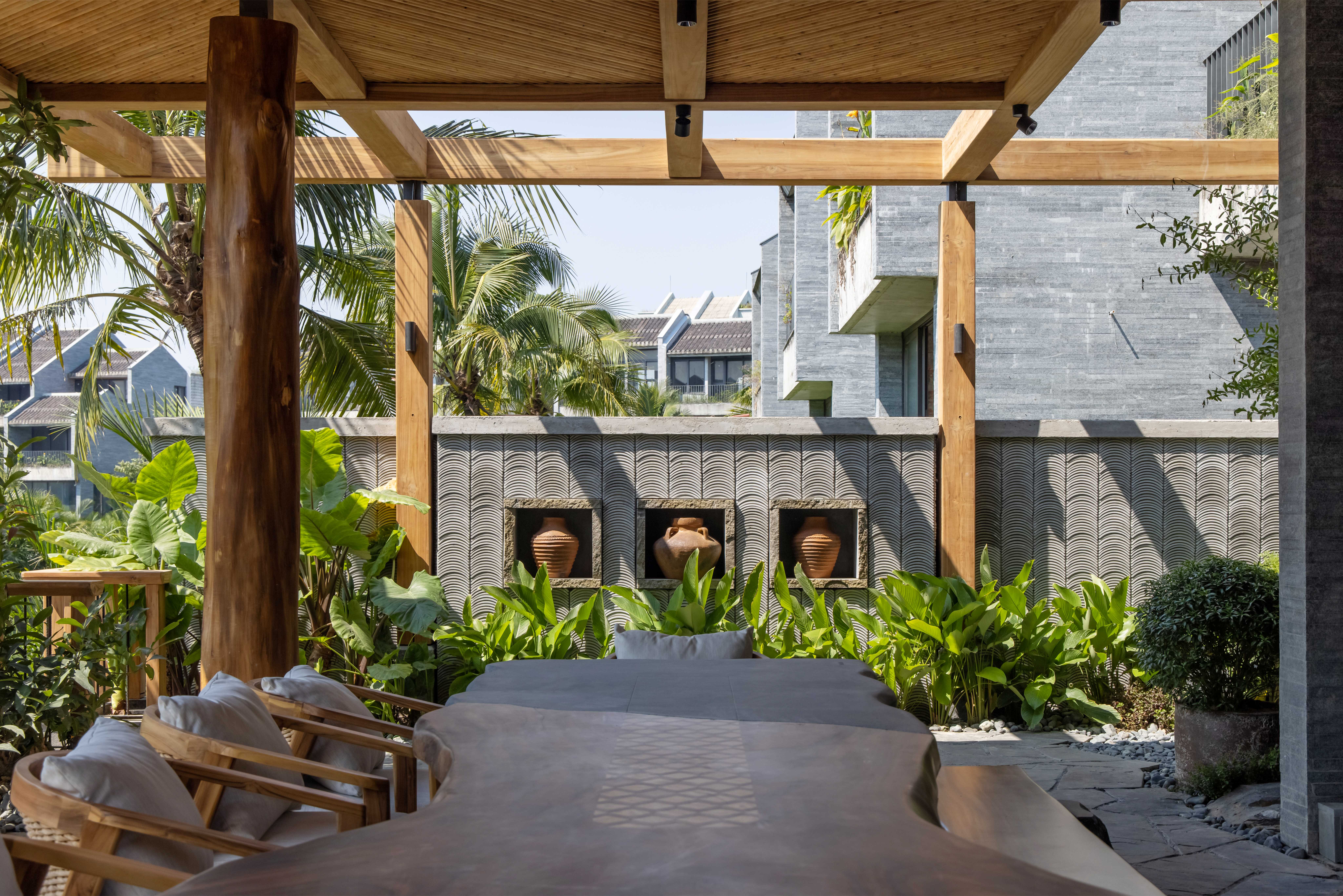 Hệ mái che ngoài trời sử dụng kết cấu gỗ teak, kết hợp mái ốp từ gỗ Tràm – loại gỗ gắn liền với kiến trúc dân gian – được xử lý thủ công theo quy cách họa tiết truyền thống.