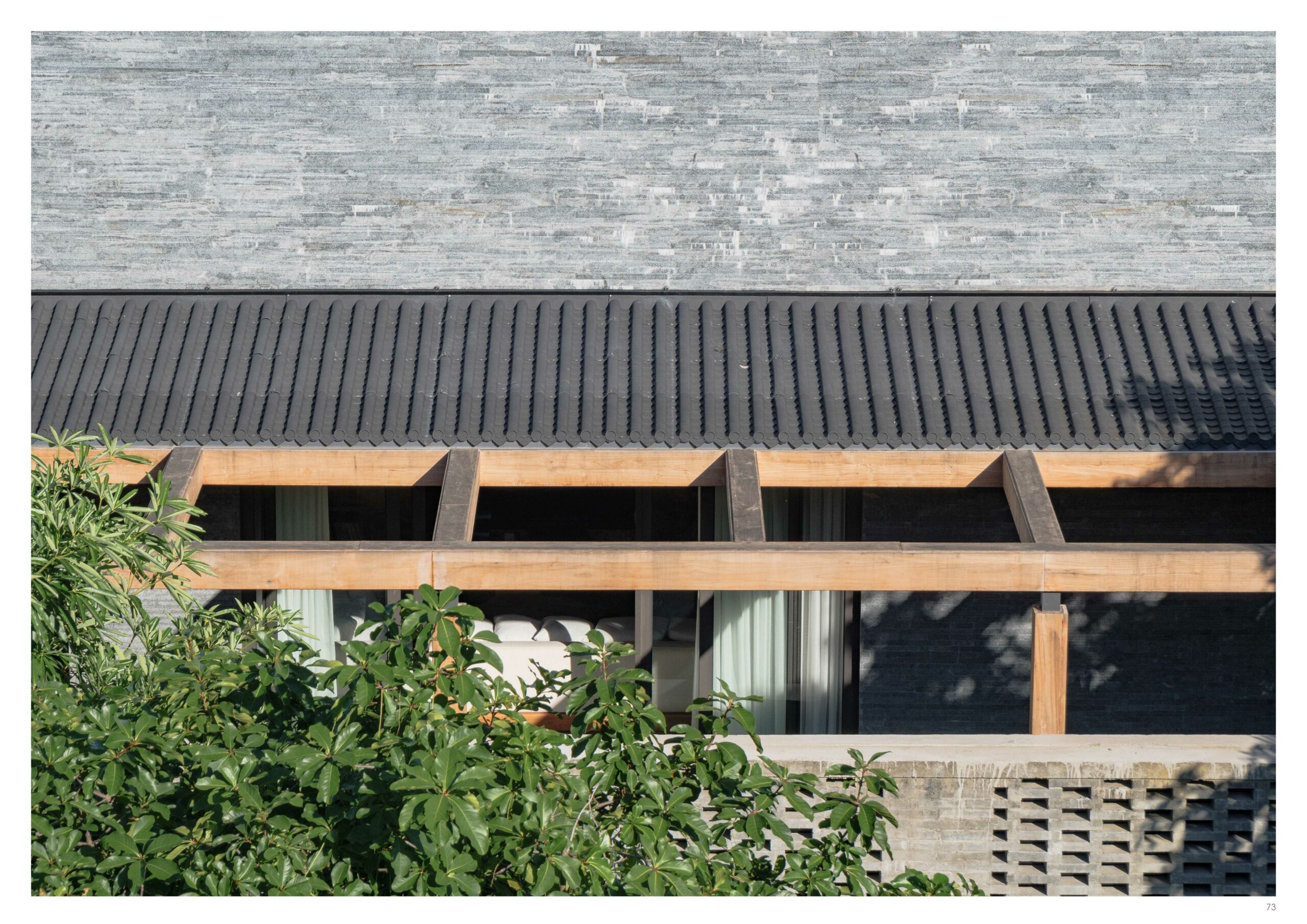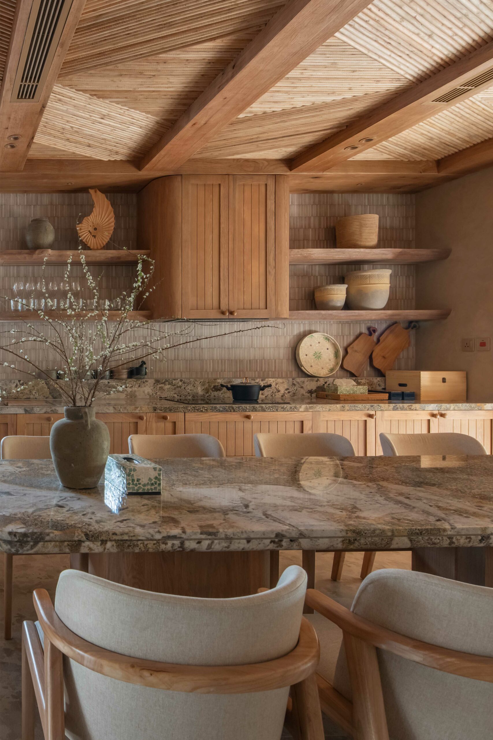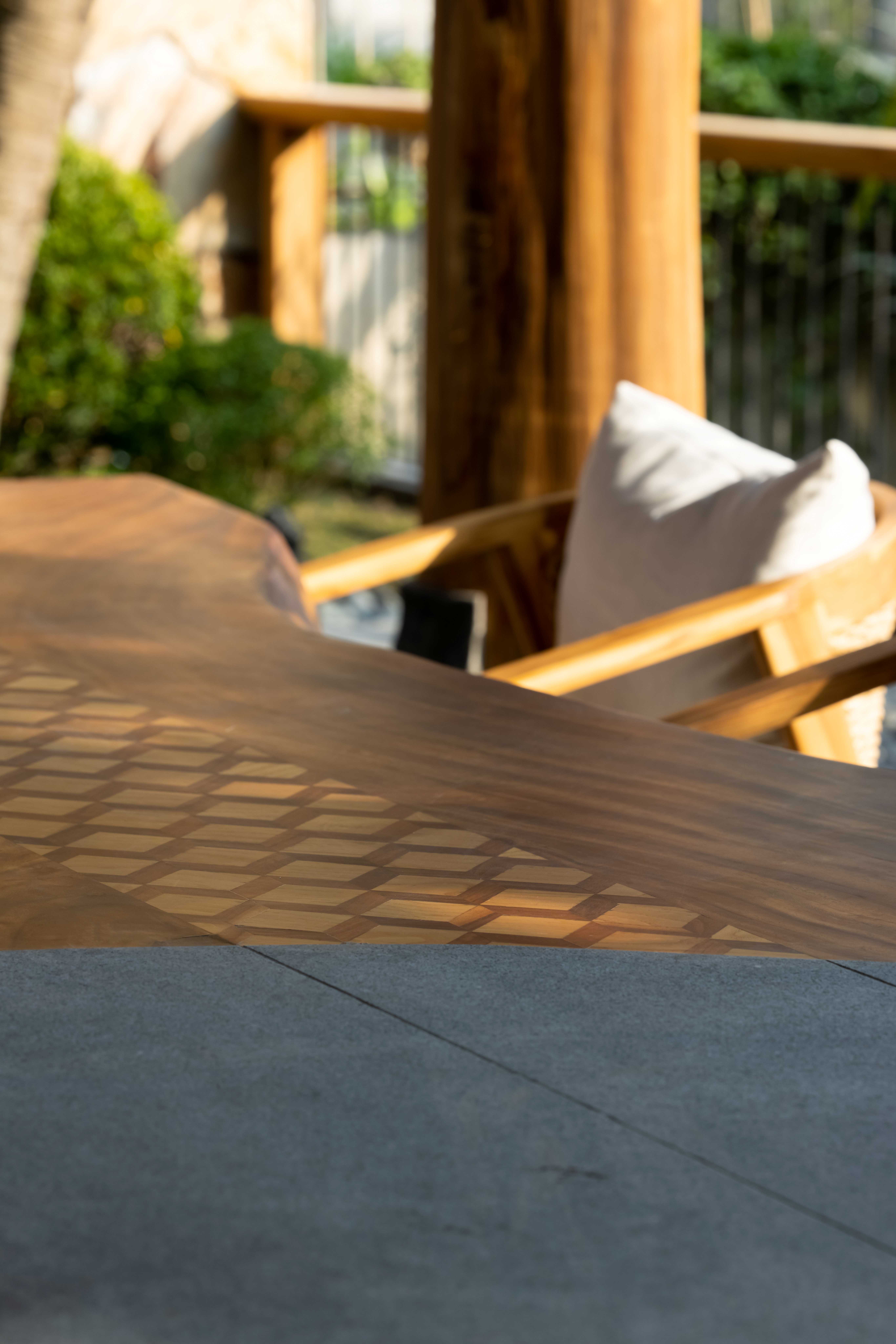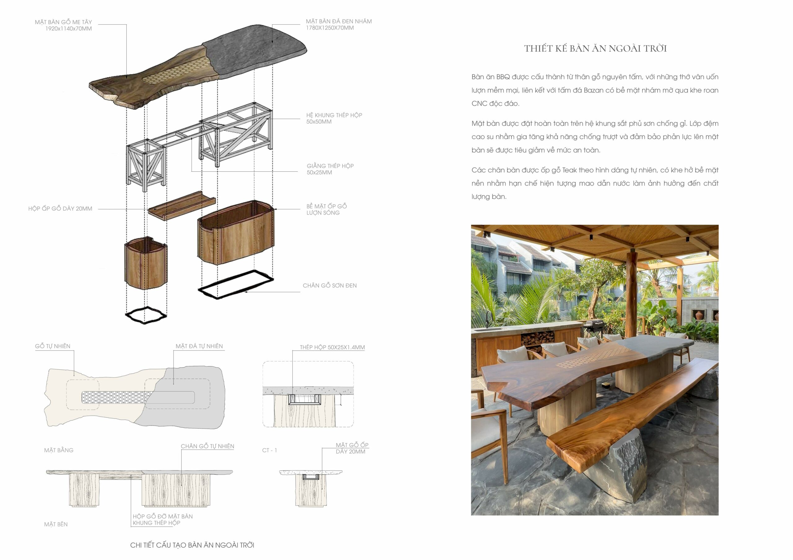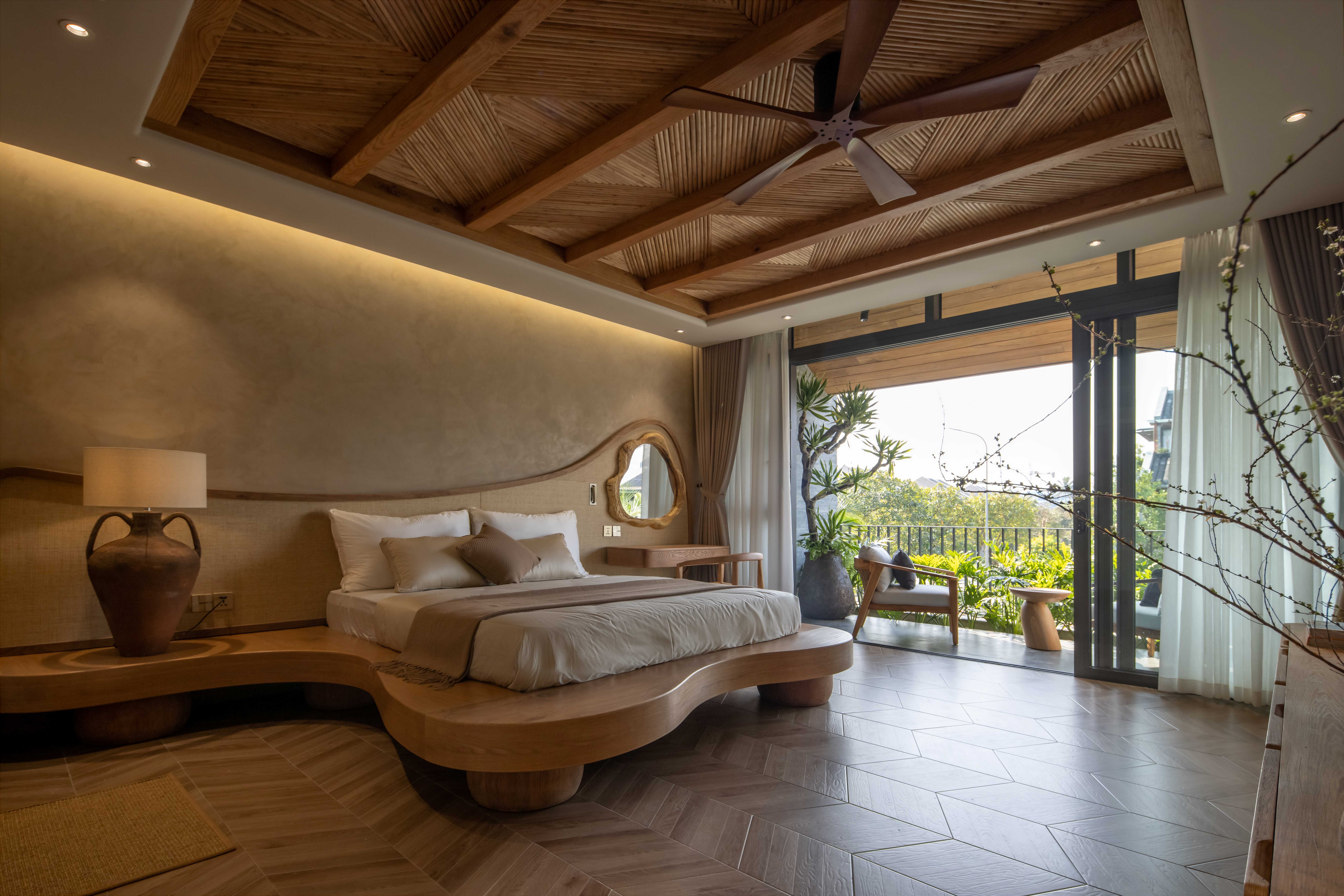 Hệ mái che ngoài trời sử dụng kết cấu gỗ teak, kết hợp mái ốp từ gỗ Tràm – loại gỗ gắn liền với kiến trúc dân gian – được xử lý thủ công theo quy cách họa tiết truyền thống.