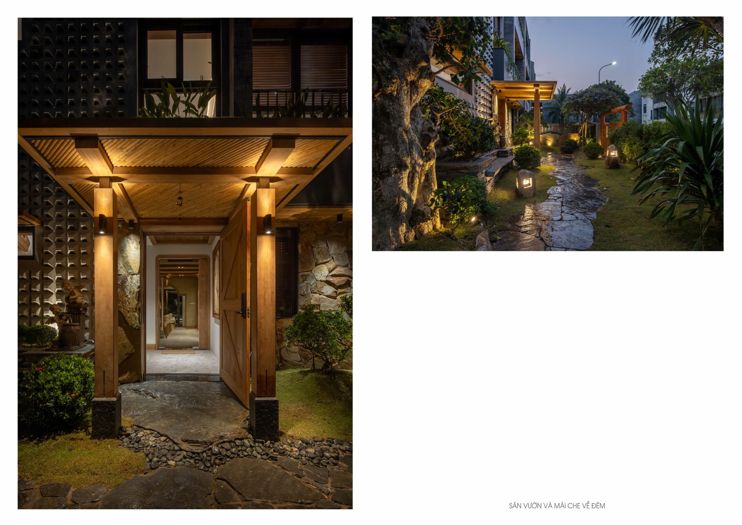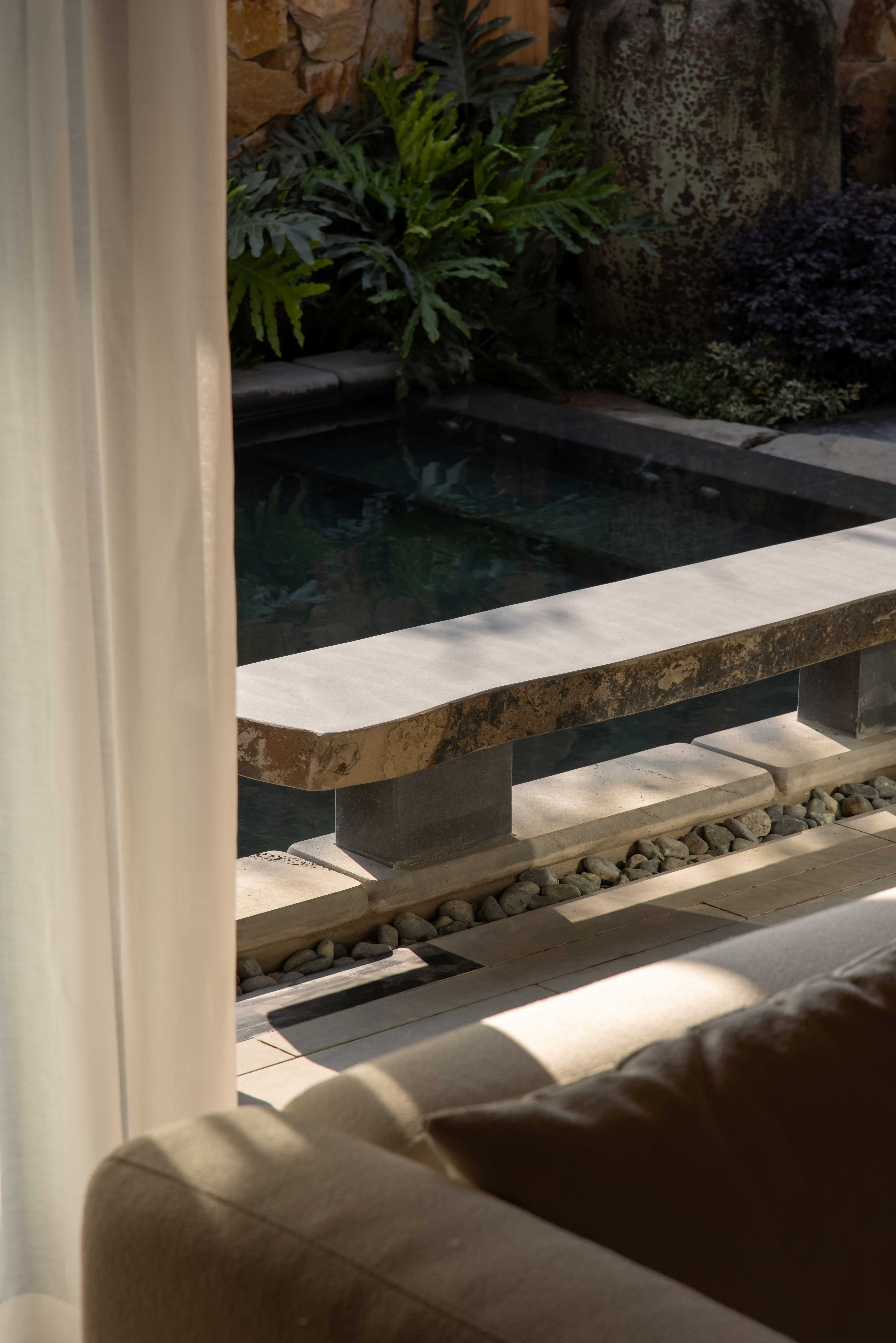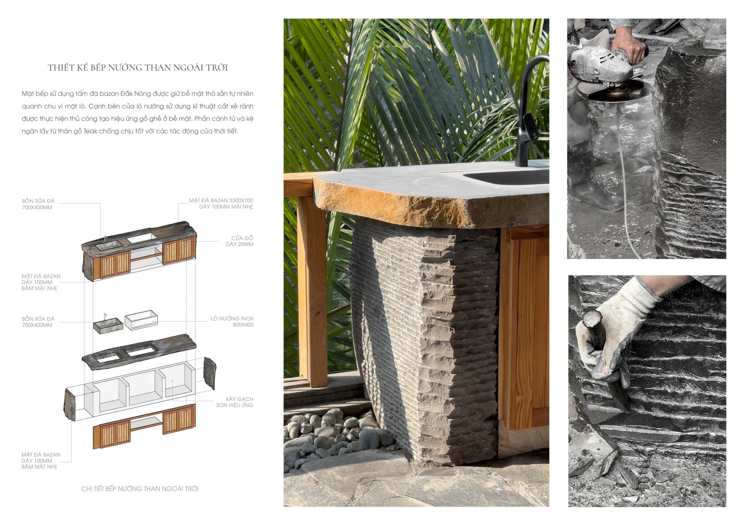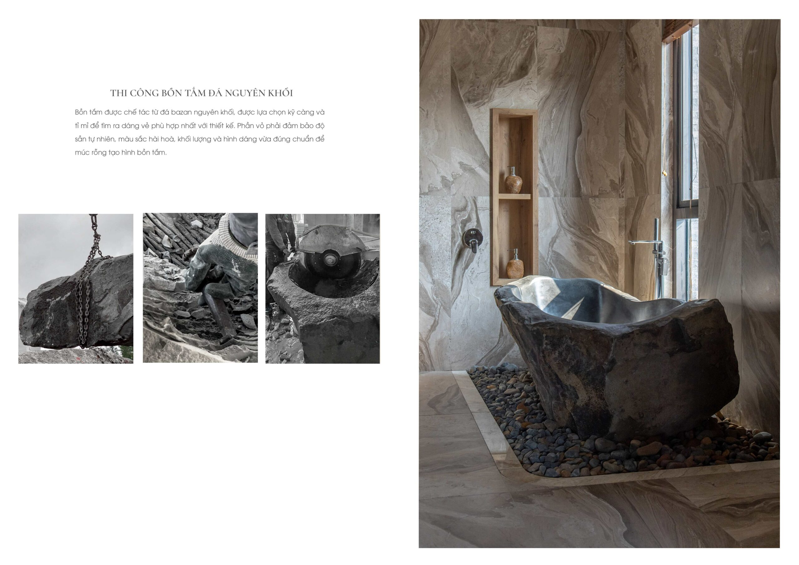 Trong không gian ngoại thất, trụ đèn và bồn tắm bằng đá Bazan nguyên khối Đắk Nông – vật liệu bản địa có nguồn gốc từ nham thạch núi lửa – được giữ gần như nguyên dạng tự nhiên, chỉ gia công tối thiểu để sử dụng. Điều này thể hiện sự trân trọng vật liệu và giá trị nguyên bản của tự nhiên Việt Nam.