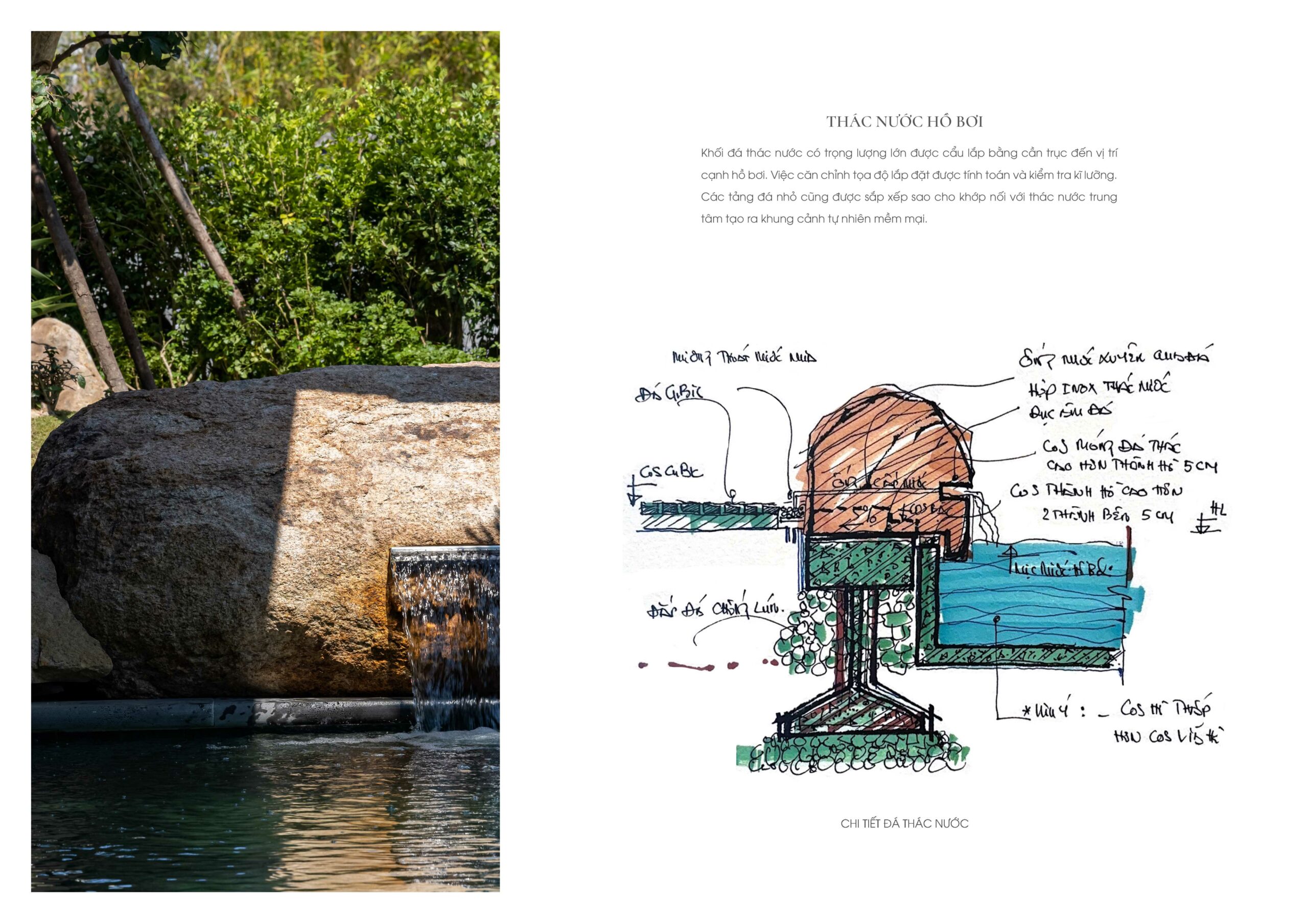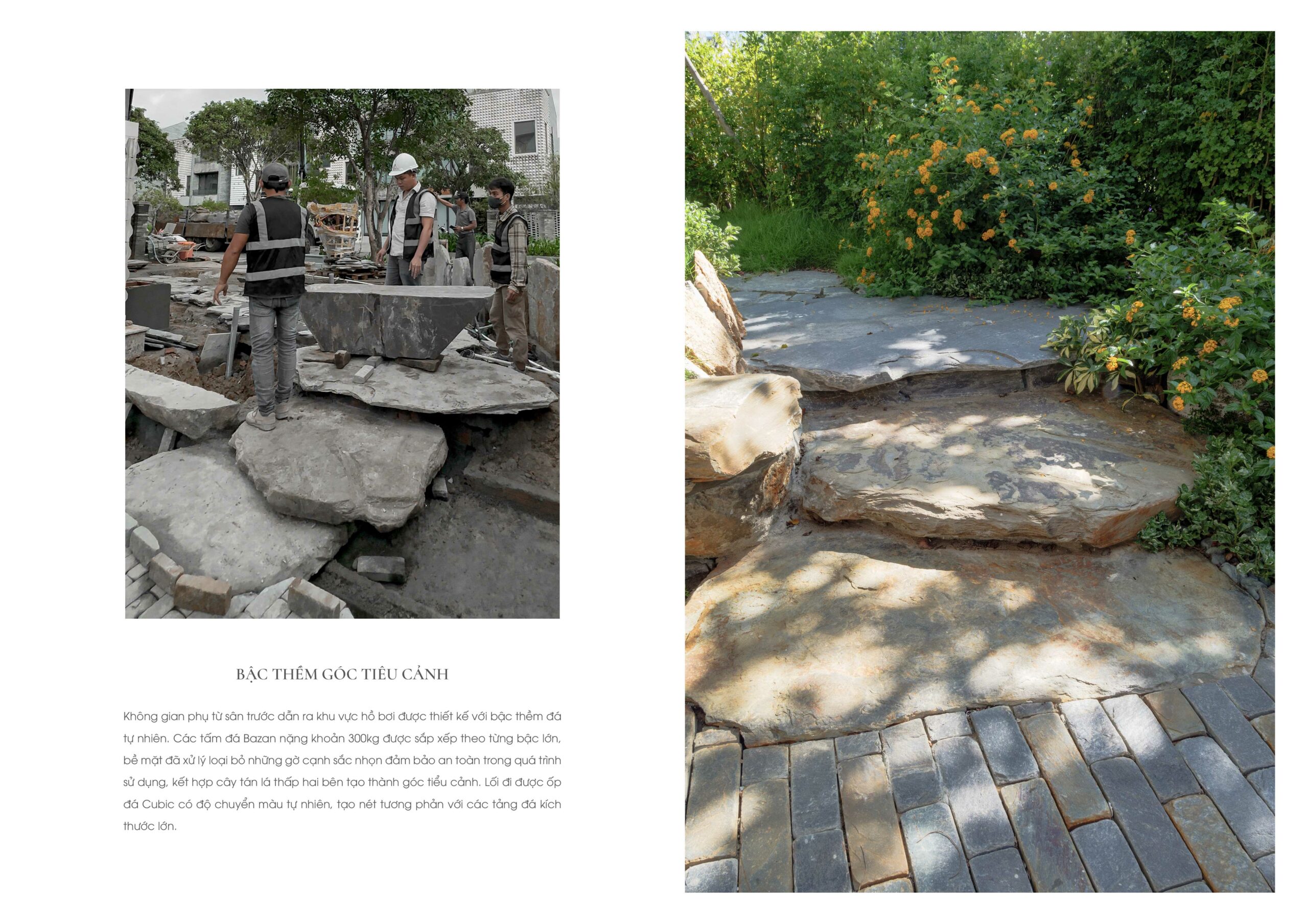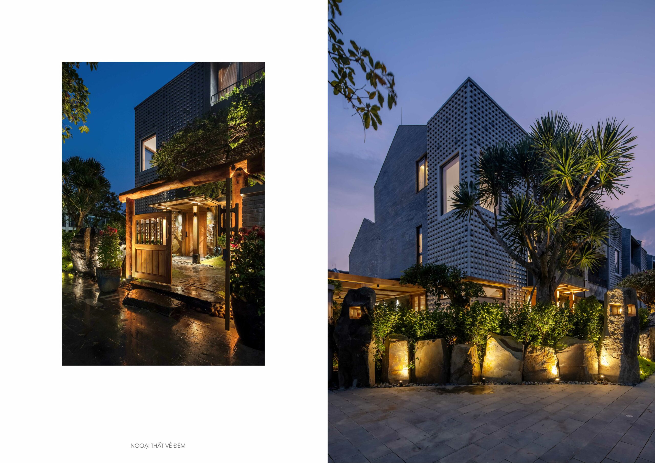 Trong không gian ngoại thất, trụ đèn và bồn tắm bằng đá Bazan nguyên khối Đắk Nông – vật liệu bản địa có nguồn gốc từ nham thạch núi lửa – được giữ gần như nguyên dạng tự nhiên, chỉ gia công tối thiểu để sử dụng. Điều này thể hiện sự trân trọng vật liệu và giá trị nguyên bản của tự nhiên Việt Nam.