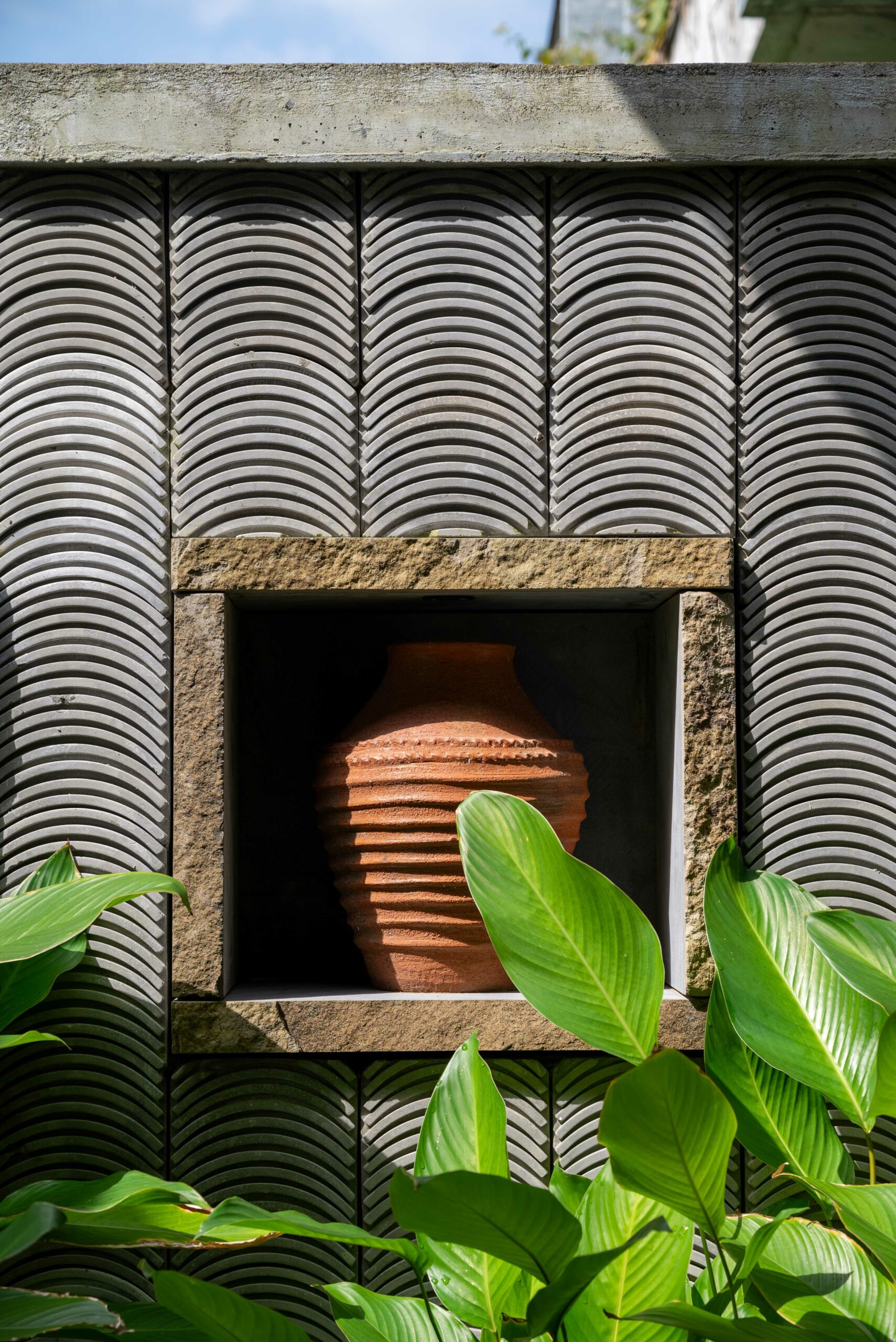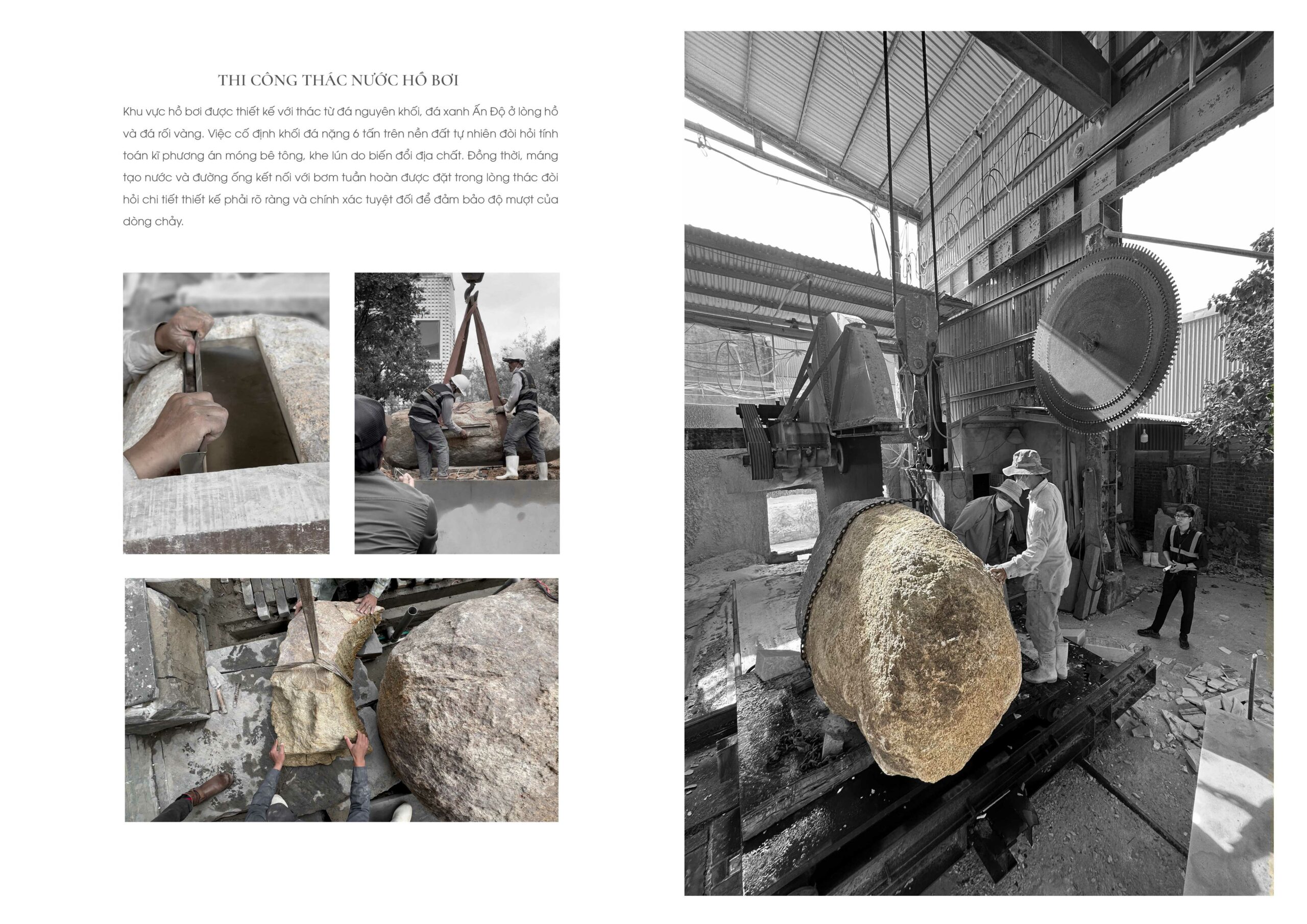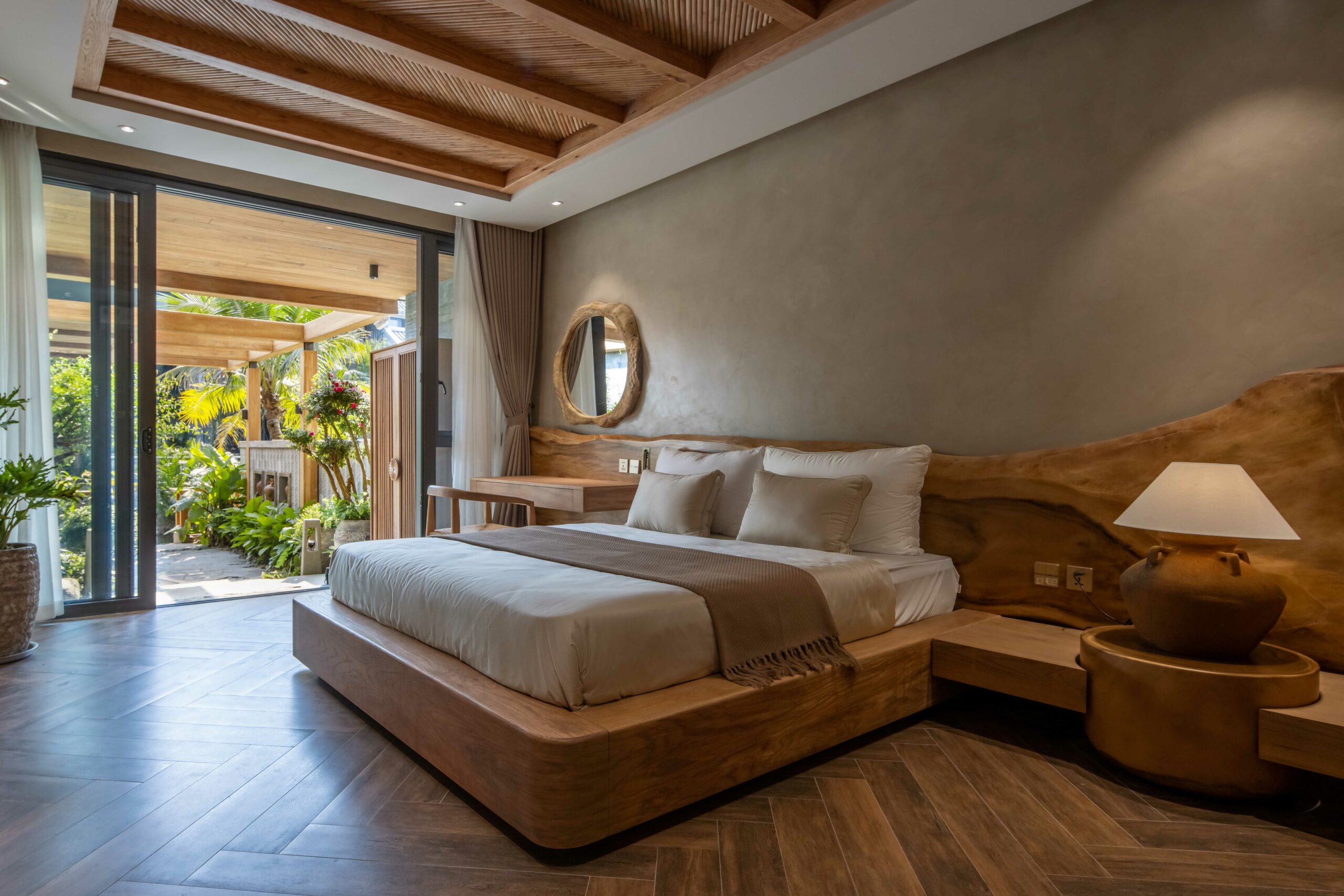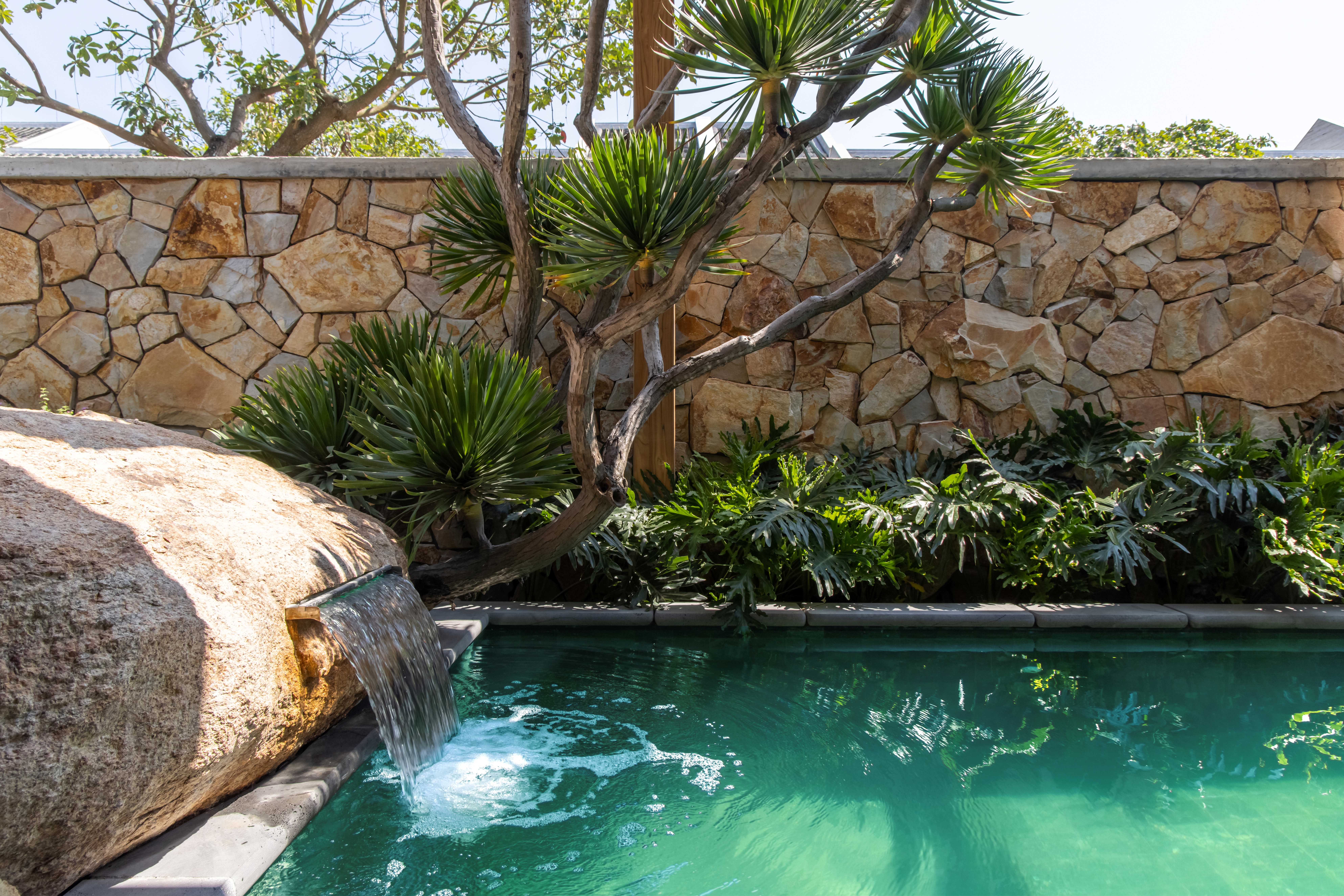 Trong không gian ngoại thất, trụ đèn và bồn tắm bằng đá Bazan nguyên khối Đắk Nông – vật liệu bản địa có nguồn gốc từ nham thạch núi lửa – được giữ gần như nguyên dạng tự nhiên, chỉ gia công tối thiểu để sử dụng. Điều này thể hiện sự trân trọng vật liệu và giá trị nguyên bản của tự nhiên Việt Nam.