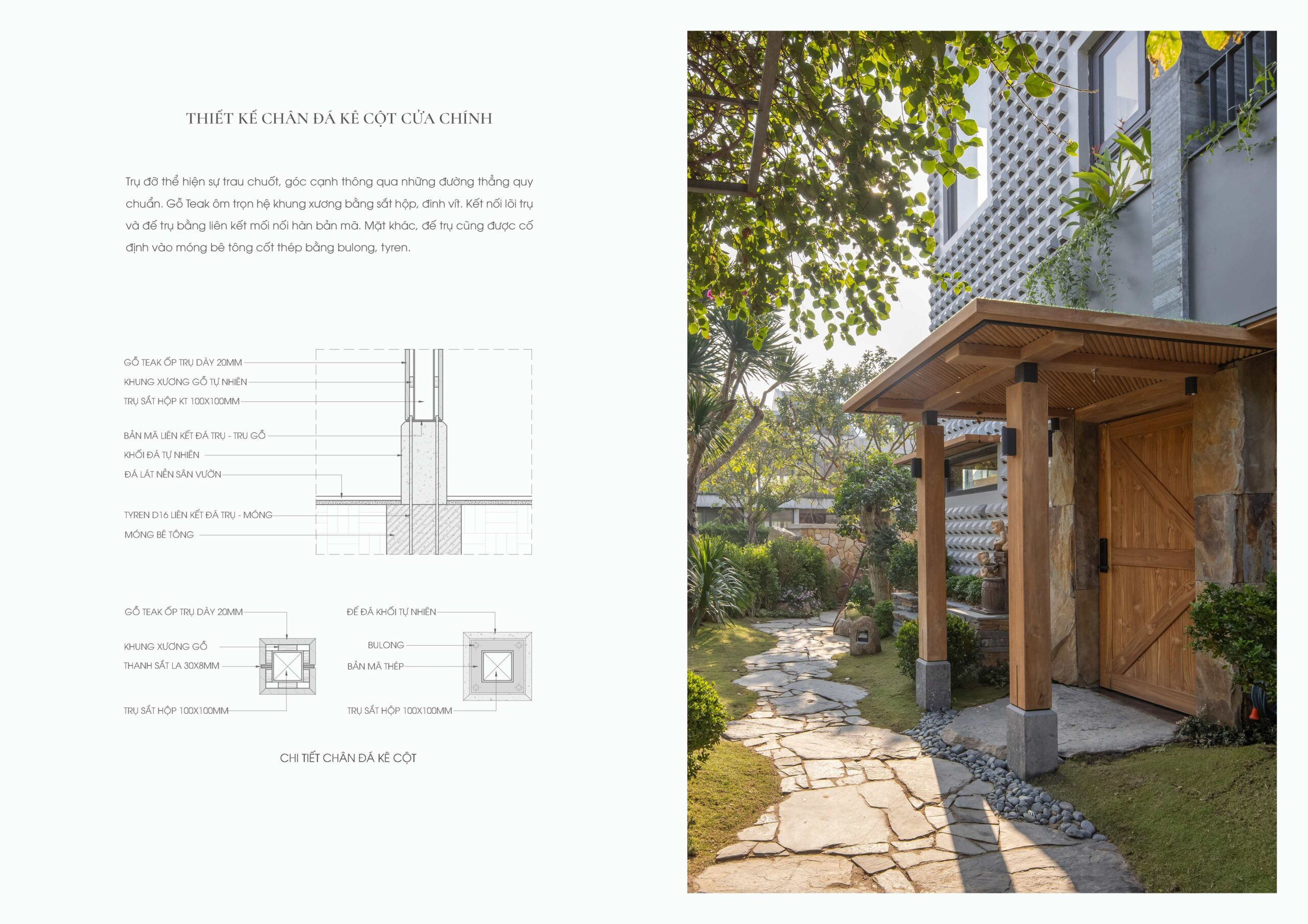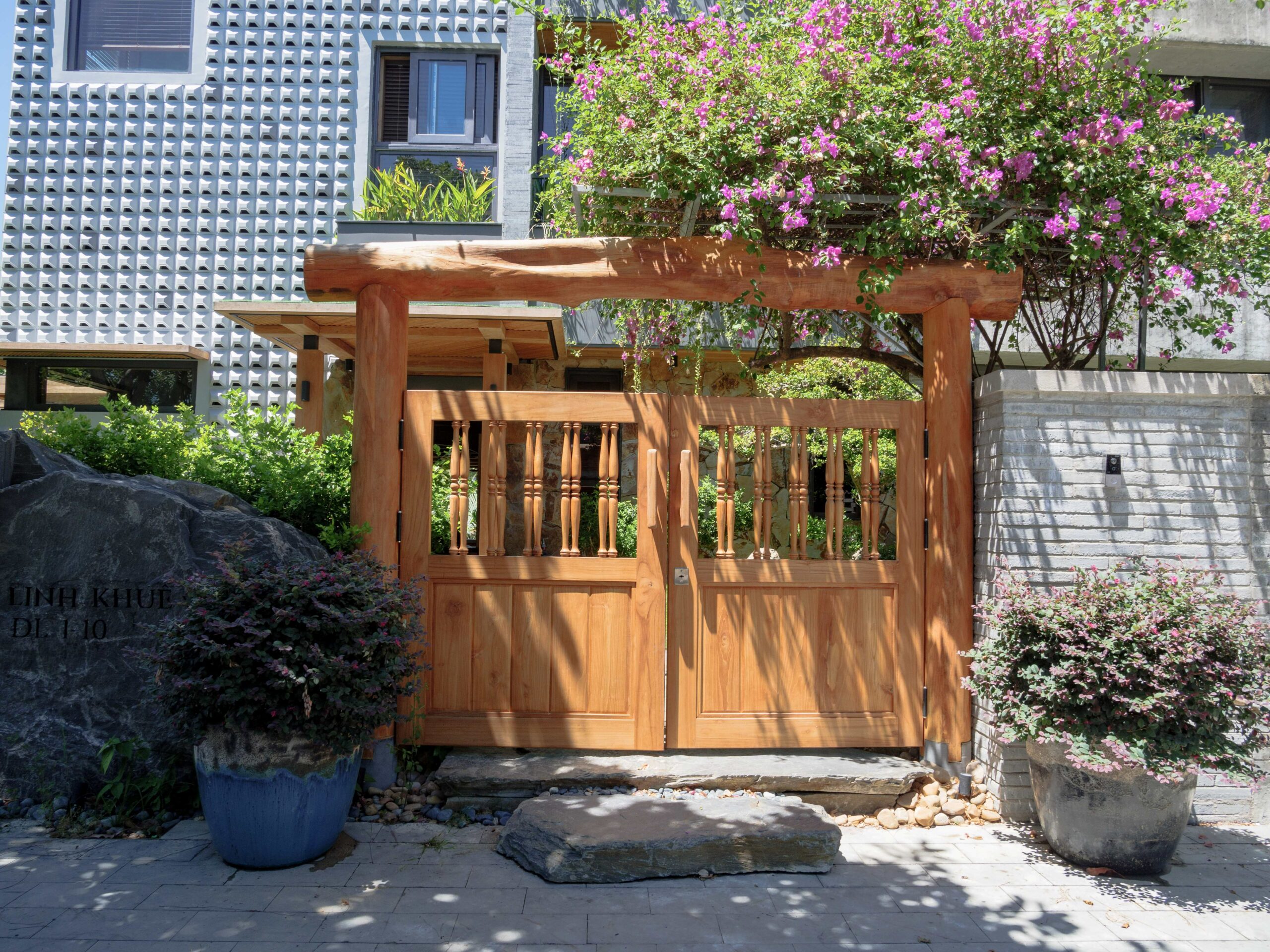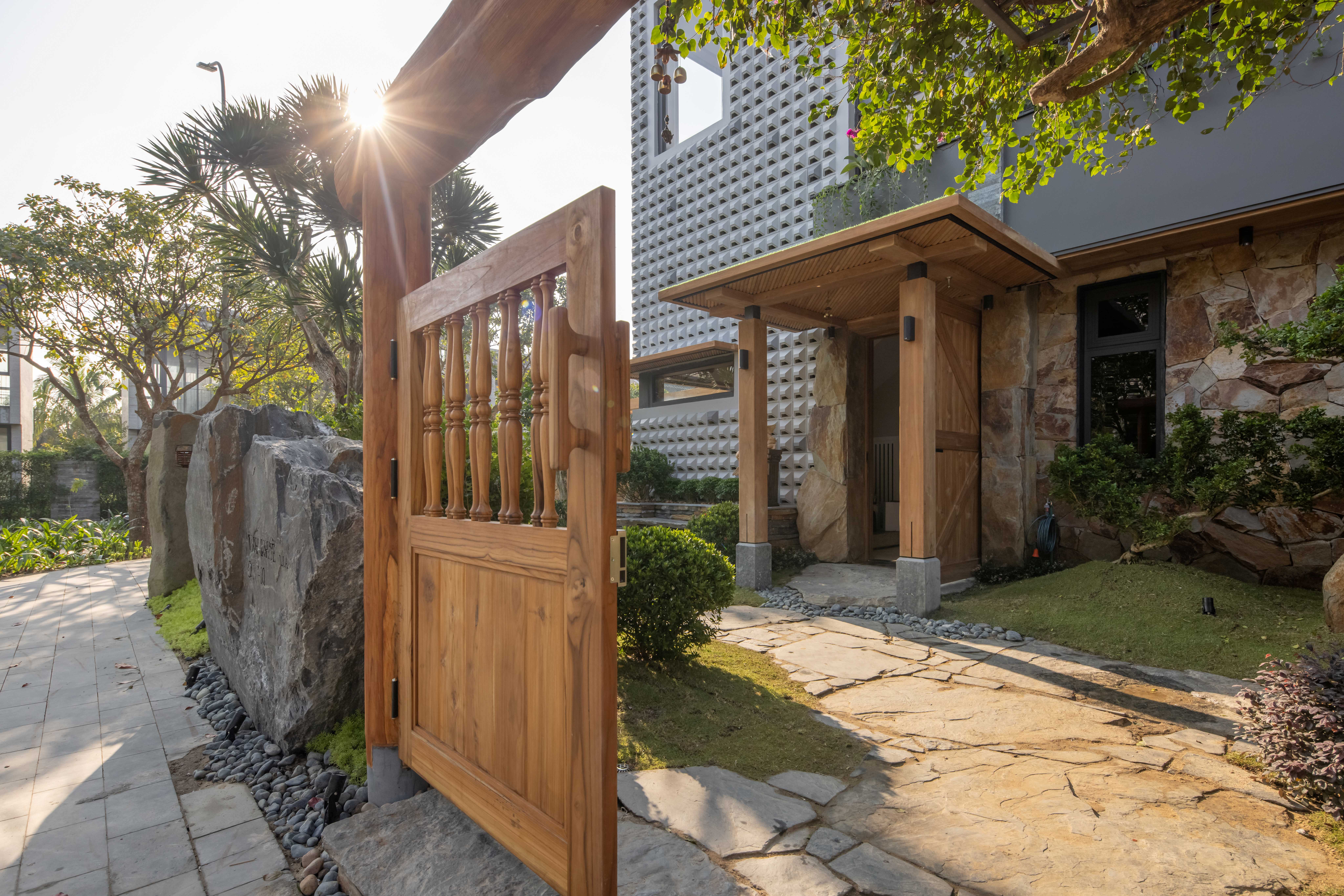 Dấu ấn bản địa được thể hiện xuyên suốt, bắt đầu từ cổng chính làm bằng gỗ teak, chạm khắc hình thức con tiện quen thuộc trong đồ gỗ Việt xưa. Không gian cổng được làm mềm bằng giàn hoa giấy rủ xuống, gợi hình ảnh ngôi nhà quê yên bình, chào đón bằng cảm xúc thân thuộc.