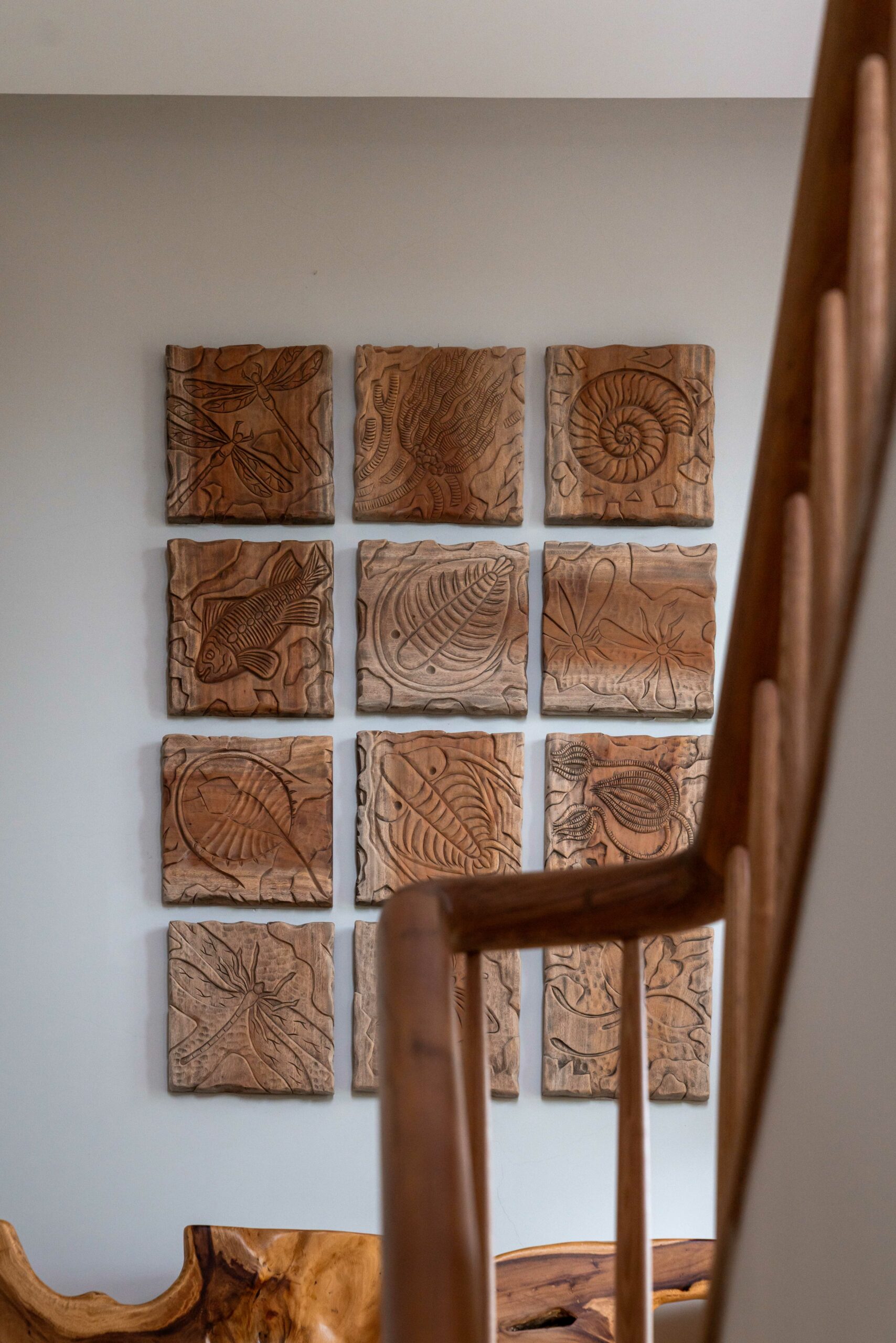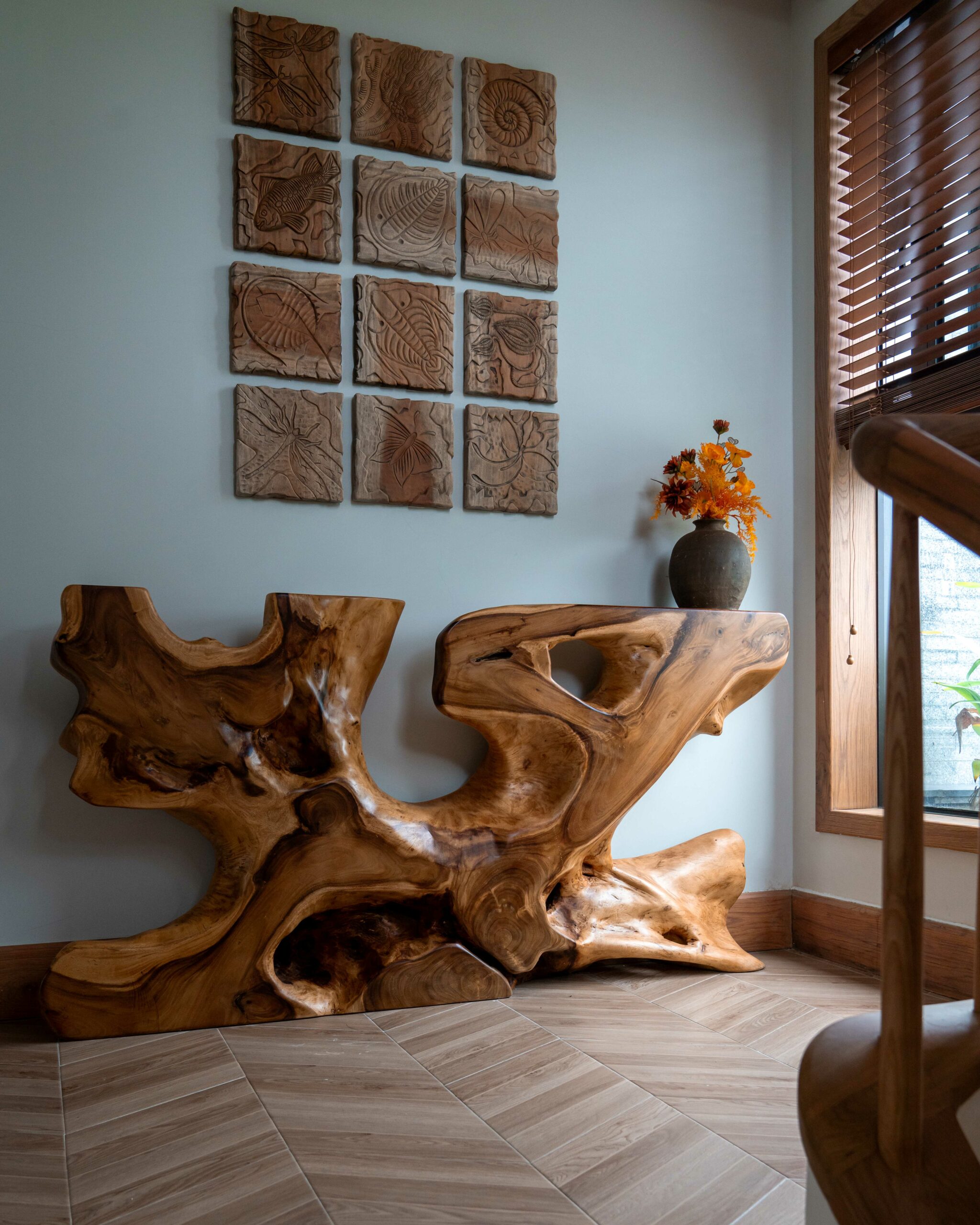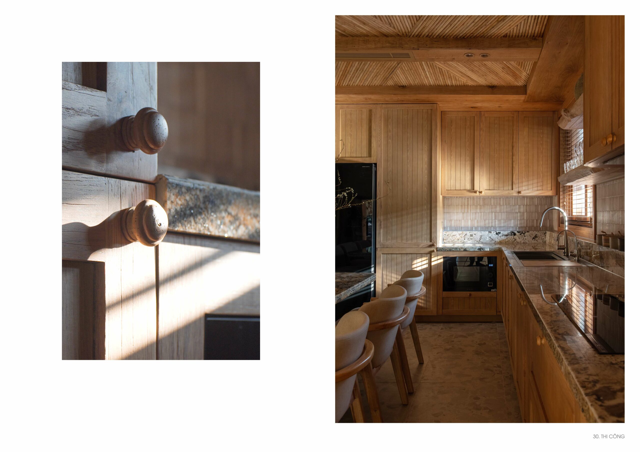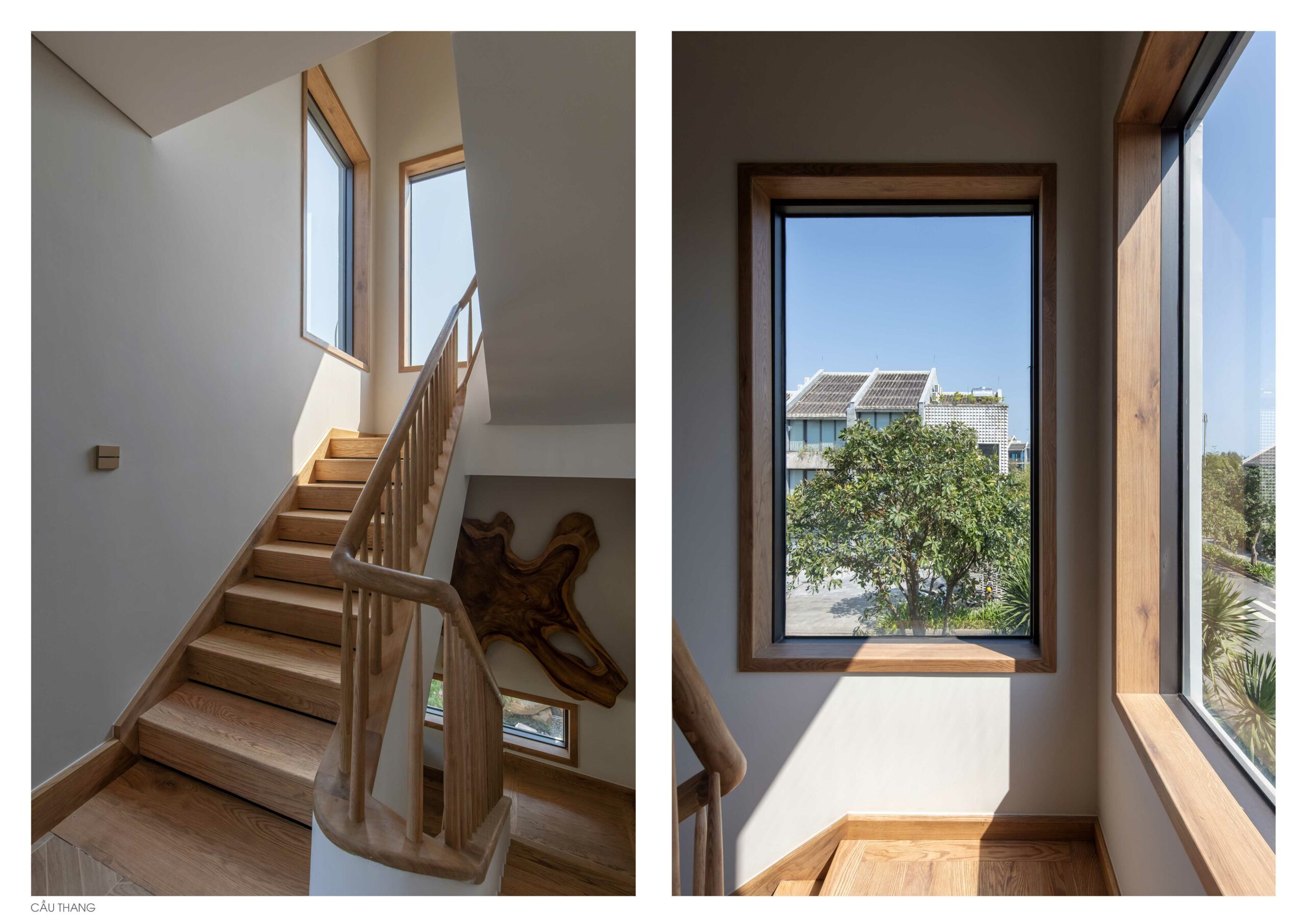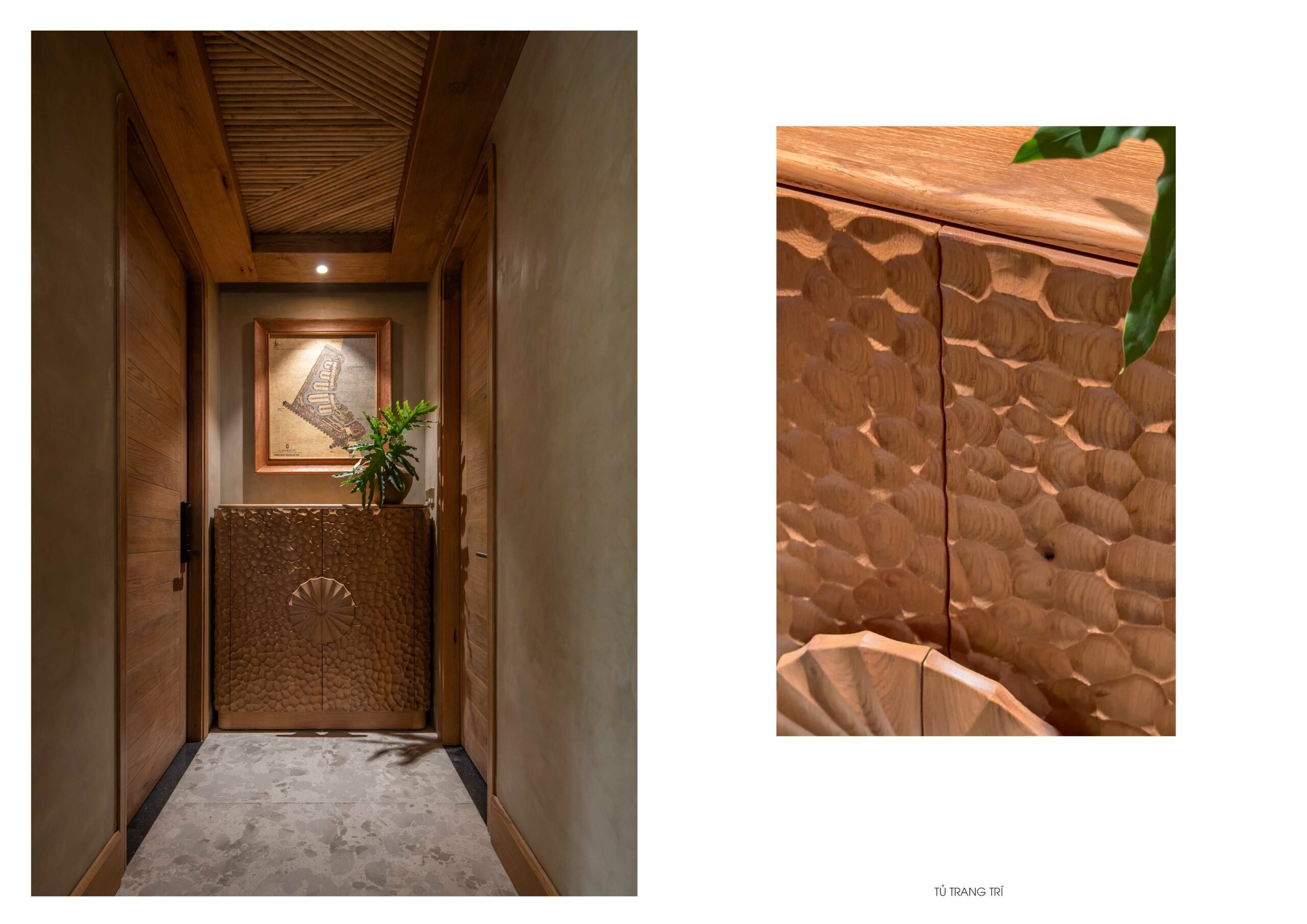 Không gian nội thất là các chi tiết của các tác phẩm điêu khắc gỗ thủ công được thực hiện bởi nghệ nhân Việt, dựa trên thiết kế của kiến trúc sư, như một cách đưa làng nghề truyền thống bước vào đời sống kiến trúc đương đại.