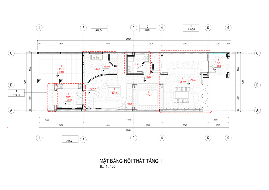 Thiết kế tập trung vào không gian sinh hoạt chung tầng 1 với bố cục mở, các khu vực kết nối liền mạch không vách ngăn cứng. Phòng khách – bếp – ăn được bố trí liên thông, tạo môi trường cho các hoạt động gia đình diễn ra đồng thời: bố xem bóng đá trên sofa, trẻ con nằm nghịch trên ghế, mẹ nấu ăn trong bếp tất cả vẫn cảm nhận được sự hiện diện của nhau. Đây chính là không gian “cùng nhau” mà vẫn “tự do”, nơi mỗi người có hoạt động riêng nhưng không bị tách biệt.