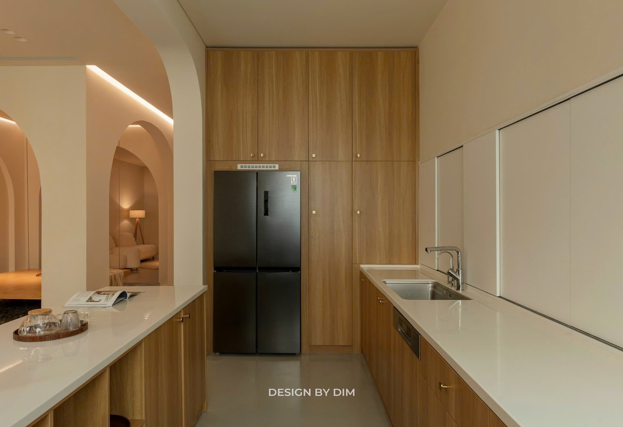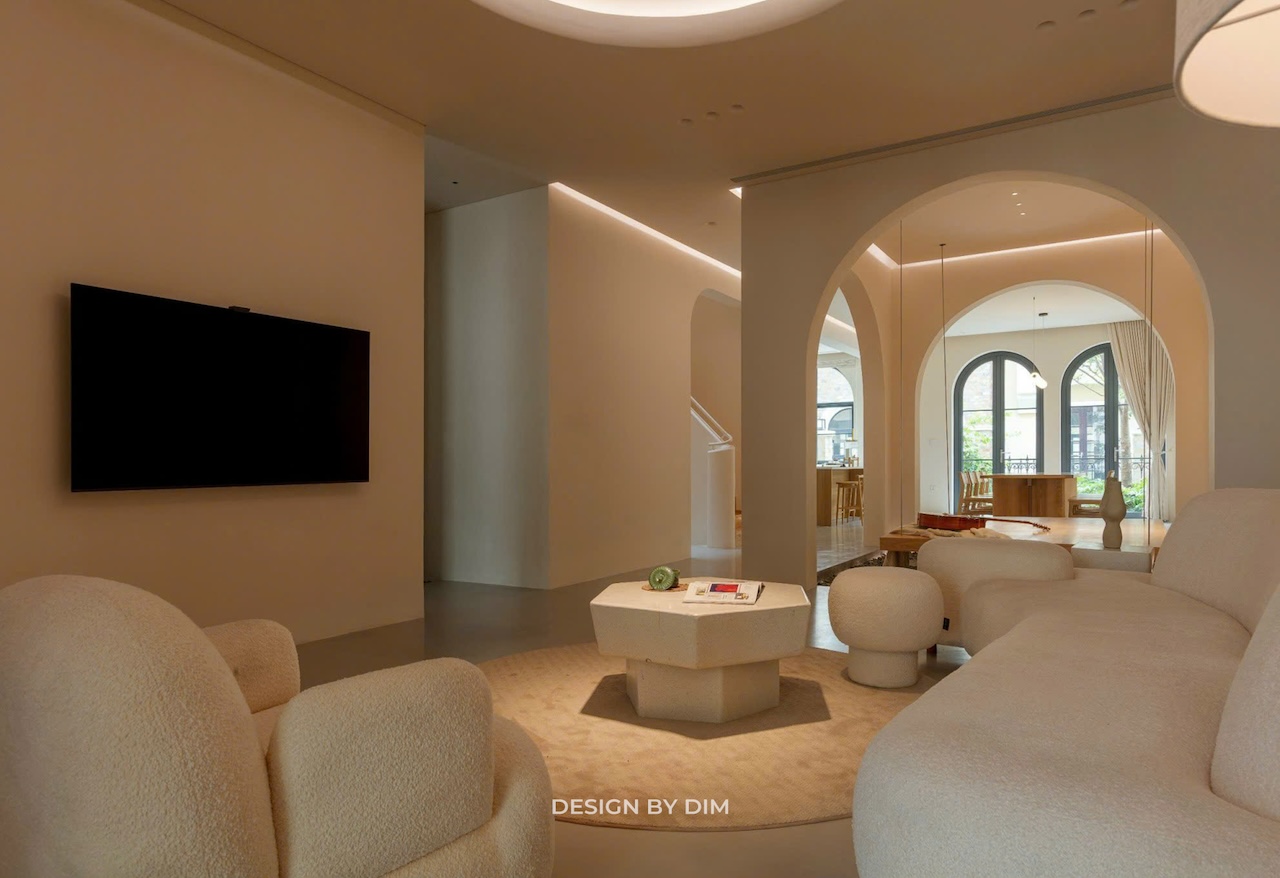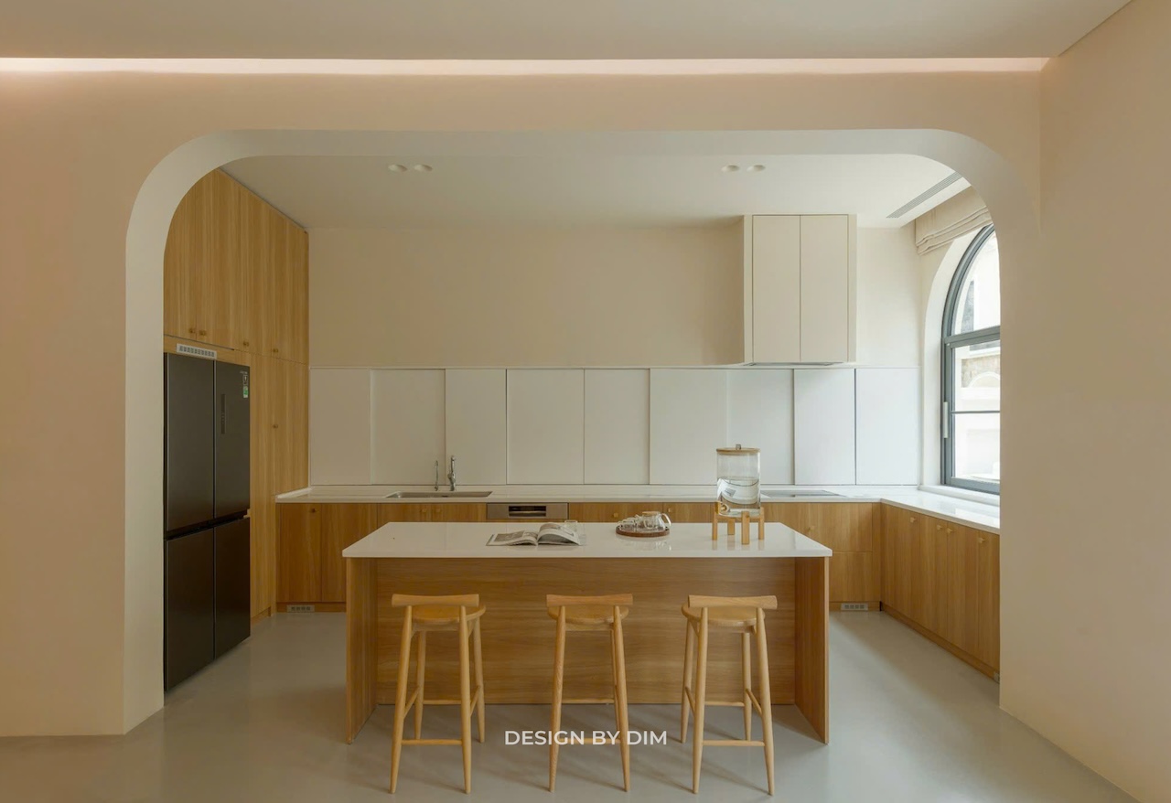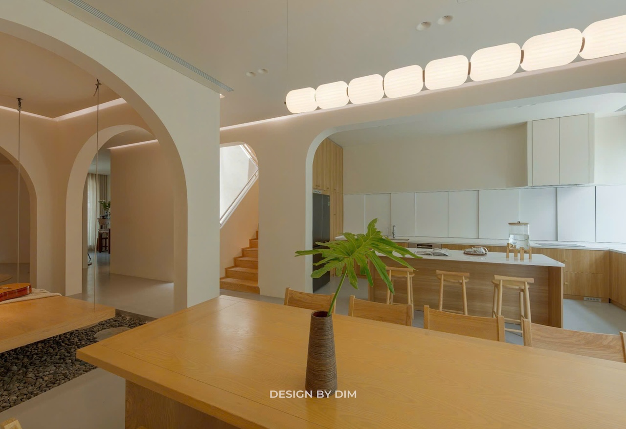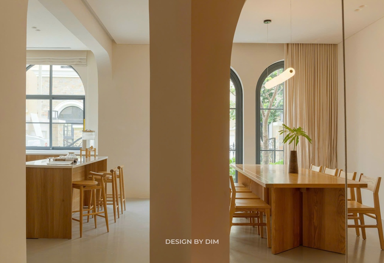 Tone màu kem – trắng – vàng tạo không gian ấm áp và tinh tế. Tường sơn be nhạt kết hợp sàn gỗ tự nhiên, tạo nền trung tính nhưng không lạnh lẽo. Kết cấu vòm xuất hiện ở cửa đi và hốc tường, vừa tạo điểm nhấn kiến trúc vừa làm mềm không gian, xóa đi sự cứng nhắc của các góc vuông. Đèn thả trắng ấm trên bàn ăn tạo tiêu điểm mềm mại, định nghĩa vùng sinh hoạt mà không cần vách ngăn.