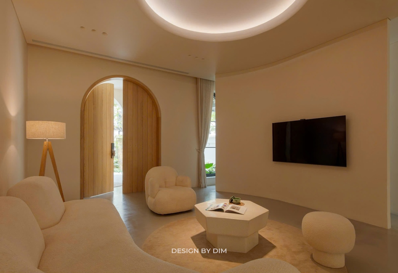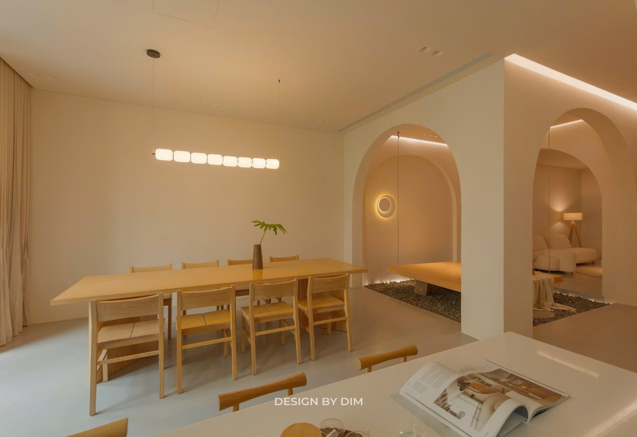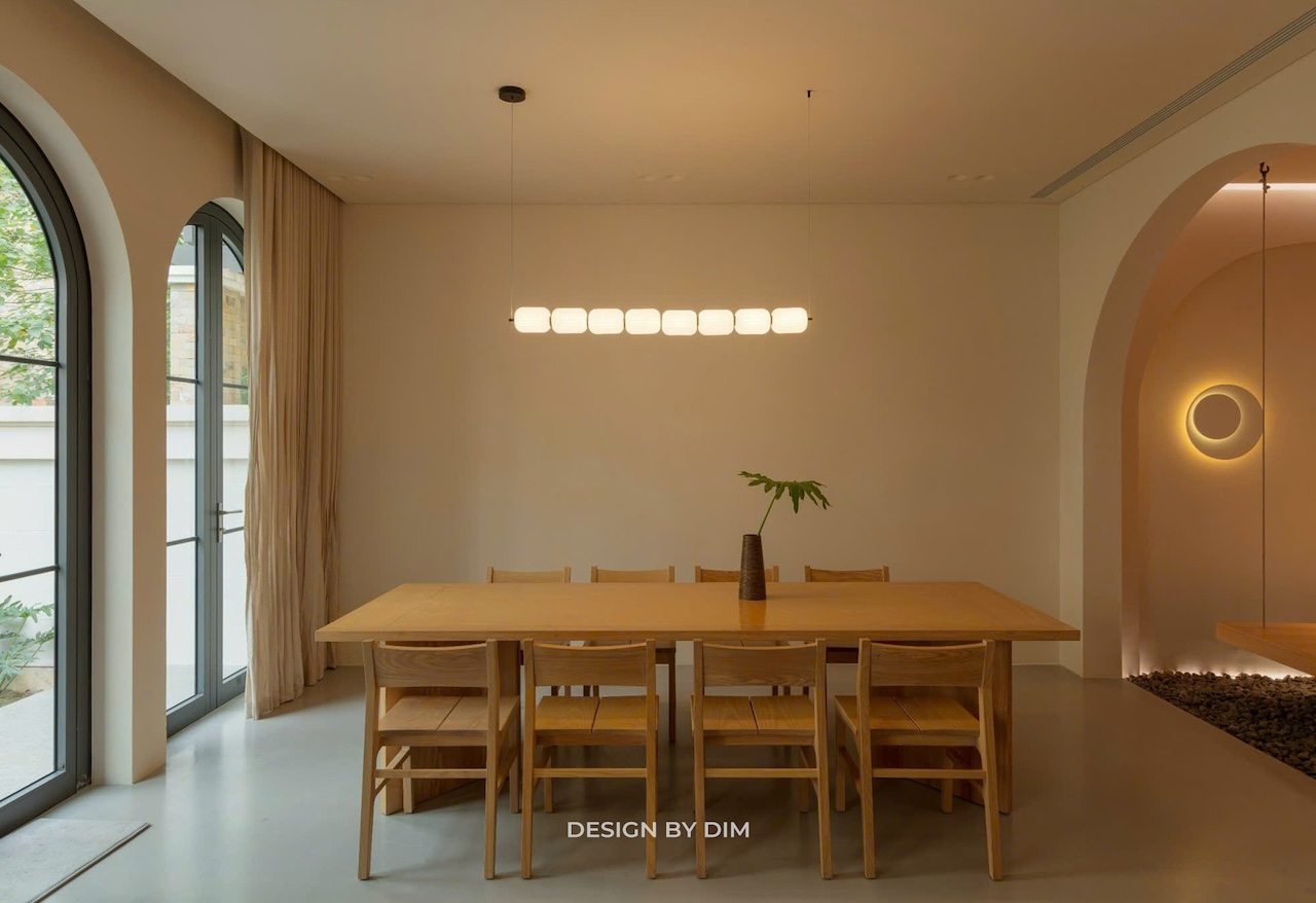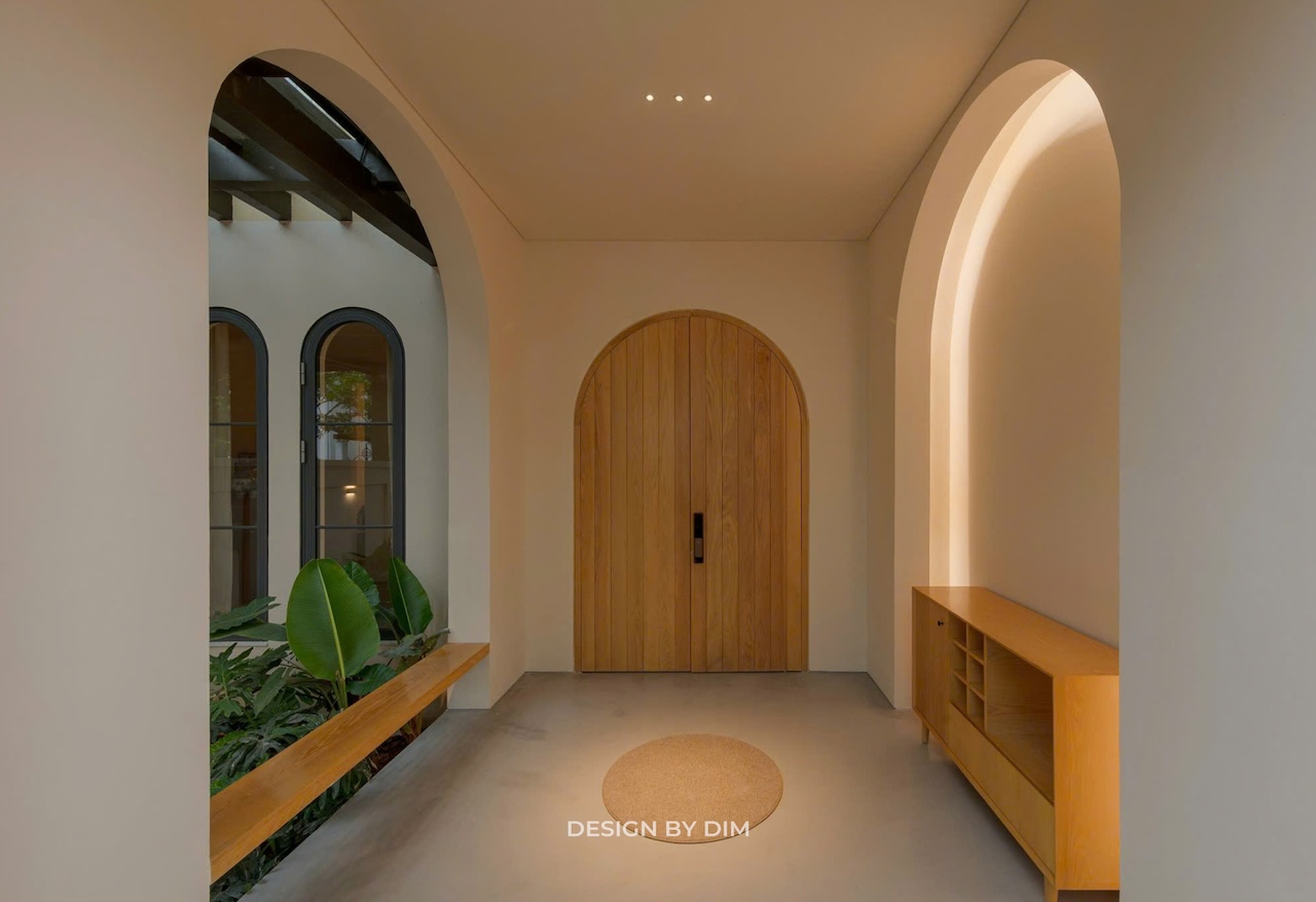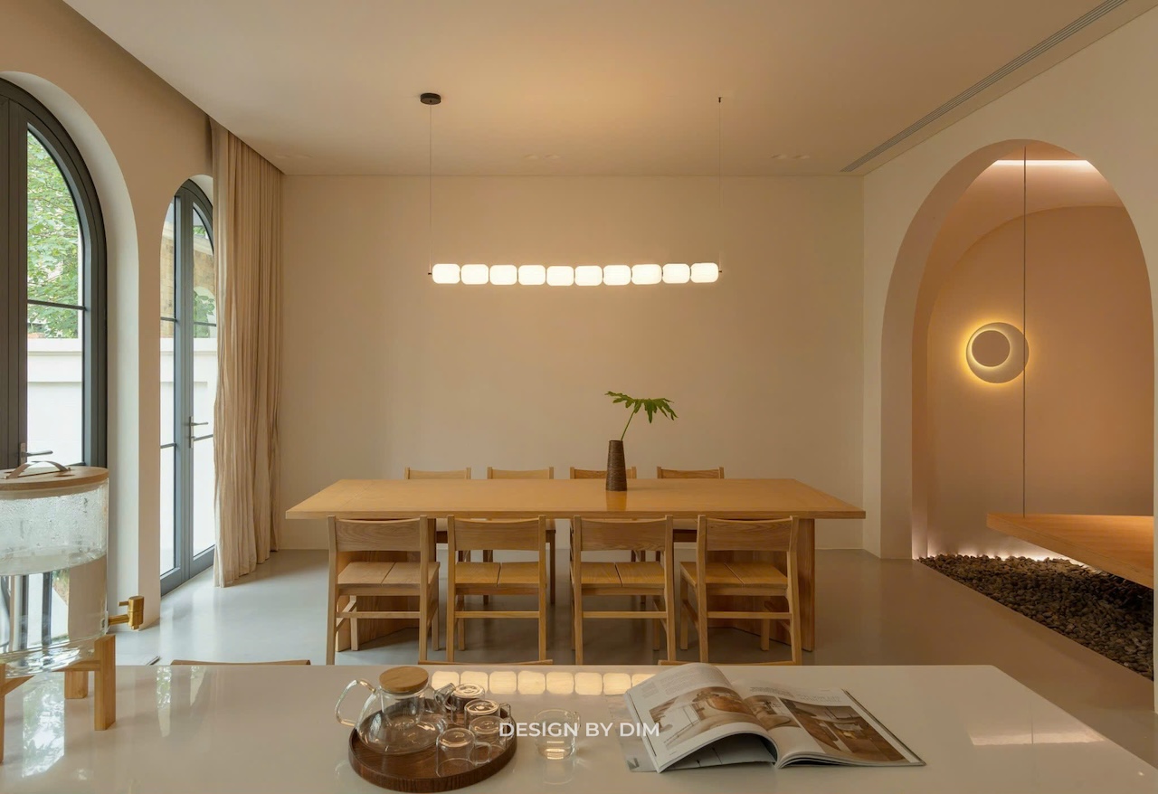 Tone màu kem – trắng – vàng tạo không gian ấm áp và tinh tế. Tường sơn be nhạt kết hợp sàn gỗ tự nhiên, tạo nền trung tính nhưng không lạnh lẽo. Kết cấu vòm xuất hiện ở cửa đi và hốc tường, vừa tạo điểm nhấn kiến trúc vừa làm mềm không gian, xóa đi sự cứng nhắc của các góc vuông. Đèn thả trắng ấm trên bàn ăn tạo tiêu điểm mềm mại, định nghĩa vùng sinh hoạt mà không cần vách ngăn.