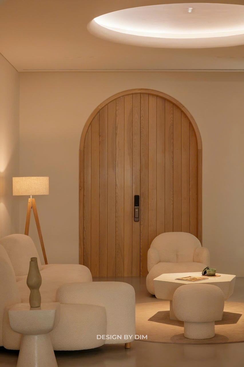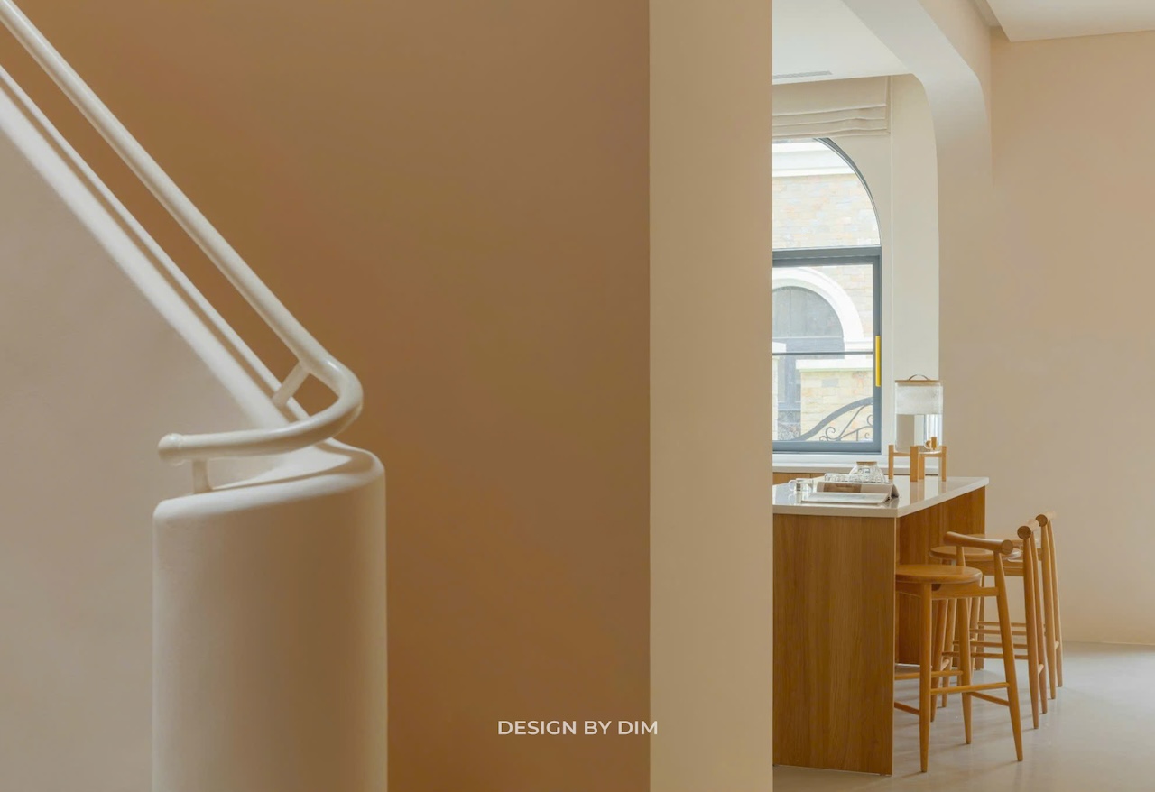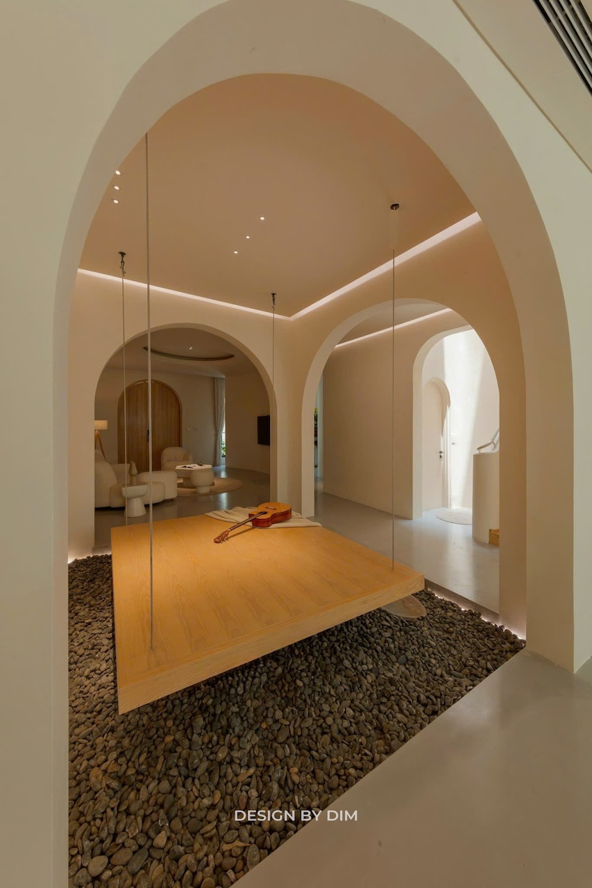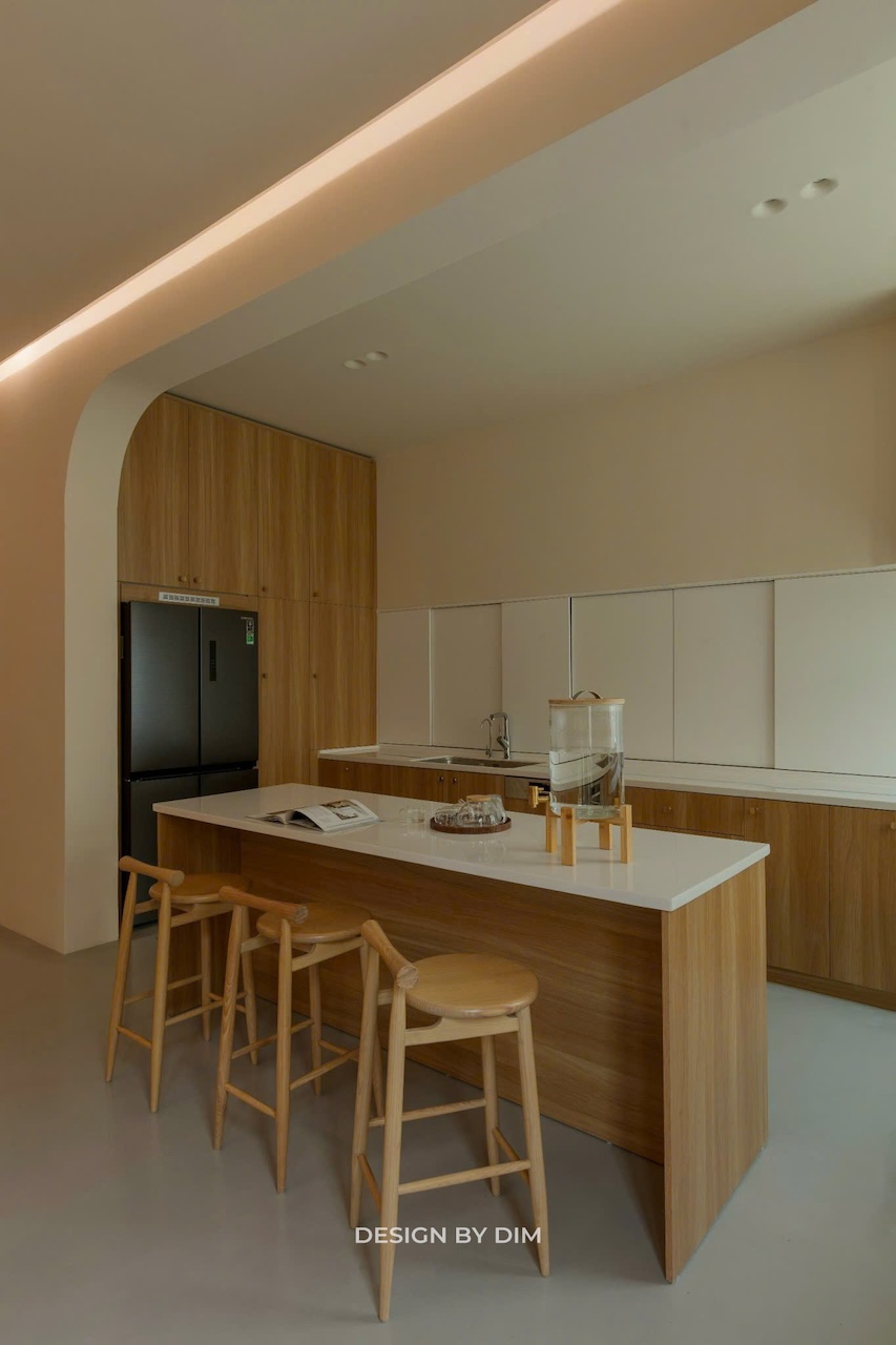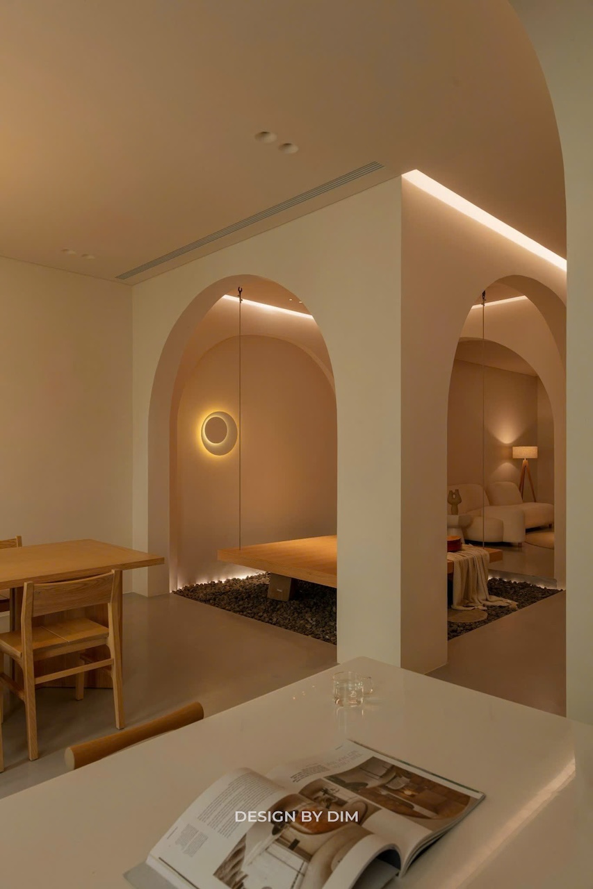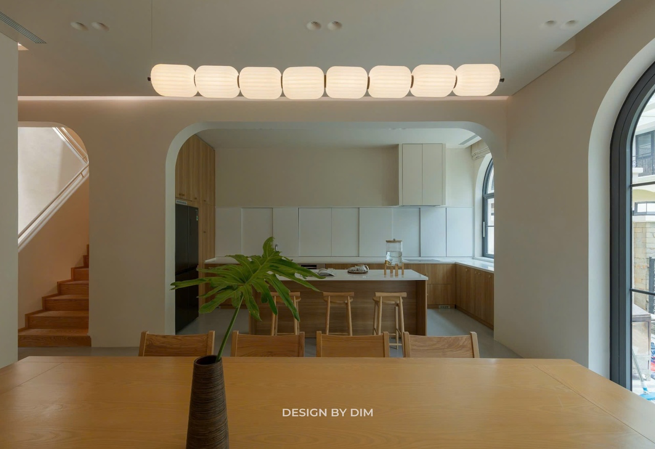 Tone màu kem – trắng – vàng tạo không gian ấm áp và tinh tế. Tường sơn be nhạt kết hợp sàn gỗ tự nhiên, tạo nền trung tính nhưng không lạnh lẽo. Kết cấu vòm xuất hiện ở cửa đi và hốc tường, vừa tạo điểm nhấn kiến trúc vừa làm mềm không gian, xóa đi sự cứng nhắc của các góc vuông. Đèn thả trắng ấm trên bàn ăn tạo tiêu điểm mềm mại, định nghĩa vùng sinh hoạt mà không cần vách ngăn.