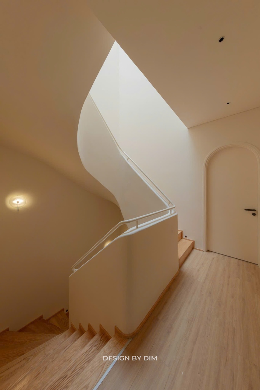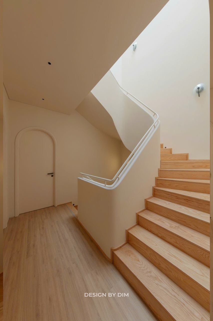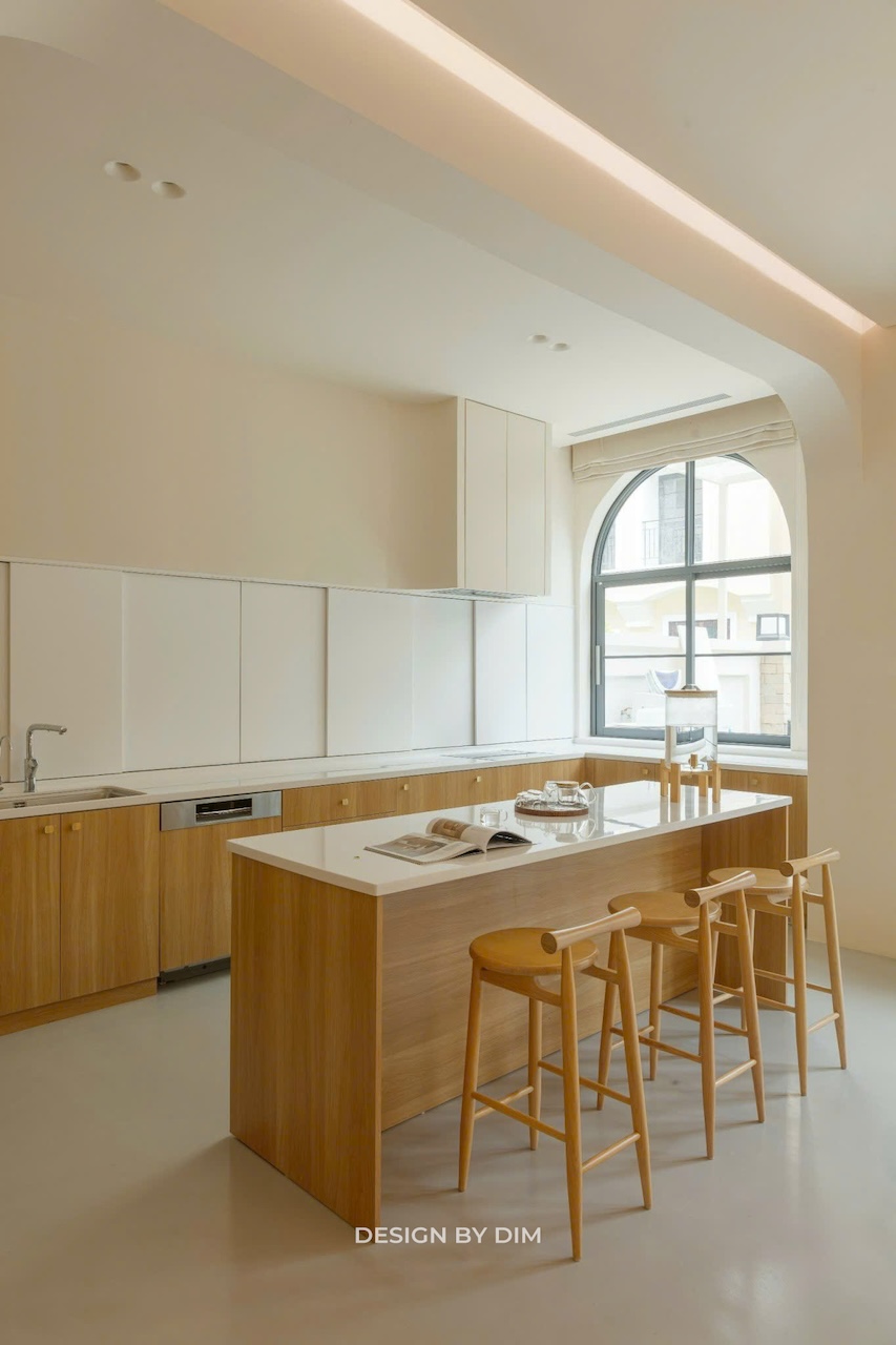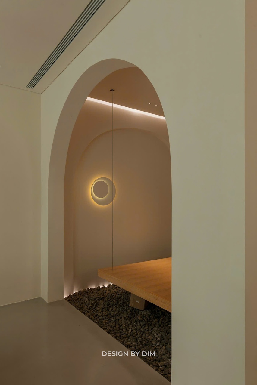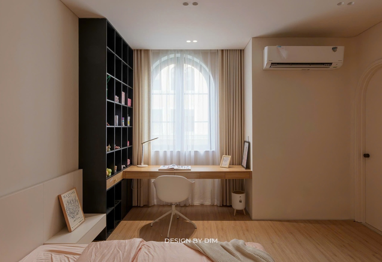 Tone màu kem – trắng – vàng tạo không gian ấm áp và tinh tế. Tường sơn be nhạt kết hợp sàn gỗ tự nhiên, tạo nền trung tính nhưng không lạnh lẽo. Kết cấu vòm xuất hiện ở cửa đi và hốc tường, vừa tạo điểm nhấn kiến trúc vừa làm mềm không gian, xóa đi sự cứng nhắc của các góc vuông. Đèn thả trắng ấm trên bàn ăn tạo tiêu điểm mềm mại, định nghĩa vùng sinh hoạt mà không cần vách ngăn.