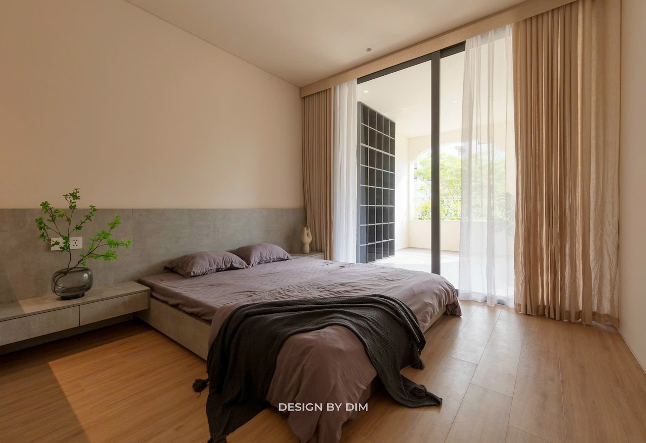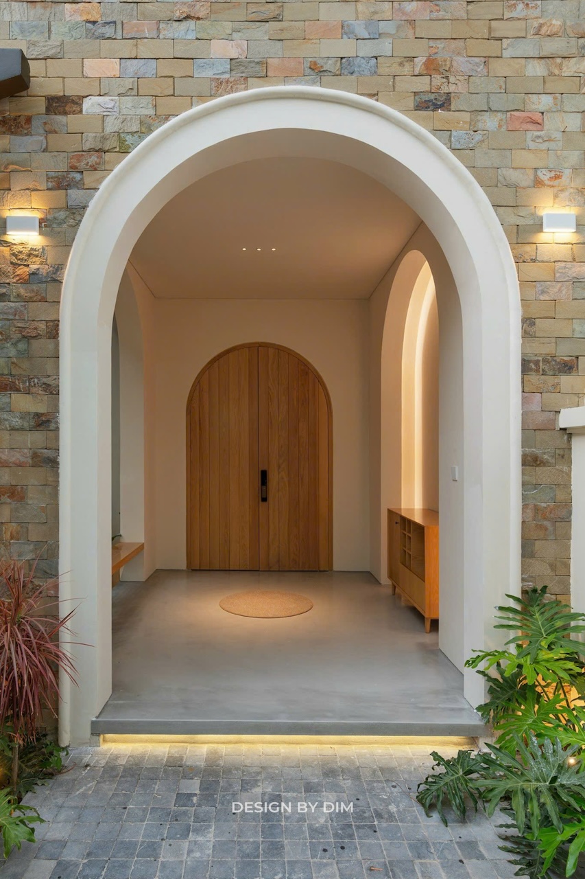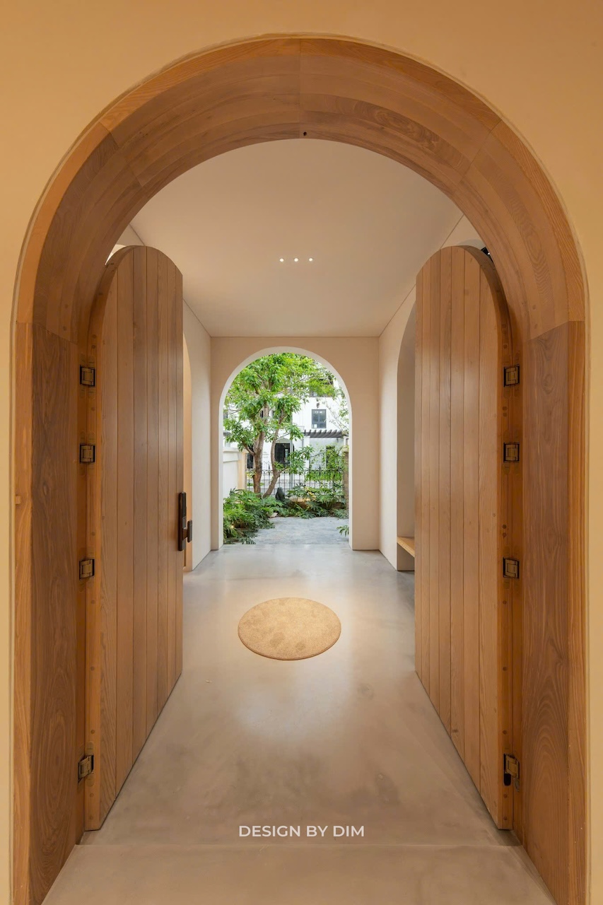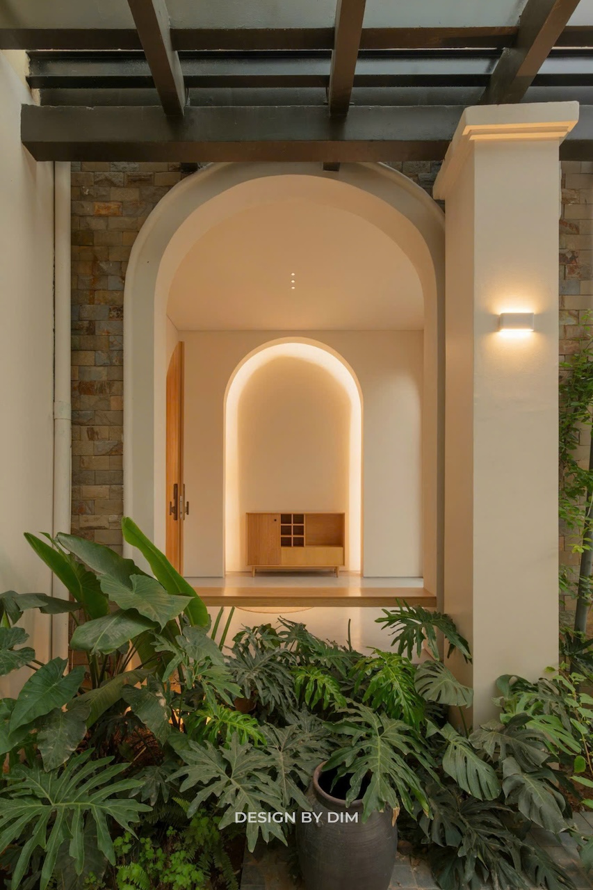 Kết nối với sân vườn được ưu tiên thông qua cửa sổ lớn và cửa vòm ra hiên.Cho phép ánh sáng và không khí lưu thông tự nhiên, đưa thiên nhiên vào từng góc nhà.