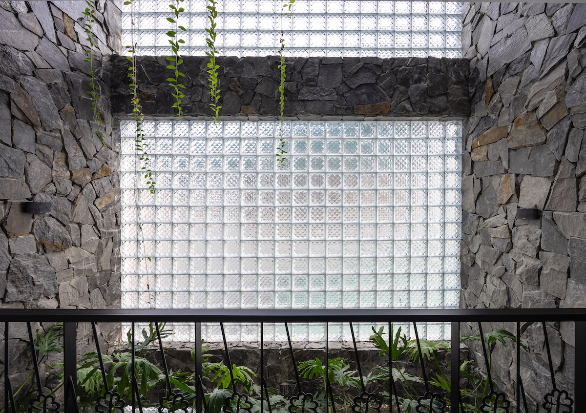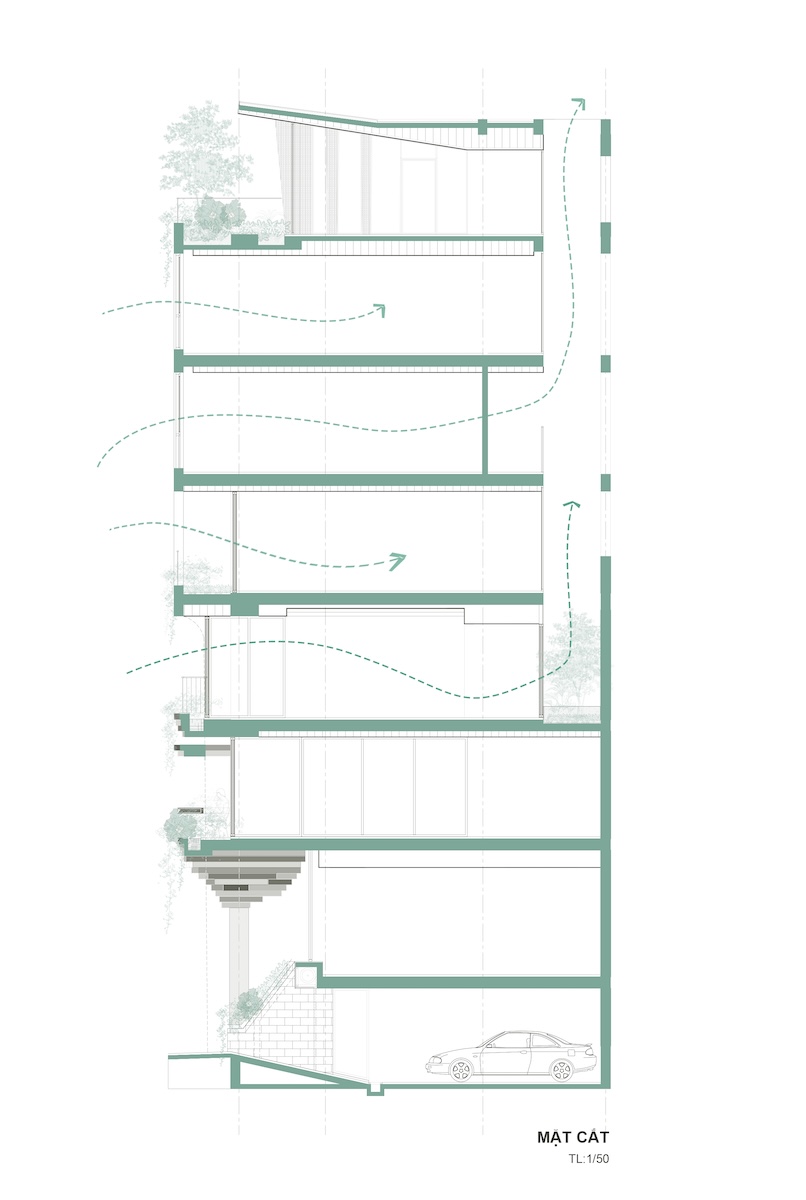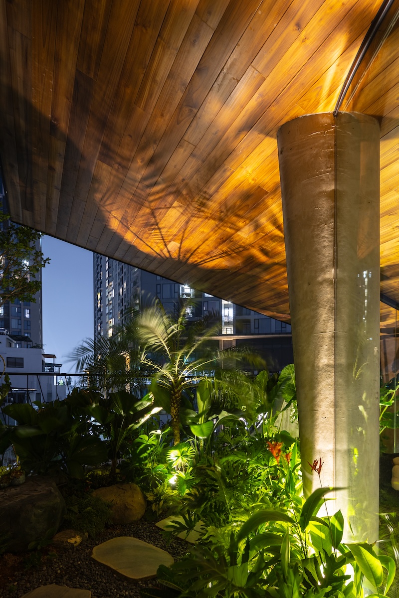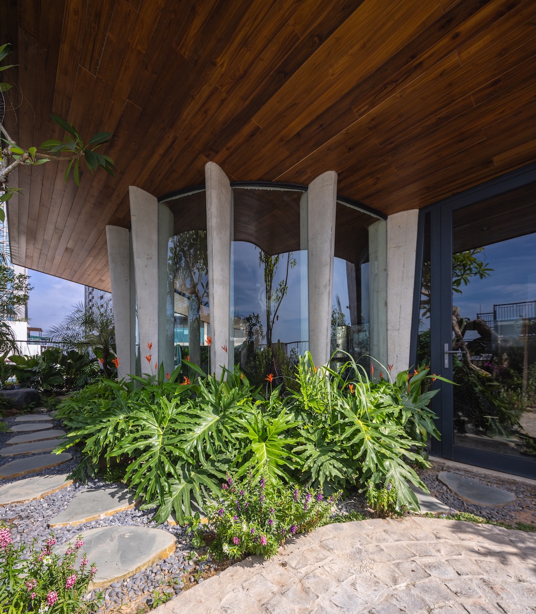 Công trình tận dụng ánh sáng tự nhiên, thông gió chéo và mảng xanh bao phủ mặt đứng để giảm nhiệt, tạo vi khí hậu dễ chịu. Hệ lam chắn nắng và mái hiên lớn giúp công trình thích nghi tốt với điều kiện khí hậu nhiệt đới. Mặt đứng được xử lý bằng những mảng đặc – rỗng tương phản, vừa mang tính thẩm mỹ, vừa tối ưu hoá công năng sử dụng.
