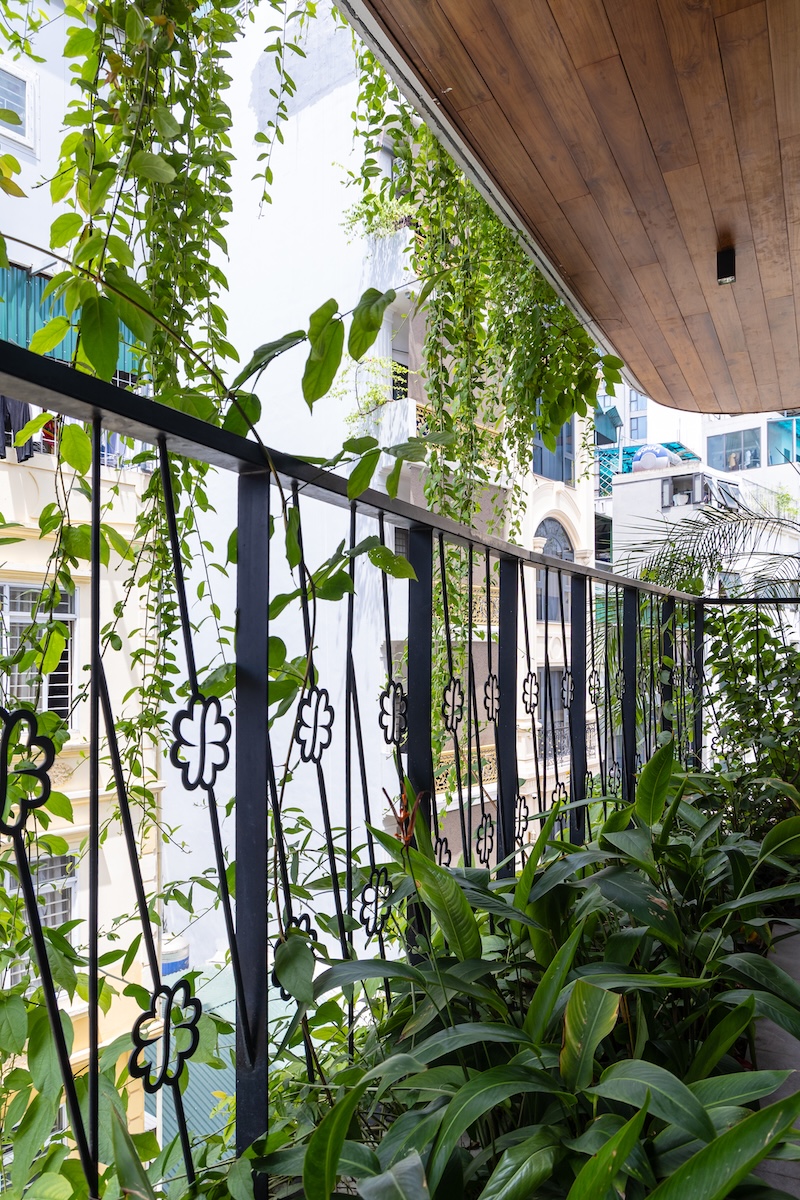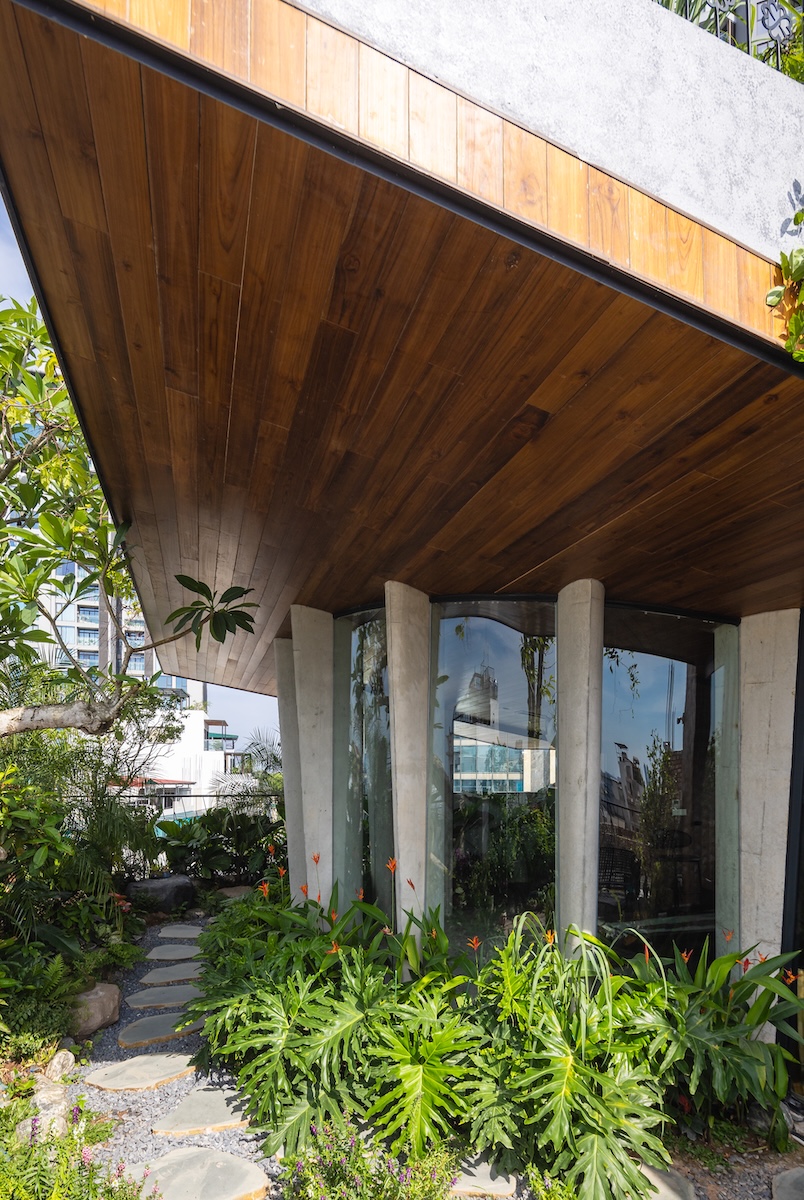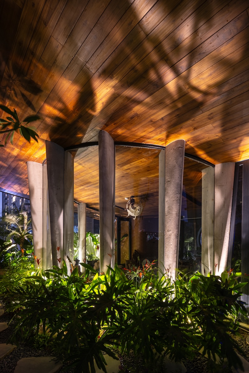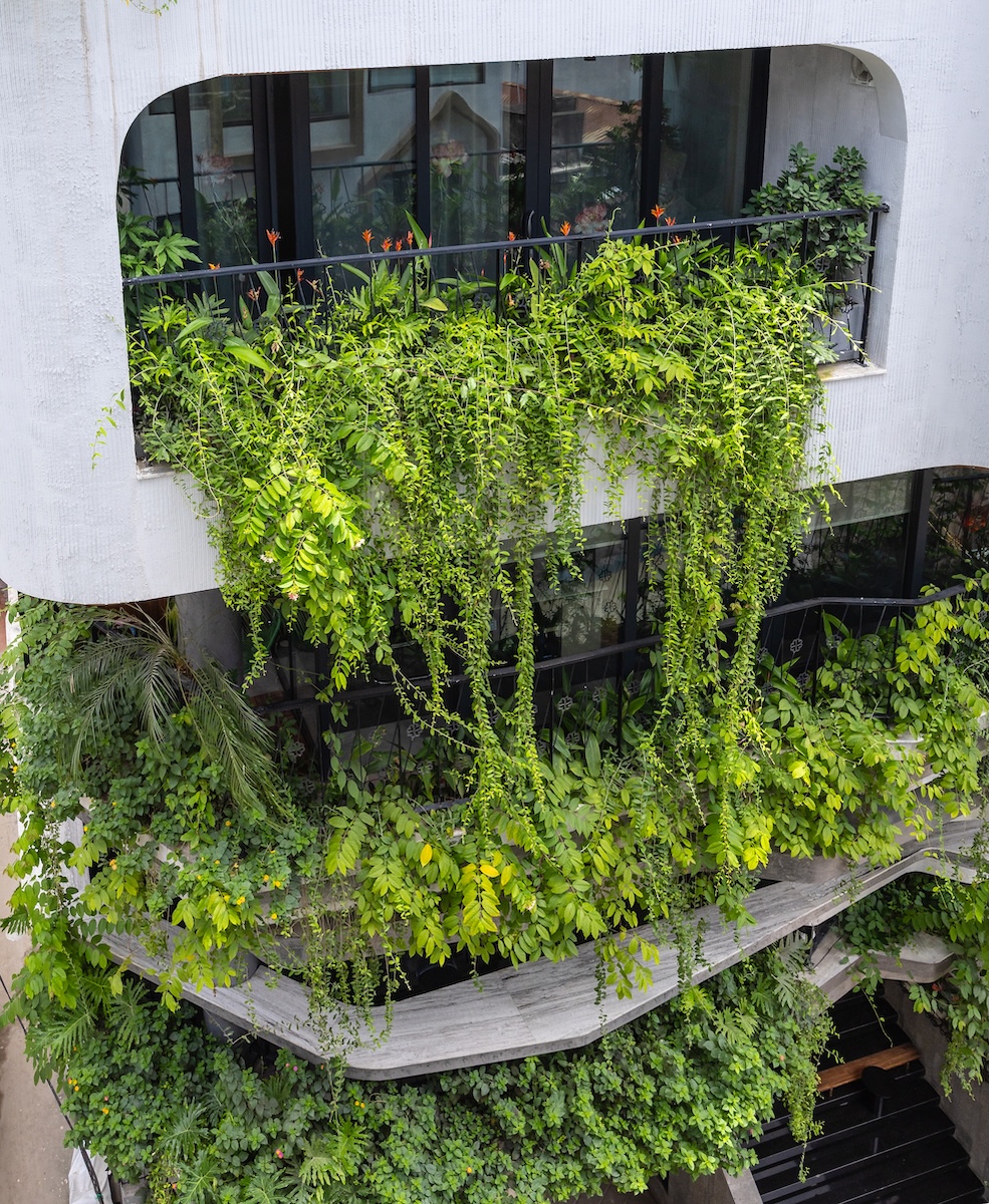 Công trình tận dụng ánh sáng tự nhiên, thông gió chéo và mảng xanh bao phủ mặt đứng để giảm nhiệt, tạo vi khí hậu dễ chịu. Hệ lam chắn nắng và mái hiên lớn giúp công trình thích nghi tốt với điều kiện khí hậu nhiệt đới. Mặt đứng được xử lý bằng những mảng đặc – rỗng tương phản, vừa mang tính thẩm mỹ, vừa tối ưu hoá công năng sử dụng.