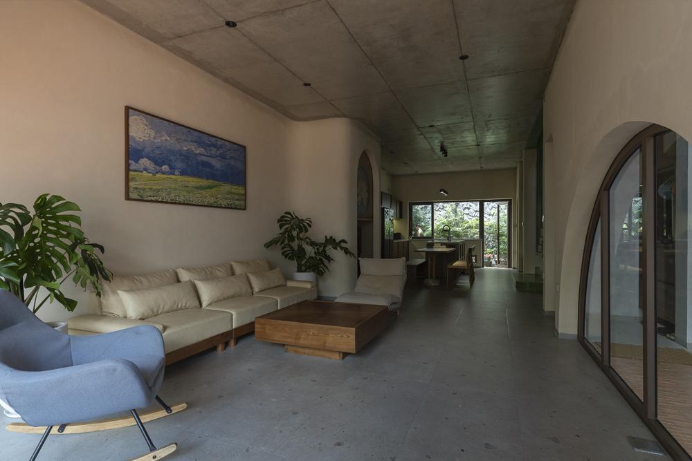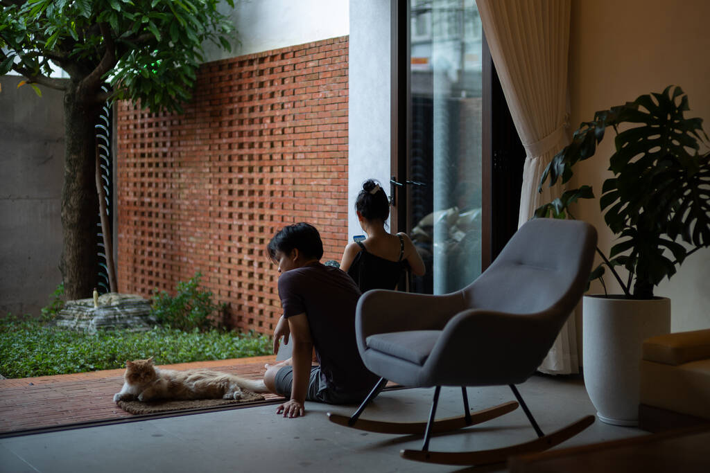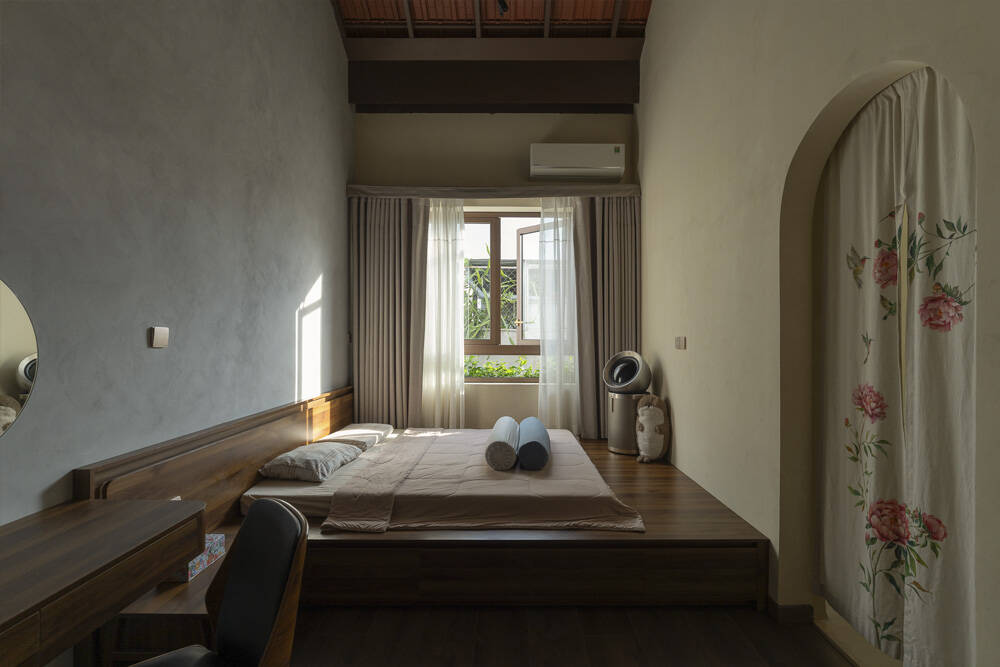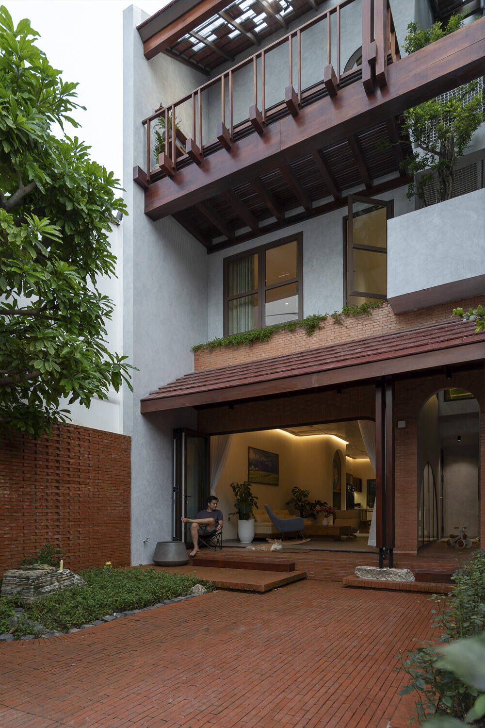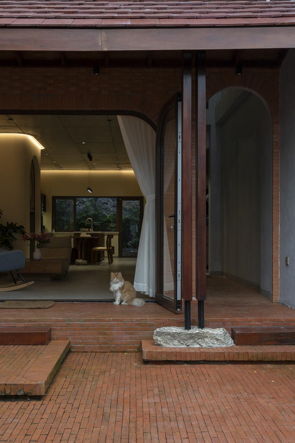Thiết kế của M.Casa được phát triển từ tinh thần của nếp nhà truyền thống Việt Nam, nơi các yếu tố sân trong, mái dốc, hiên và vật liệu tự nhiên cùng định hình không gian sống. Việc sử dụng bê tông thô, gạch trần và gỗ nâu trầm không chỉ là lựa chọn vật liệu mà còn là cách kiến trúc sư gợi lại cảm xúc gần gũi, mộc mạc, gắn bó với ký ức làng quê trong nhịp sống hiện đại.