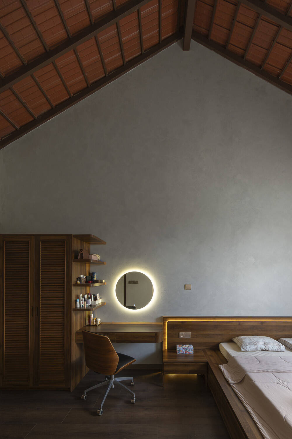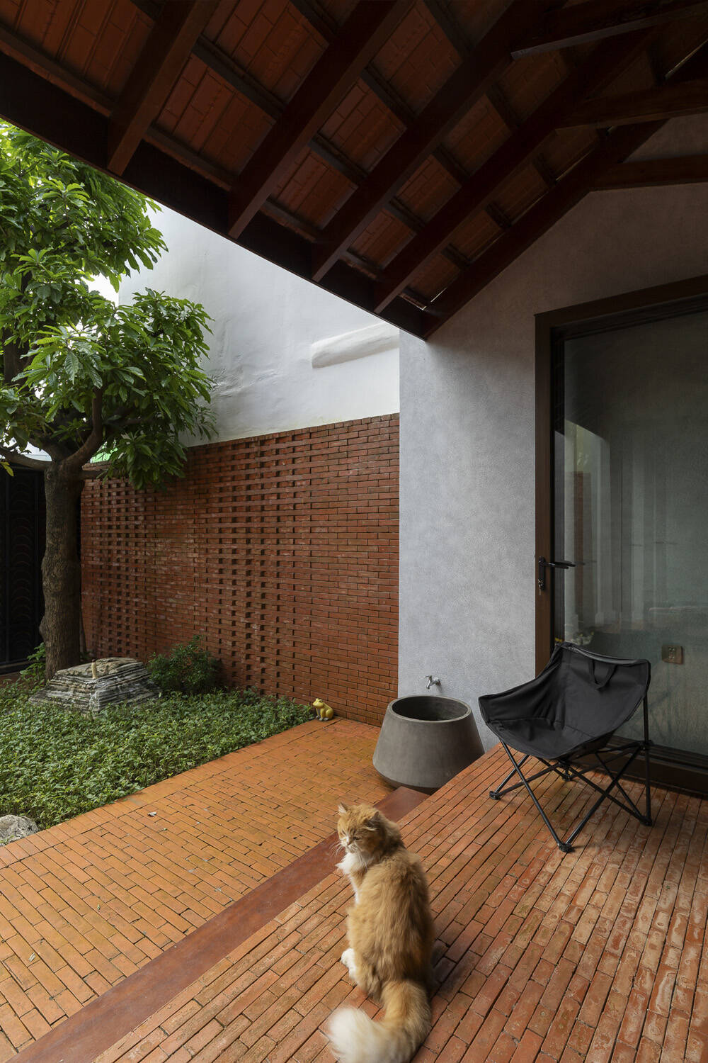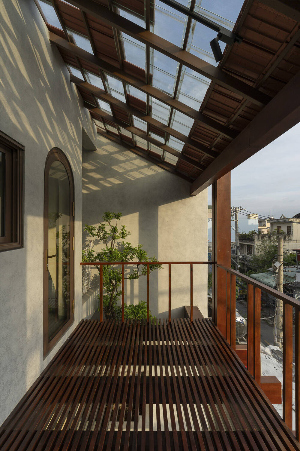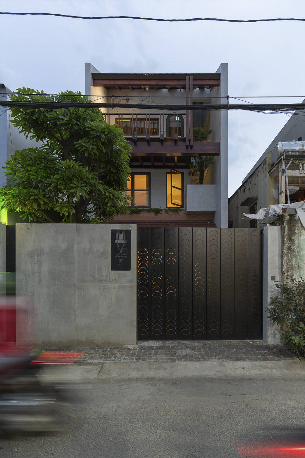 Thiết kế của M.Casa được phát triển từ tinh thần của nếp nhà truyền thống Việt Nam, nơi các yếu tố sân trong, mái dốc, hiên và vật liệu tự nhiên cùng định hình không gian sống. Việc sử dụng bê tông thô, gạch trần và gỗ nâu trầm không chỉ là lựa chọn vật liệu mà còn là cách kiến trúc sư gợi lại cảm xúc gần gũi, mộc mạc, gắn bó với ký ức làng quê trong nhịp sống hiện đại.