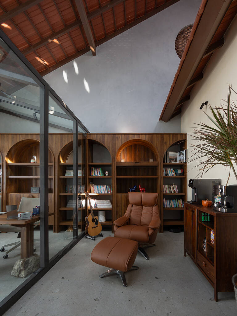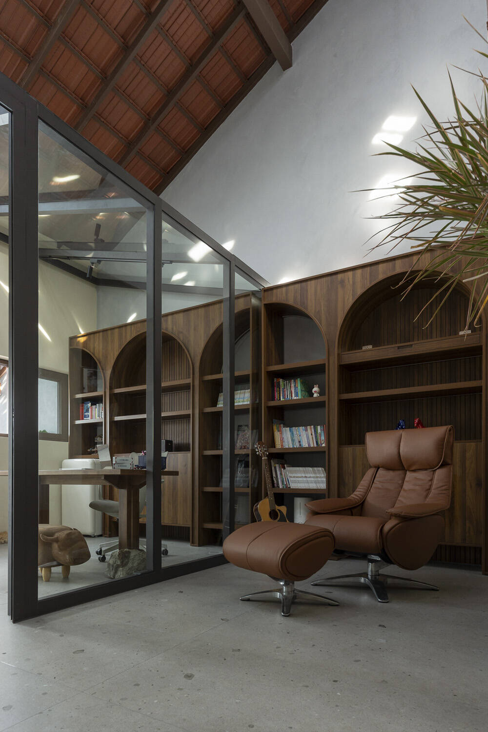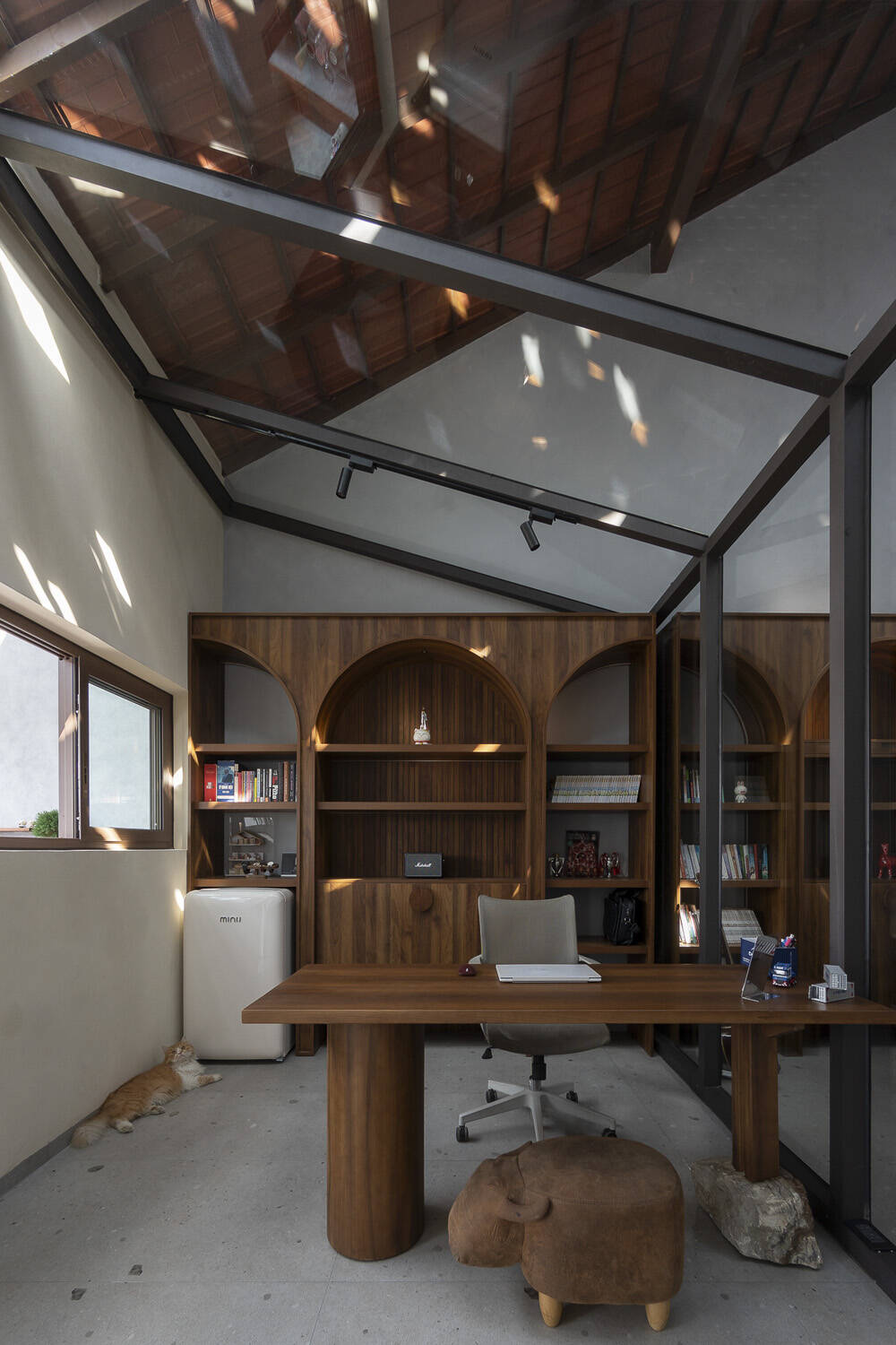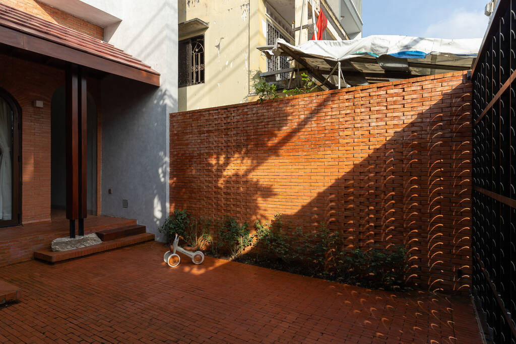 Thiết kế của M.Casa được phát triển từ tinh thần của nếp nhà truyền thống Việt Nam, nơi các yếu tố sân trong, mái dốc, hiên và vật liệu tự nhiên cùng định hình không gian sống. Việc sử dụng bê tông thô, gạch trần và gỗ nâu trầm không chỉ là lựa chọn vật liệu mà còn là cách kiến trúc sư gợi lại cảm xúc gần gũi, mộc mạc, gắn bó với ký ức làng quê trong nhịp sống hiện đại.