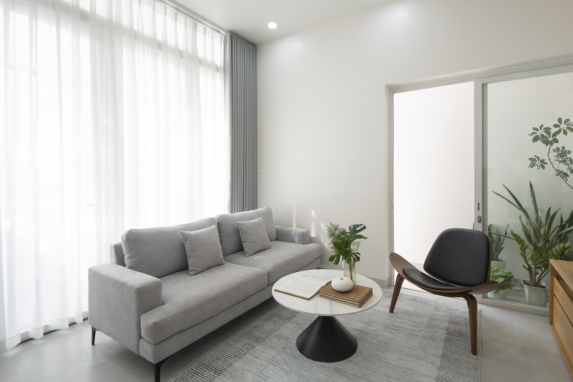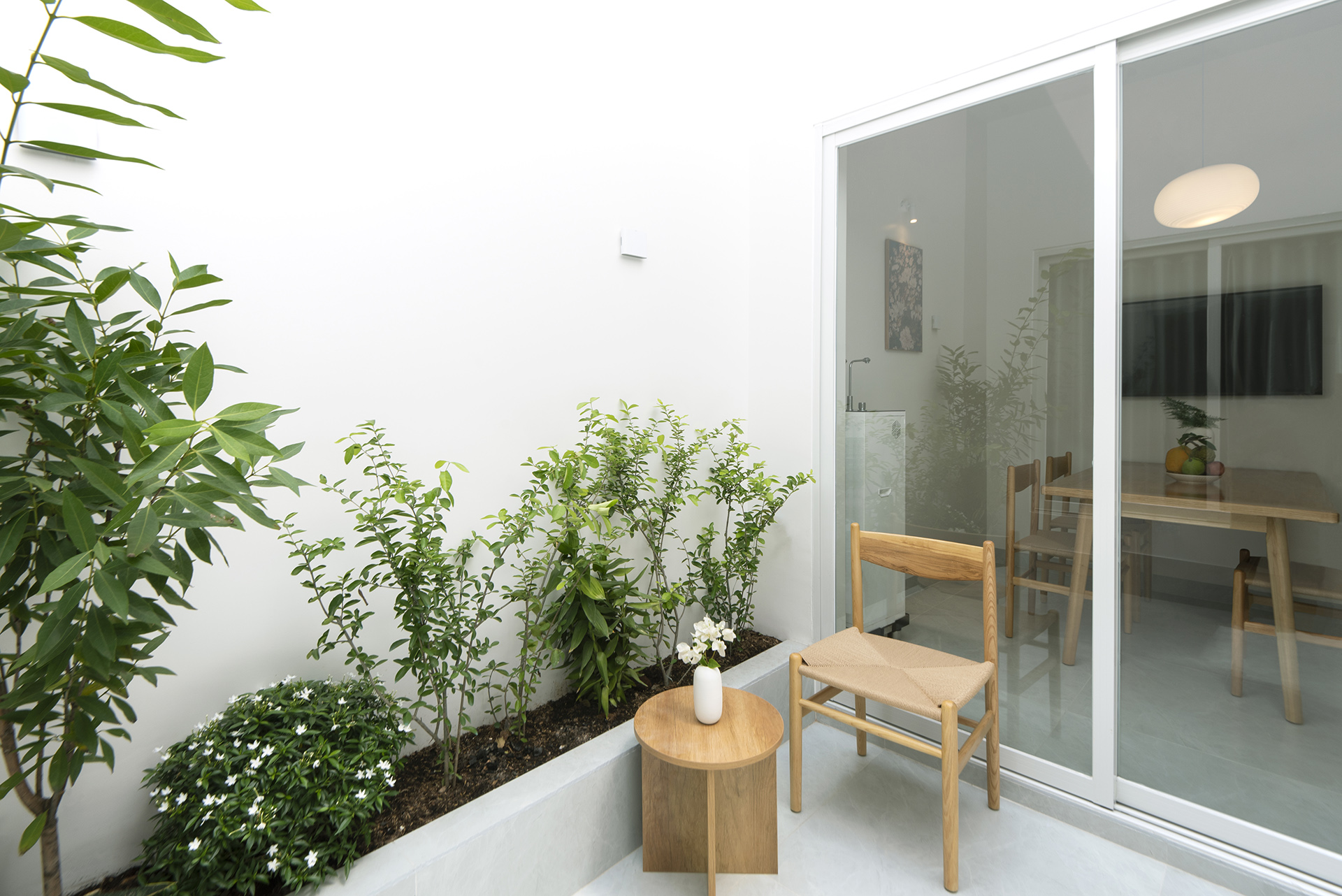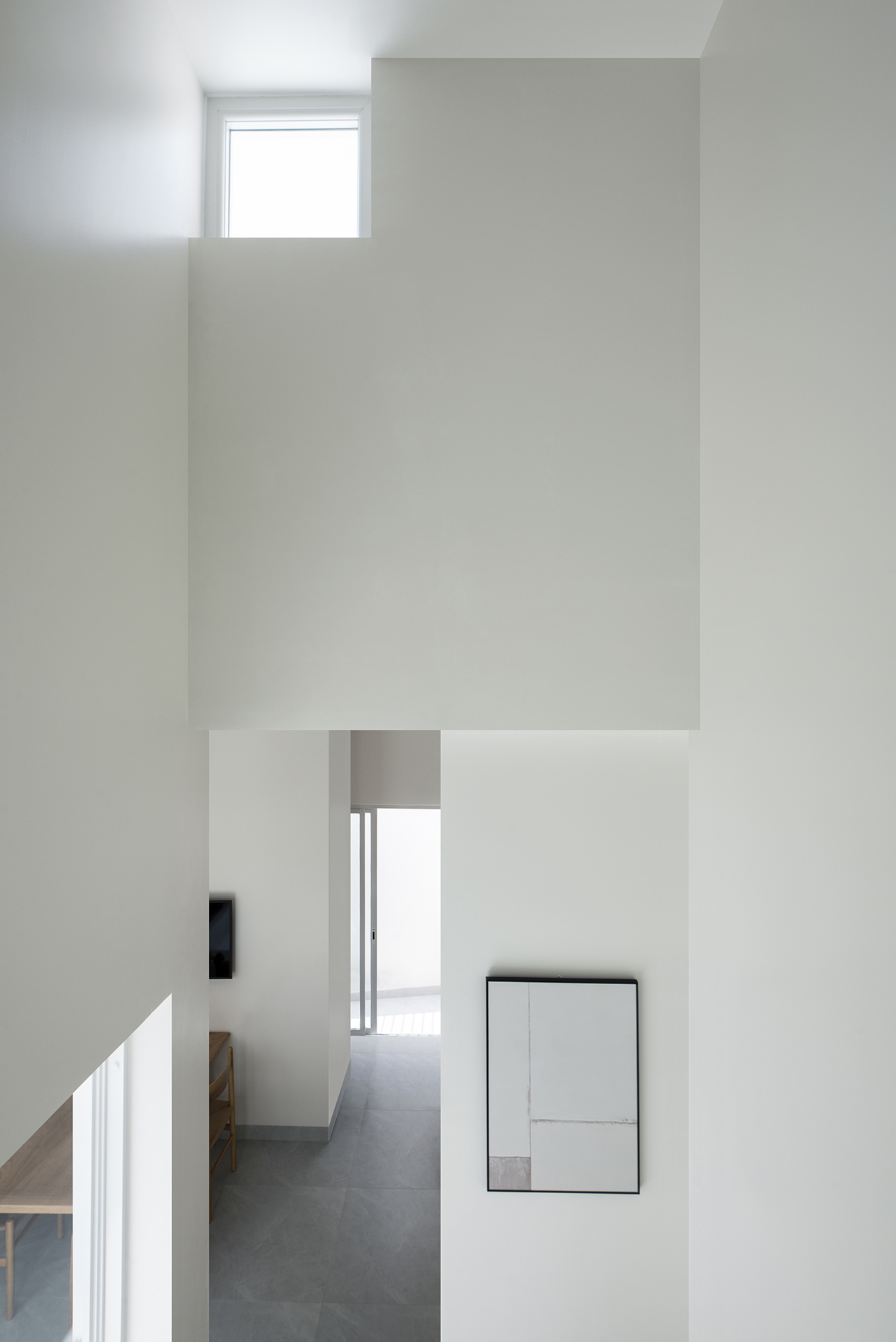 Sự logic trong tư duy “đặc – rỗng” tiếp tục được chuyển hóa vào việc tổ chức công năng trên hai tầng lầu, đảm bảo sự tách biệt cần thiết giữa khu vực tiếp khách, bếp ăn và các không gian nghỉ ngơi, thờ tự. Khối thang đóng vai trò là nhịp dẫn quan trọng, kết nối các không gian bằng trải nghiệm thị giác và cảm nhận về sự luân chuyển ánh sáng trong các tổ hợp trực giao. MH House hiện diện như một thực thể kiến trúc cân bằng, nơi giá trị vật chất nhường chỗ cho sự thăng hoa của tinh thần. Ngôi nhà không chỉ là nơi che mưa che nắng, mà là một vùng trú ngụ bình yên.