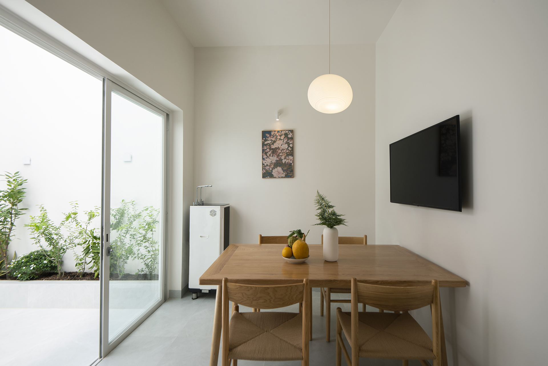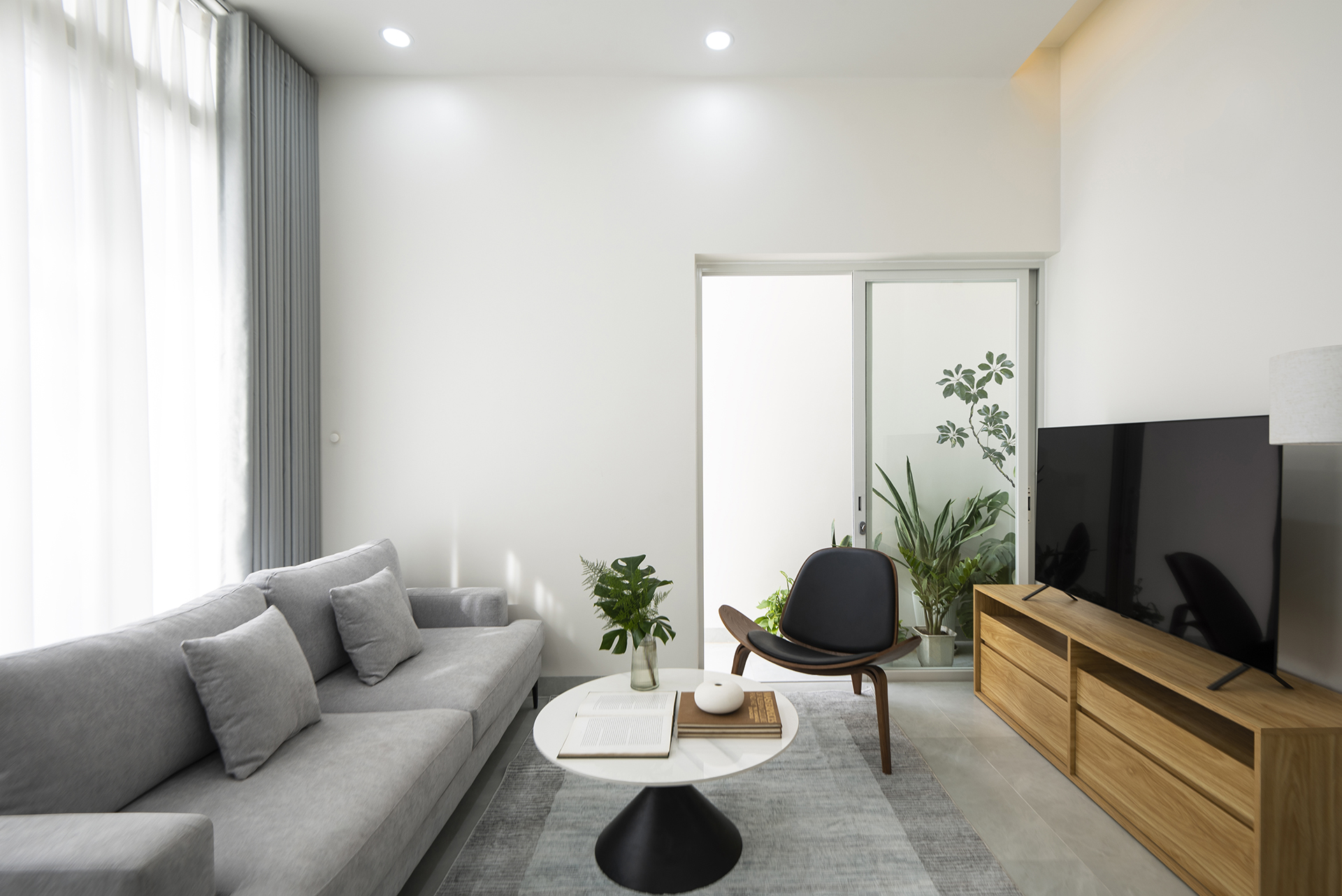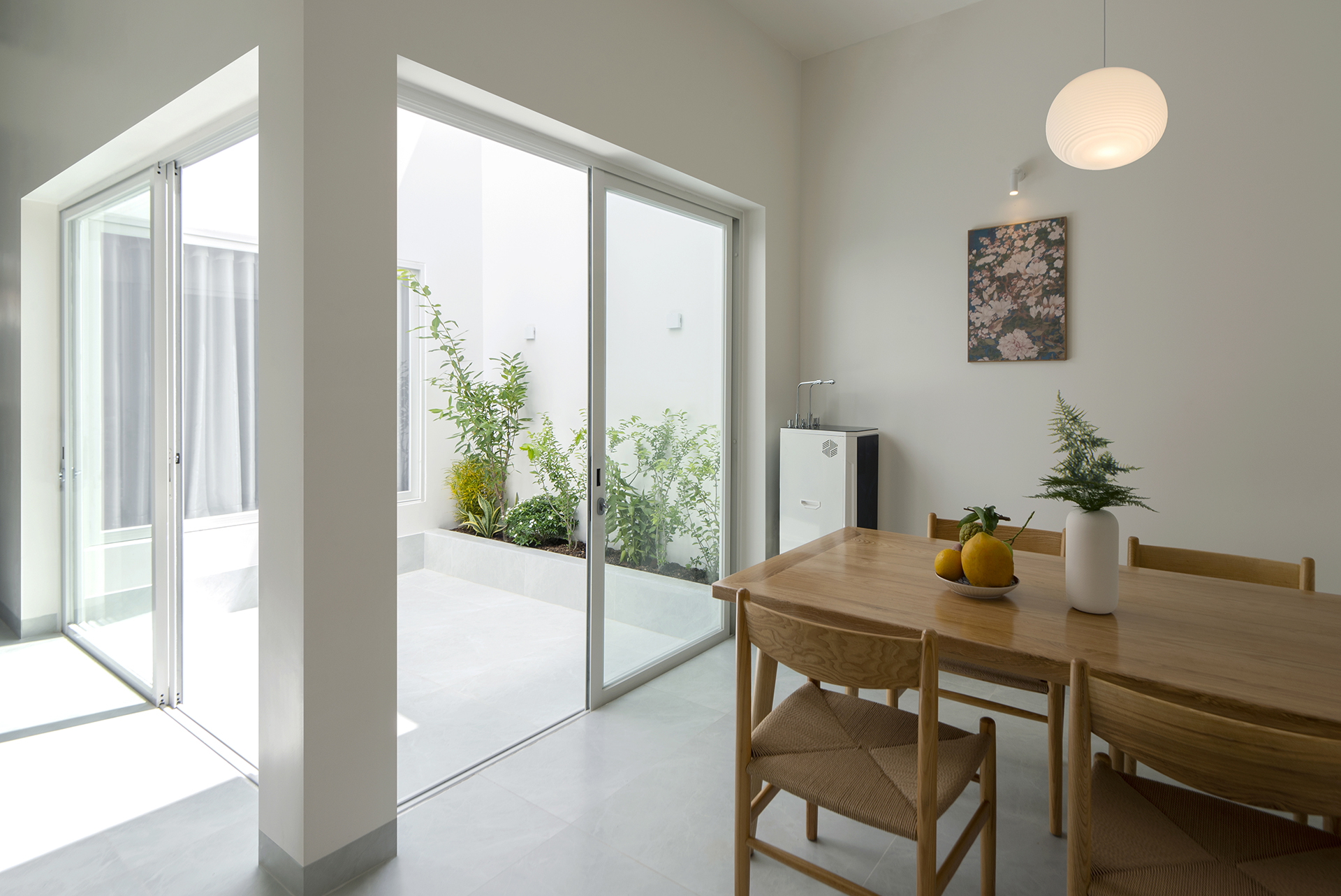 Sự logic trong tư duy “đặc – rỗng” tiếp tục được chuyển hóa vào việc tổ chức công năng trên hai tầng lầu, đảm bảo sự tách biệt cần thiết giữa khu vực tiếp khách, bếp ăn và các không gian nghỉ ngơi, thờ tự. Khối thang đóng vai trò là nhịp dẫn quan trọng, kết nối các không gian bằng trải nghiệm thị giác và cảm nhận về sự luân chuyển ánh sáng trong các tổ hợp trực giao. MH House hiện diện như một thực thể kiến trúc cân bằng, nơi giá trị vật chất nhường chỗ cho sự thăng hoa của tinh thần. Ngôi nhà không chỉ là nơi che mưa che nắng, mà là một vùng trú ngụ bình yên.