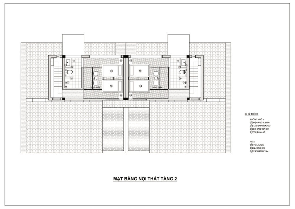 Tầng 2 gồm một phòng ngủ và phòng vệ sinh khép kín, với ô kính tròn nhìn núi Ba Vì như một bức tranh mỗi khi thức dậy, đầu giường làm bằng gỗ công nghiệp vân vải, khắc CNC lá trúc lặp lại và sơn thủ công lên lá trúc tinh tế, tầng 1 và 2 đều có tinh dầu hương bưởi mang hương thơm dịu dàng vào trong nhà.
