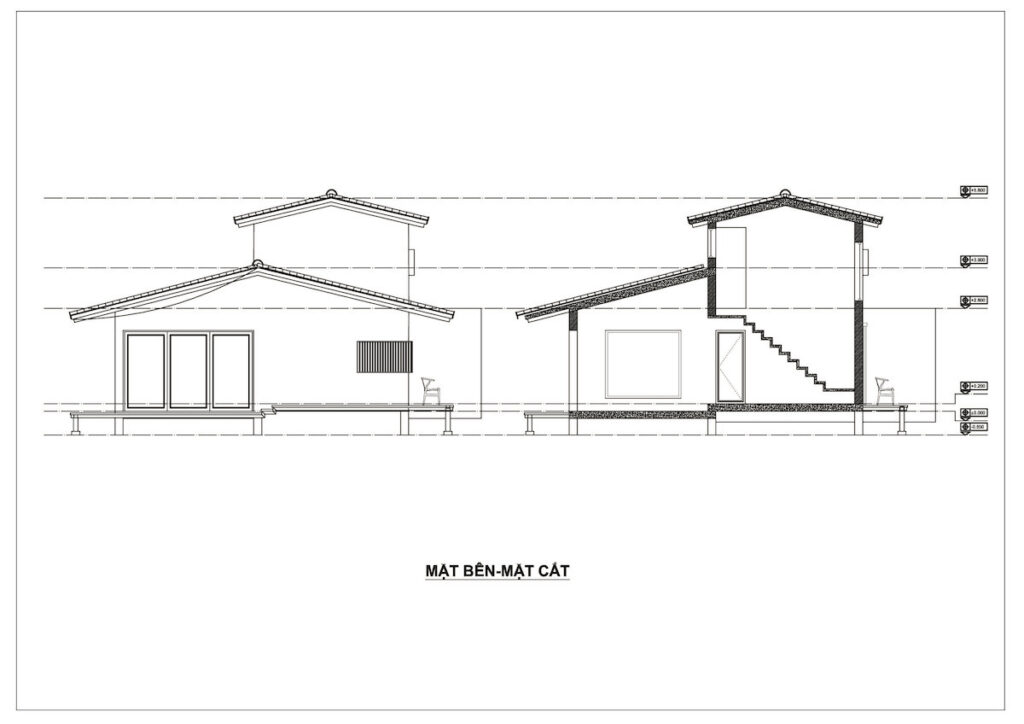 Kiến trúc Nhật Bản truyền thống nhà chống cột với địa hình thoải nhẹ, phù hợp với khi hậu Việt Nam giúp căn nhà nhỏ nhắn gọn gàng trong khung cảnh núi đồi trùng điệp, hai căn như một, phẳng phiu, ngăn nắp. Căn nhà 1.5 tầng gồm hai phòng ngủ trên và dưới, bếp, phòng khách khách và bể ngâm cho tụi trẻ mỗi khi mùa hè đến, hiên nhà bao quanh để ngồi ngắm mây núi, uống trà khi sớm tinh mơ. Các thiết bị kỹ thuật, dây điện, nước và cục nóng điều hòa được giấu dưới đáy sàn nhà. Gia đình 4 thành viên có thể ở trong ngôi nhà gồm hai phòng ngủ, hai vệ sinh đầy đủ tiện nghi và thảm cỏ xanh mát bao quanh nhà, chiều chiều ra tưới cỏ cây.