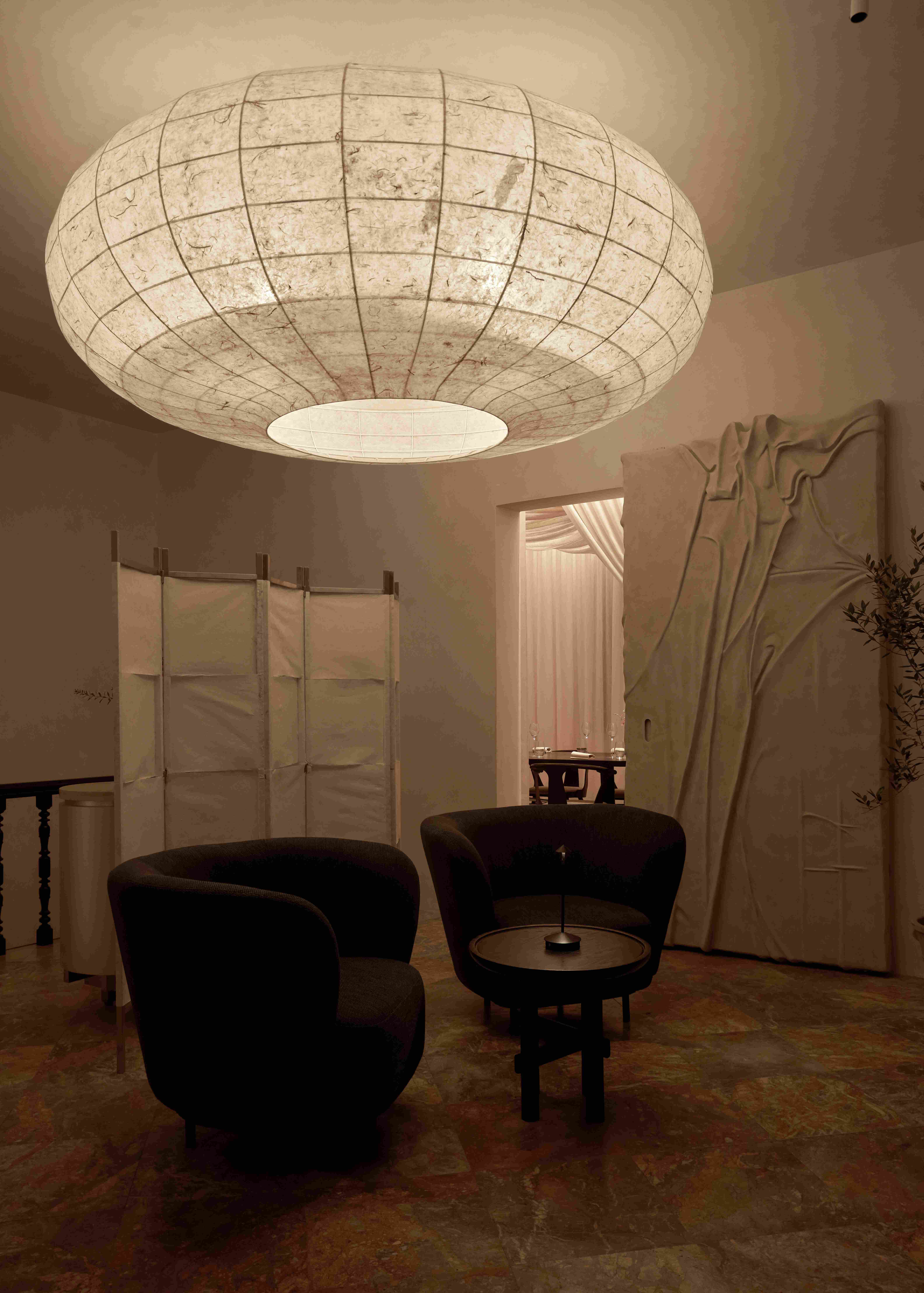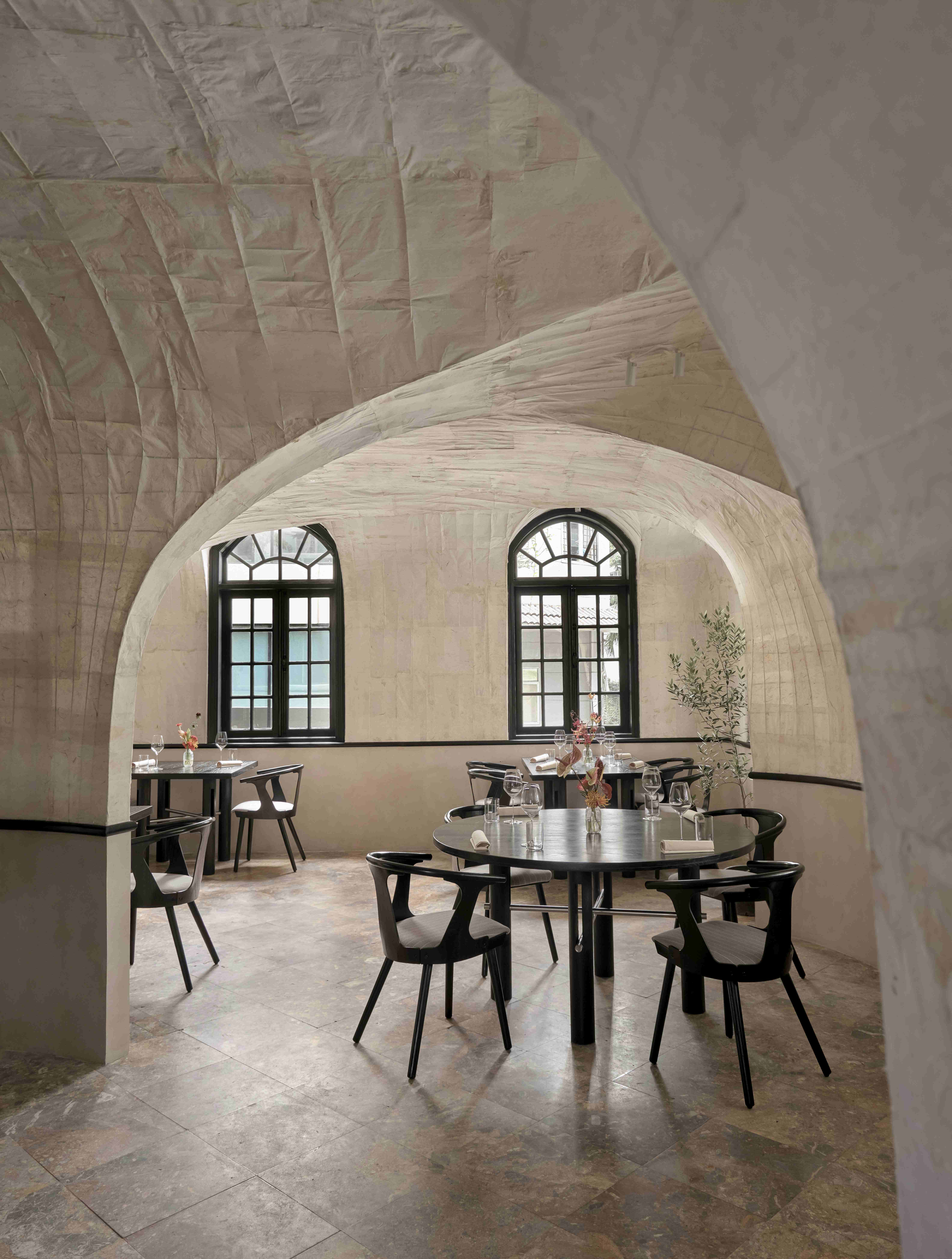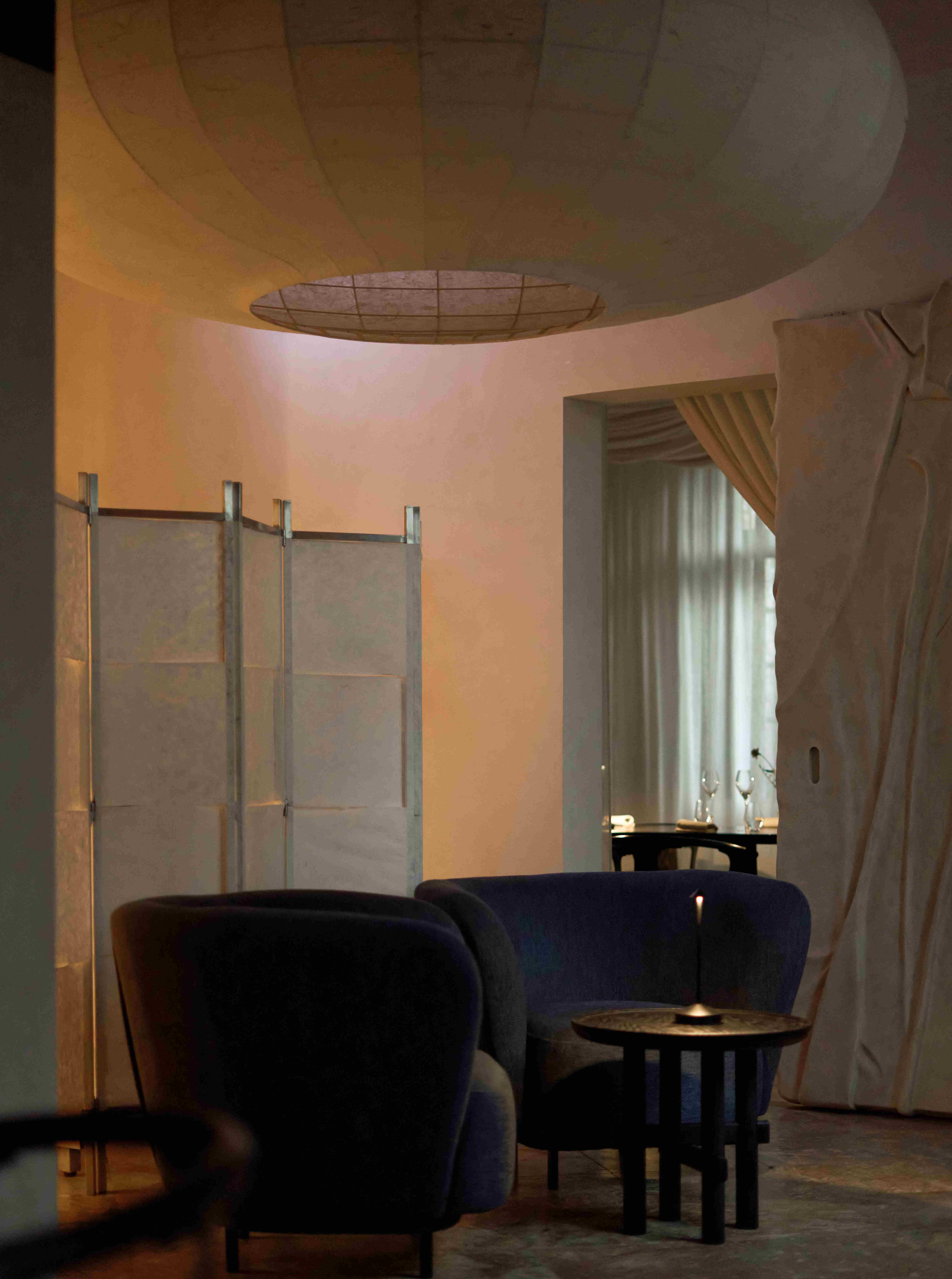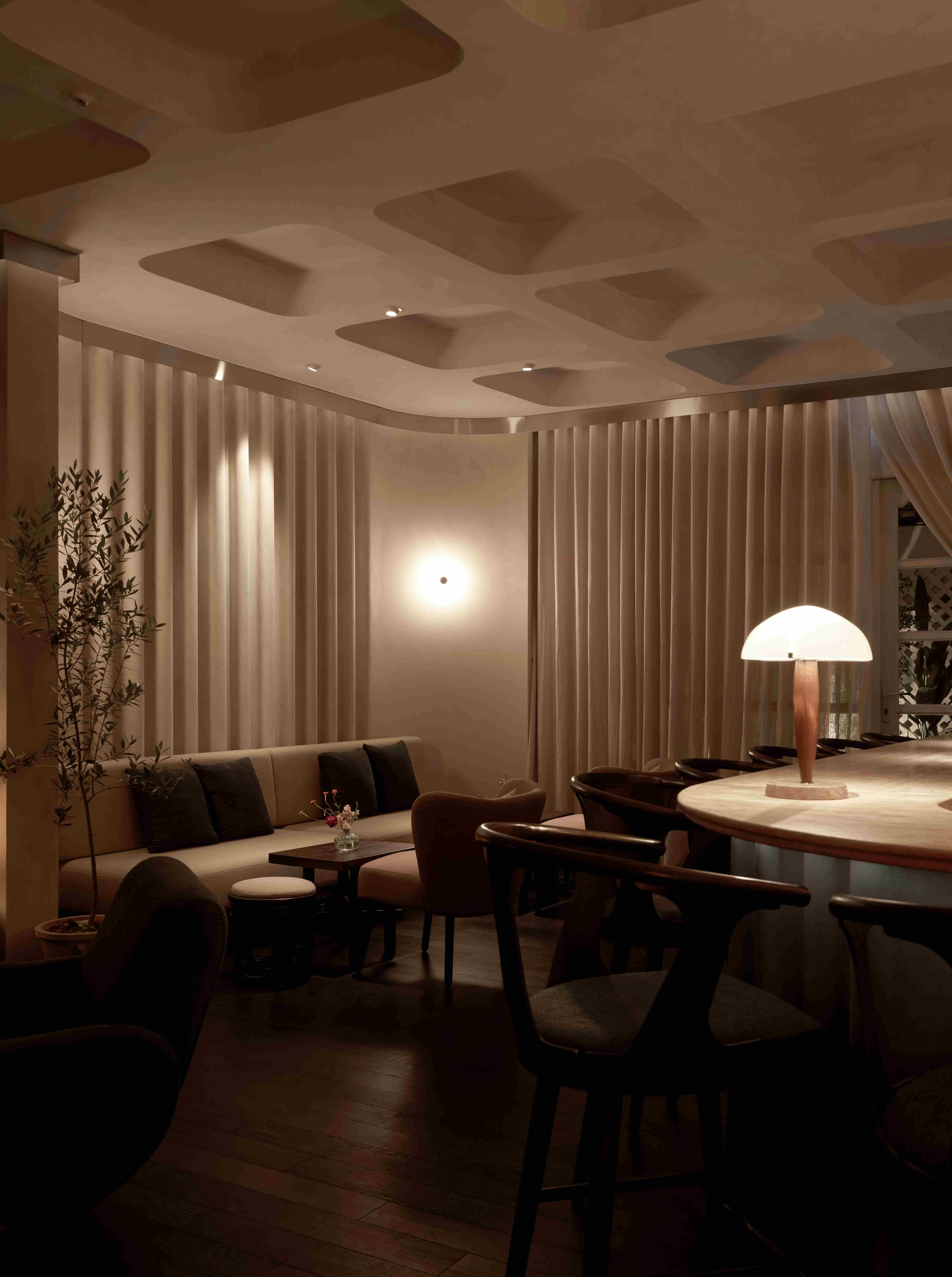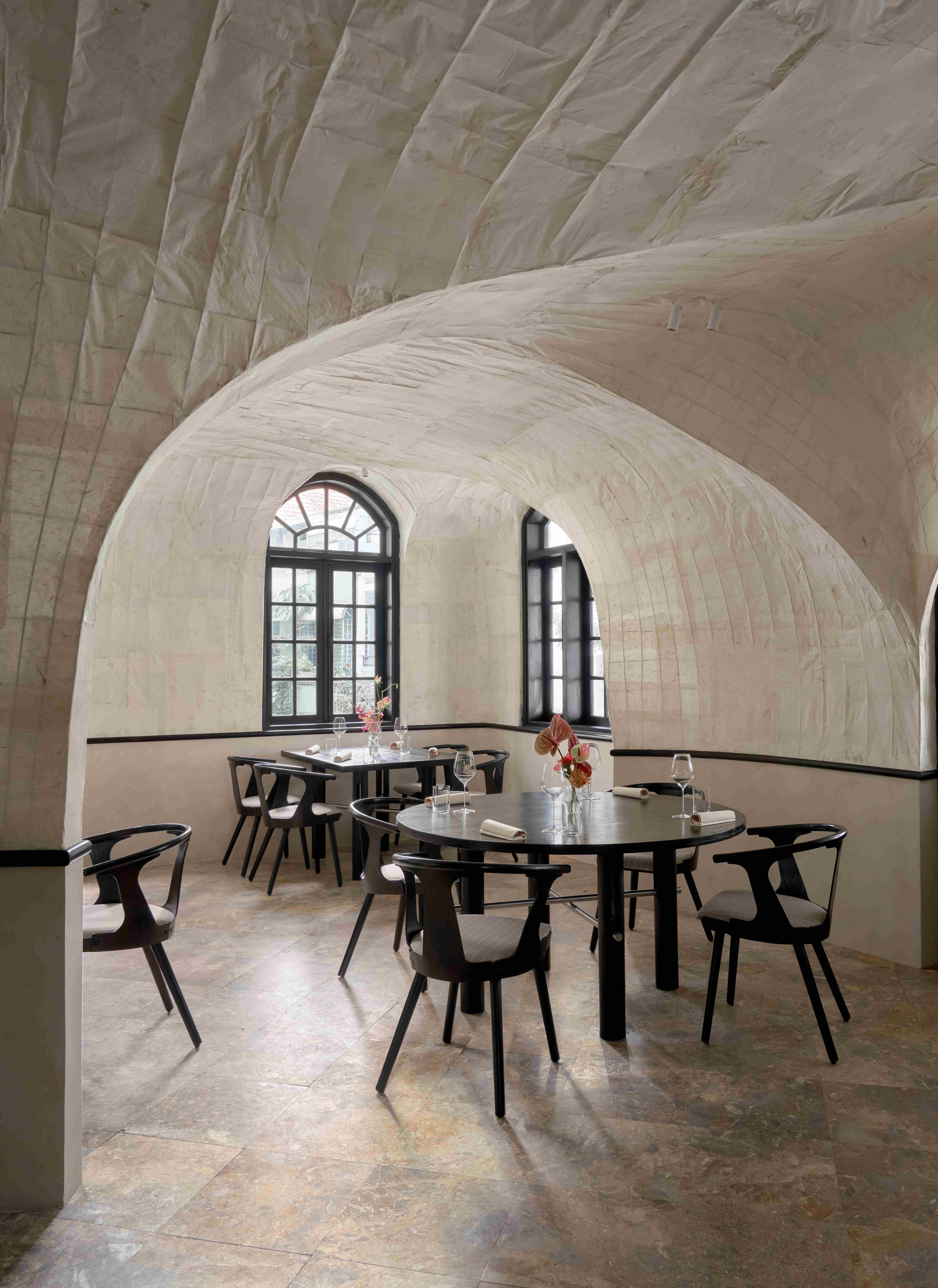 VPTK đã ứng dụng những vật liệu khác nhau vào các tầng để tạo nên một chiếc lồng bàn ôm trọn cả căn nhà – bao gồm lớp vải ở tầng trệt đến lớp lưới ở tầng 2 và phần khung thuộc tầng 3. Những đường nét mang giá trị sẵn có của căn biệt thự được giữ lại, team chọn cách tân các chi tiết như bàn ghế và thêm thắt chất liệu inox vào nội thất nhằm tạo ra sự giao hoà giữa truyền thống và đương đại. Điểm nhấn gây ấn tượng cho những người bạn ghé thăm NEPHELE chính là chất liệu giấy dó bao trùm phần tường và trần của nhà hàng – ánh sáng khi được khuếch tán qua lớp giấy này cộng hưởng với bảng màu be chủ đạo đã tạo nên một không gian chuyển sắc và bồng bềnh như ta đang ngồi trong những đám mây.