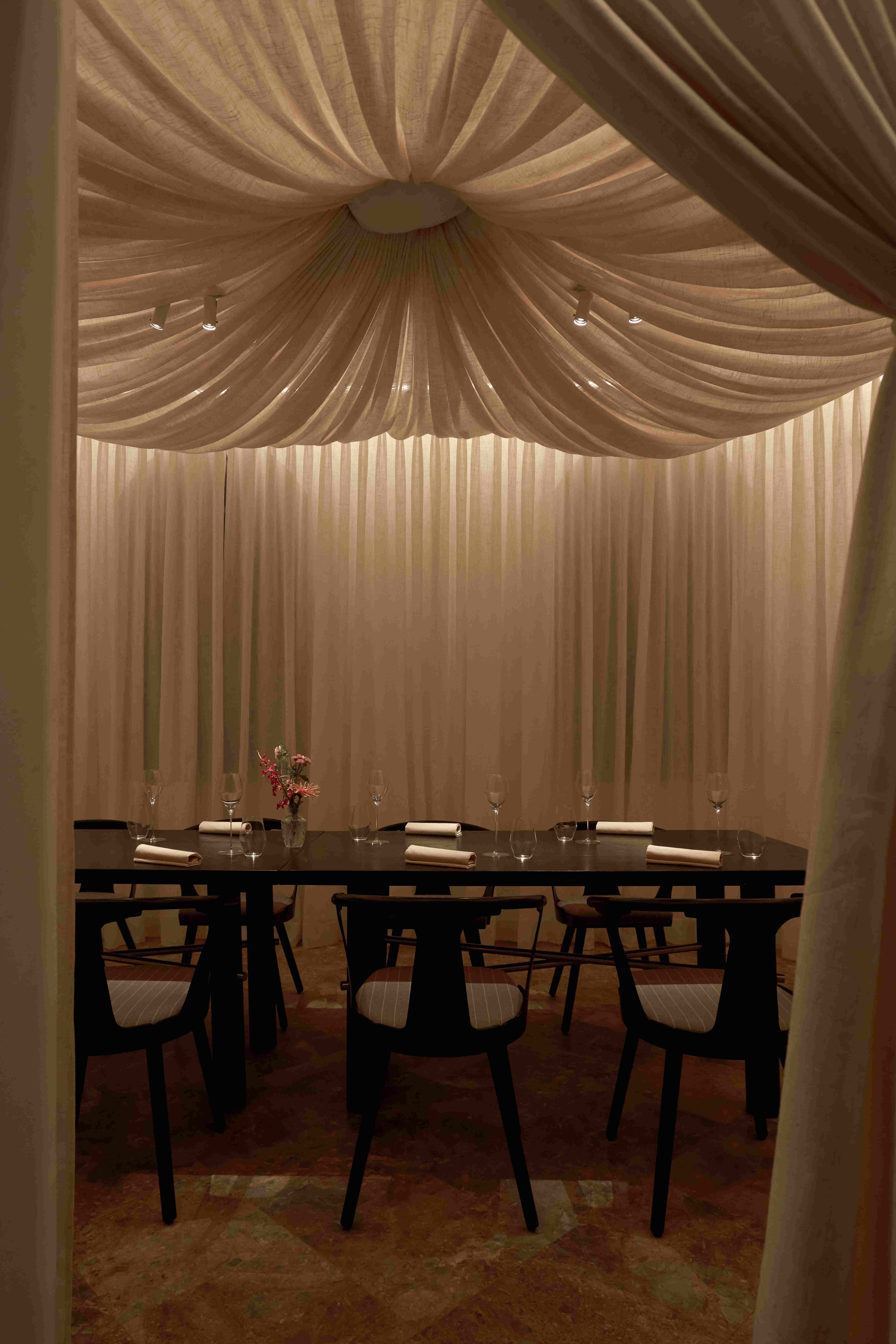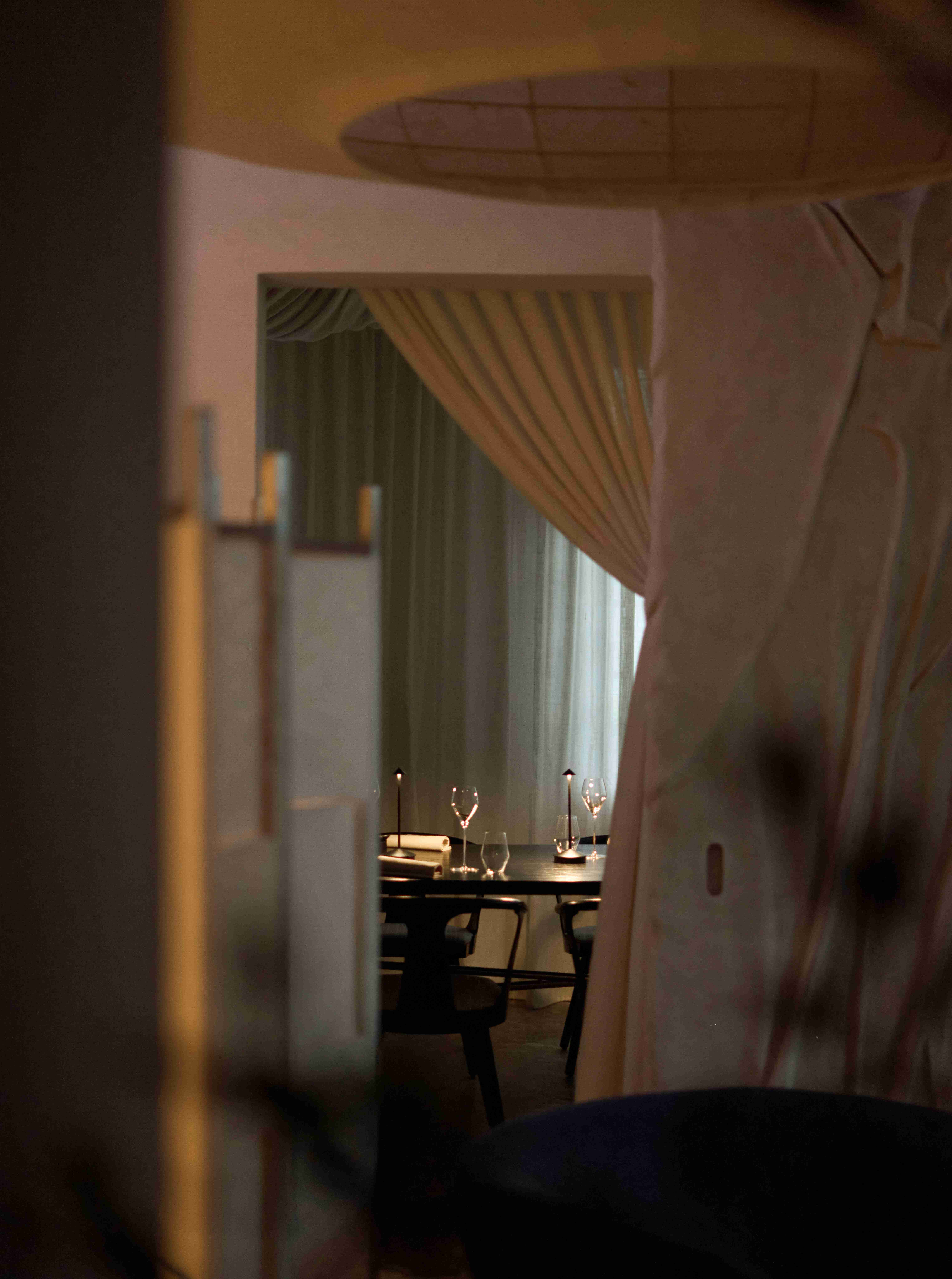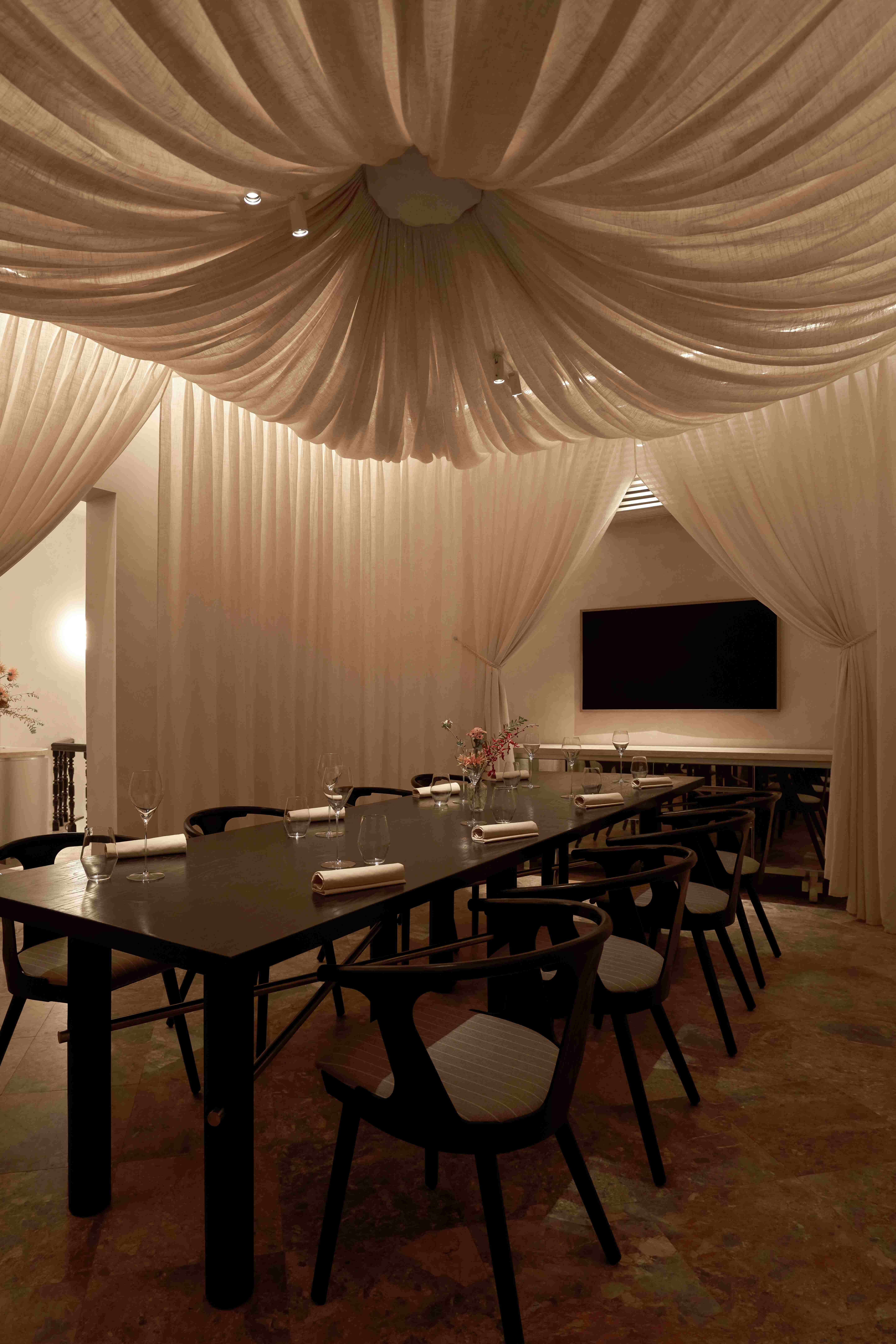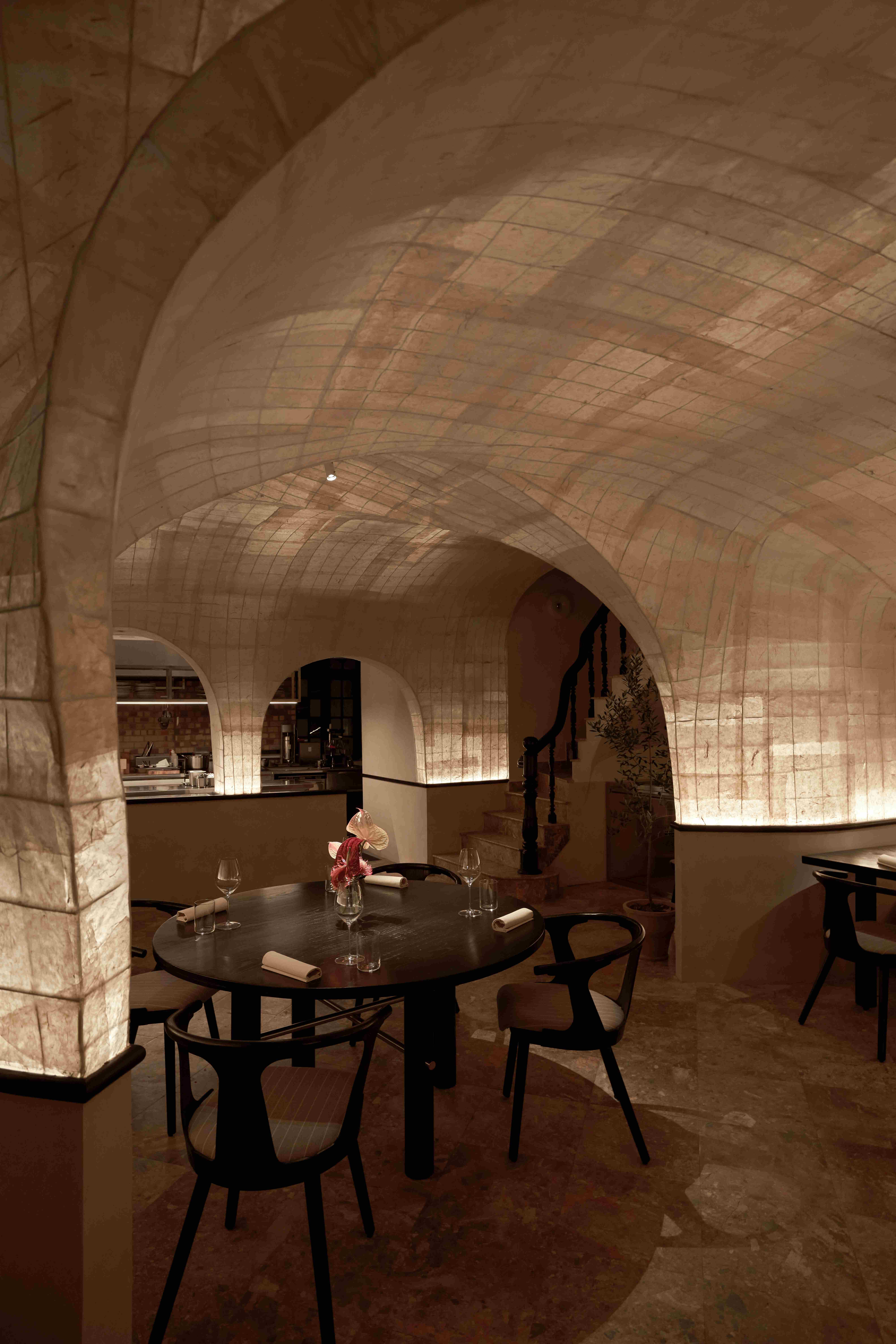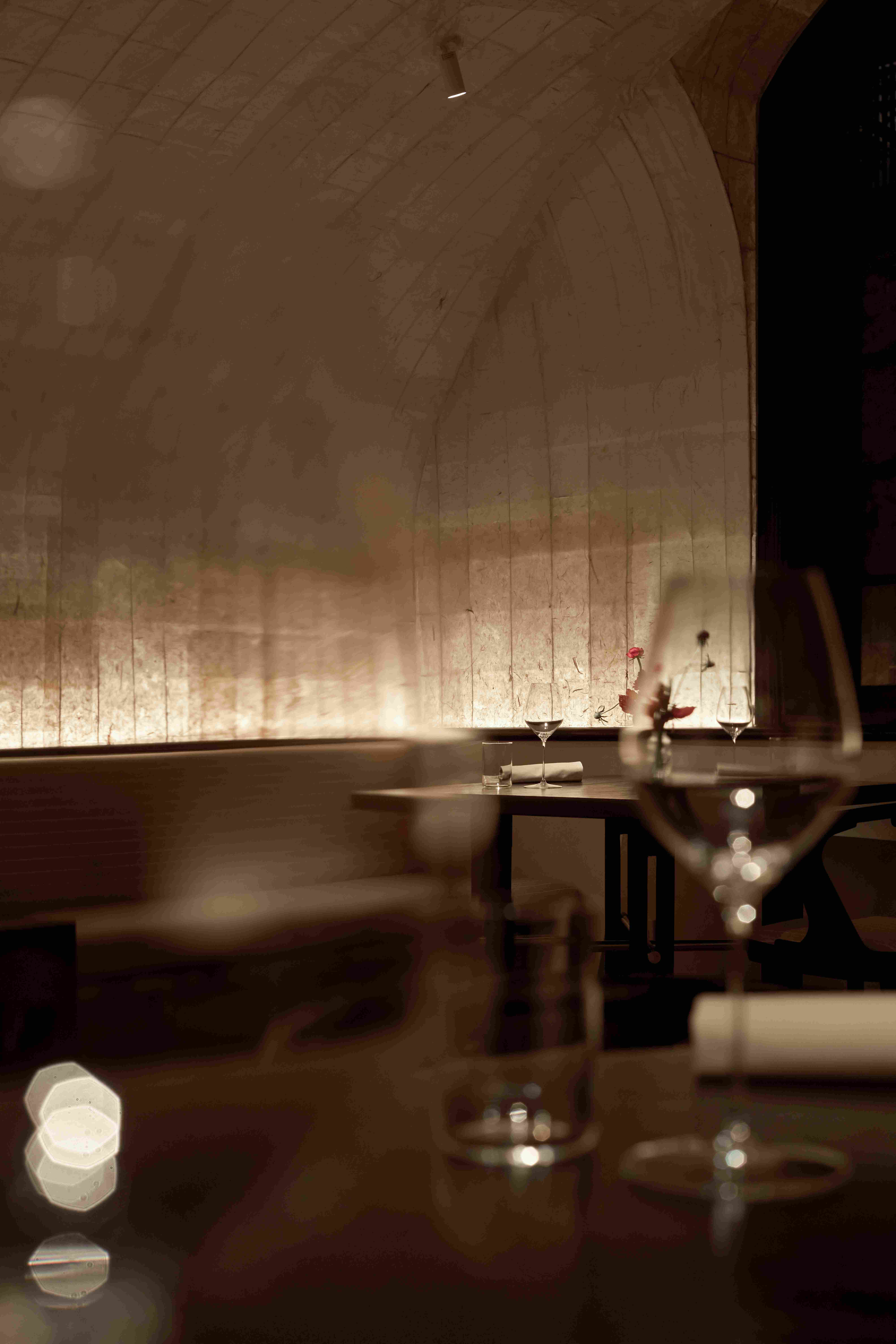 VPTK đã ứng dụng những vật liệu khác nhau vào các tầng để tạo nên một chiếc lồng bàn ôm trọn cả căn nhà – bao gồm lớp vải ở tầng trệt đến lớp lưới ở tầng 2 và phần khung thuộc tầng 3. Những đường nét mang giá trị sẵn có của căn biệt thự được giữ lại, team chọn cách tân các chi tiết như bàn ghế và thêm thắt chất liệu inox vào nội thất nhằm tạo ra sự giao hoà giữa truyền thống và đương đại. Điểm nhấn gây ấn tượng cho những người bạn ghé thăm NEPHELE chính là chất liệu giấy dó bao trùm phần tường và trần của nhà hàng – ánh sáng khi được khuếch tán qua lớp giấy này cộng hưởng với bảng màu be chủ đạo đã tạo nên một không gian chuyển sắc và bồng bềnh như ta đang ngồi trong những đám mây.