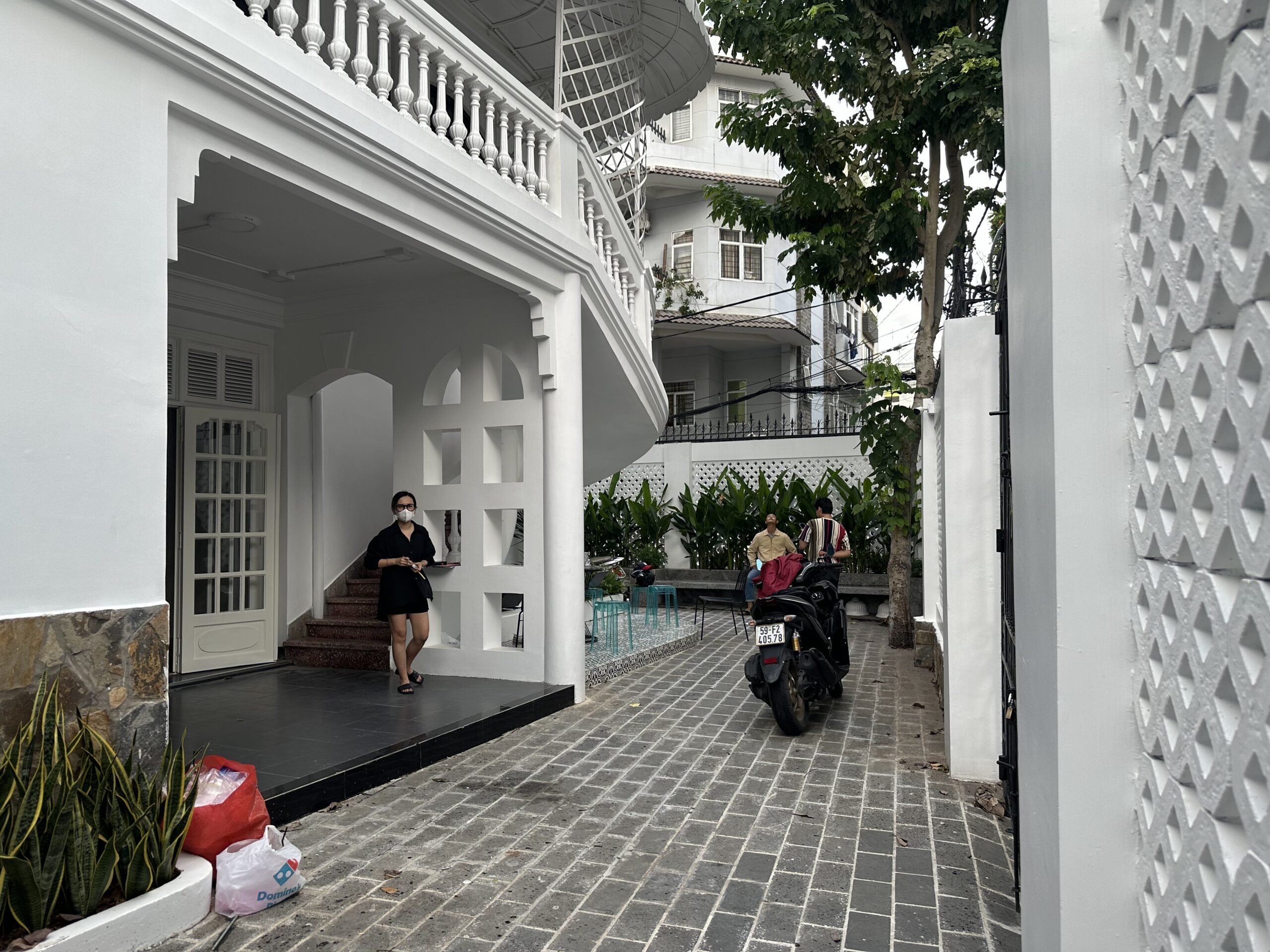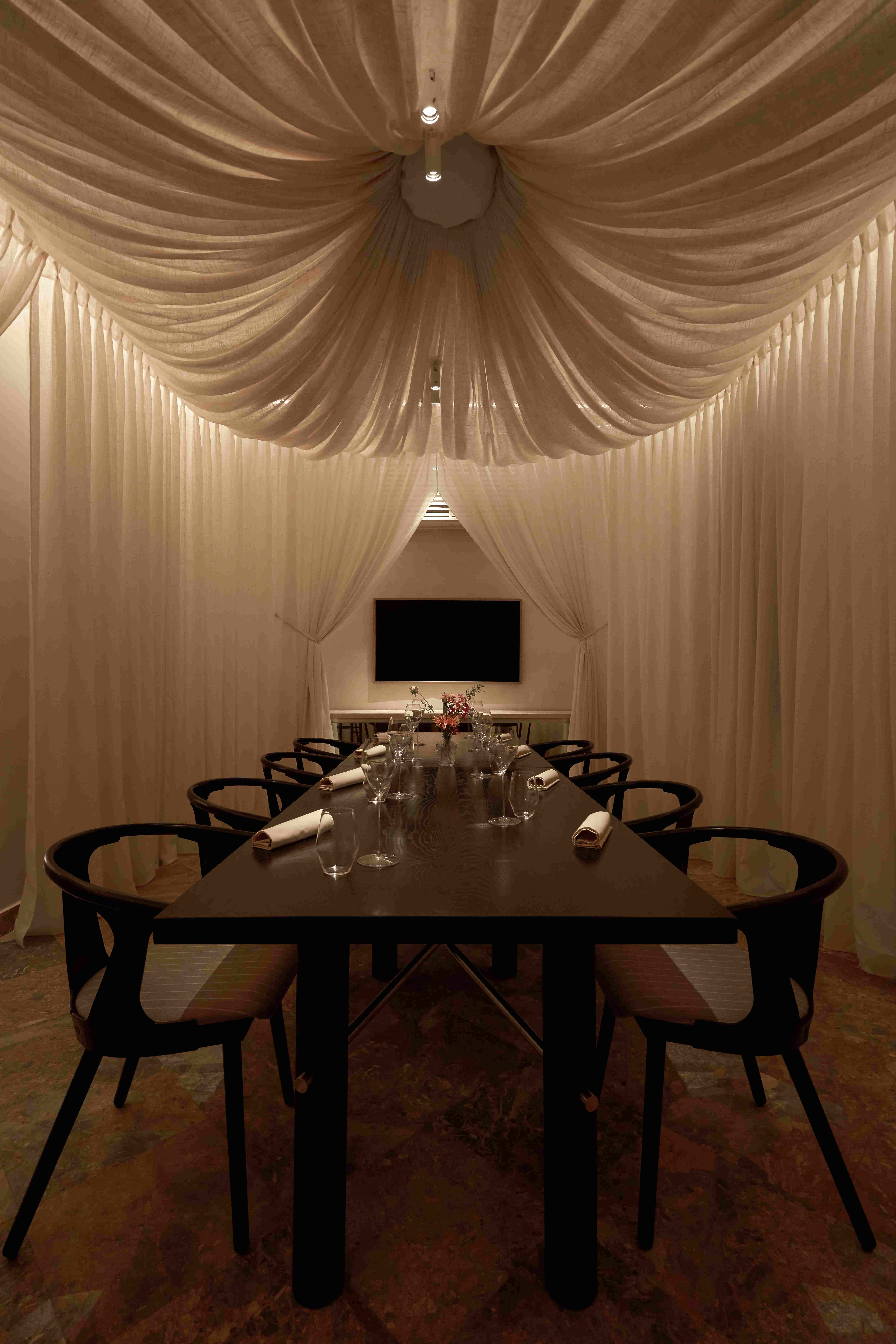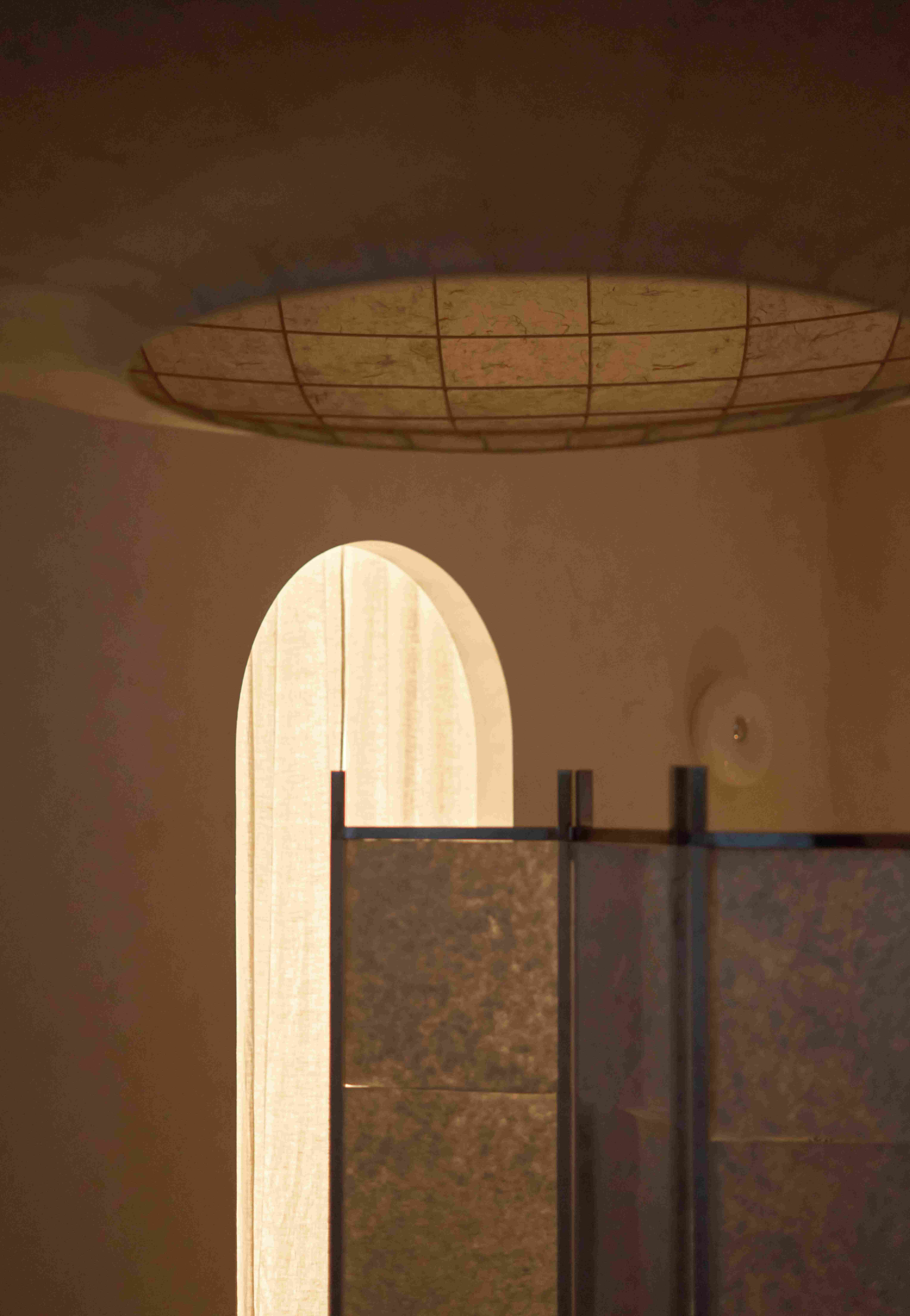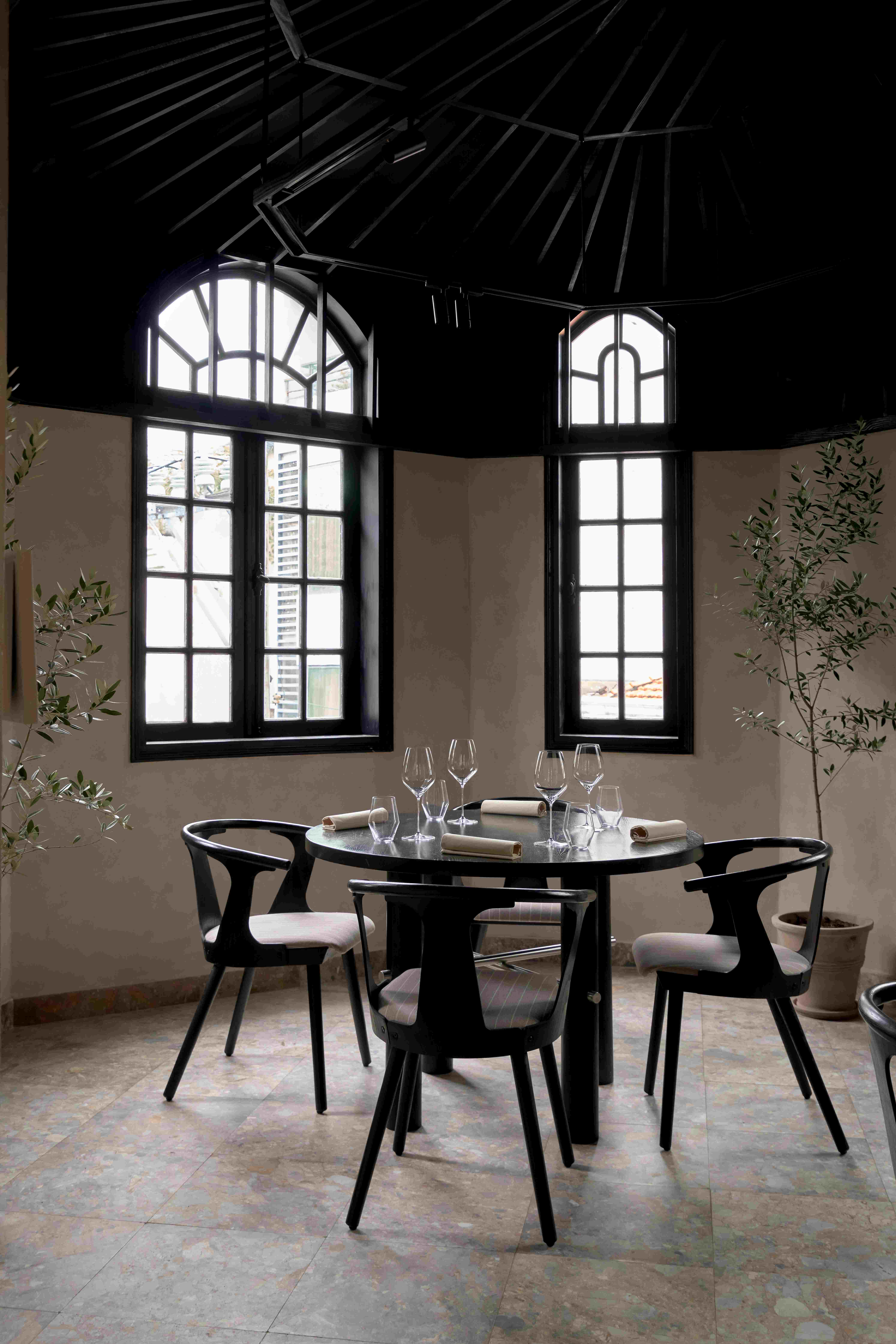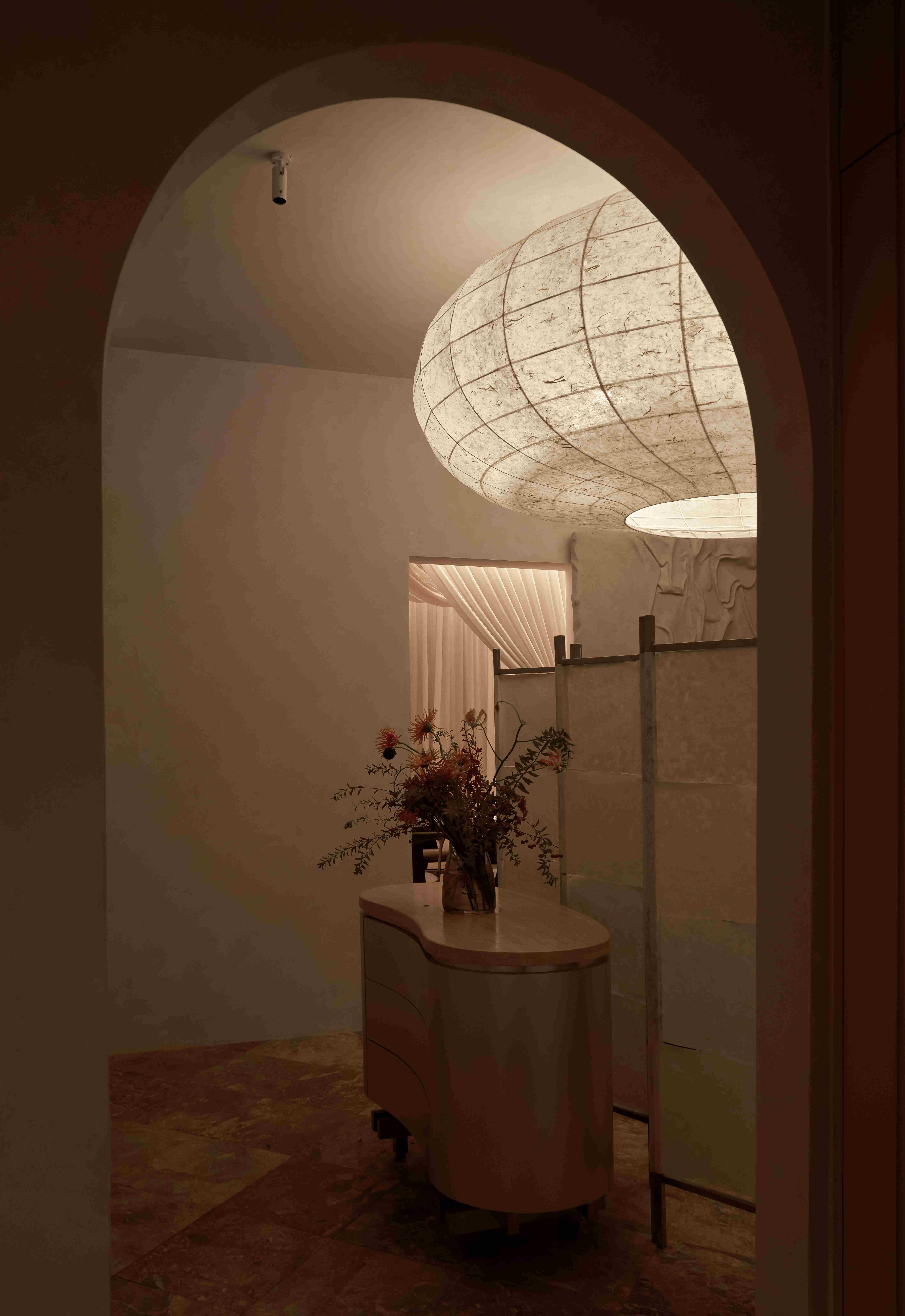 VPTK đã ứng dụng những vật liệu khác nhau vào các tầng để tạo nên một chiếc lồng bàn ôm trọn cả căn nhà – bao gồm lớp vải ở tầng trệt đến lớp lưới ở tầng 2 và phần khung thuộc tầng 3. Những đường nét mang giá trị sẵn có của căn biệt thự được giữ lại, team chọn cách tân các chi tiết như bàn ghế và thêm thắt chất liệu inox vào nội thất nhằm tạo ra sự giao hoà giữa truyền thống và đương đại. Điểm nhấn gây ấn tượng cho những người bạn ghé thăm NEPHELE chính là chất liệu giấy dó bao trùm phần tường và trần của nhà hàng – ánh sáng khi được khuếch tán qua lớp giấy này cộng hưởng với bảng màu be chủ đạo đã tạo nên một không gian chuyển sắc và bồng bềnh như ta đang ngồi trong những đám mây.