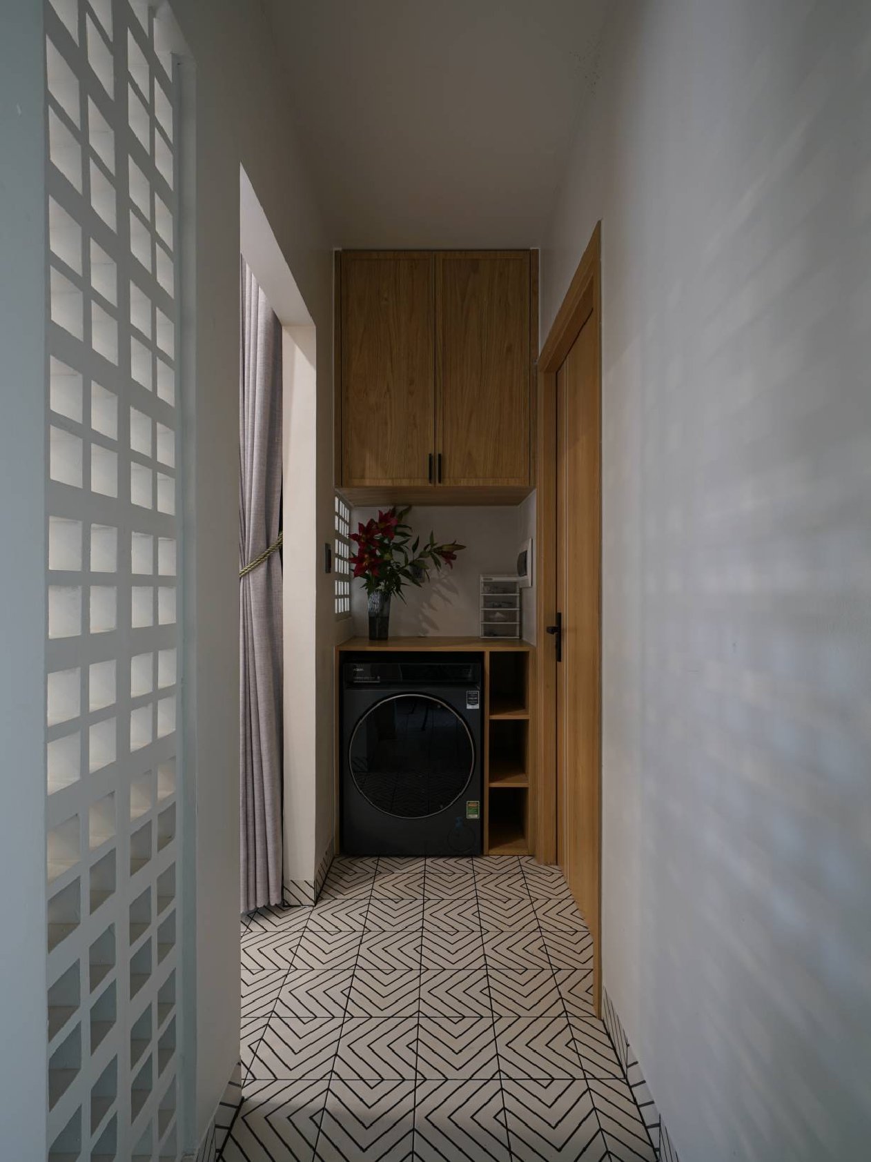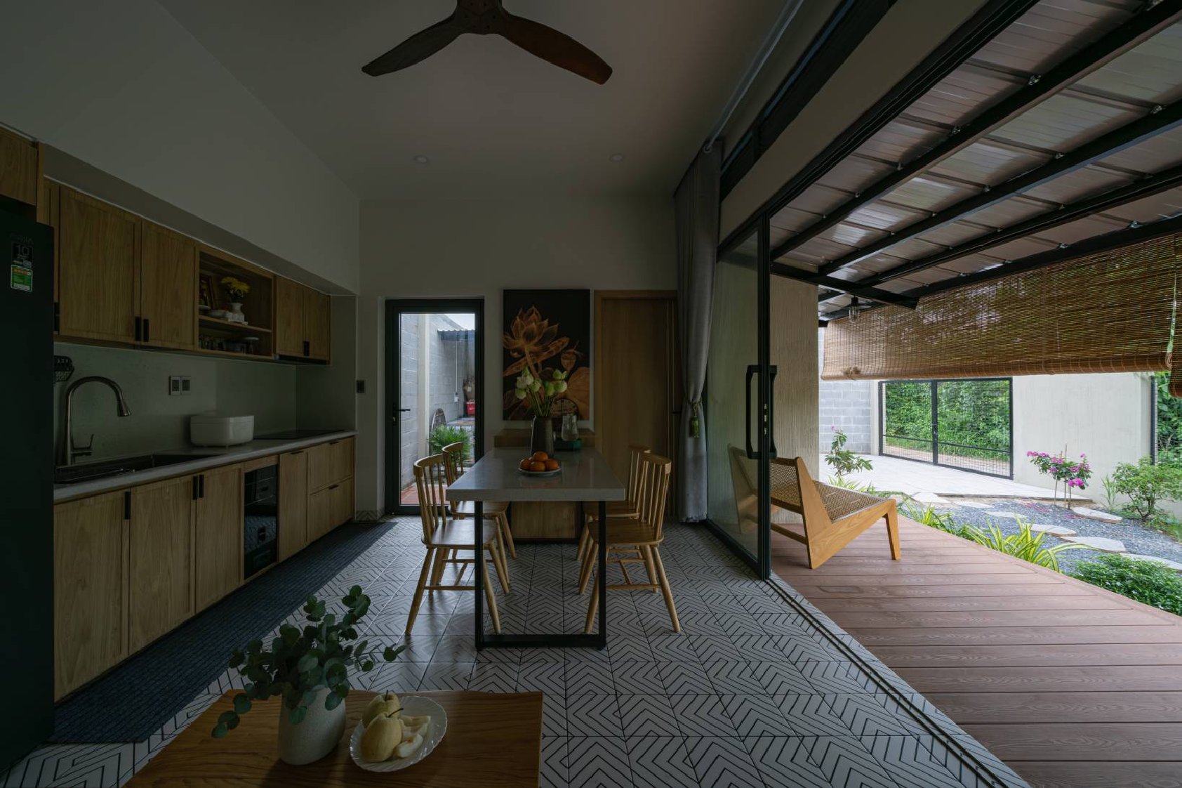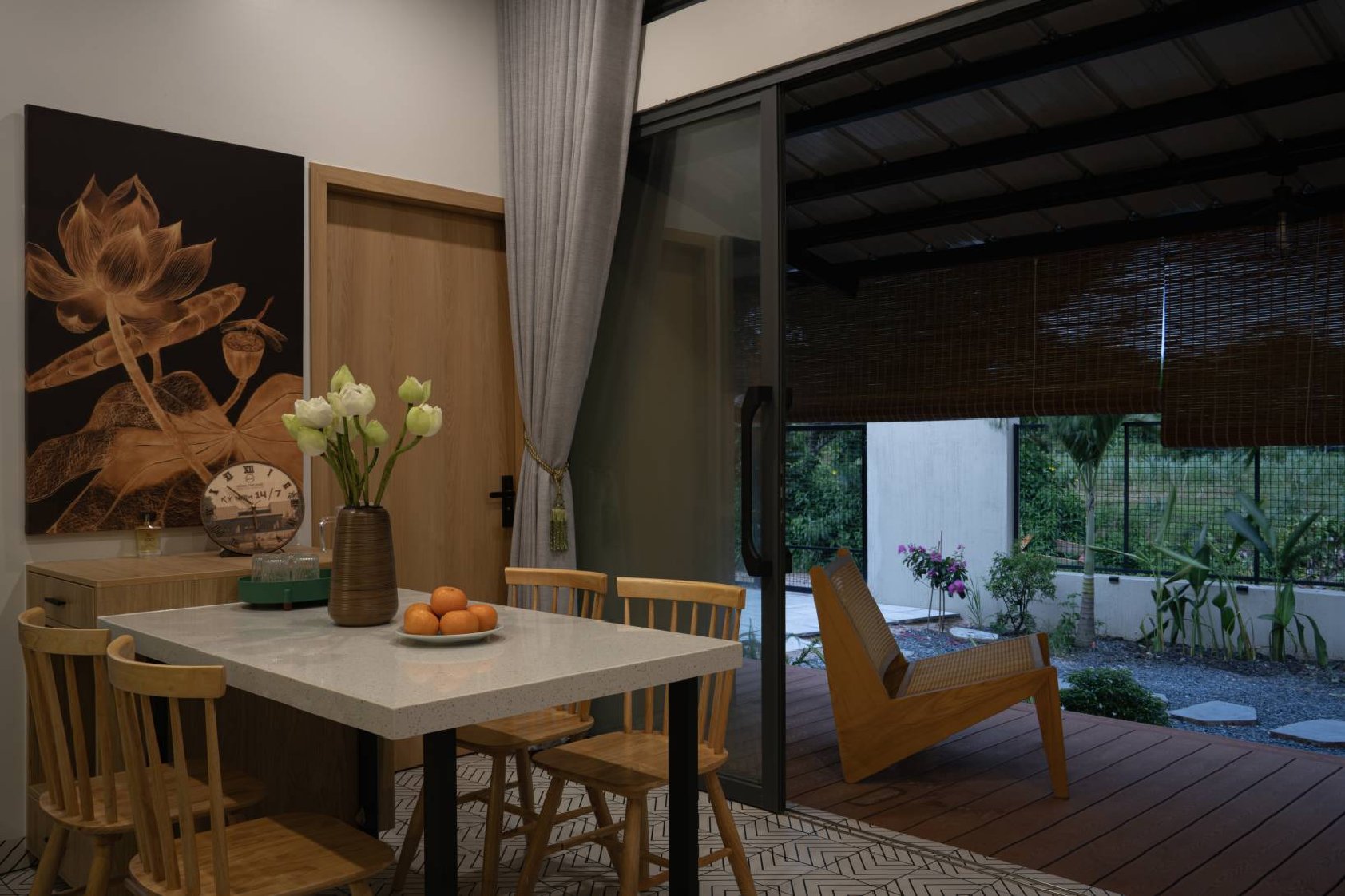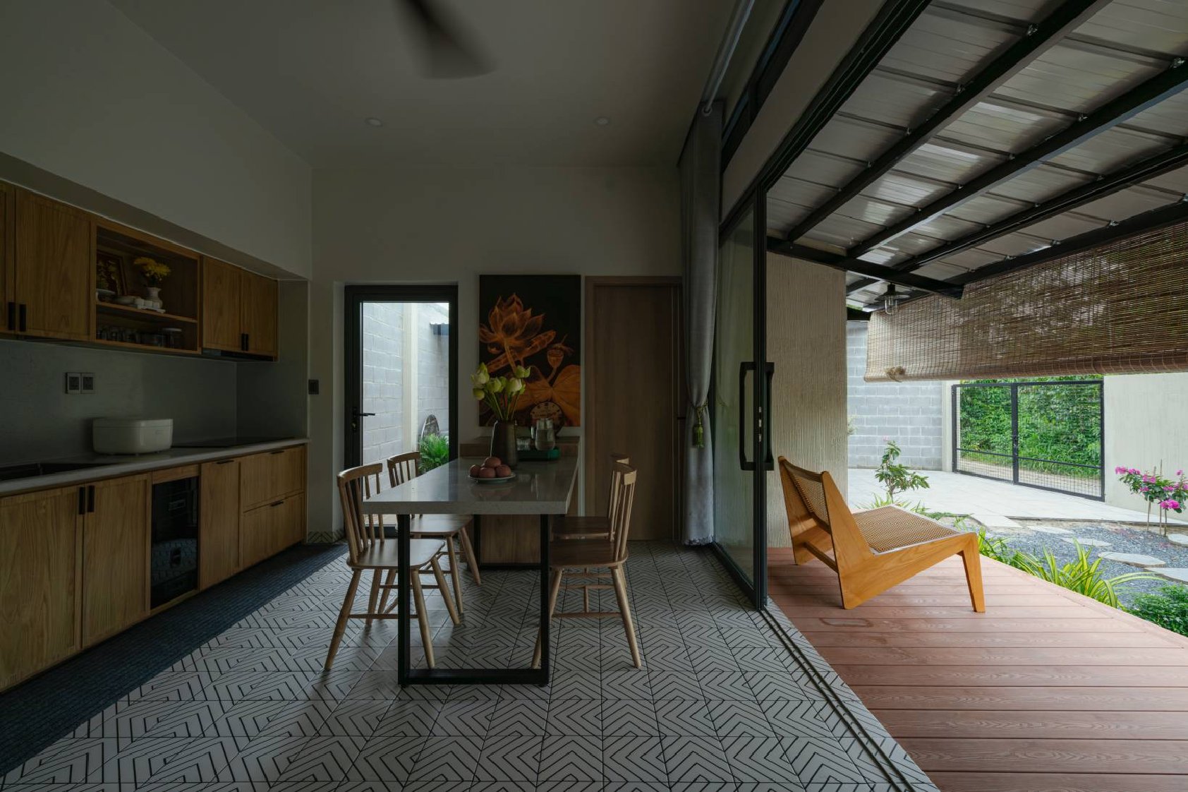 Dù diện tích sàn được tối ưu hóa chỉ hơn $50m^2$, công trình vẫn thể hiện tư duy quy hoạch mạch lạc và linh hoạt. Mọi chi tiết kiến trúc, từ tỷ lệ hình khối đến sự chuyển tiếp giữa các diện đặc – rỗng, đều được xử lý tinh xảo để đạt được sự sang trọng trong tính tối giản. Sự kết hợp giữa vật liệu bản địa như gạch bông, gỗ, cùng hệ mái tôn hiện đại đã tạo nên một dòng chảy thị giác đầy hoài niệm nhưng không xa rời nhịp sống mới.