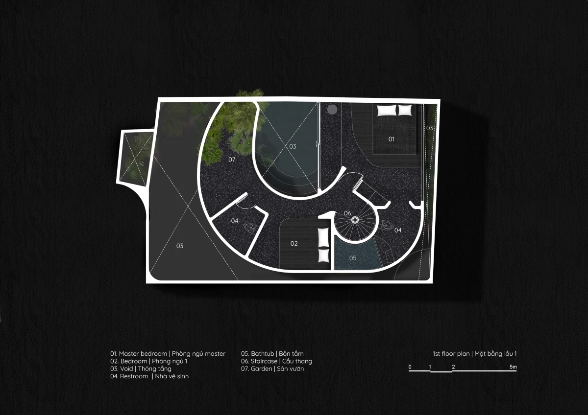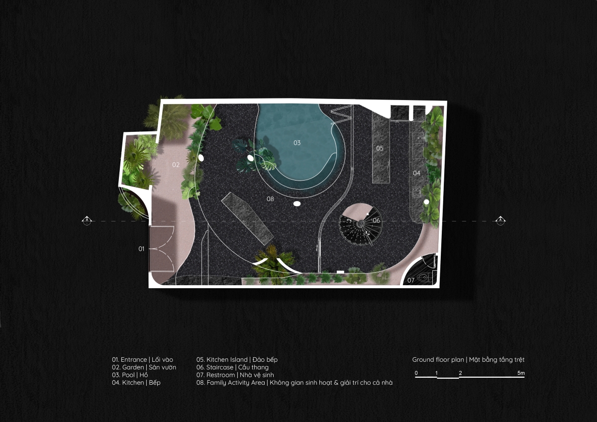 Căn nhà tổ chức theo nguyên tắc “tối thiểu hóa” không gian chức năng, để “tối đa hóa” diện tích sân vườn và mặt nước. Cách tiếp cận này cho phép thiên nhiên len lỏi sâu vào từng khu vực, tạo sự kết nối liên tục giữa trong và ngoài, hình thành dòng chảy không gian liền mạch và đa dạng góc nhìn khi di chuyển.