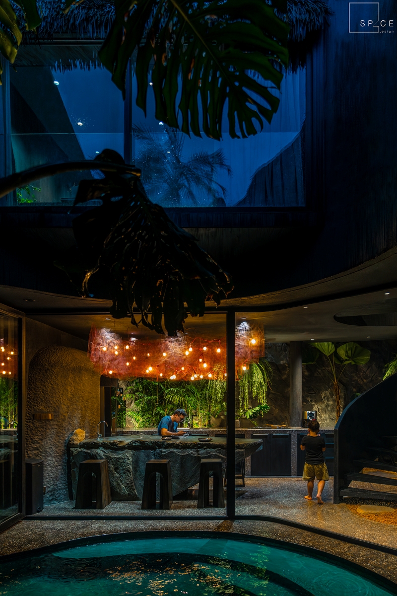 Ngôi nhà được định hướng như một không gian “cộng sinh” giữa con người và thiên nhiên. Toàn bộ không gian sống được tổ chức xoay quanh sân vườn và hồ nước trung tâm – một “khoảng thở” đóng vai trò lõi sinh thái, giúp mọi khu vực trong nhà đều mở ra mảng xanh. Thiên nhiên không chỉ hiện diện như yếu tố trang trí, mà trở thành yếu tố chính chi phối không gian.