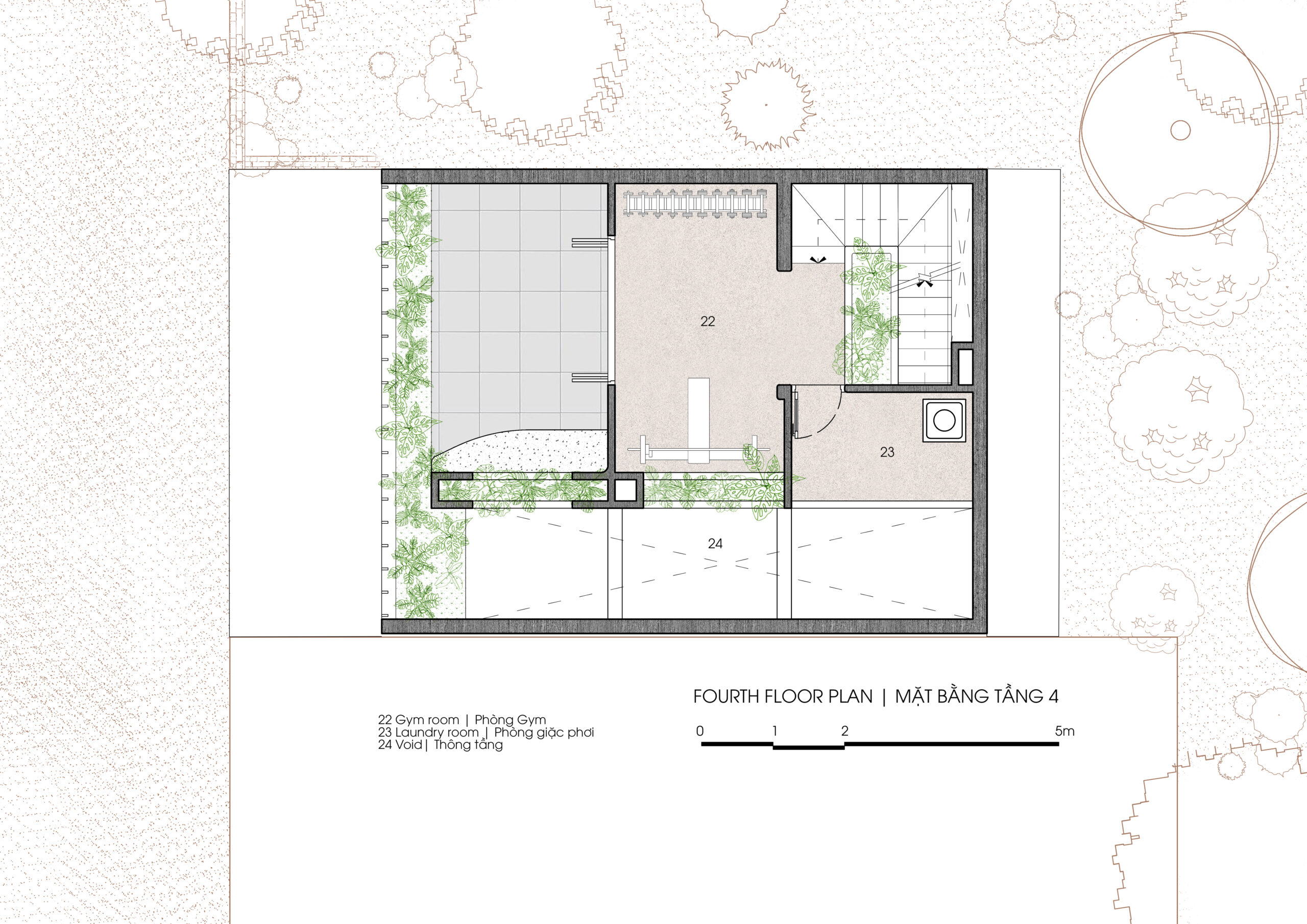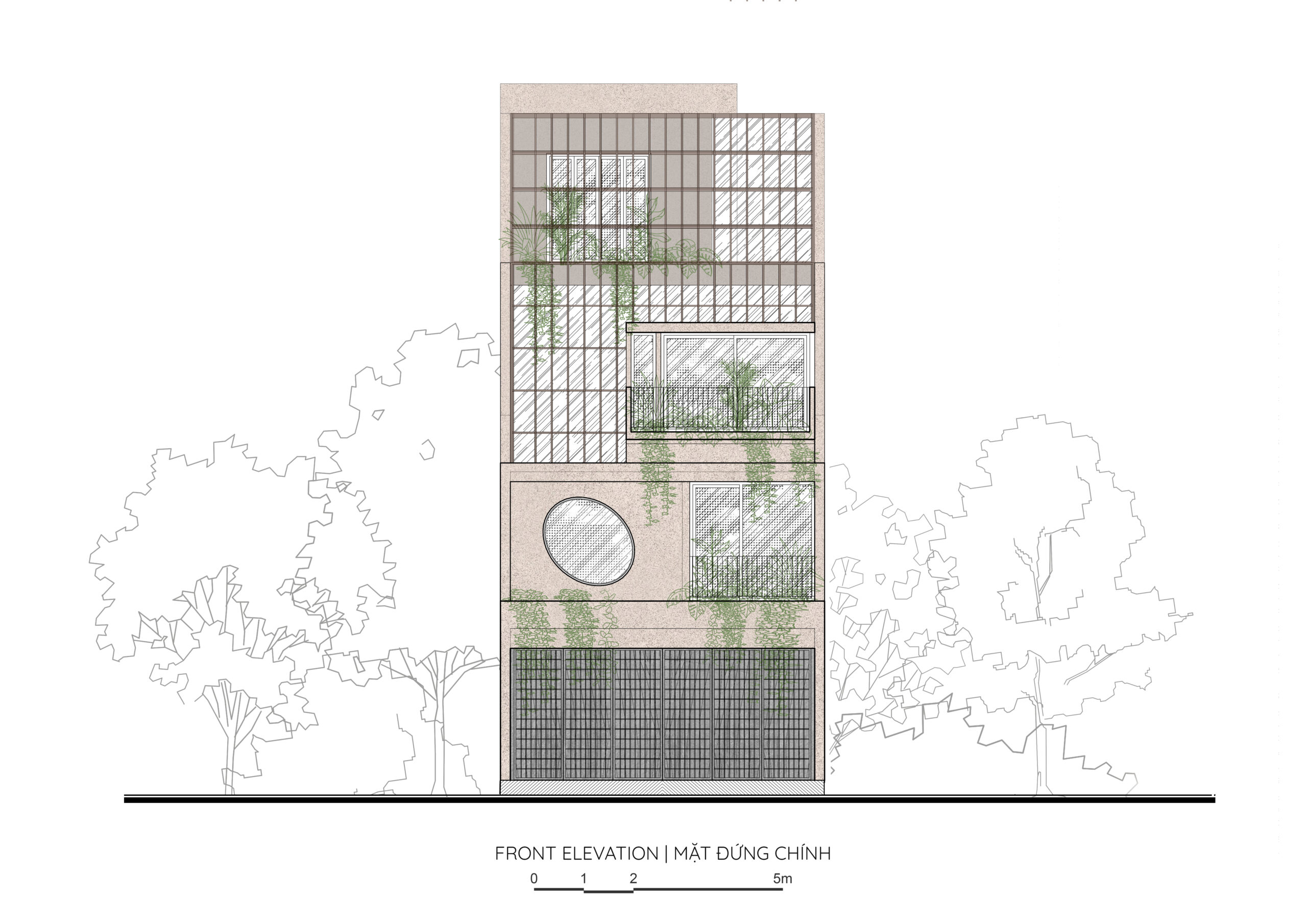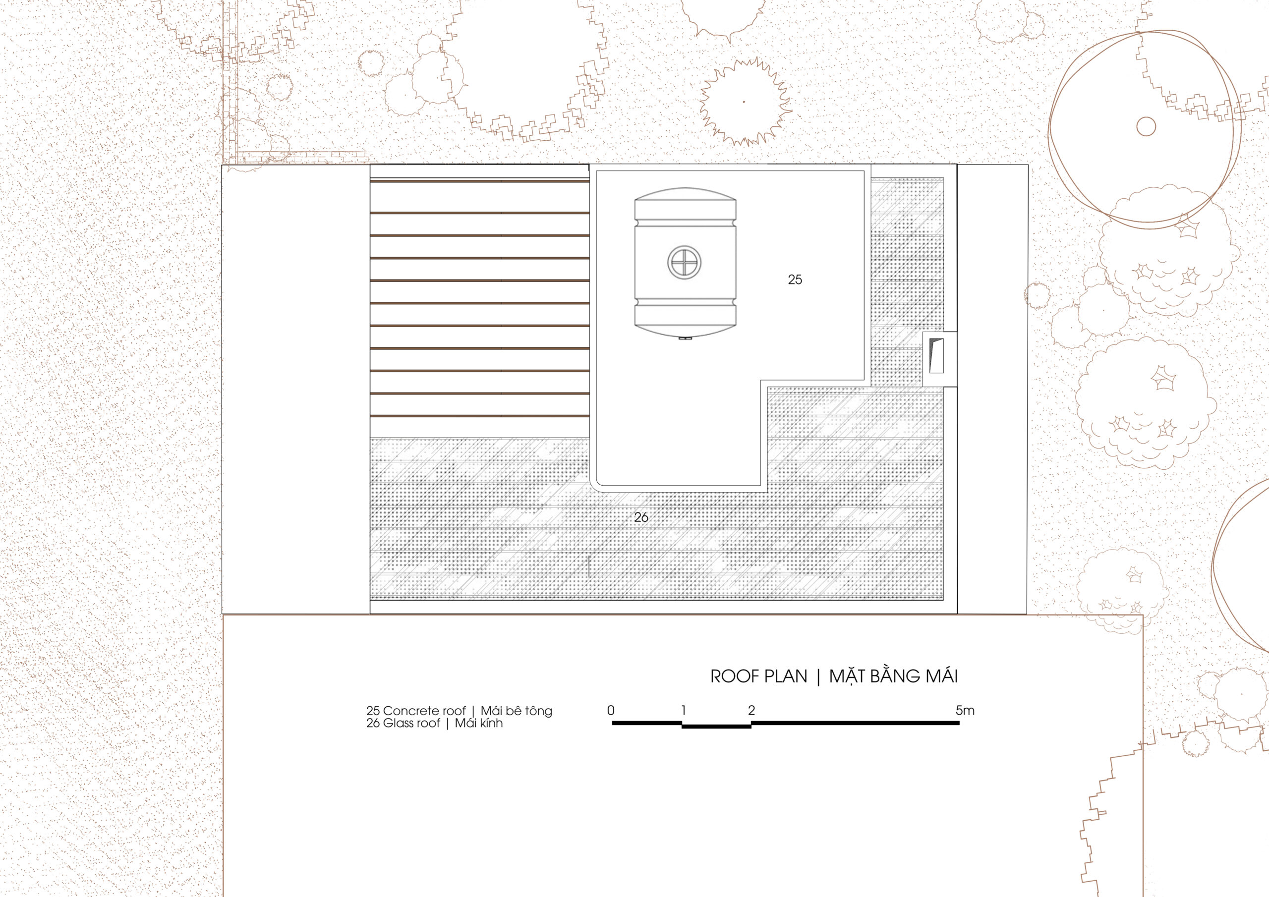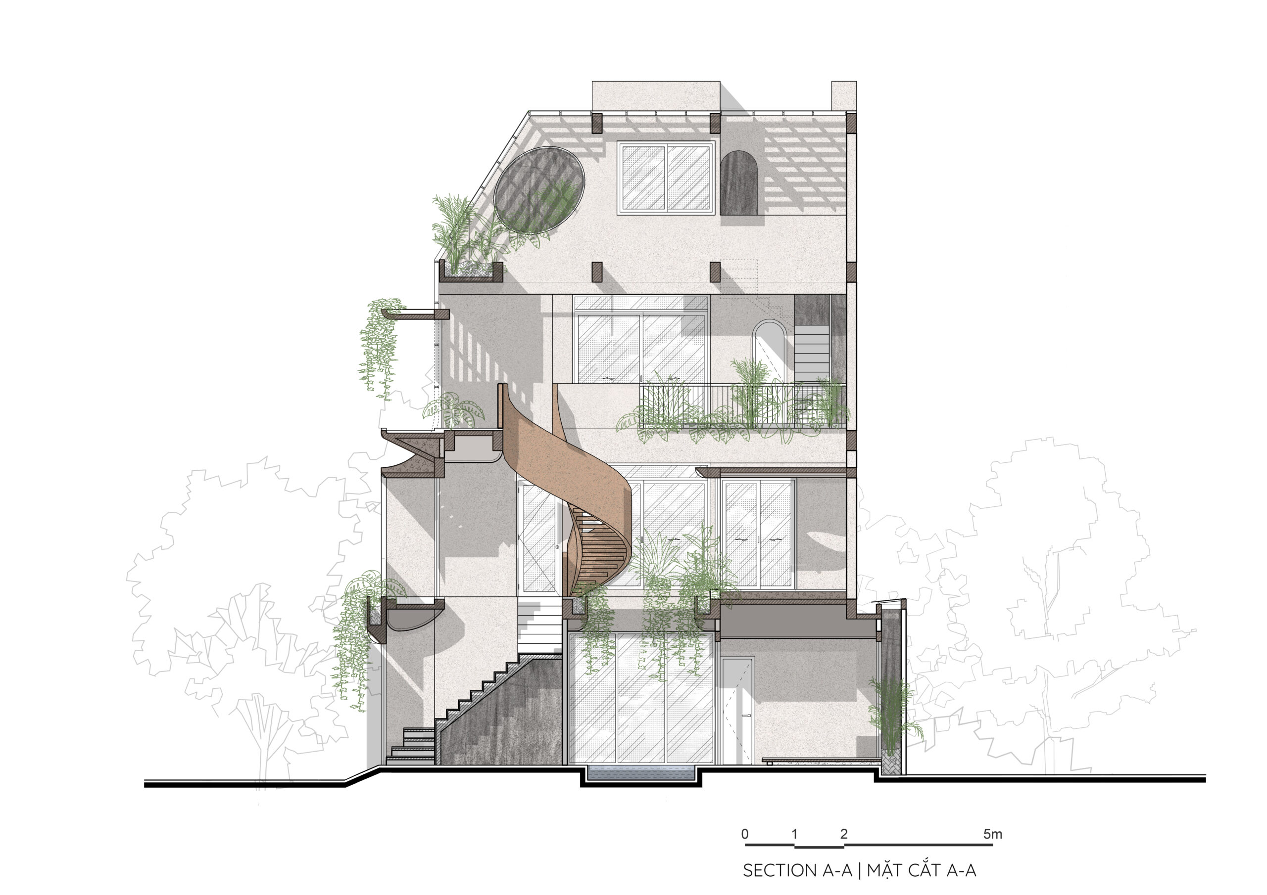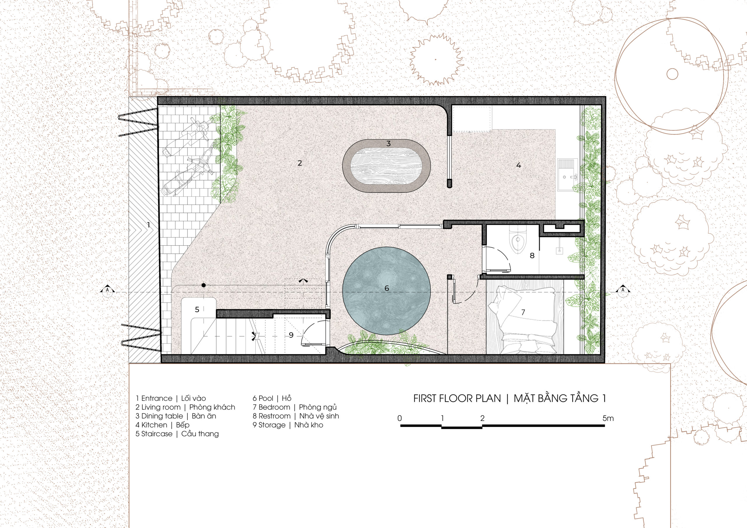 Trong tổ chức mặt bằng, khái niệm “Phần bù” được khai thác triệt để: những khoảng trống không định hình ban đầu trở thành các yếu tố kiến tạo không gian chủ chốt. Chính ánh sáng và mảng xanh đã “định hình” các khoảng trống này, giúp diện tích nhỏ hẹp trở nên thoáng đạt và đa năng. Cấu trúc công trình được phân tách thành hai dải song hành: khối ở đặc trưng và dải không gian mở chạy dọc chiều dài nhà, tạo điều kiện cho việc đón sáng tự nhiên và thông gió xuyên phòng tối ưu.