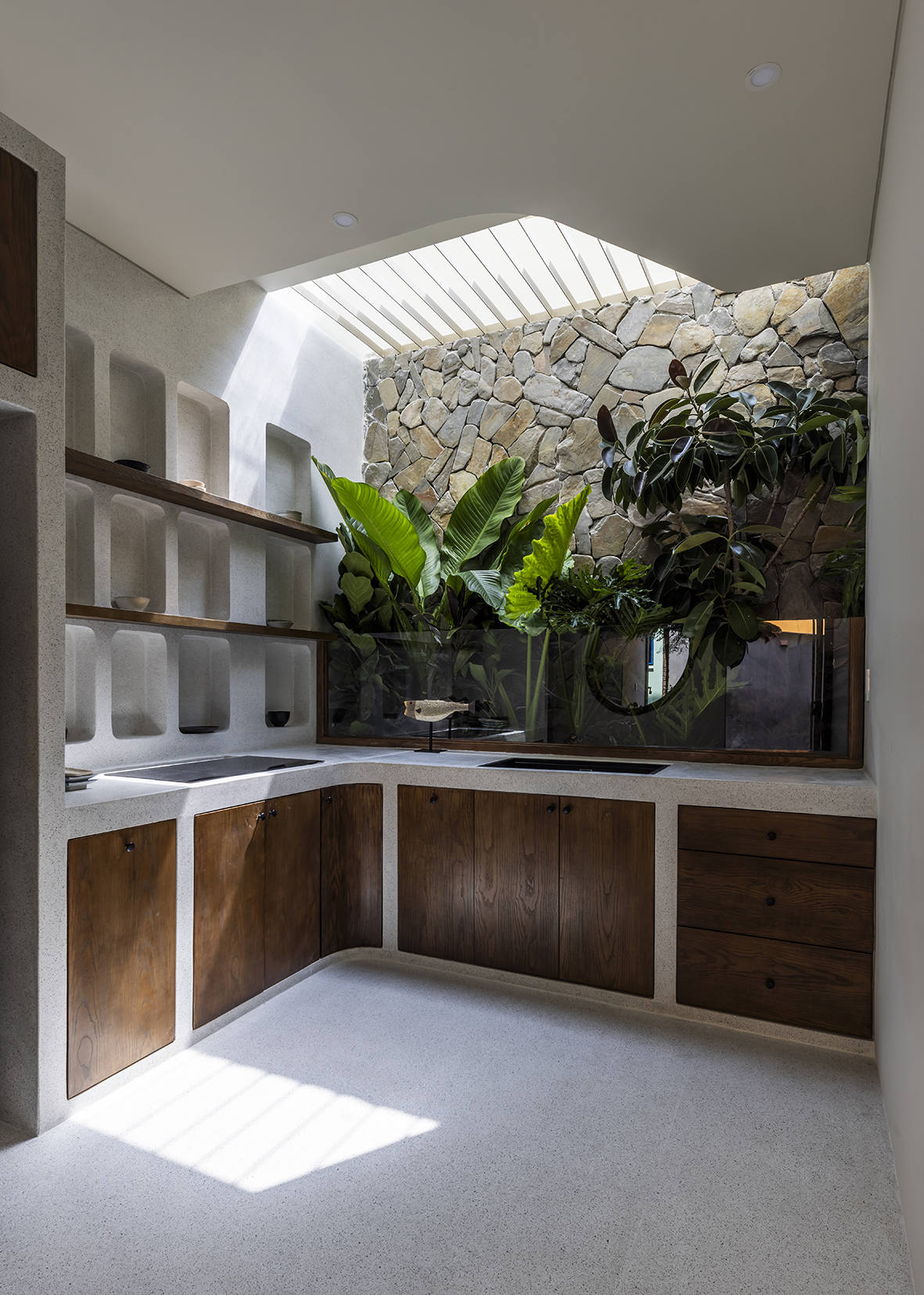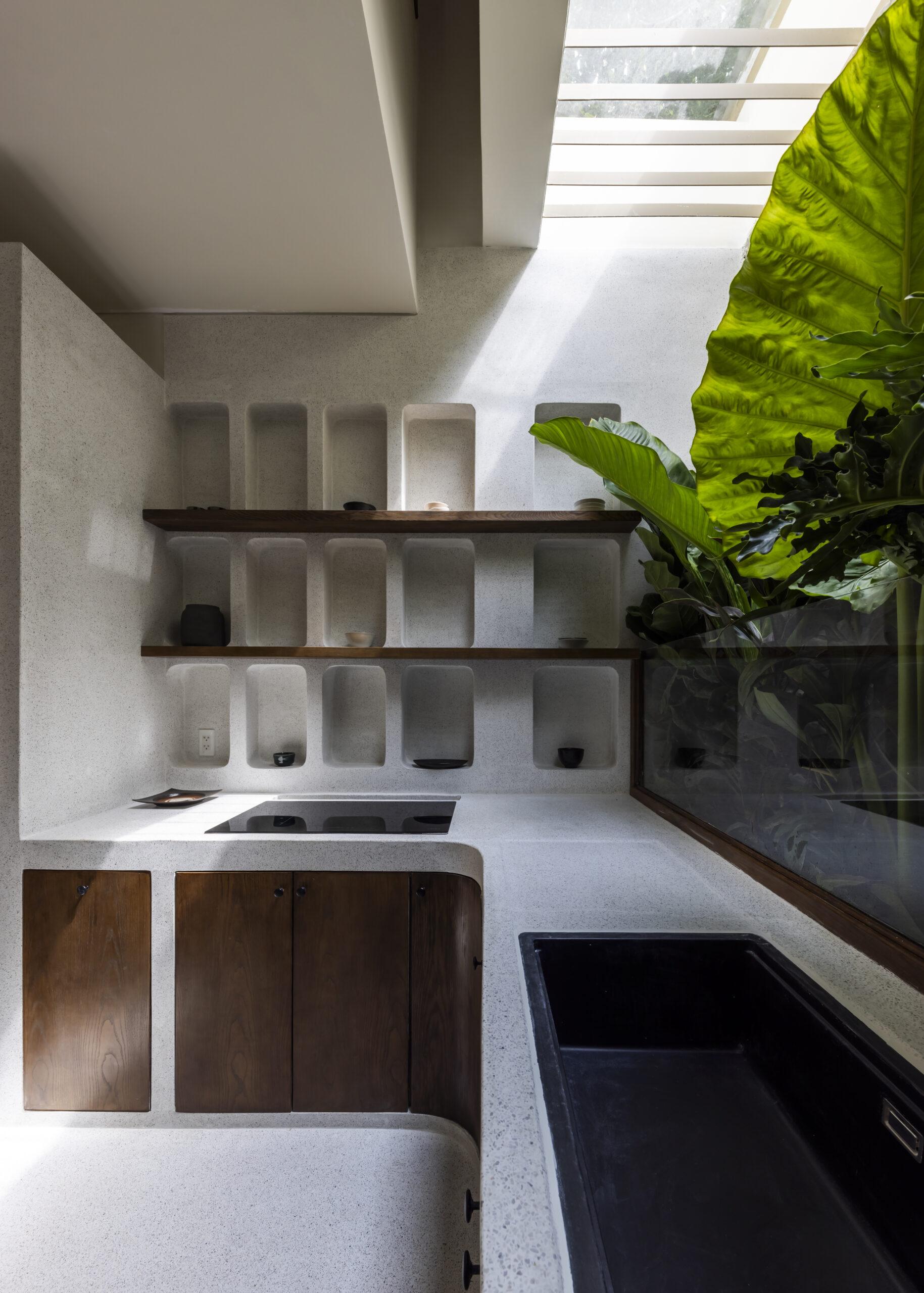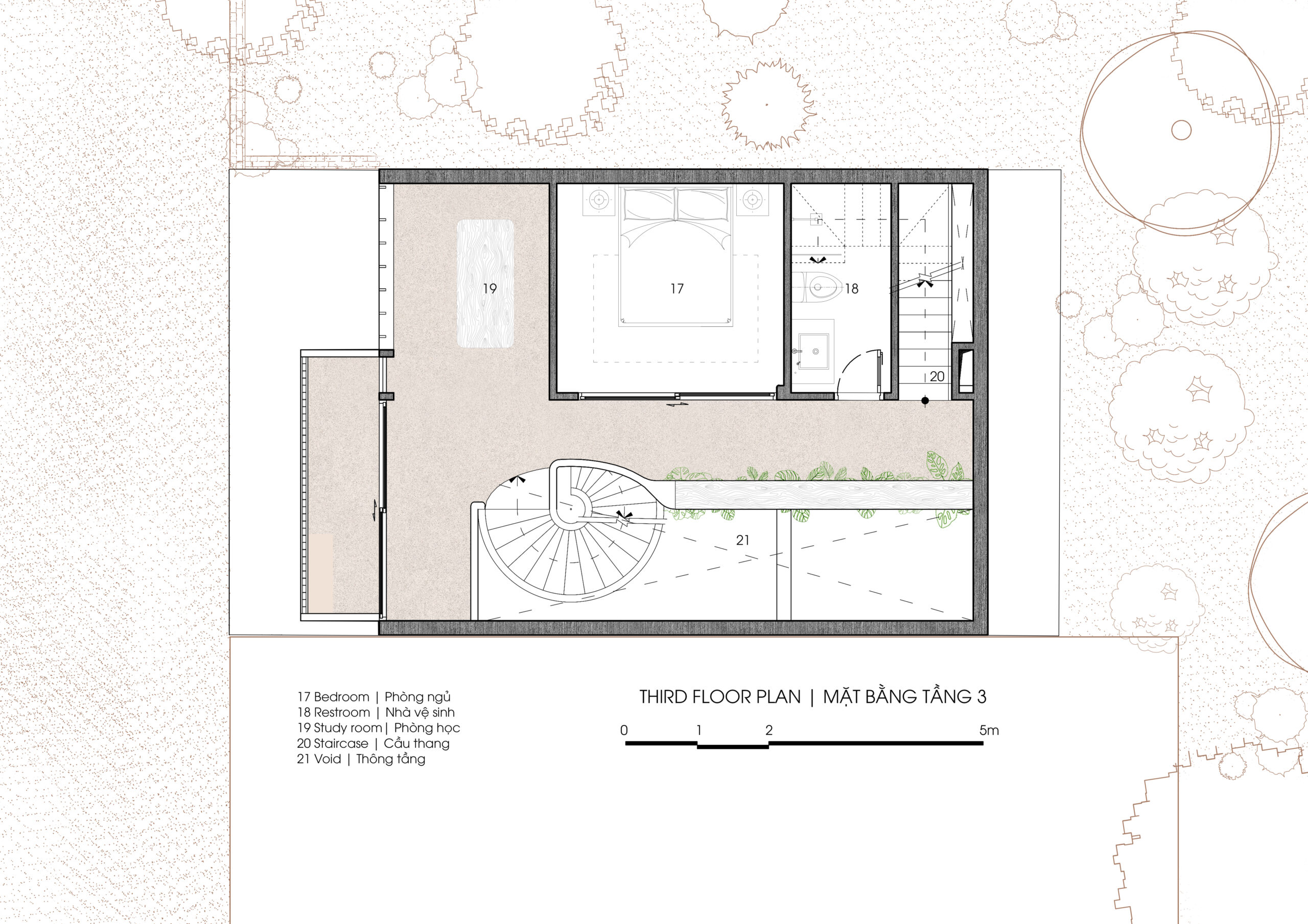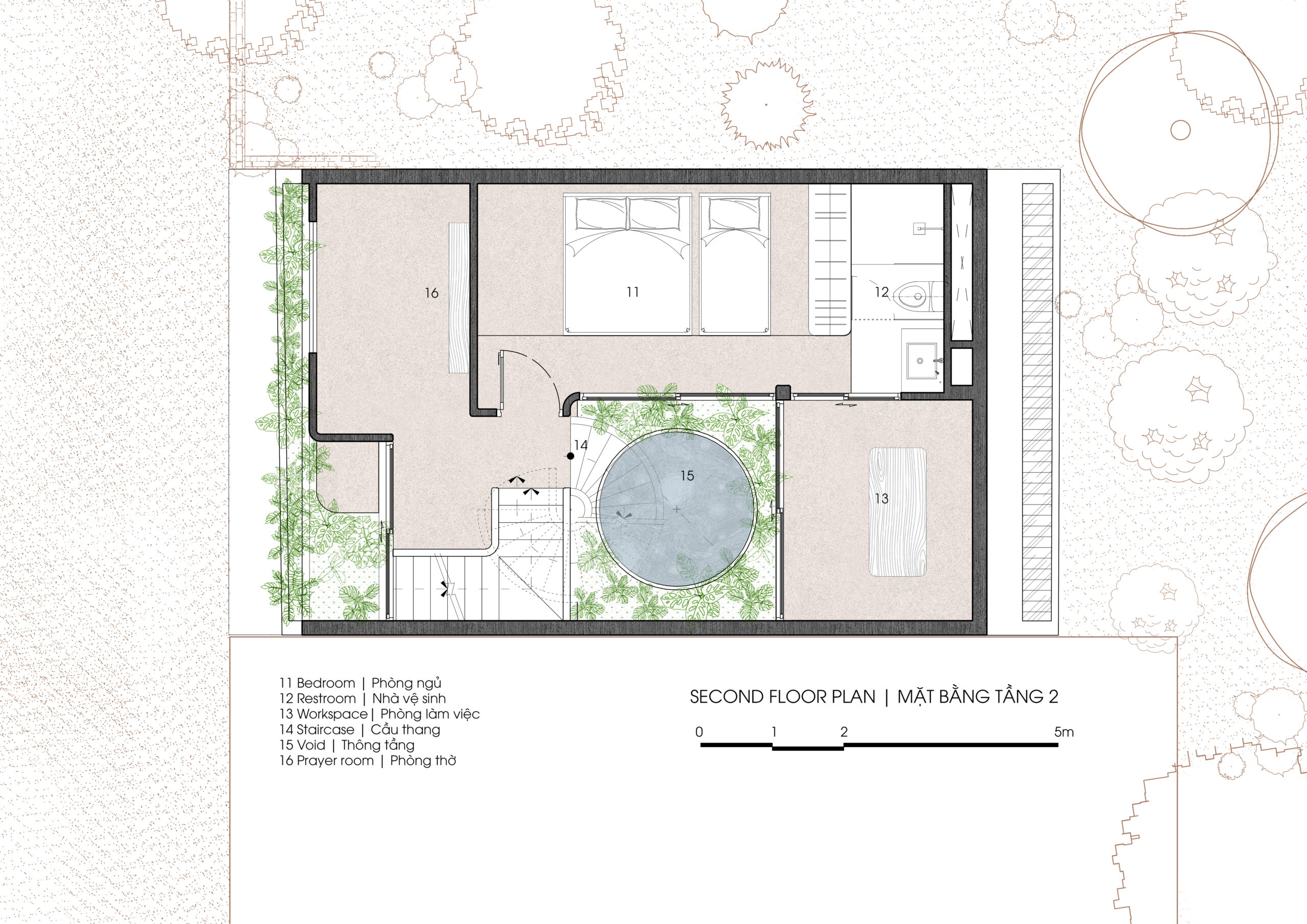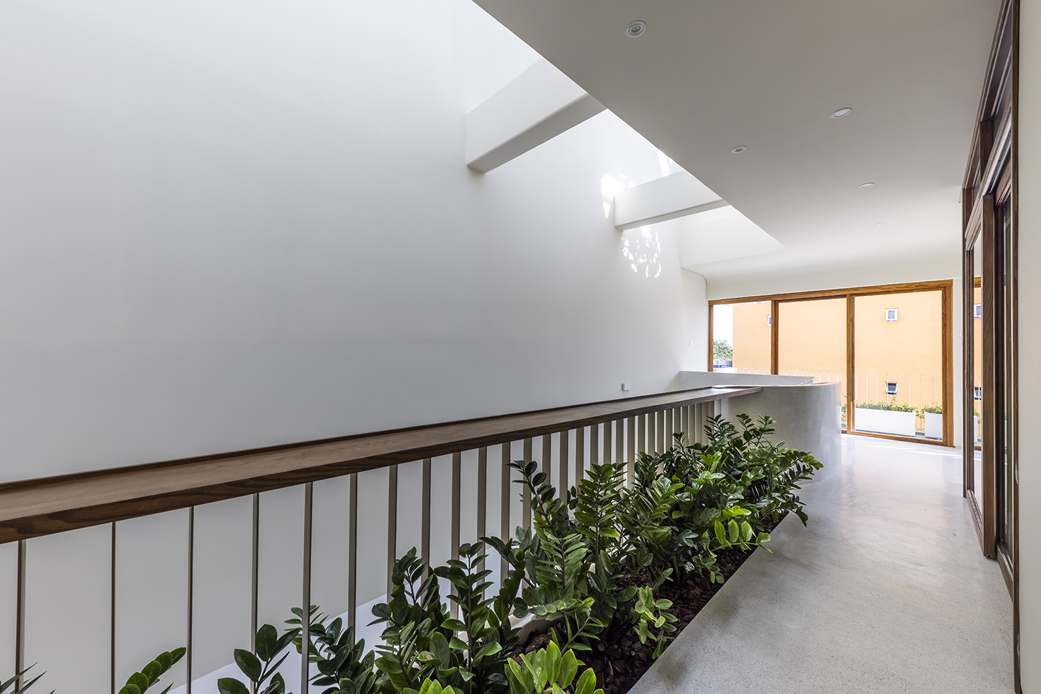 Trong tổ chức mặt bằng, khái niệm “Phần bù” được khai thác triệt để: những khoảng trống không định hình ban đầu trở thành các yếu tố kiến tạo không gian chủ chốt. Chính ánh sáng và mảng xanh đã “định hình” các khoảng trống này, giúp diện tích nhỏ hẹp trở nên thoáng đạt và đa năng. Cấu trúc công trình được phân tách thành hai dải song hành: khối ở đặc trưng và dải không gian mở chạy dọc chiều dài nhà, tạo điều kiện cho việc đón sáng tự nhiên và thông gió xuyên phòng tối ưu.