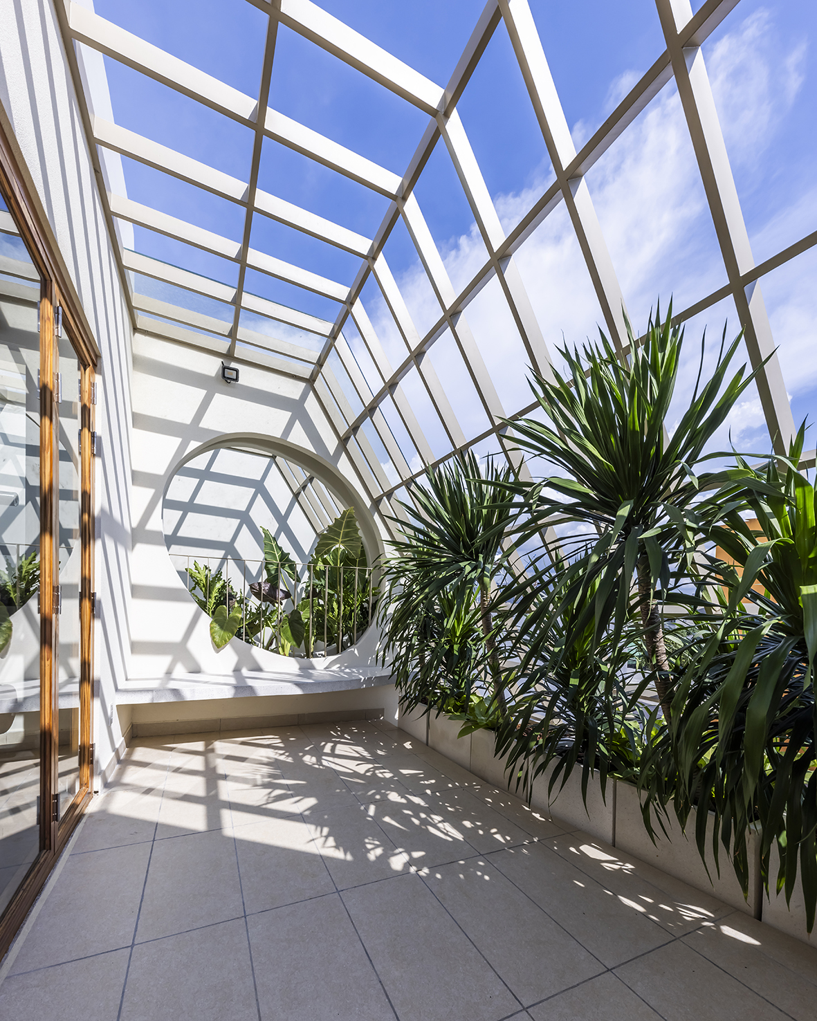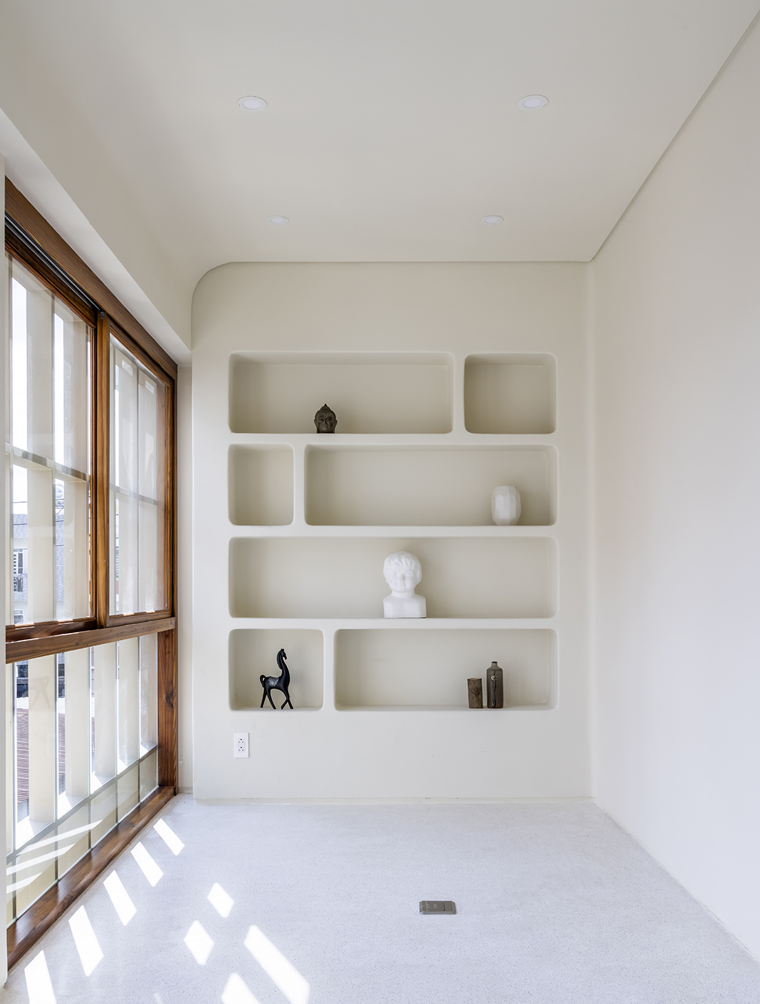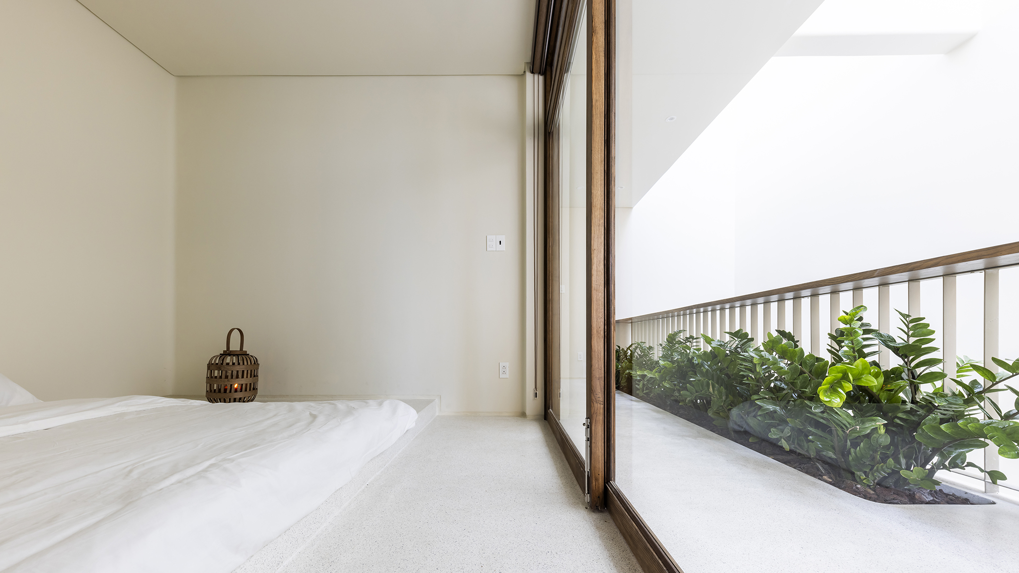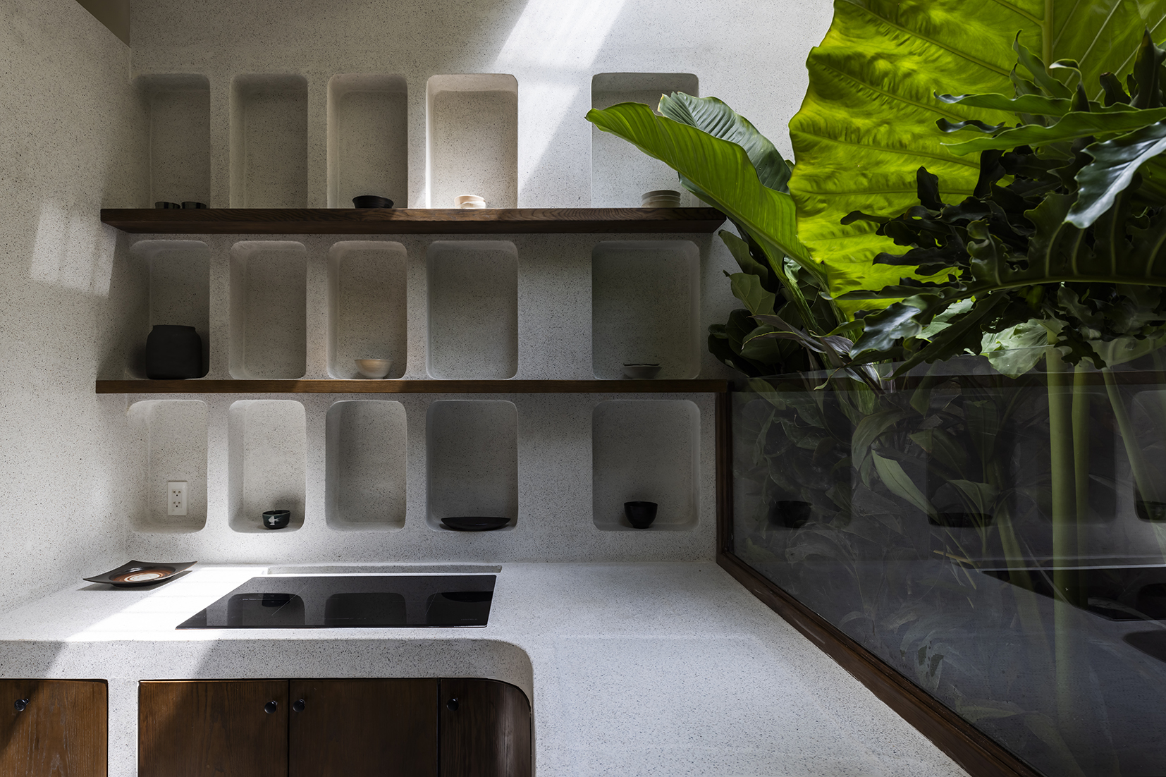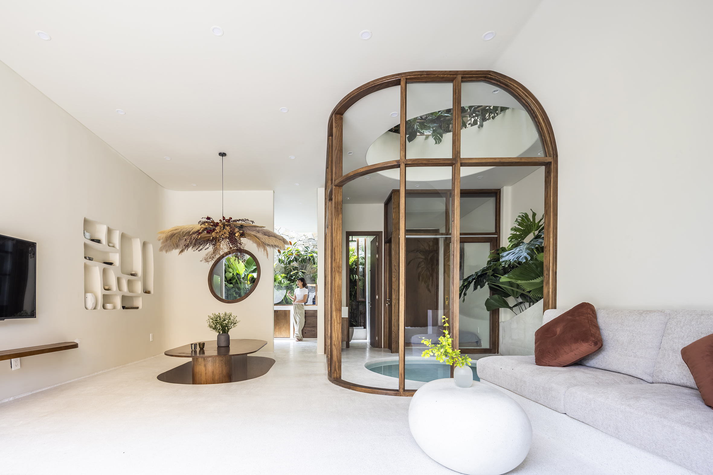 Trong tổ chức mặt bằng, khái niệm “Phần bù” được khai thác triệt để: những khoảng trống không định hình ban đầu trở thành các yếu tố kiến tạo không gian chủ chốt. Chính ánh sáng và mảng xanh đã “định hình” các khoảng trống này, giúp diện tích nhỏ hẹp trở nên thoáng đạt và đa năng. Cấu trúc công trình được phân tách thành hai dải song hành: khối ở đặc trưng và dải không gian mở chạy dọc chiều dài nhà, tạo điều kiện cho việc đón sáng tự nhiên và thông gió xuyên phòng tối ưu.
