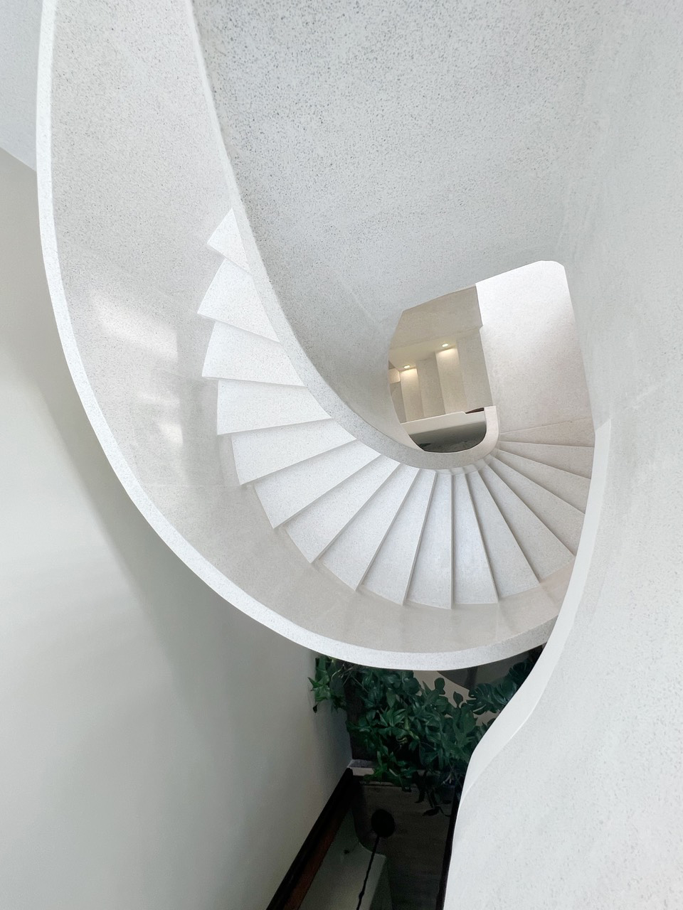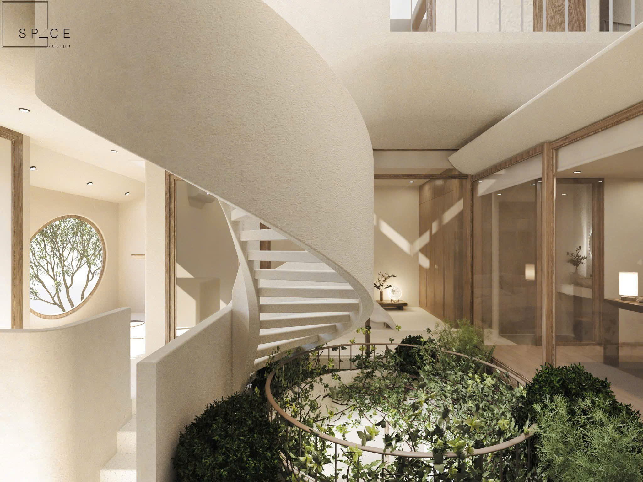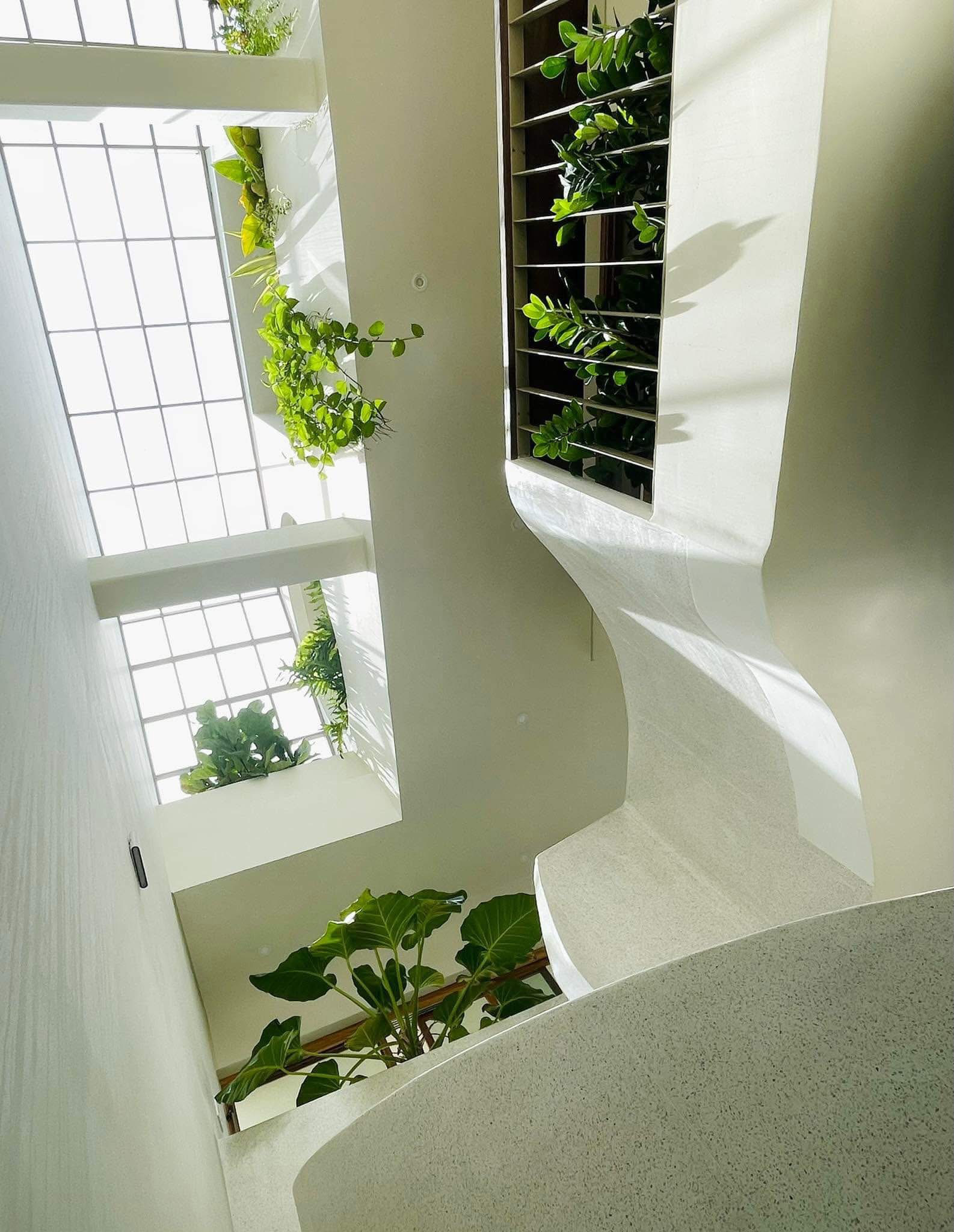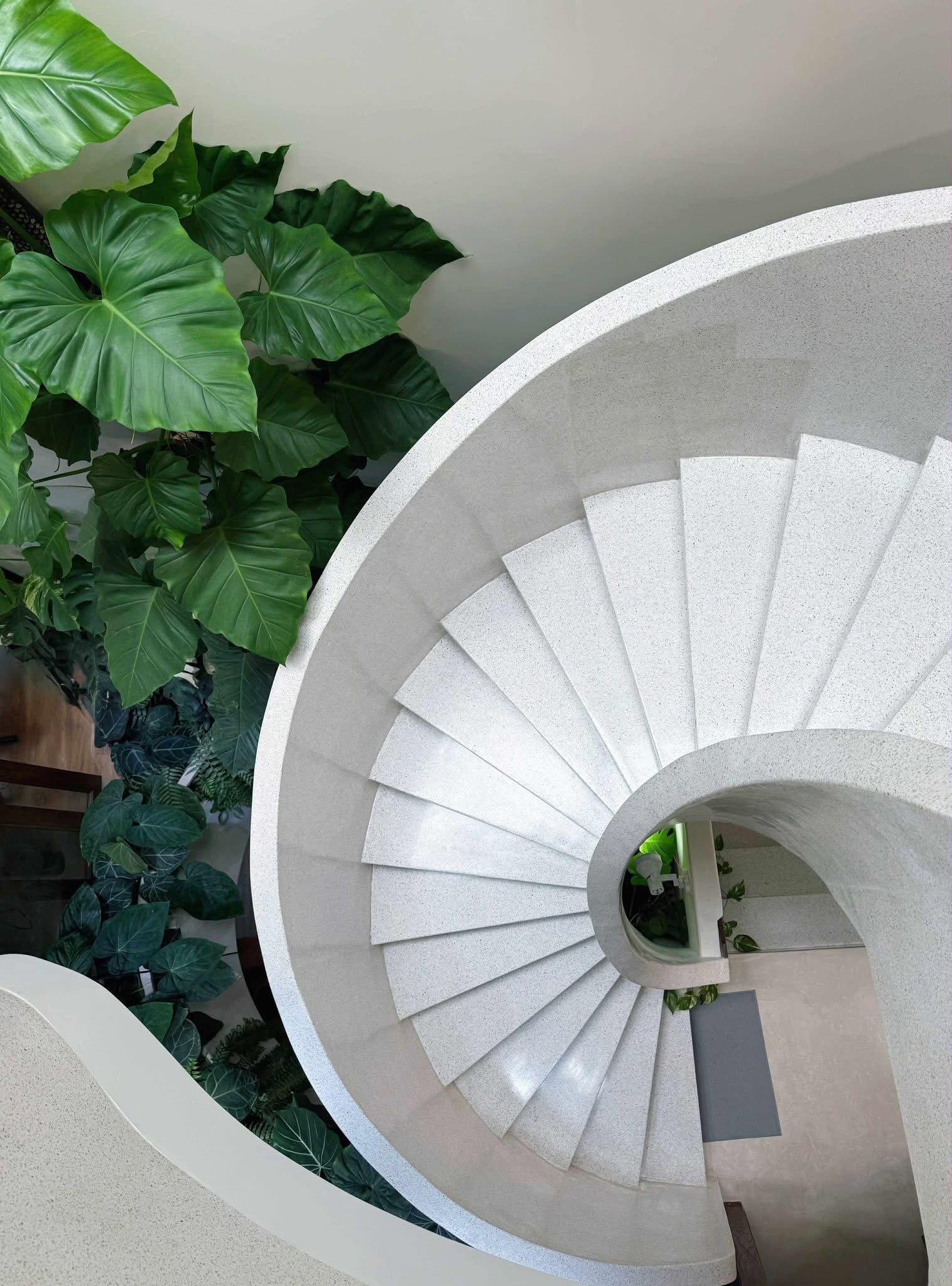 Ngôn ngữ vật liệu nhấn mạnh tính nguyên bản và xúc giác. Chất liệu đá mài (terrazzo) bao phủ bề mặt từ sàn đến vách, tạo sự đồng nhất về thị giác. Điểm nhấn thị giác mạnh mẽ nhất là hệ cầu thang xoắn bê tông đúc nguyên khối, được đặt “lơ lửng” giữa hệ thống hồ nước, cây xanh và ánh sáng thông tầng. Tại đây, vật liệu không đóng vai trò trang trí bề mặt mà trở thành một phần của cấu trúc trải nghiệm.