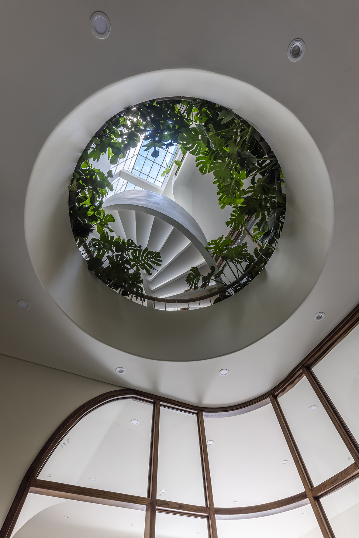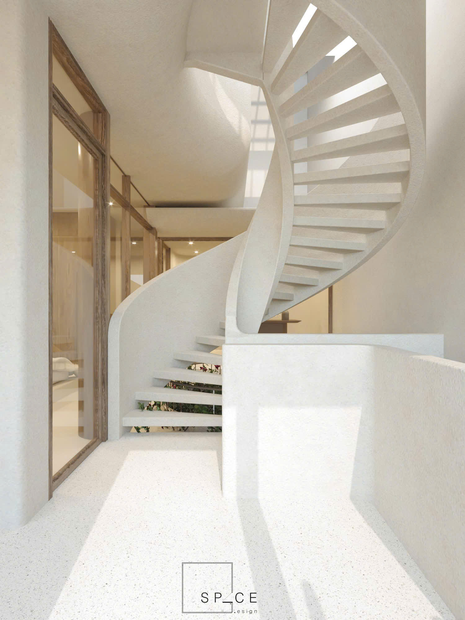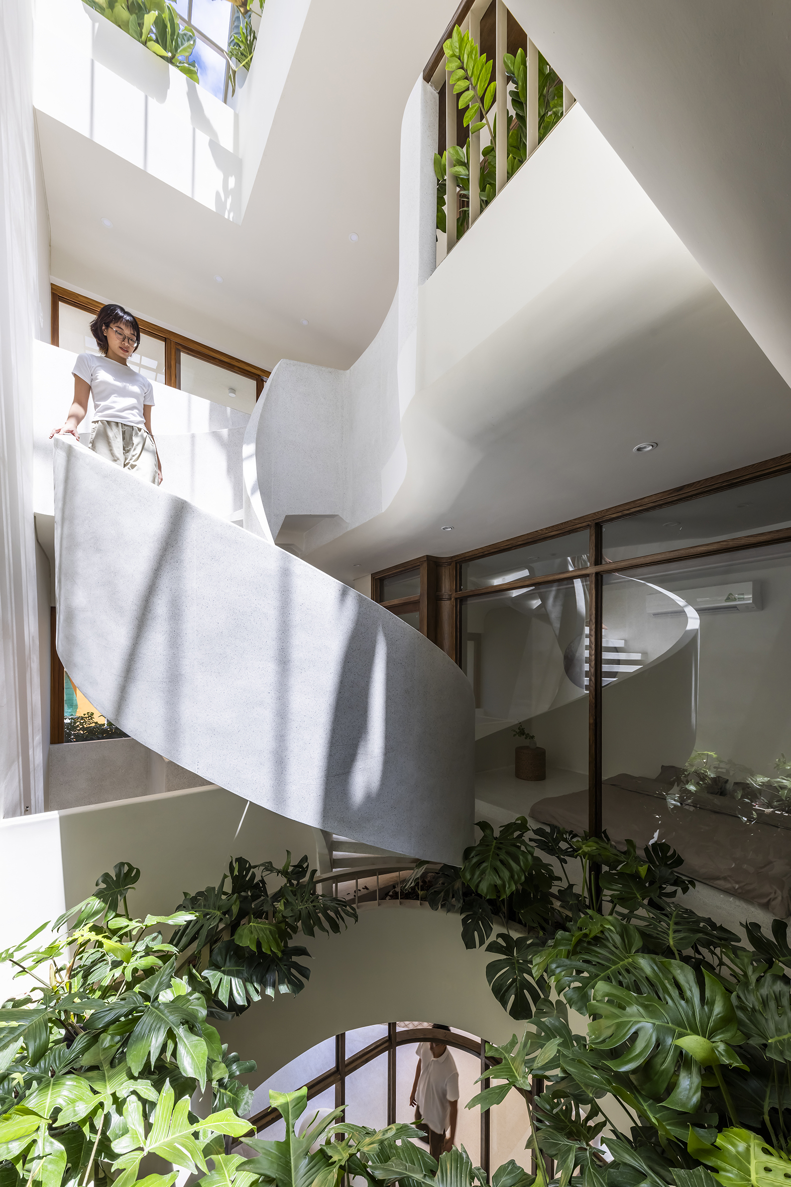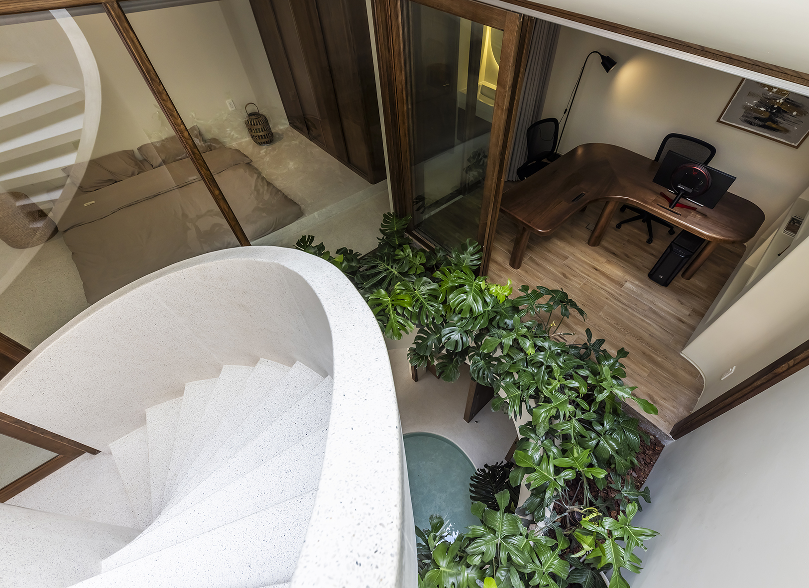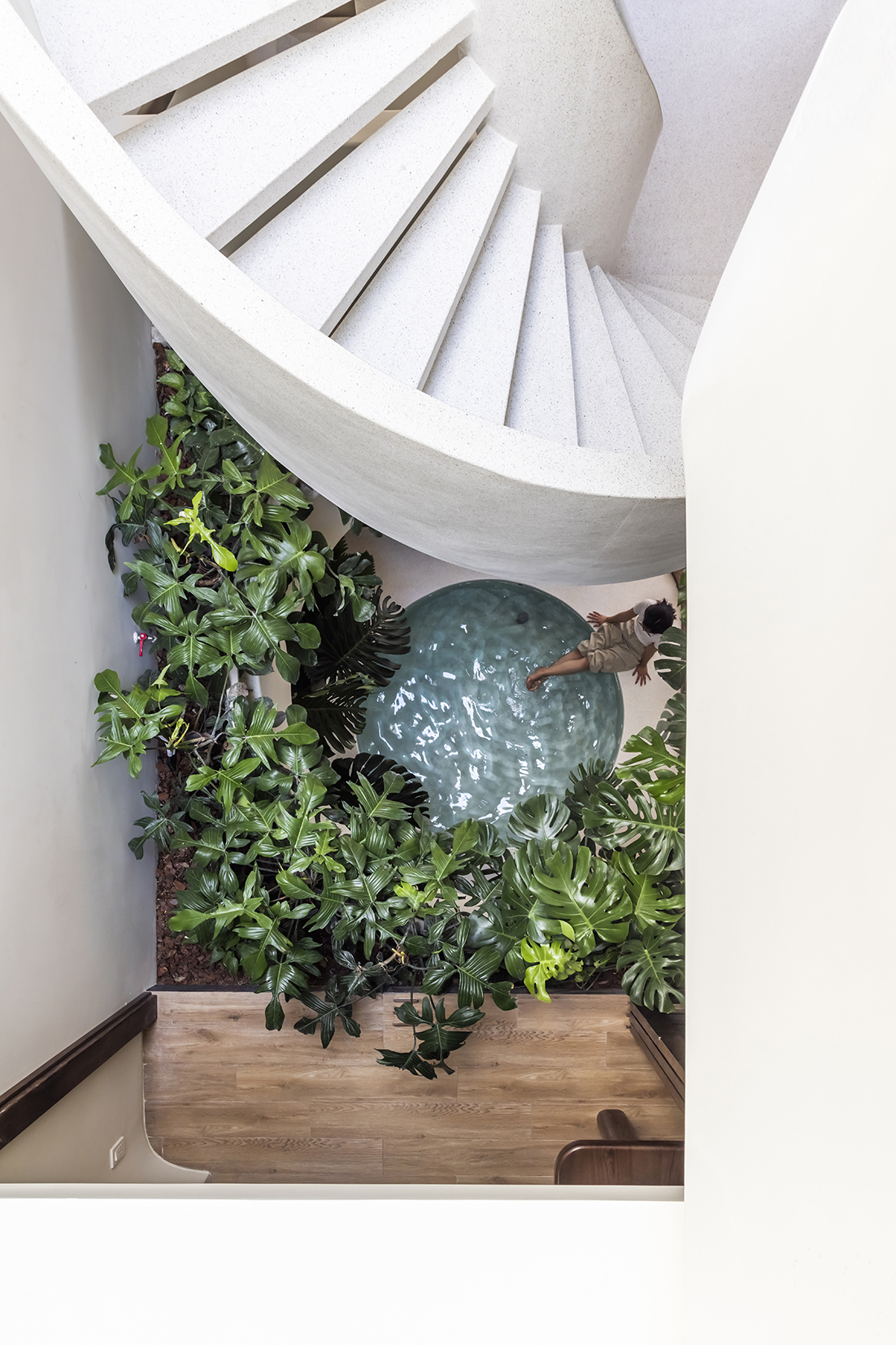 Ngôn ngữ vật liệu nhấn mạnh tính nguyên bản và xúc giác. Chất liệu đá mài (terrazzo) bao phủ bề mặt từ sàn đến vách, tạo sự đồng nhất về thị giác. Điểm nhấn thị giác mạnh mẽ nhất là hệ cầu thang xoắn bê tông đúc nguyên khối, được đặt “lơ lửng” giữa hệ thống hồ nước, cây xanh và ánh sáng thông tầng. Tại đây, vật liệu không đóng vai trò trang trí bề mặt mà trở thành một phần của cấu trúc trải nghiệm.