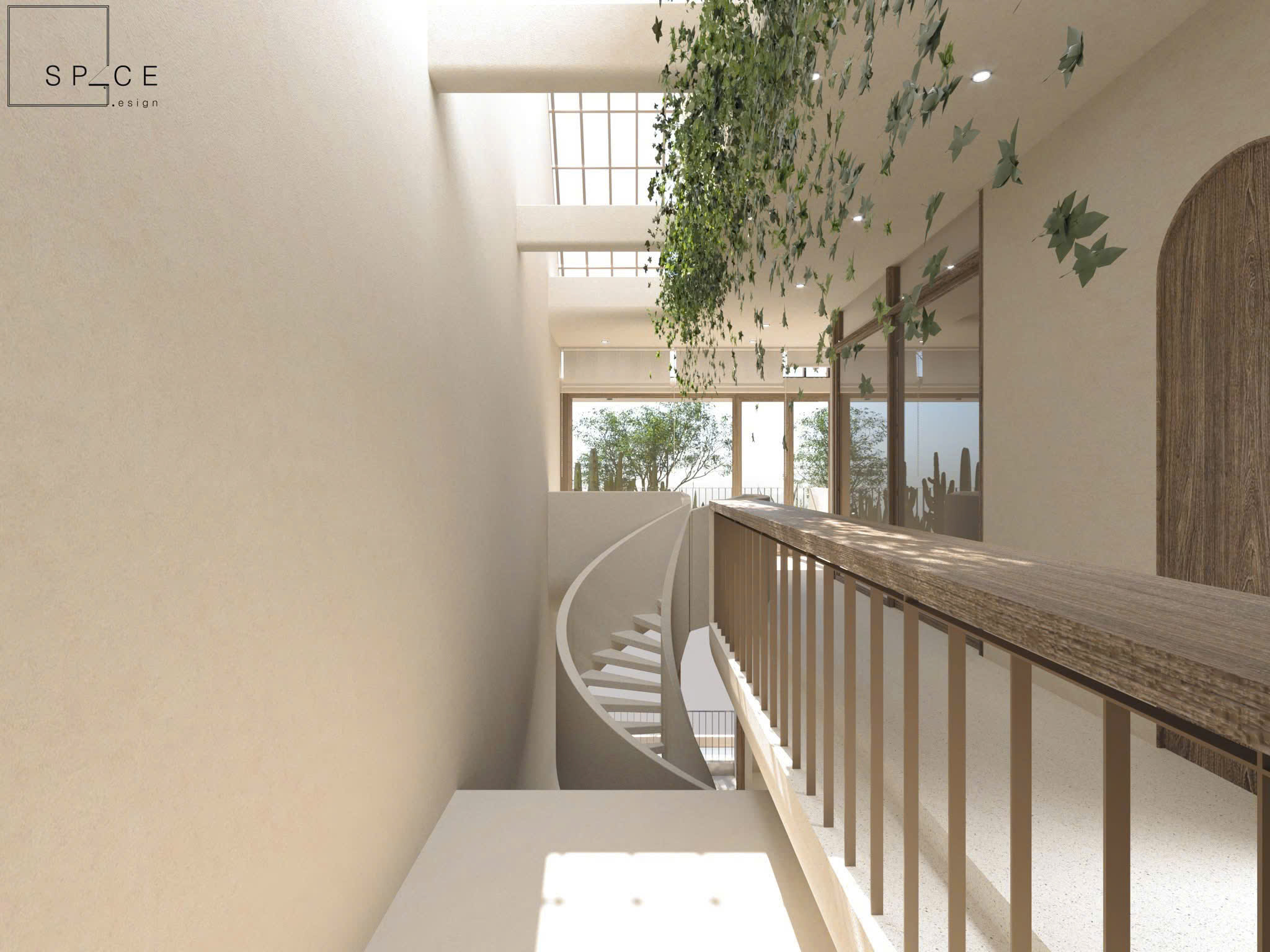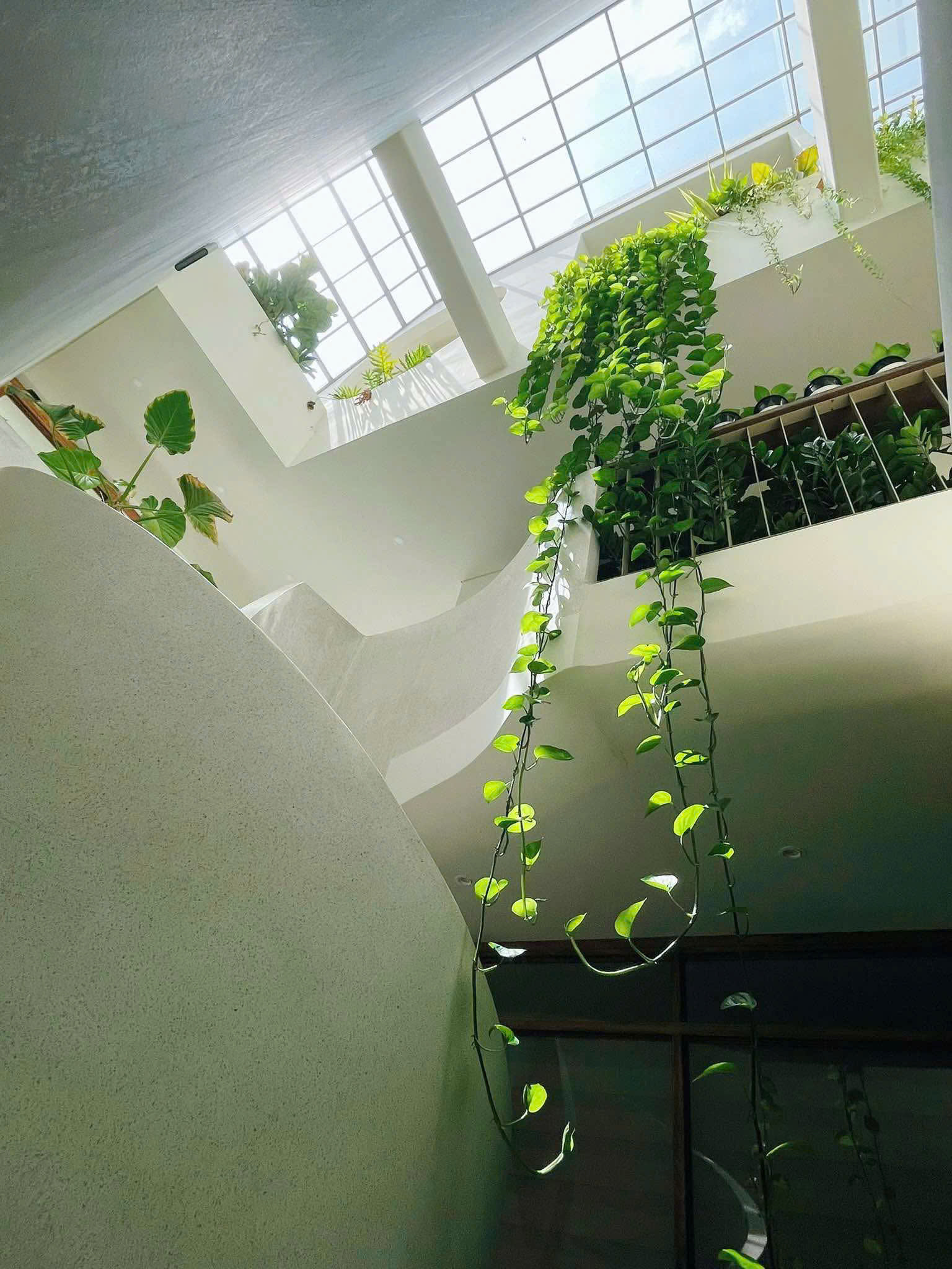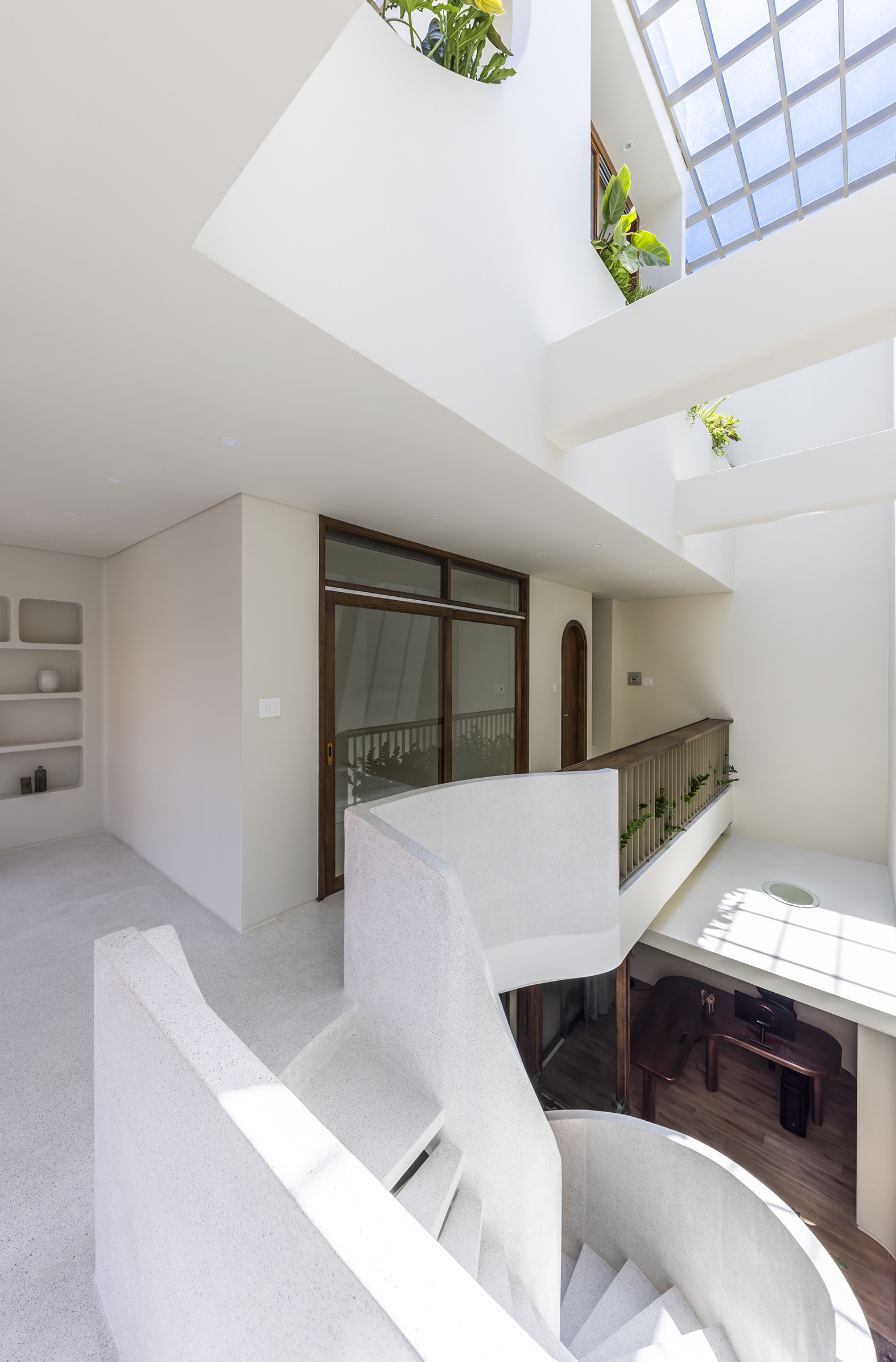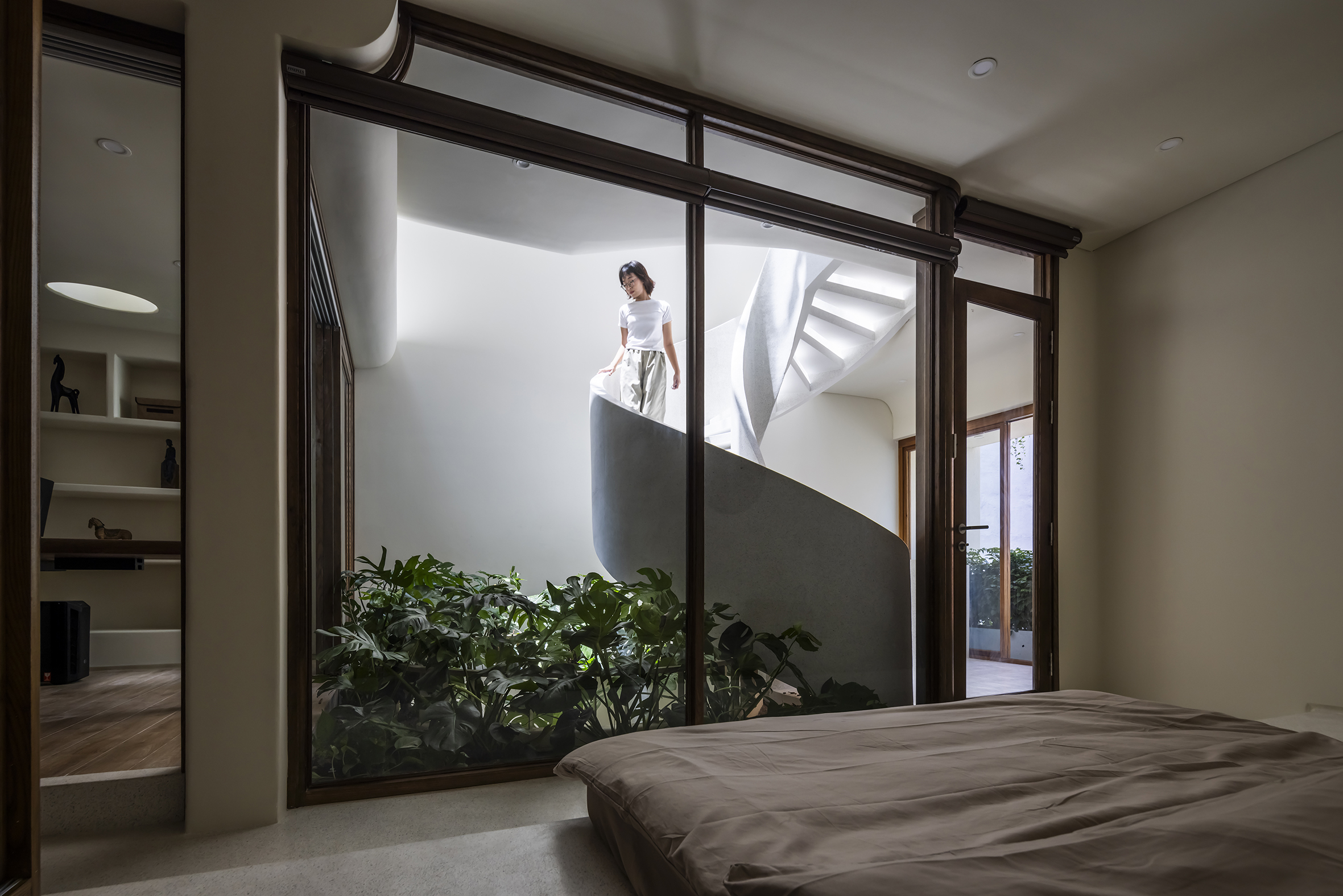 Ngôn ngữ vật liệu nhấn mạnh tính nguyên bản và xúc giác. Chất liệu đá mài (terrazzo) bao phủ bề mặt từ sàn đến vách, tạo sự đồng nhất về thị giác. Điểm nhấn thị giác mạnh mẽ nhất là hệ cầu thang xoắn bê tông đúc nguyên khối, được đặt “lơ lửng” giữa hệ thống hồ nước, cây xanh và ánh sáng thông tầng. Tại đây, vật liệu không đóng vai trò trang trí bề mặt mà trở thành một phần của cấu trúc trải nghiệm.