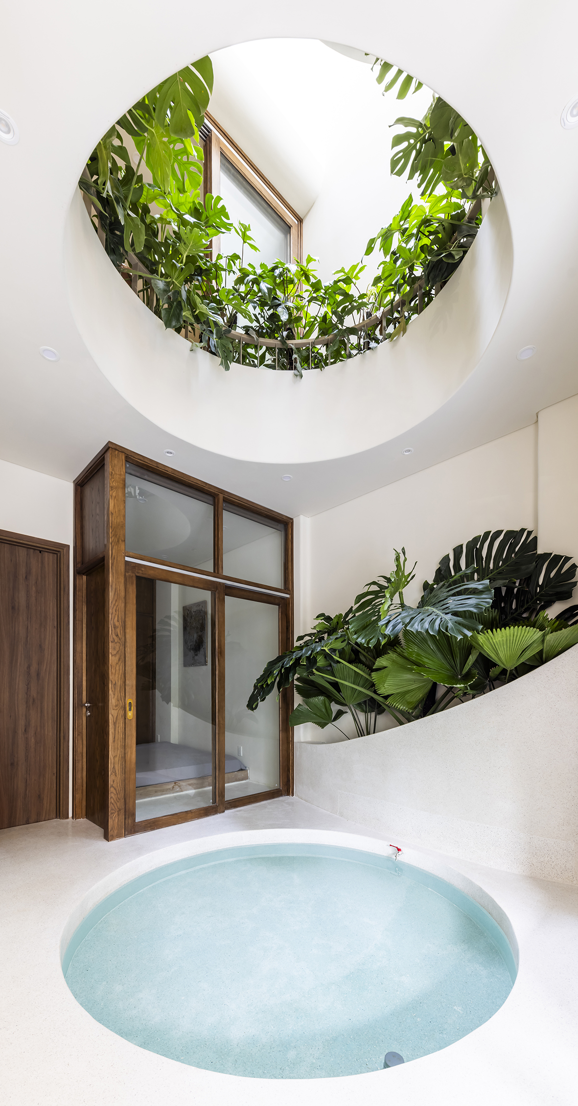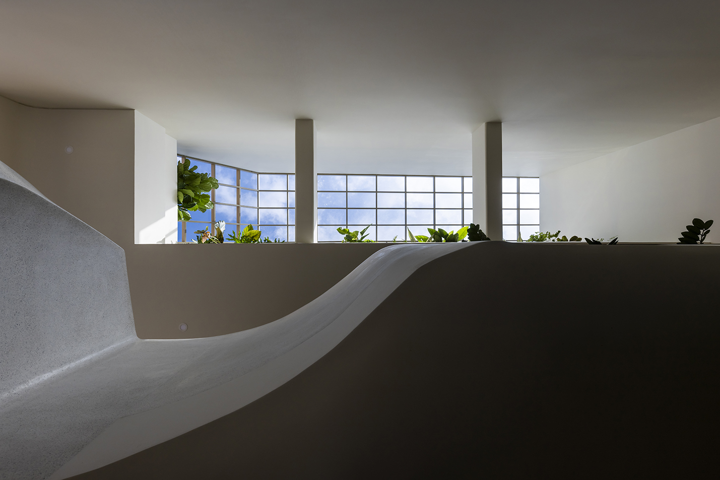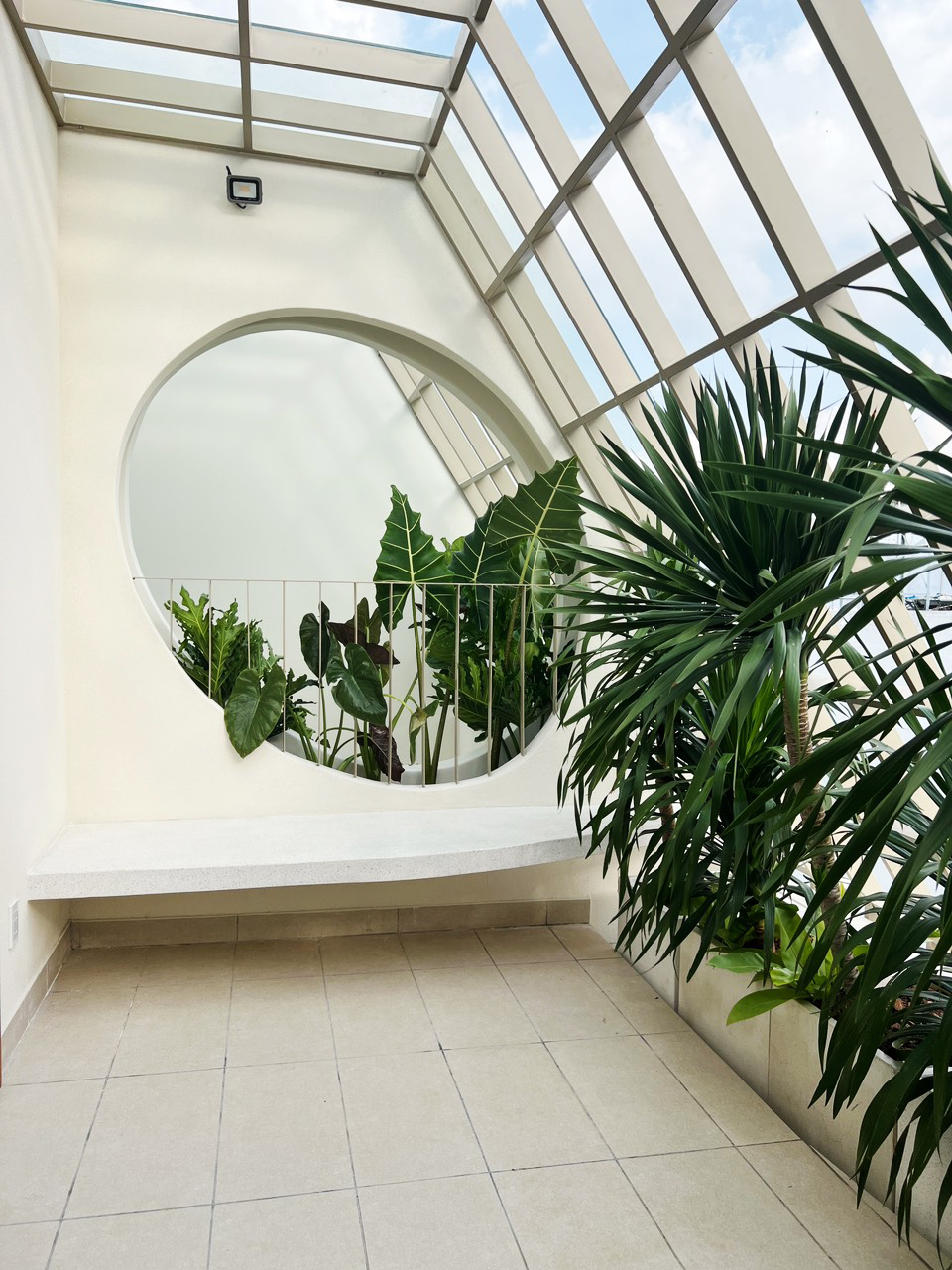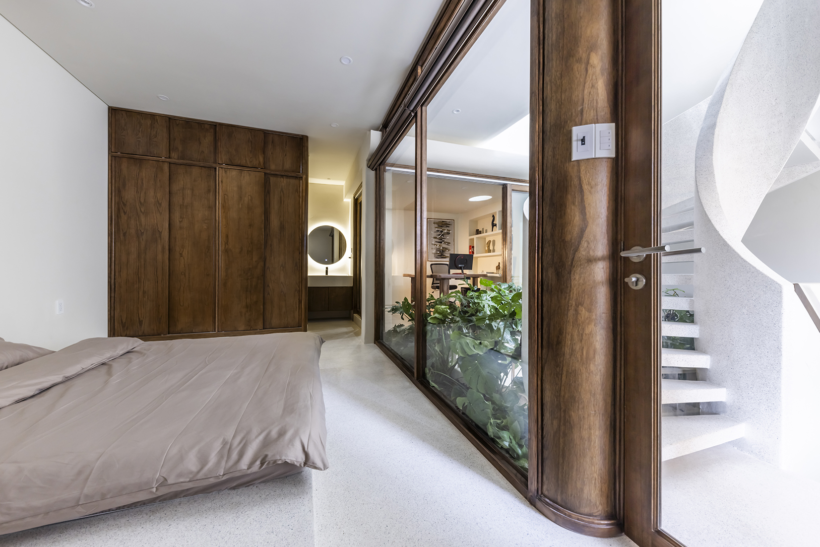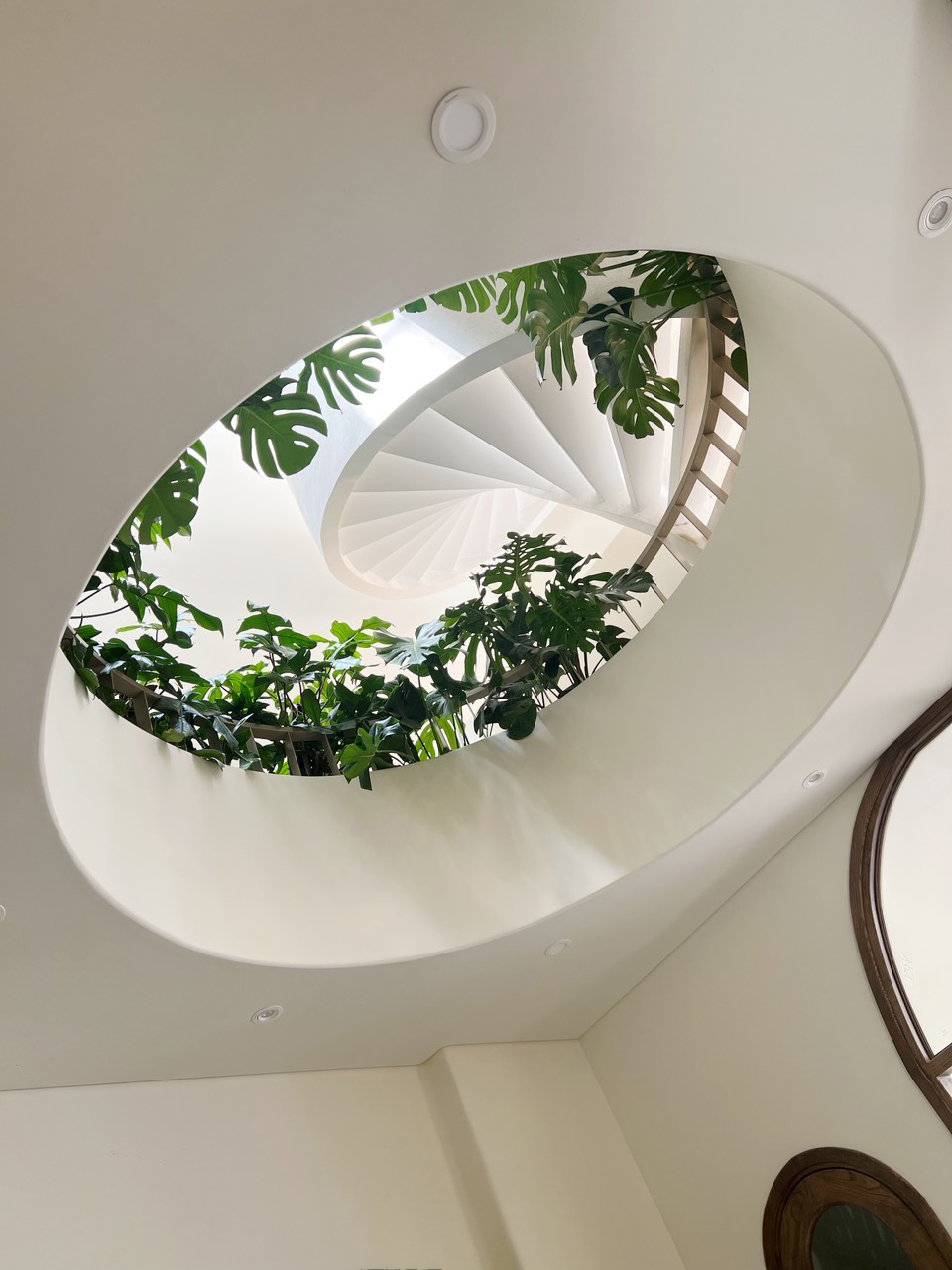 Ngôn ngữ vật liệu nhấn mạnh tính nguyên bản và xúc giác. Chất liệu đá mài (terrazzo) bao phủ bề mặt từ sàn đến vách, tạo sự đồng nhất về thị giác. Điểm nhấn thị giác mạnh mẽ nhất là hệ cầu thang xoắn bê tông đúc nguyên khối, được đặt “lơ lửng” giữa hệ thống hồ nước, cây xanh và ánh sáng thông tầng. Tại đây, vật liệu không đóng vai trò trang trí bề mặt mà trở thành một phần của cấu trúc trải nghiệm.