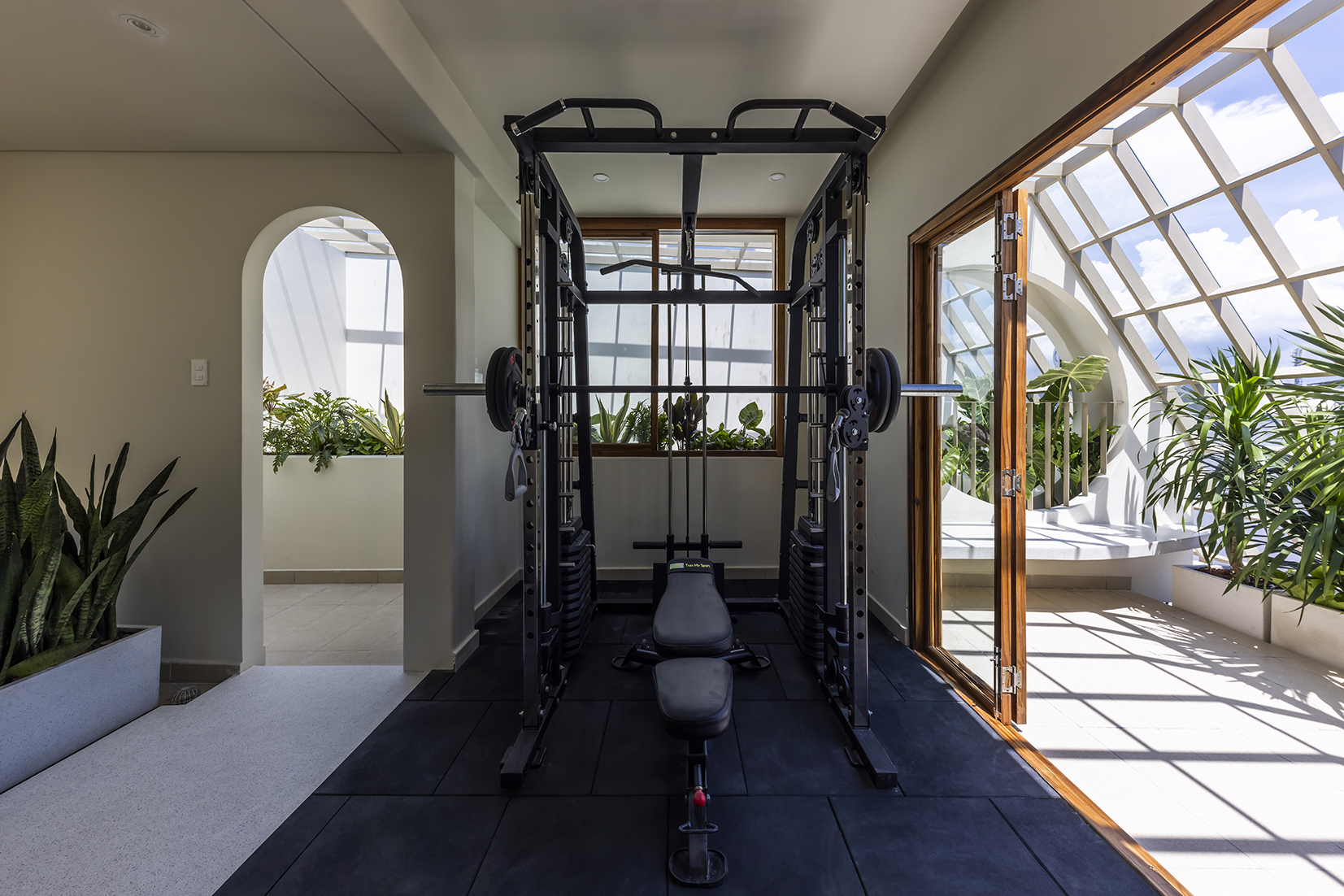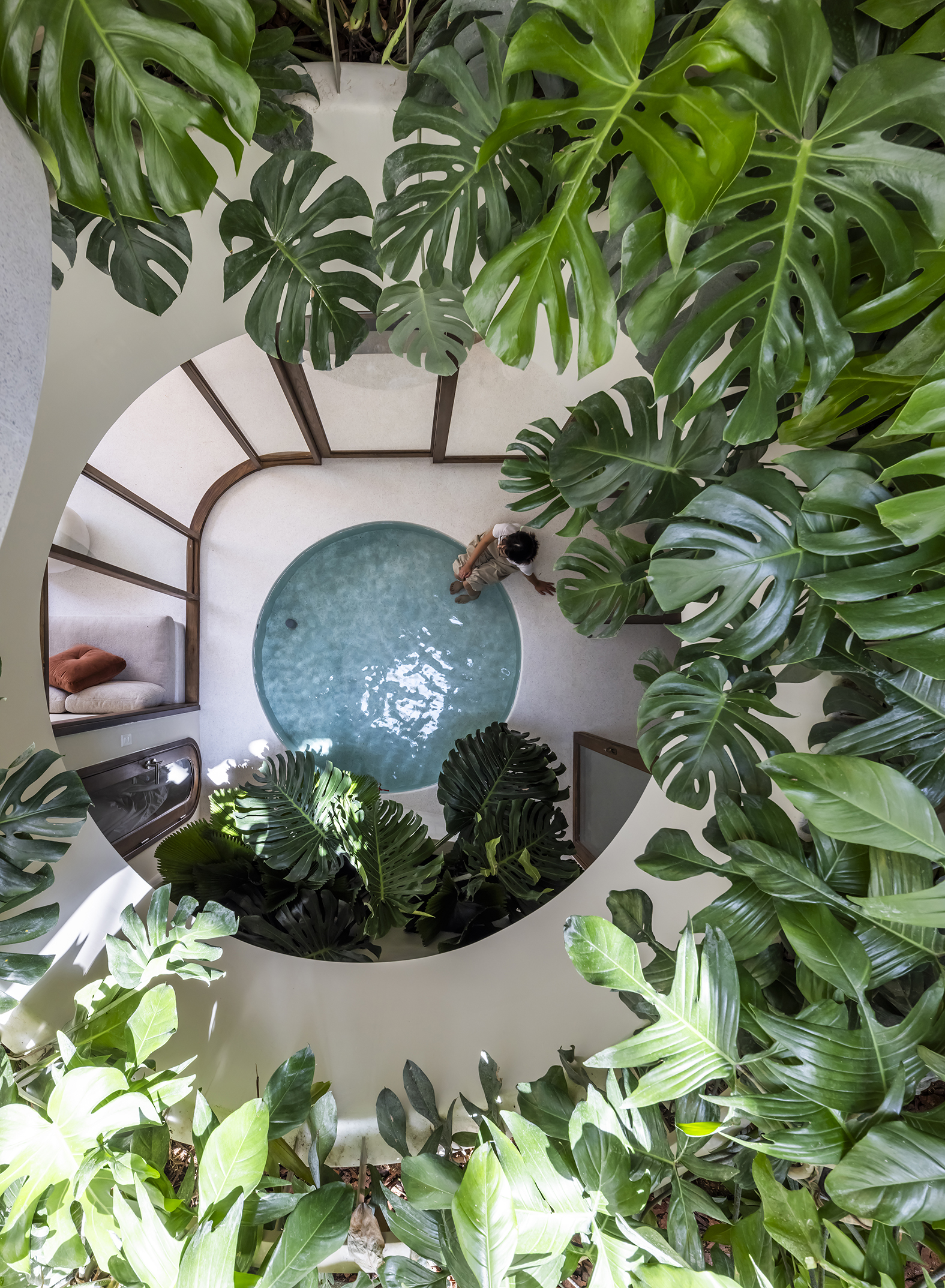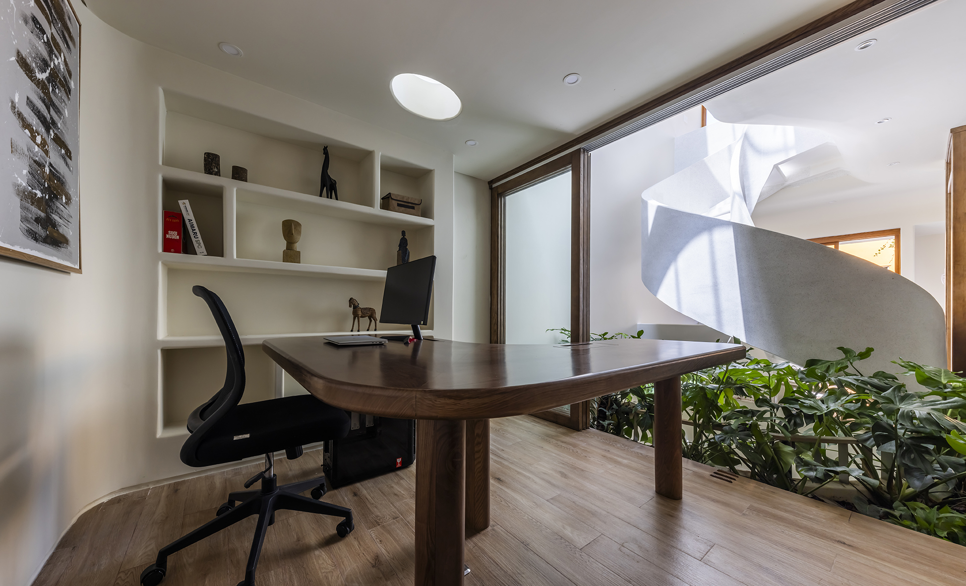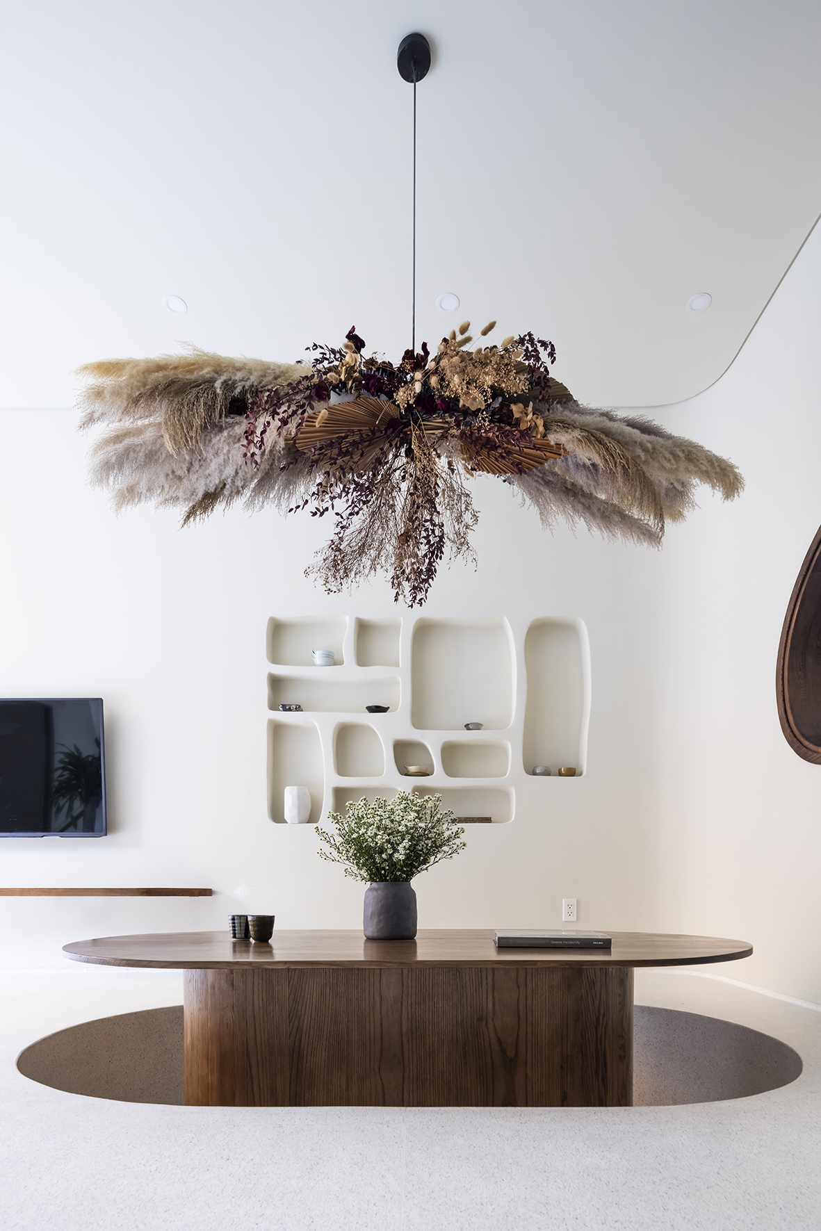 Ngôn ngữ vật liệu nhấn mạnh tính nguyên bản và xúc giác. Chất liệu đá mài (terrazzo) bao phủ bề mặt từ sàn đến vách, tạo sự đồng nhất về thị giác. Điểm nhấn thị giác mạnh mẽ nhất là hệ cầu thang xoắn bê tông đúc nguyên khối, được đặt “lơ lửng” giữa hệ thống hồ nước, cây xanh và ánh sáng thông tầng. Tại đây, vật liệu không đóng vai trò trang trí bề mặt mà trở thành một phần của cấu trúc trải nghiệm.