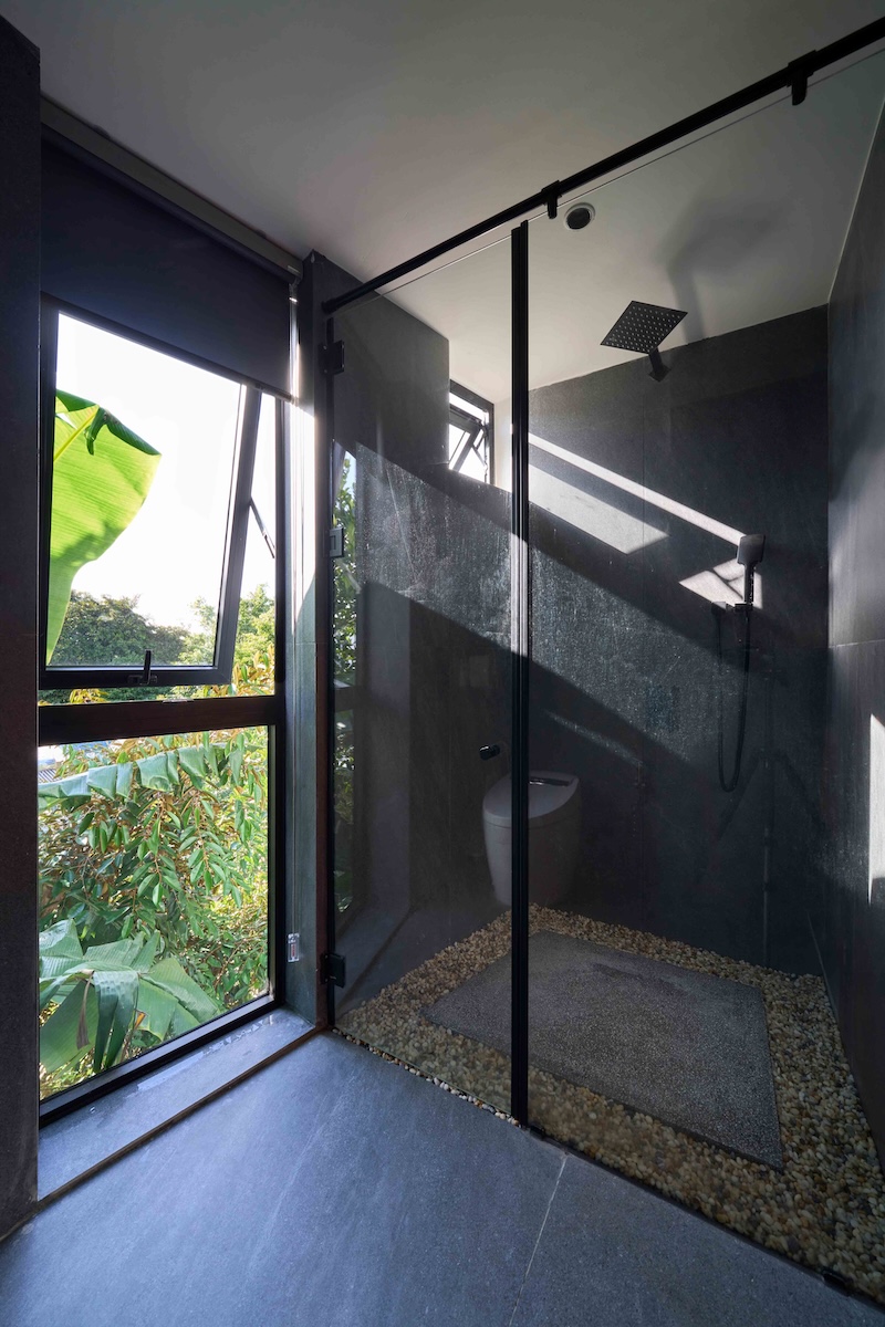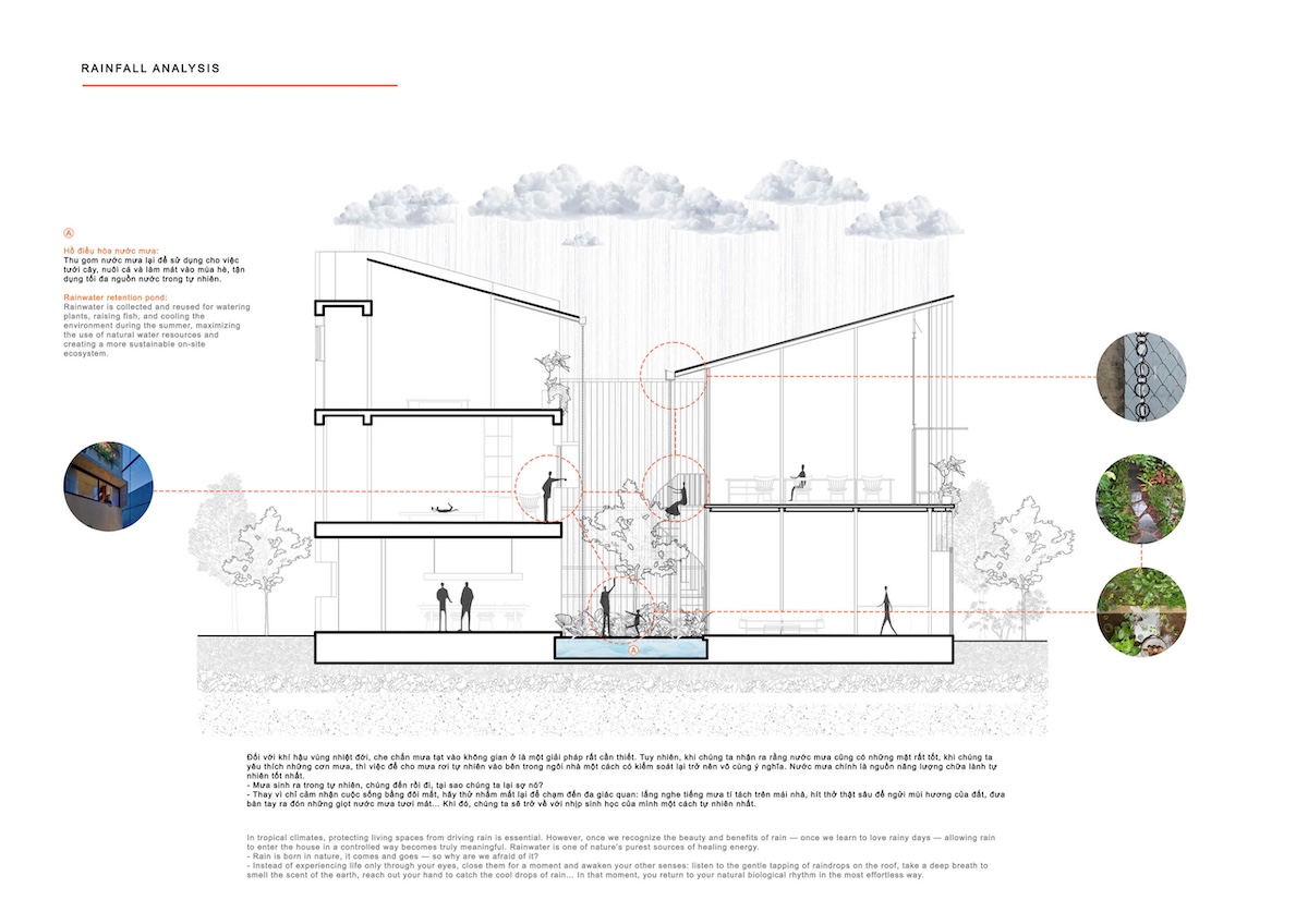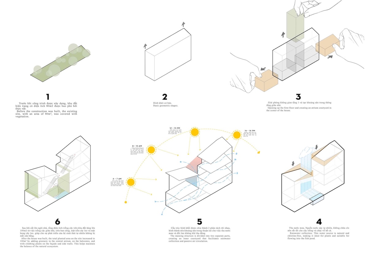 Ngôi nhà được định hướng để đón luồng gió chính từ sông, tăng cường thông gió tự nhiên cho toàn bộ không gian. Các giải pháp vi khí hậu bao gồm thông gió chéo, sân trong dọc khối phòng ngủ, mái hiên sâu và hệ cửa hai lớp (lá sách và cửa kính trượt), cho phép kiểm soát linh hoạt gió, ánh sáng và mưa tạt theo mùa. Thiết kế này giúp giảm hấp thụ nhiệt, hạn chế nhu cầu sử dụng năng lượng nhân tạo, đồng thời đảm bảo sự thoải mái vi khí hậu quanh năm.