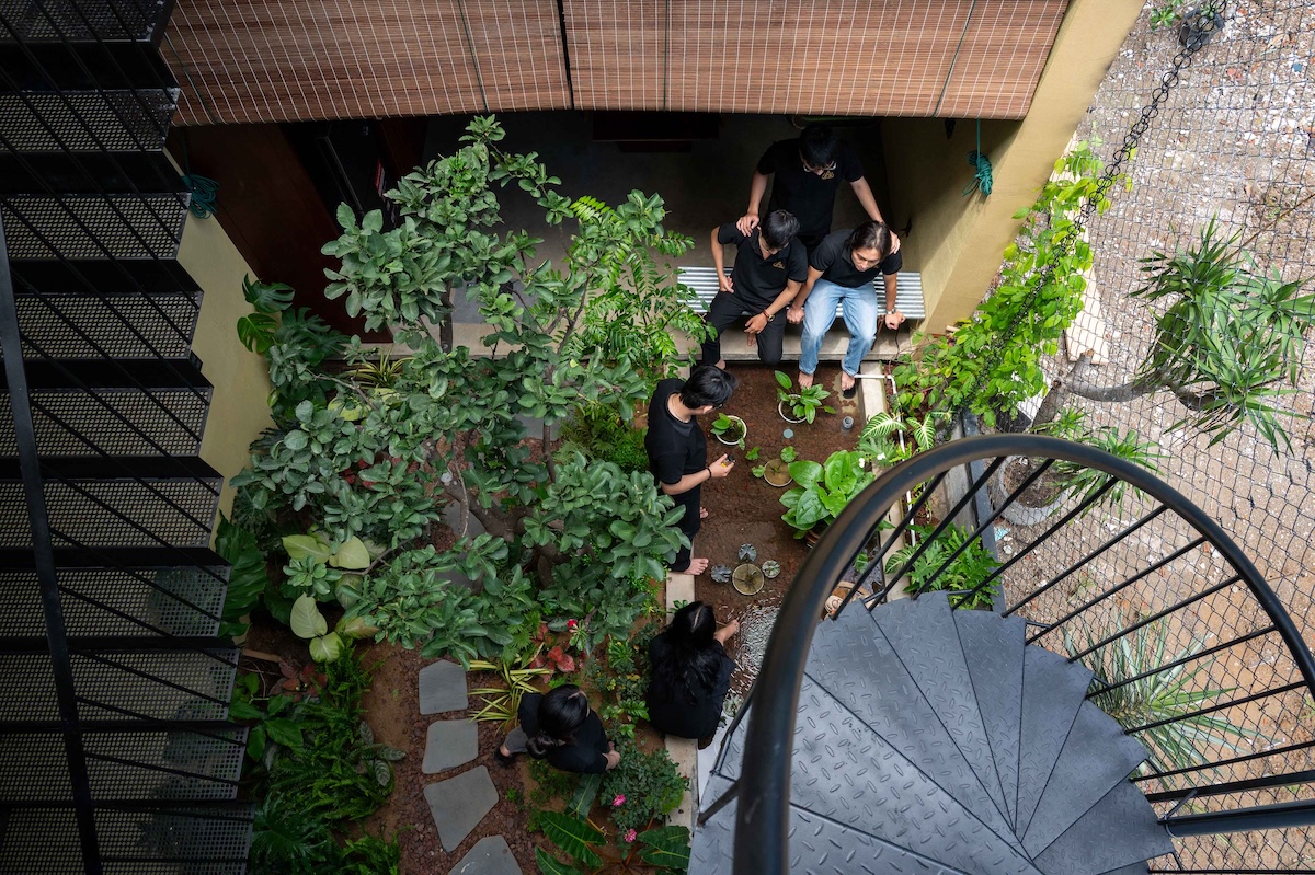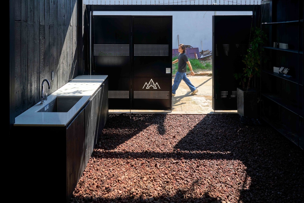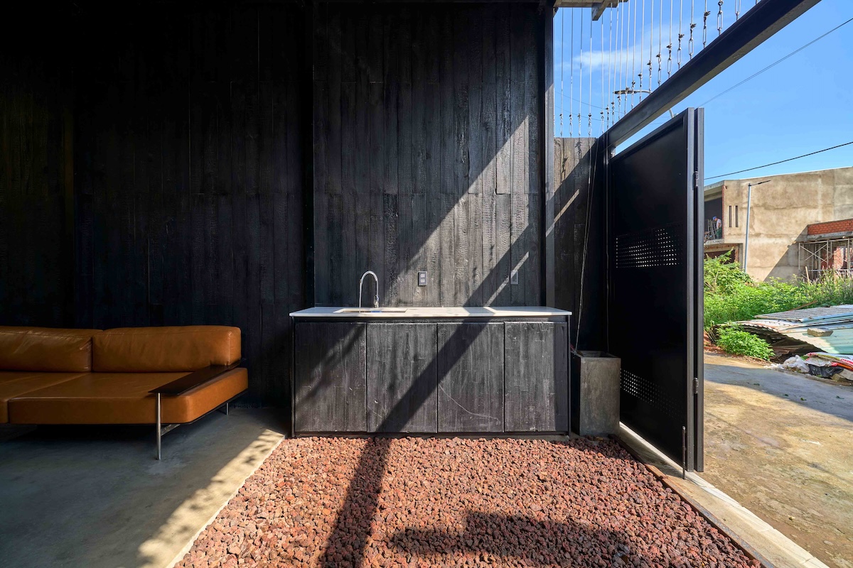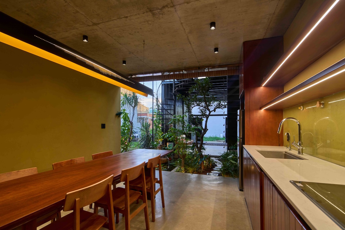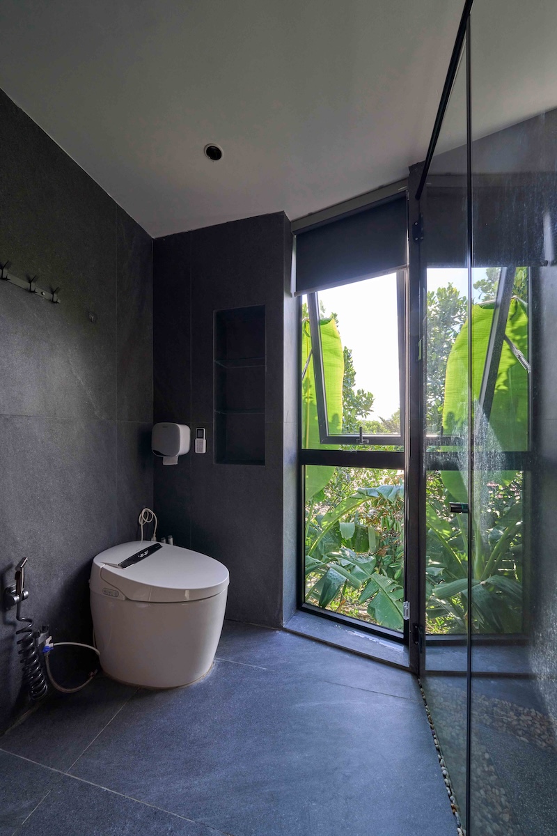 Cảnh quan xanh bao quanh công trình đóng vai trò quan trọng trong việc cải thiện vi khí hậu, giảm bức xạ nhiệt và tạo cảm giác “ẩn mình” giữa vườn cây. Sân trước rộng không chỉ là khoảng lùi cảnh quan mà còn trở thành không gian sinh hoạt chung, nơi diễn ra các hoạt động truyền thống, góp phần tăng cường kết nối giữa gia đình và cộng đồng xung quanh.
