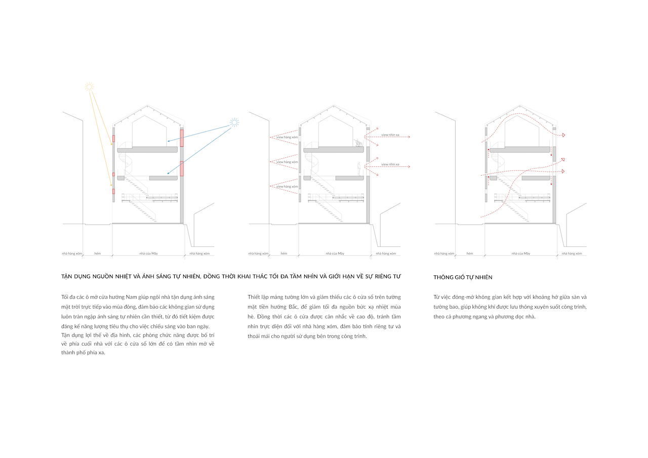Công trình ưu tiên các giải pháp thiết kế thụ động để tăng tính bền vững: hướng Nam mở lớn đón nắng ấm mùa đông, trong khi mặt tiền hướng Bắc được thiết lập mảng tường đặc để ngăn bức xạ nhiệt và đảm bảo sự riêng tư. Sự lưu thông khí tự nhiên được tính toán xuyên suốt theo cả phương ngang và dọc thông qua cấu trúc lệch tầng và các khoảng hở thông tầng.