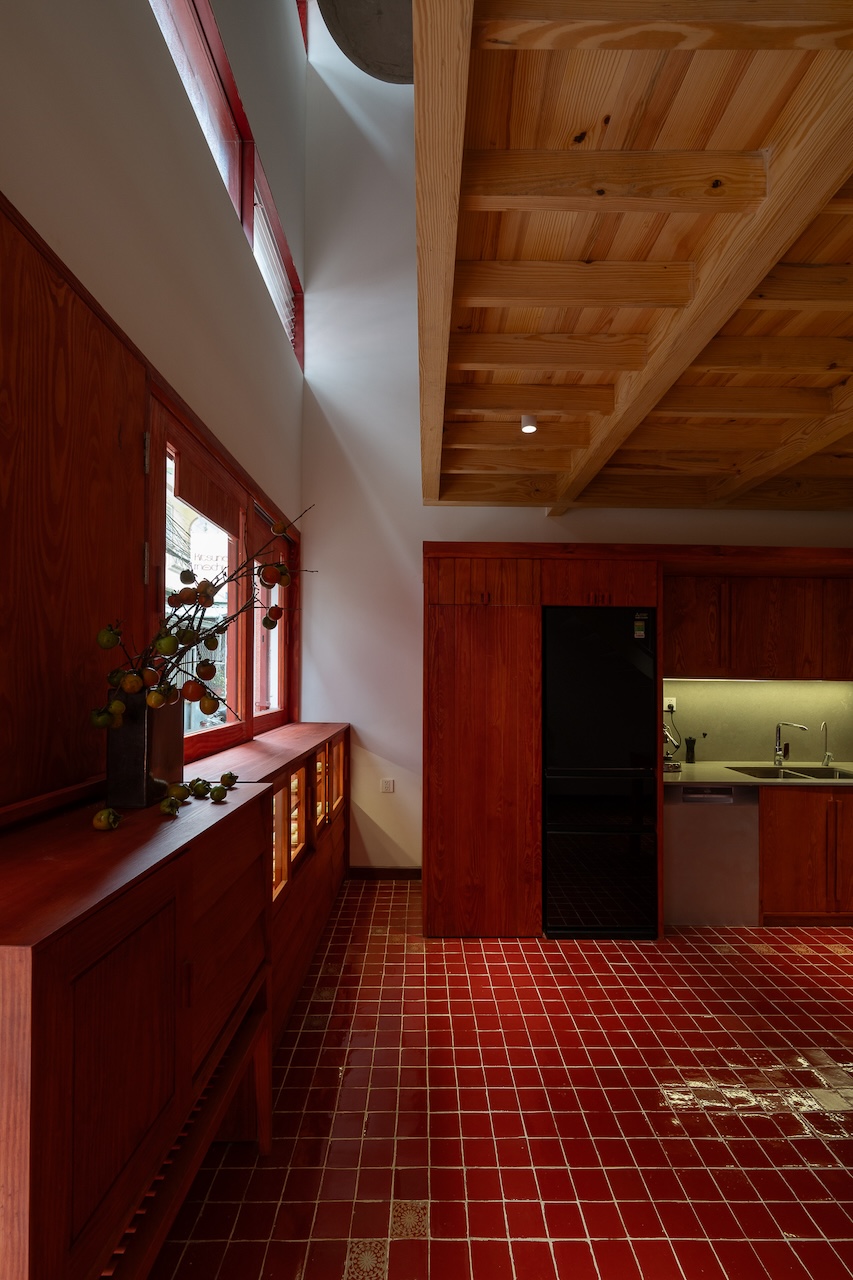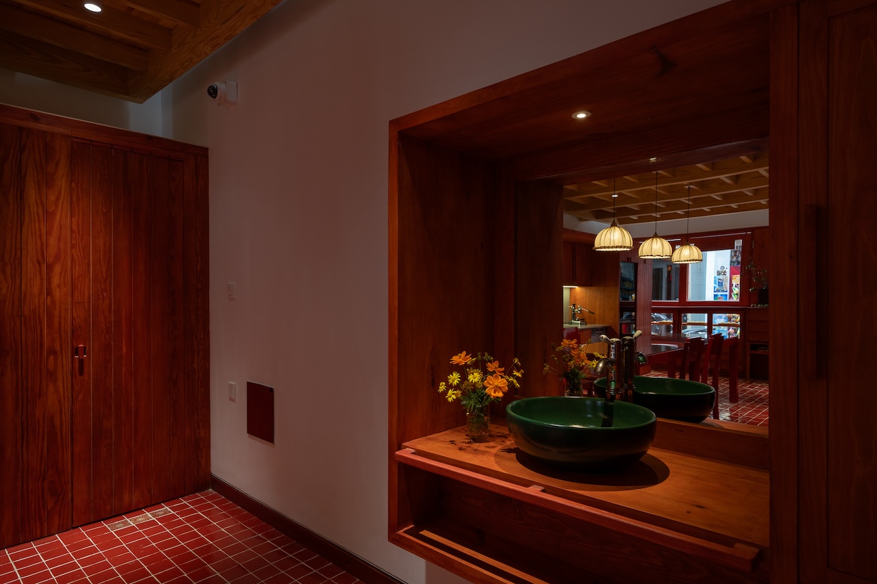 Chất liệu bản địa như gạch gốm thủ công, đá mài, đá rửa kết hợp cùng gỗ thông và sắc đỏ chủ đạo không chỉ đáp ứng đặc thù khí hậu lạnh mà còn tái hiện hơi thở cao nguyên Lâm Viên một cách hiện đại.