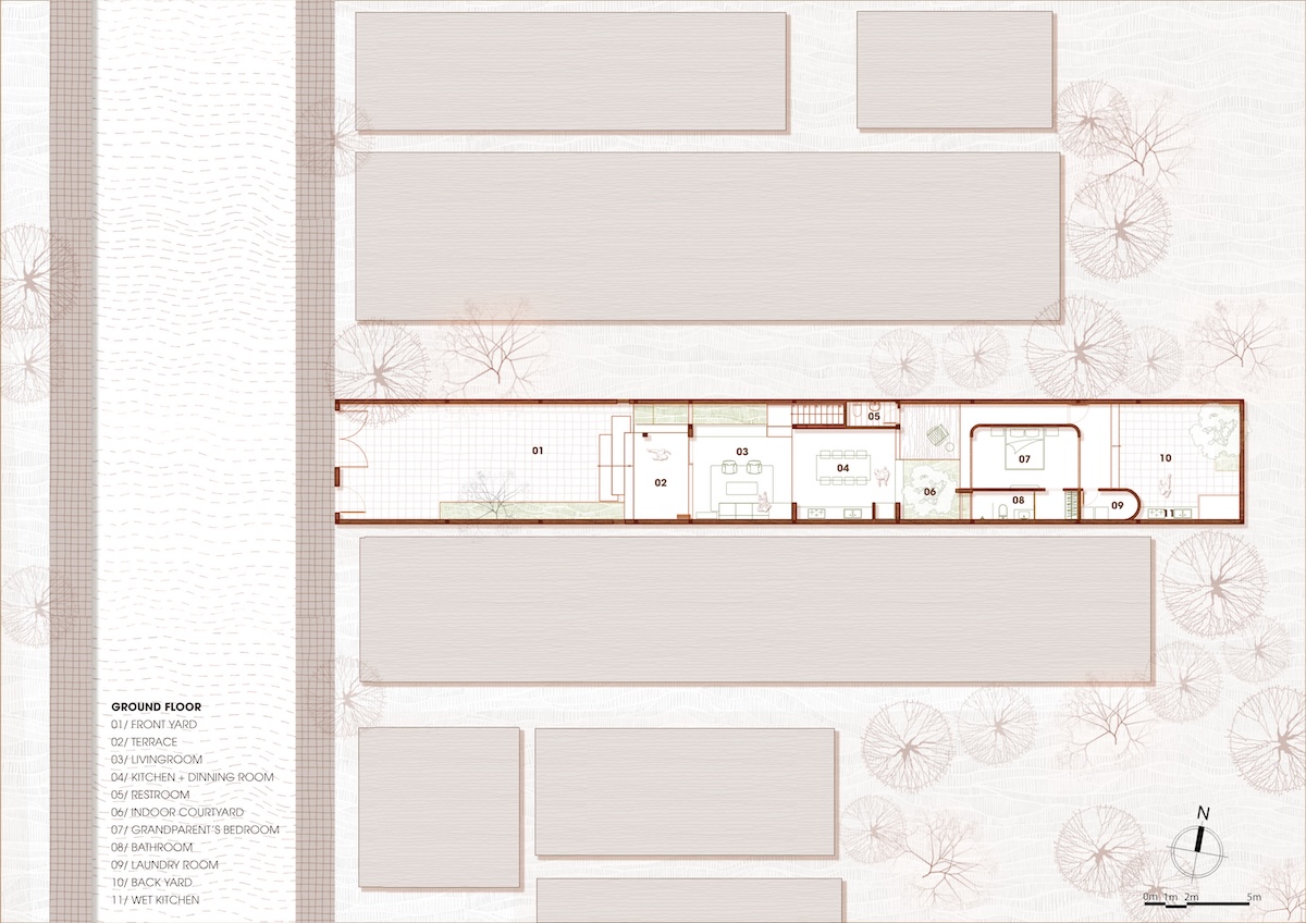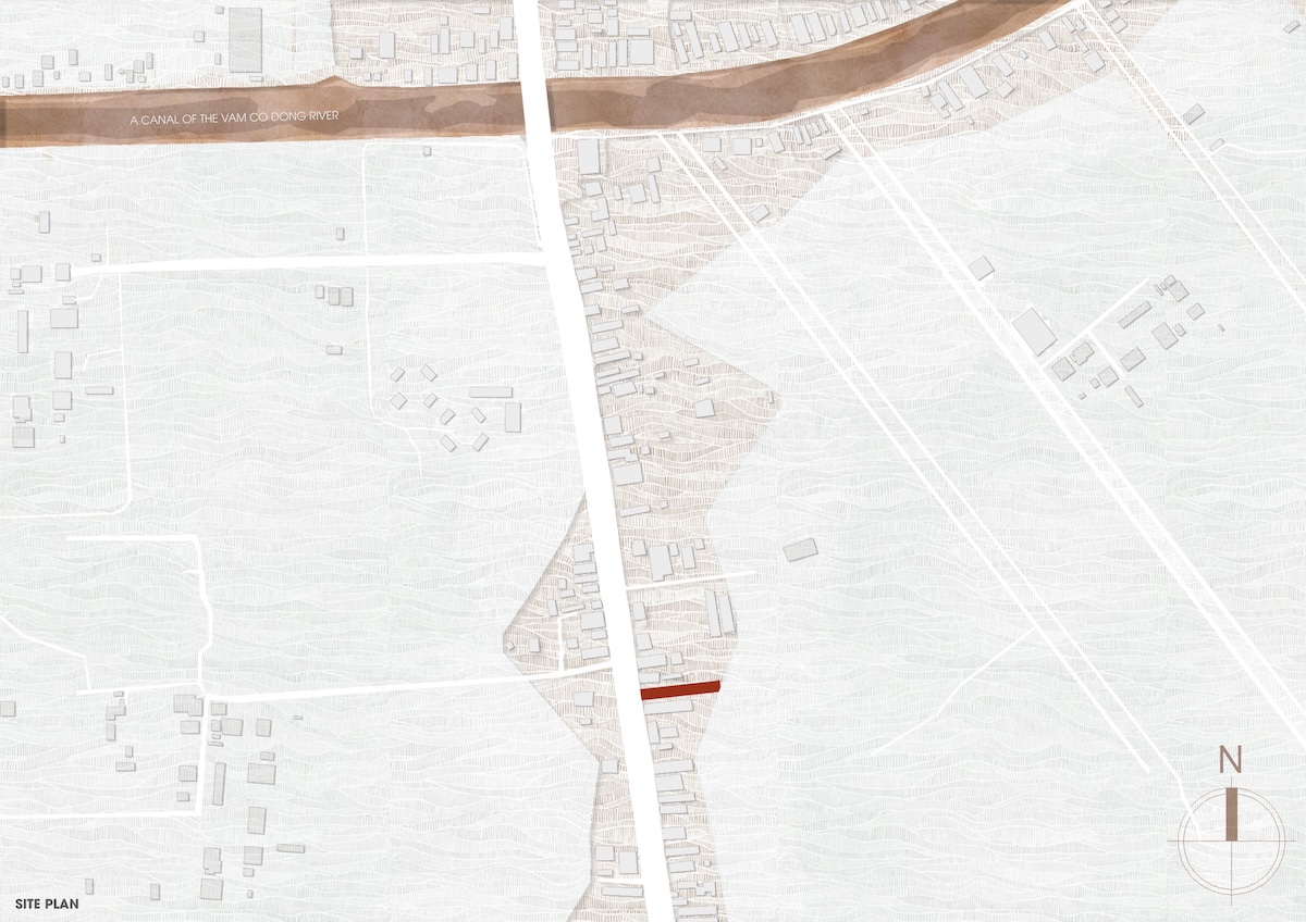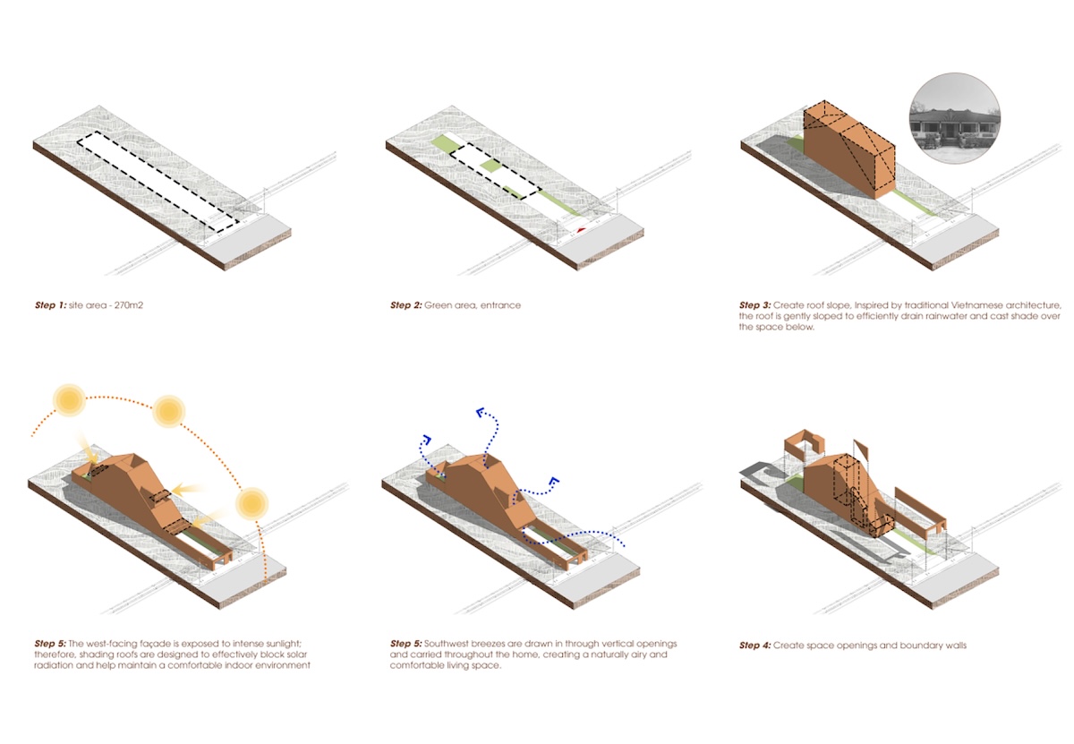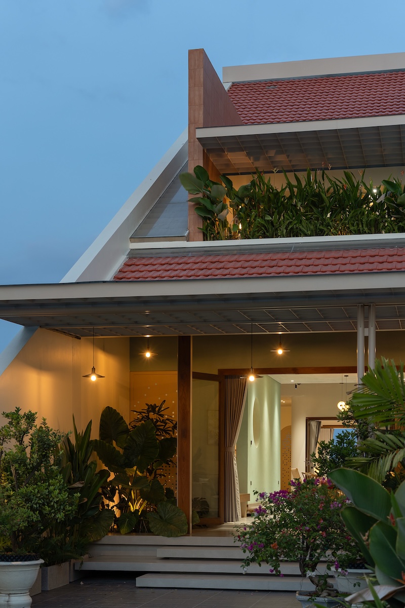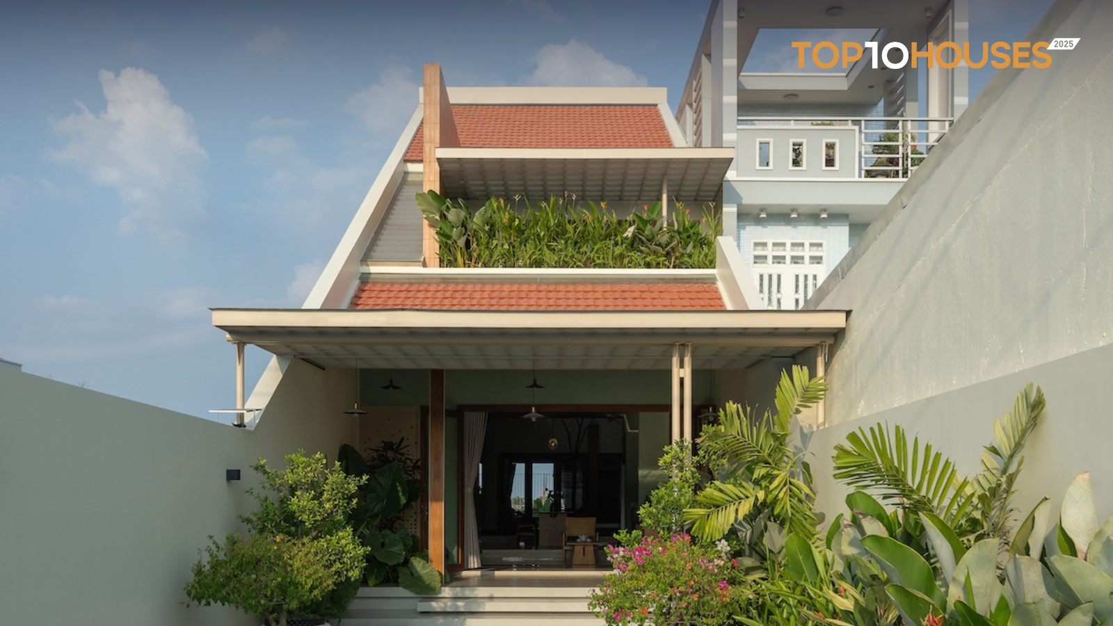 Ngôi nhà là không gian chất chứa ký ức về căn nhà cũ và nguồn cảm hứng để nhóm thiết kế kiến tạo một ngôi nhà mới mang dáng dấp truyền thống, phù hợp nhịp sống đương đại. Khối nhà chính lùi sâu, tạo khoảng sân lớn phía trước làm “vùng đệm xanh” giảm tiếng ồn và lọc bụi, đồng thời tạo sự chuyển tiếp từ đường lớn vào không gian sống. Hình thức kiến trúc lấy cảm hứng địa phương: mái ngói đỏ dốc, hàng hiên rộng cải thiện vi khí hậu.