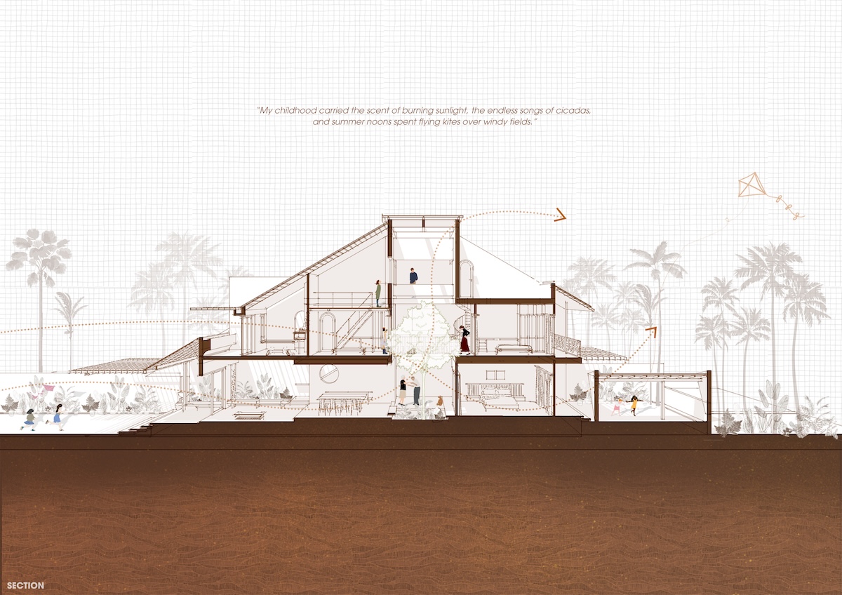 Công trình kết hợp hình thái bản địa với giải pháp thụ động và bố cục không gian linh hoạt, đạt được sự cân bằng giữa ký ức, hiện tại, tương lai, trở thành một nơi ở bền vững, chan hòa cho nhiều thế hệ cùng chung sống.
