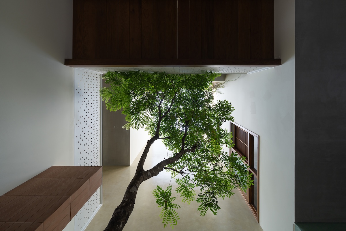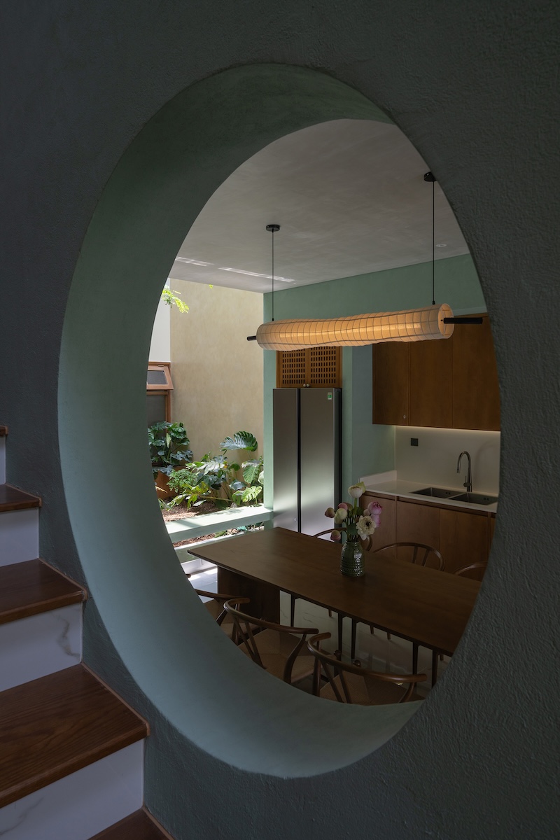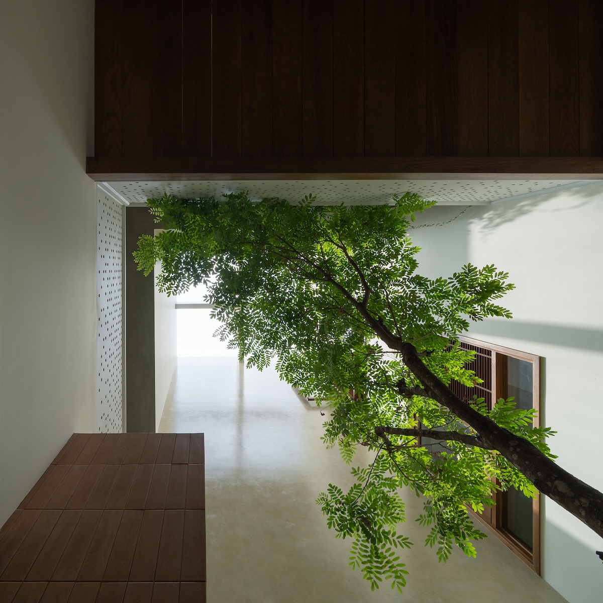 Ngôi nhà được tổ chức theo nguyên tắc “mở – đệm – đóng – mở”, với các lớp không gian đan xen giữa sân vườn, hiên, giếng trời và khoảng thông tầng. Bố cục này tối ưu chiếu sáng và thông gió chéo, duy trì sự kết nối liền mạch giữa trong và ngoài, phù hợp kiến trúc nhiệt đới Việt Nam. Nhà Dì Tư được tổ chức như một hệ thống linh hoạt, khuyến khích sự tương tác. Trẻ nhỏ có thể di chuyển tự do. Phòng ngủ có gác lửng nhỏ, thang xoắn dẫn lên khu sinh hoạt trên mái – nơi ánh sáng tự nhiên đi qua ô vòm lớn, chiếu xuống hành lang, gắn kết không gian theo chiều đứng.